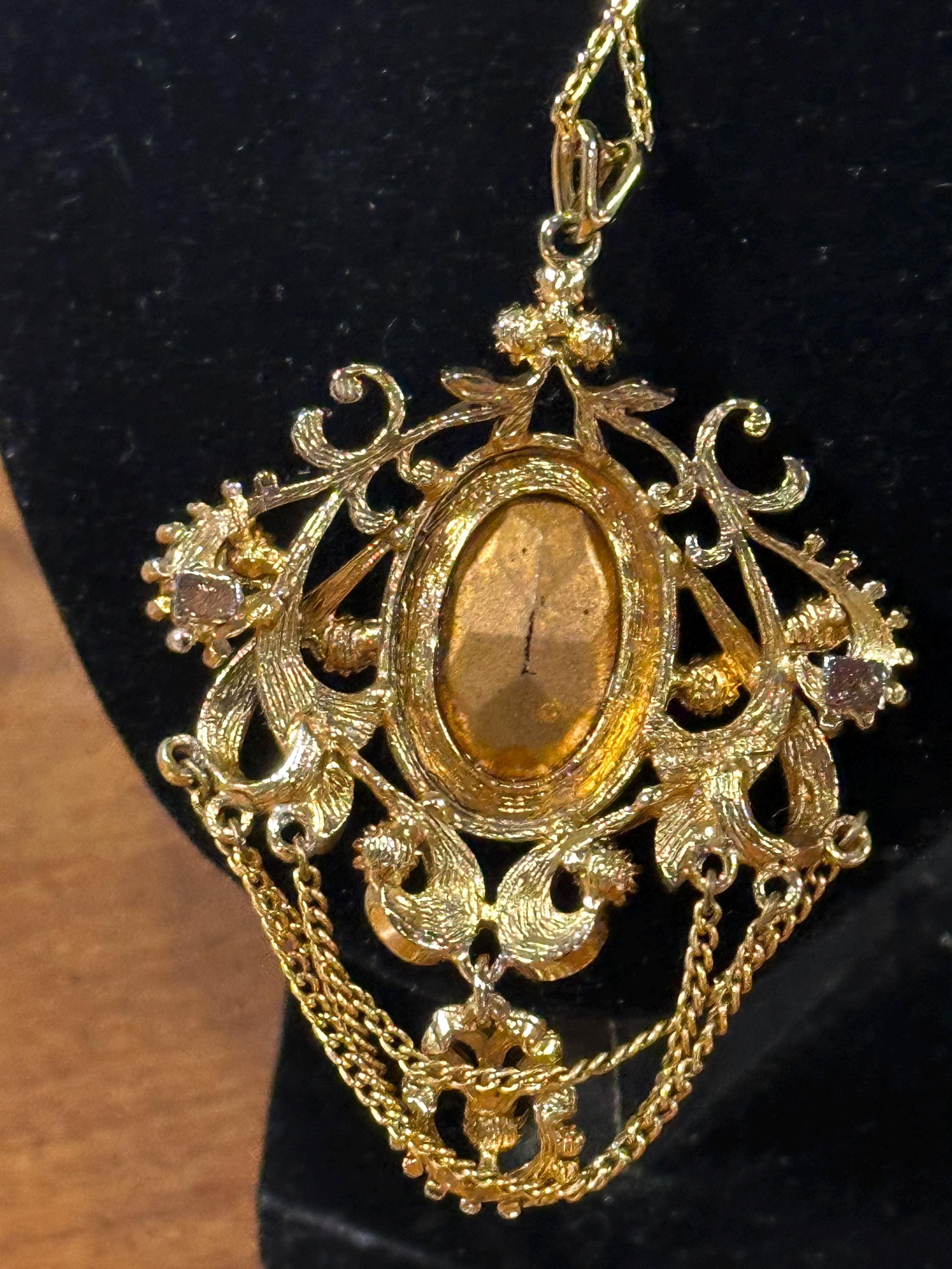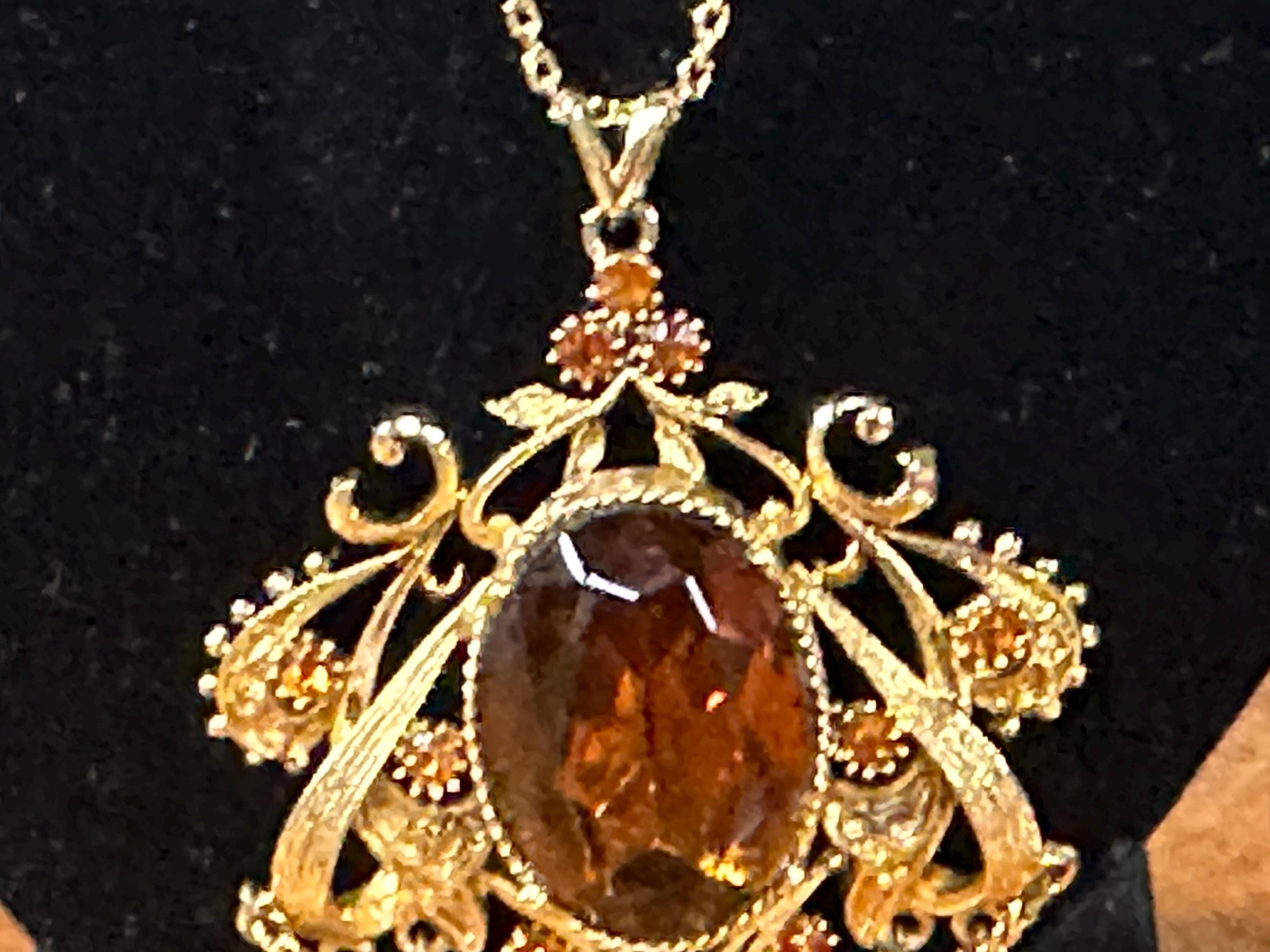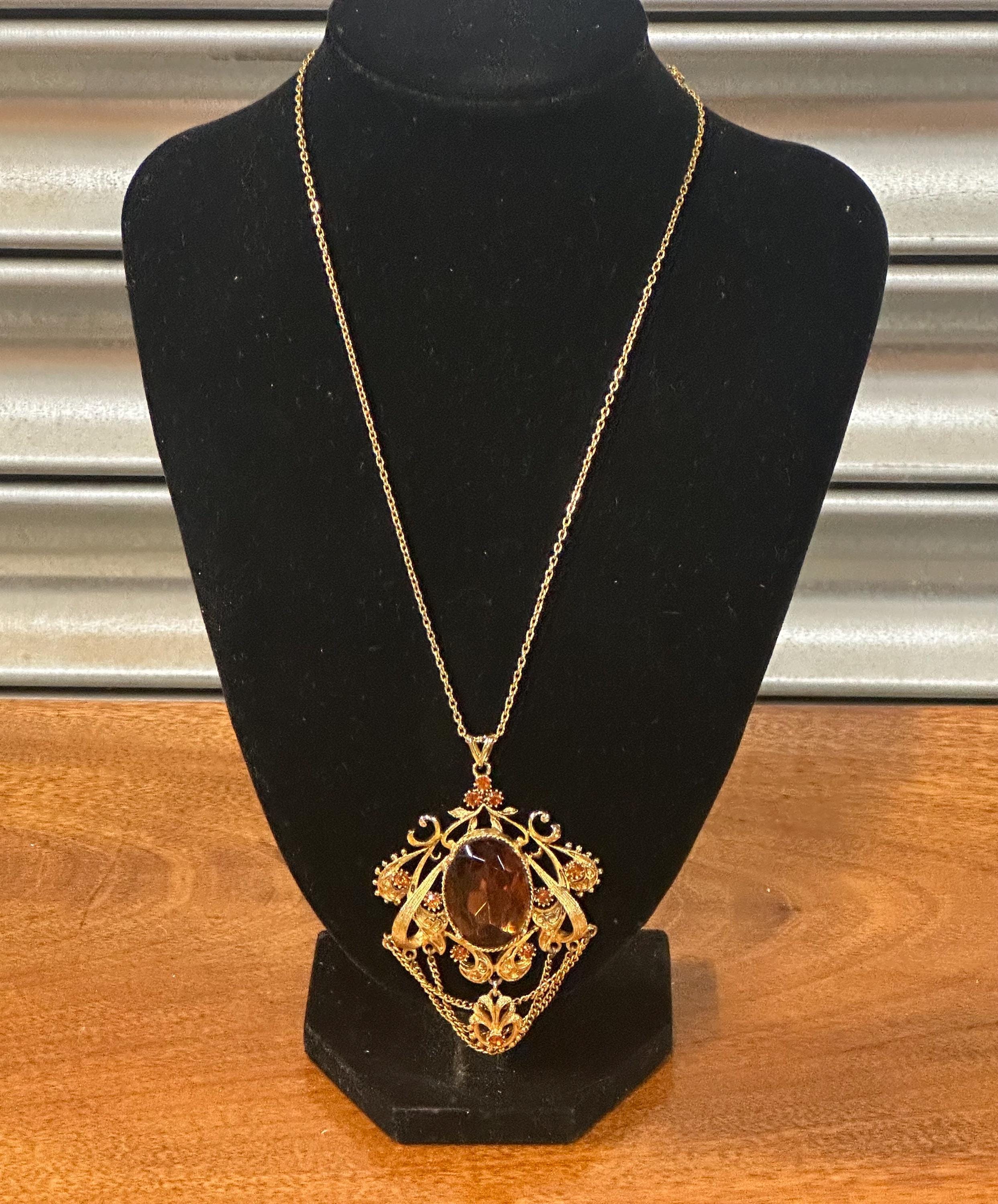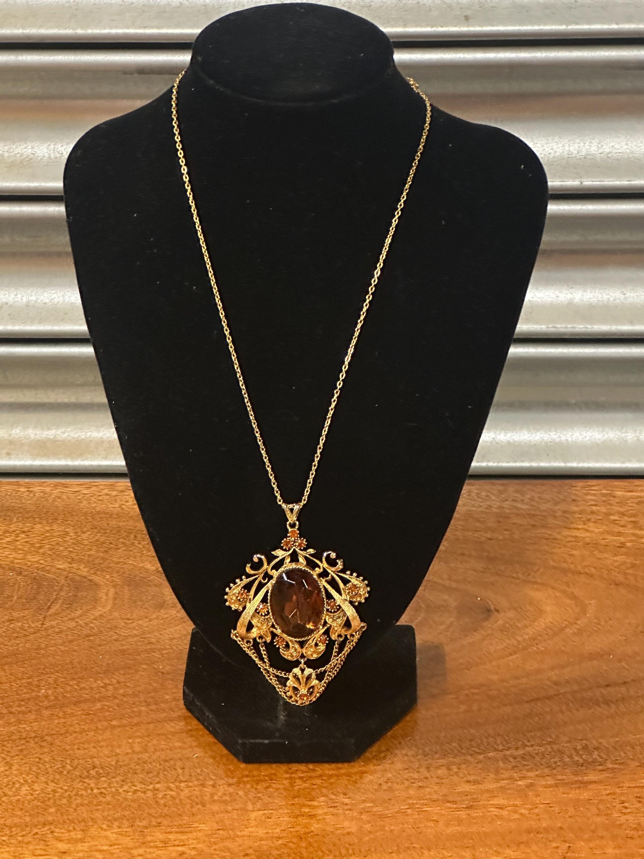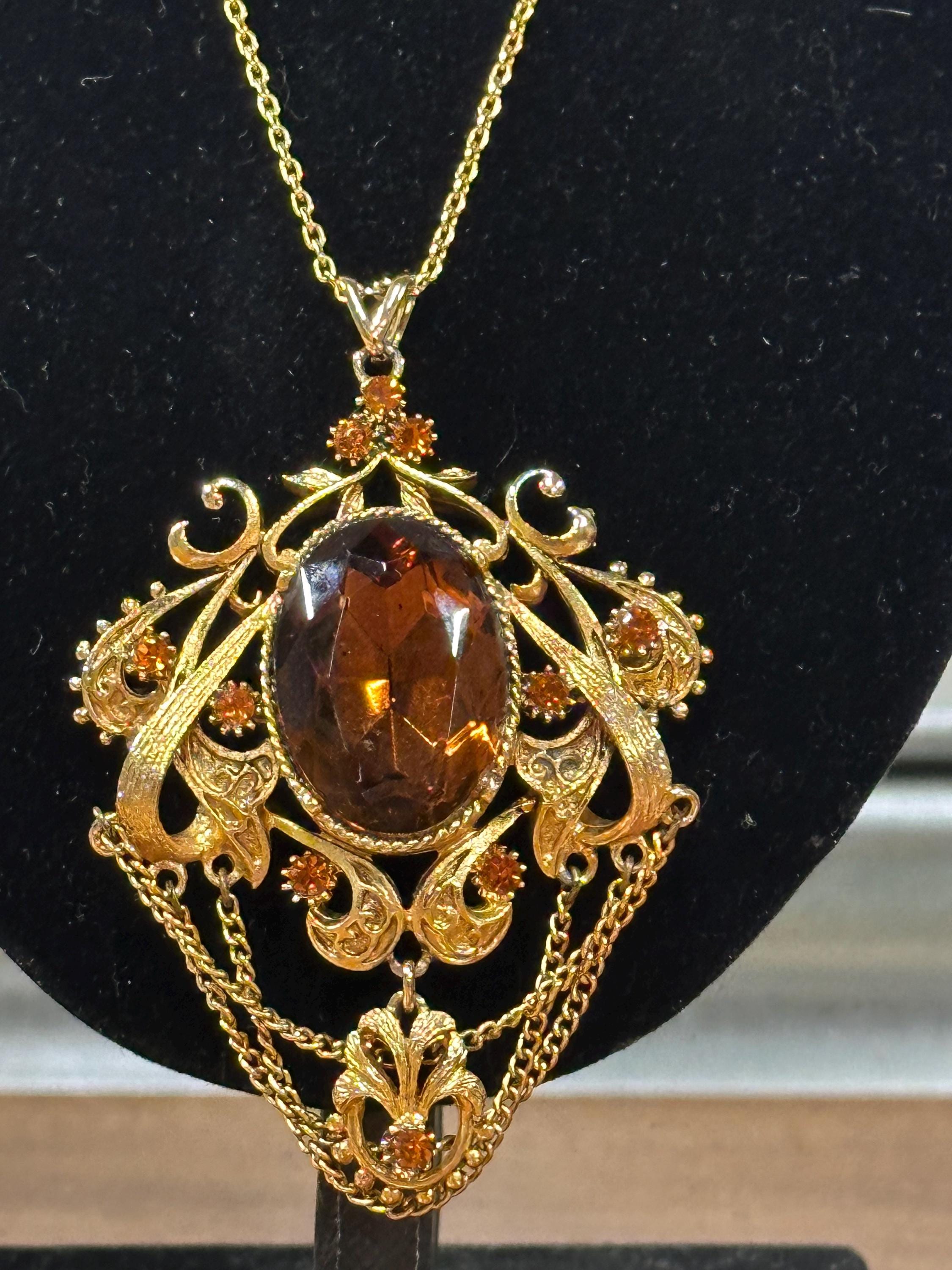 A striking vintage pendant necklace dating to the circa 1960s, beautifully crafted in ornate gold-tone metal. The large statement pendant features an intricate openwork filigree design with scrolling details and decorative chain swags, centred by a faceted amber-coloured stone that catches the light beautifully.