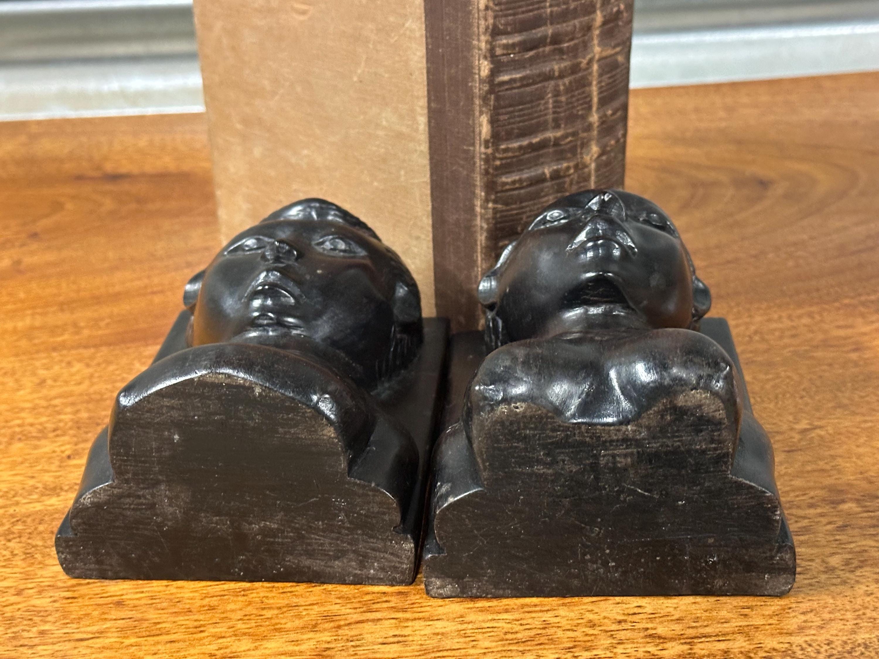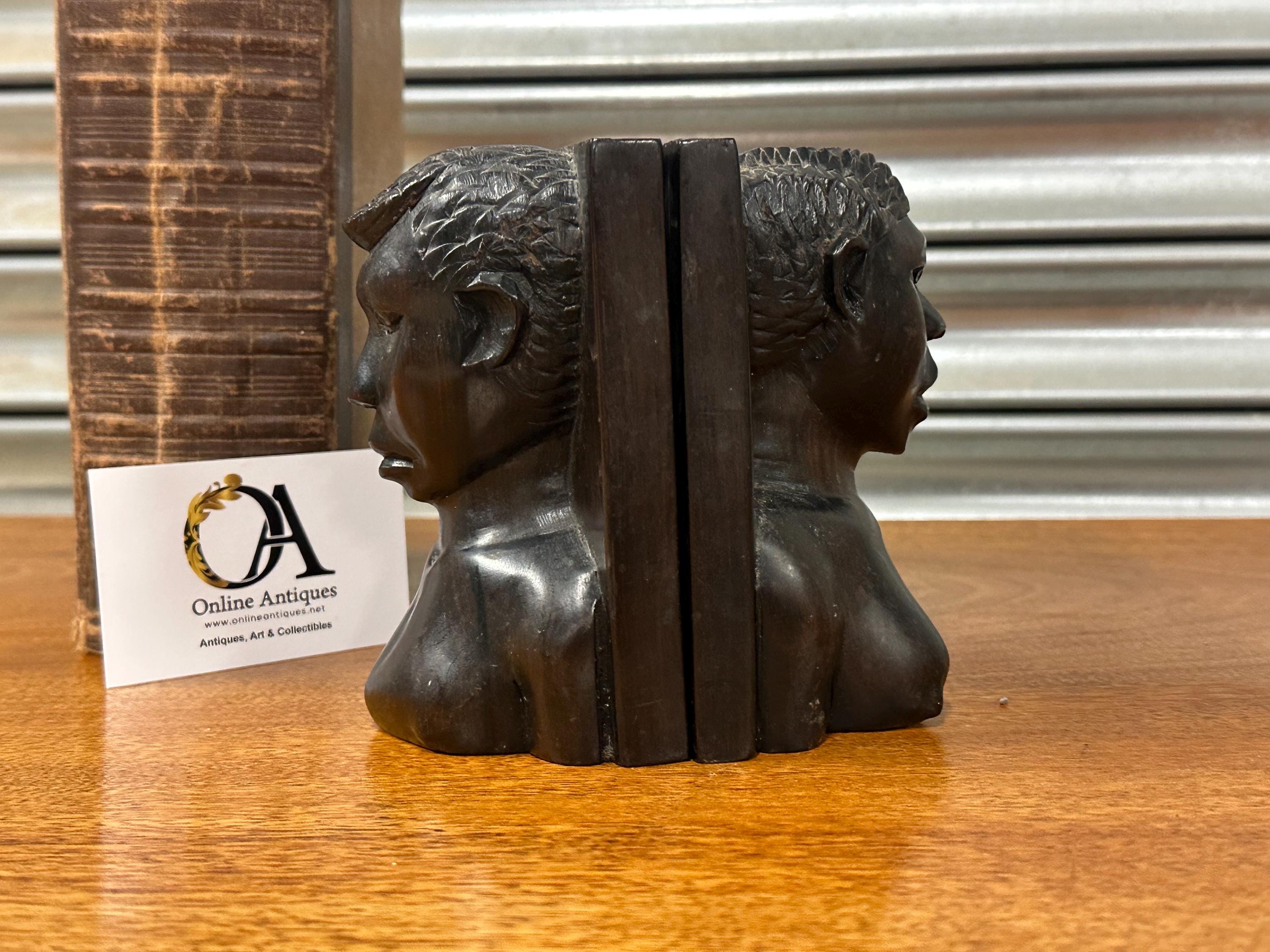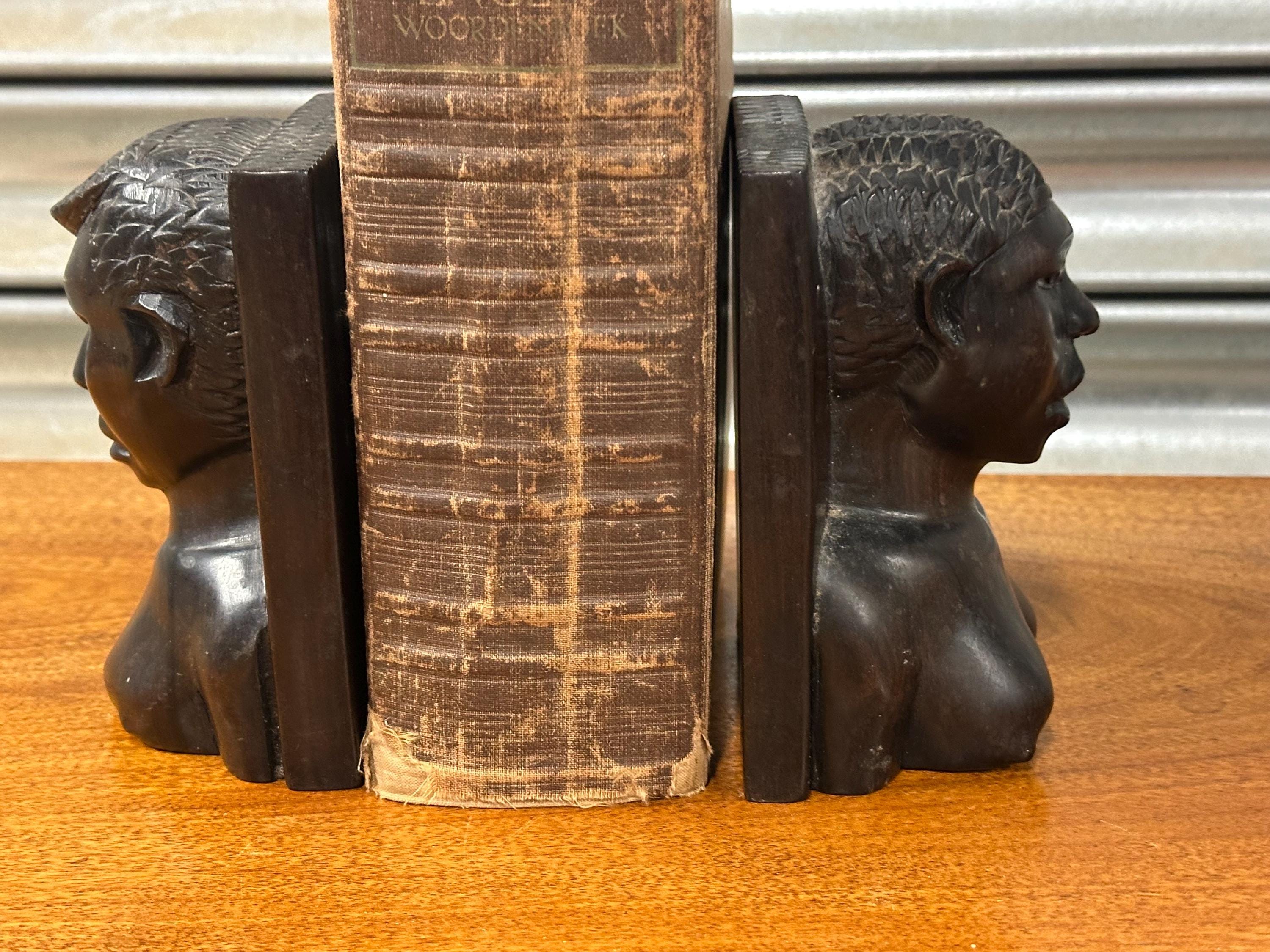 A striking pair of vintage hand-carved wooden bookends, carved as stylised figural busts with strong facial features and textured hair detail. The sculptural form and rich dark patina give these bookends a powerful, decorative presence, making them as much works of art as functional pieces.