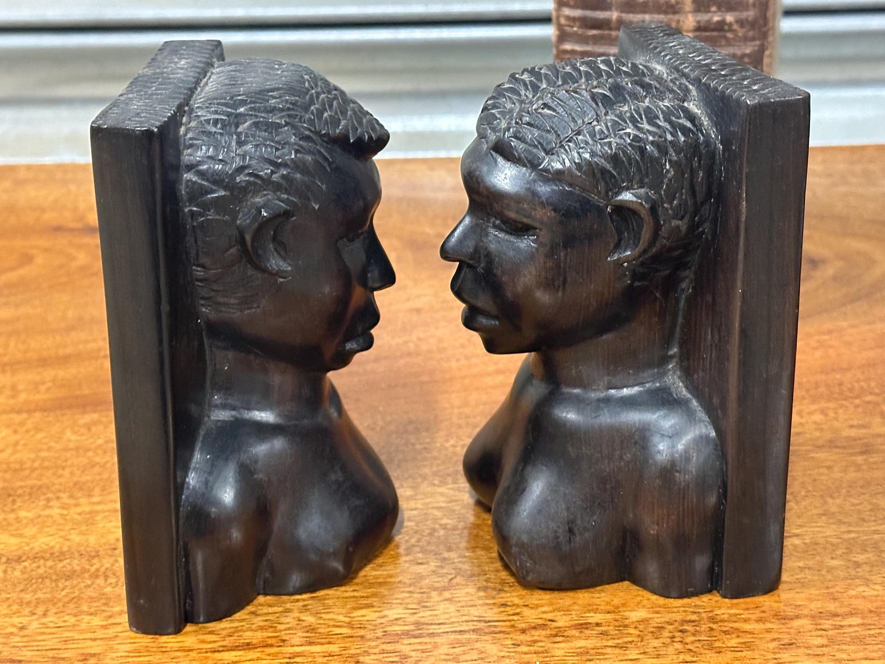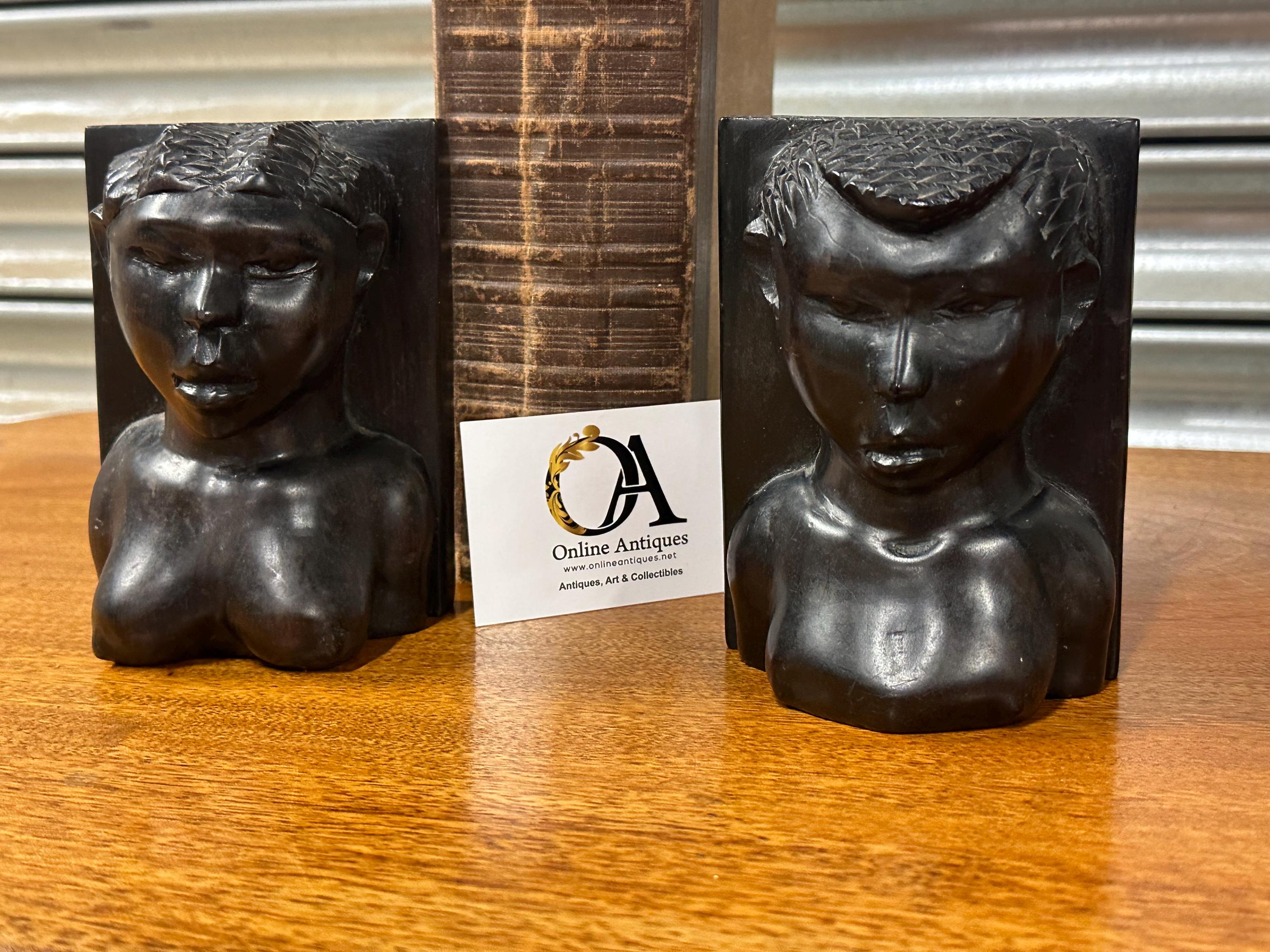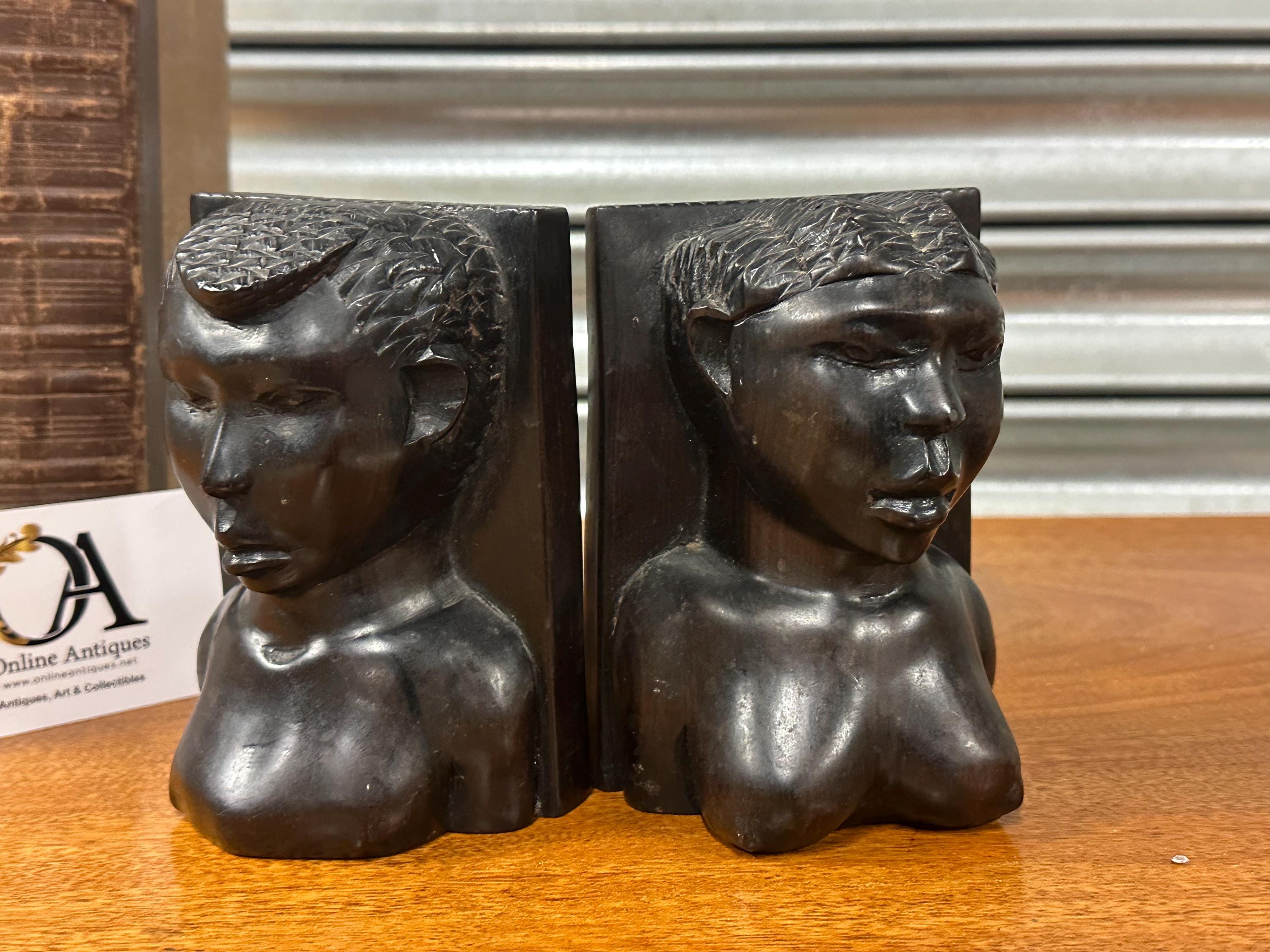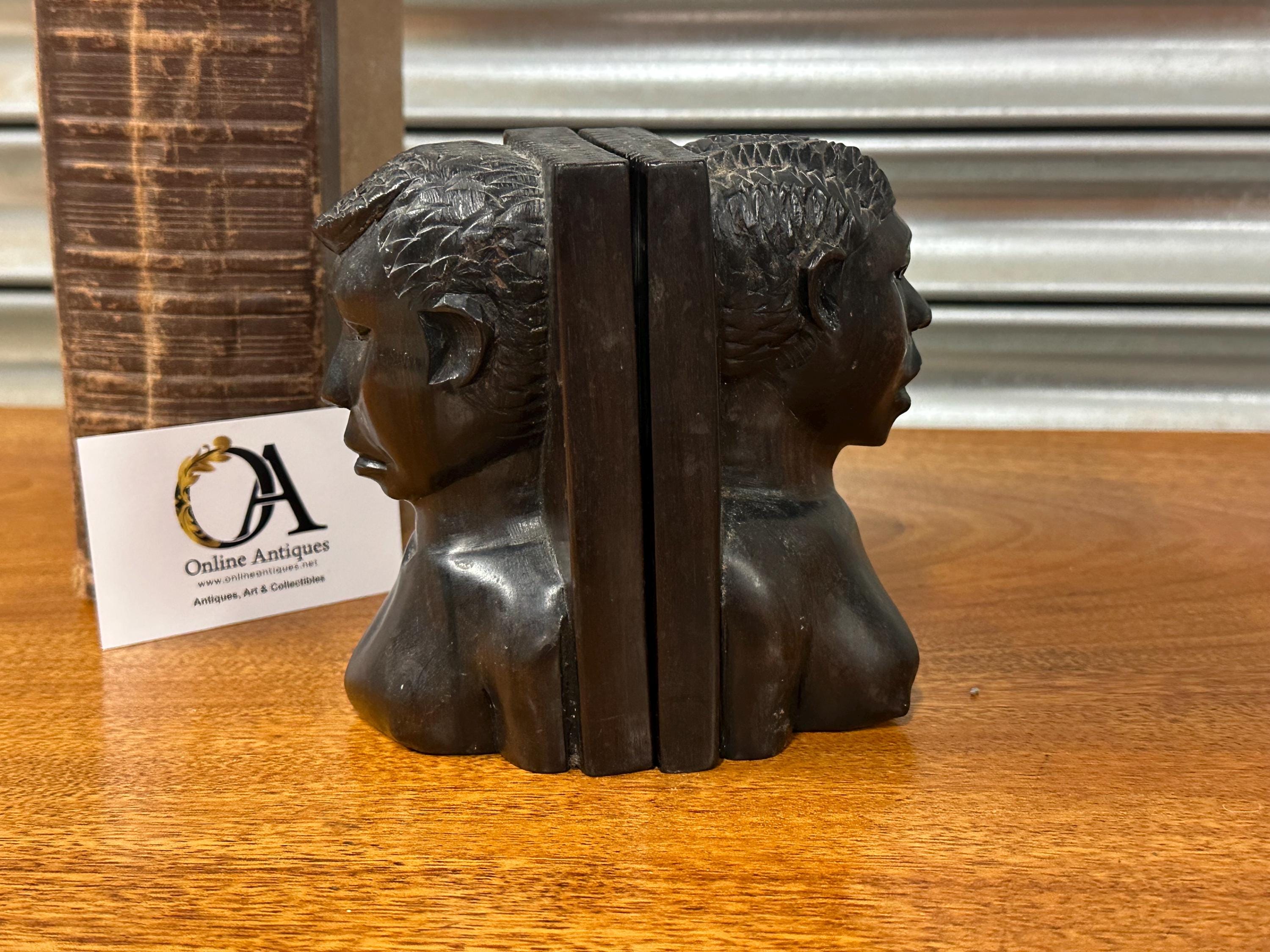 A striking pair of vintage hand-carved wooden bookends, carved as stylised figural busts with strong facial features and textured hair detail. The sculptural form and rich dark patina give these bookends a powerful, decorative presence, making them as much works of art as functional pieces.
