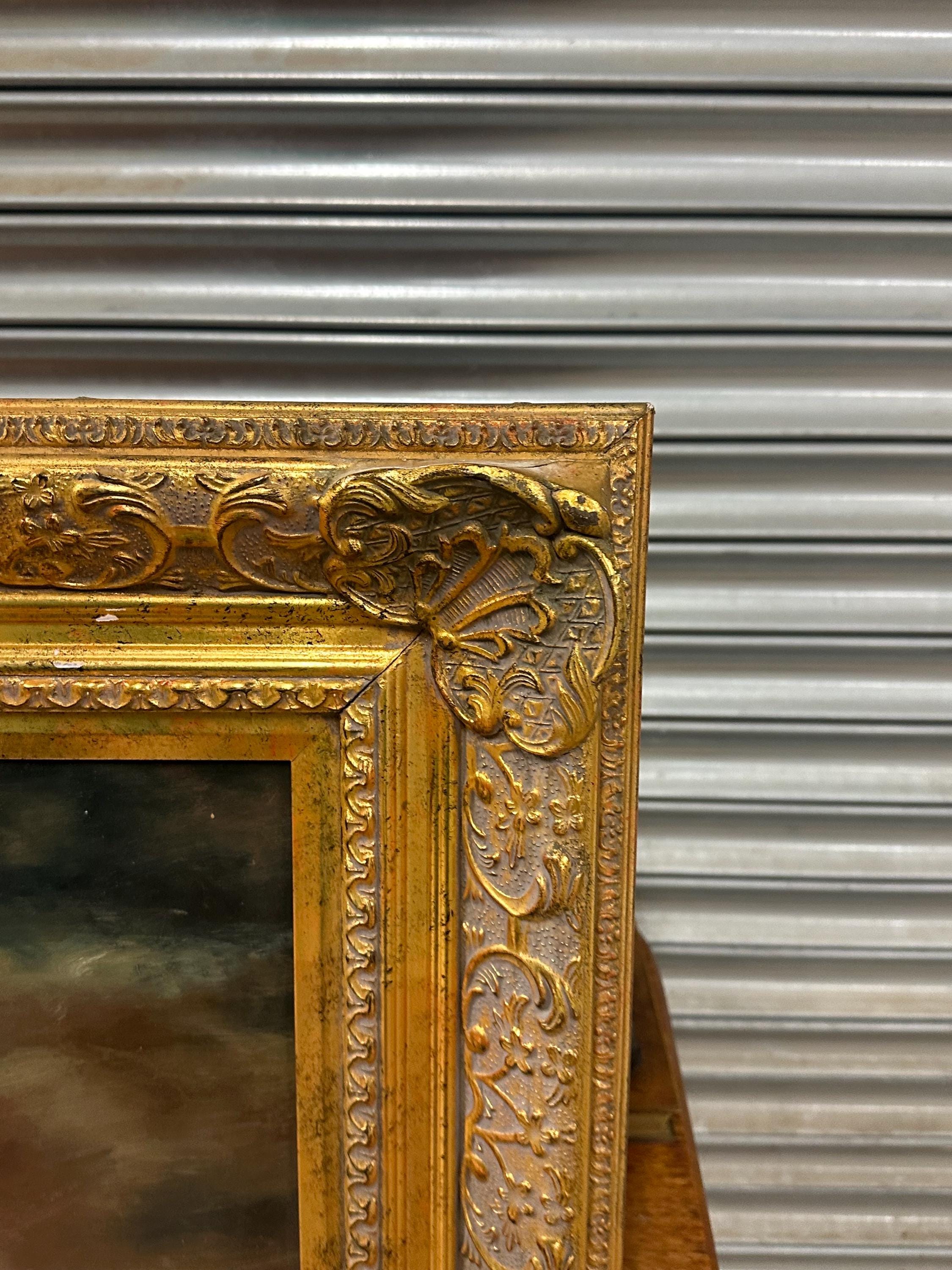 Housed in an impressive and richly detailed ornate gilt frame with deep scrolling foliate decoration. The frame is substantial and enhances the presence of the artwork, making it an eye-catching statement piece.
