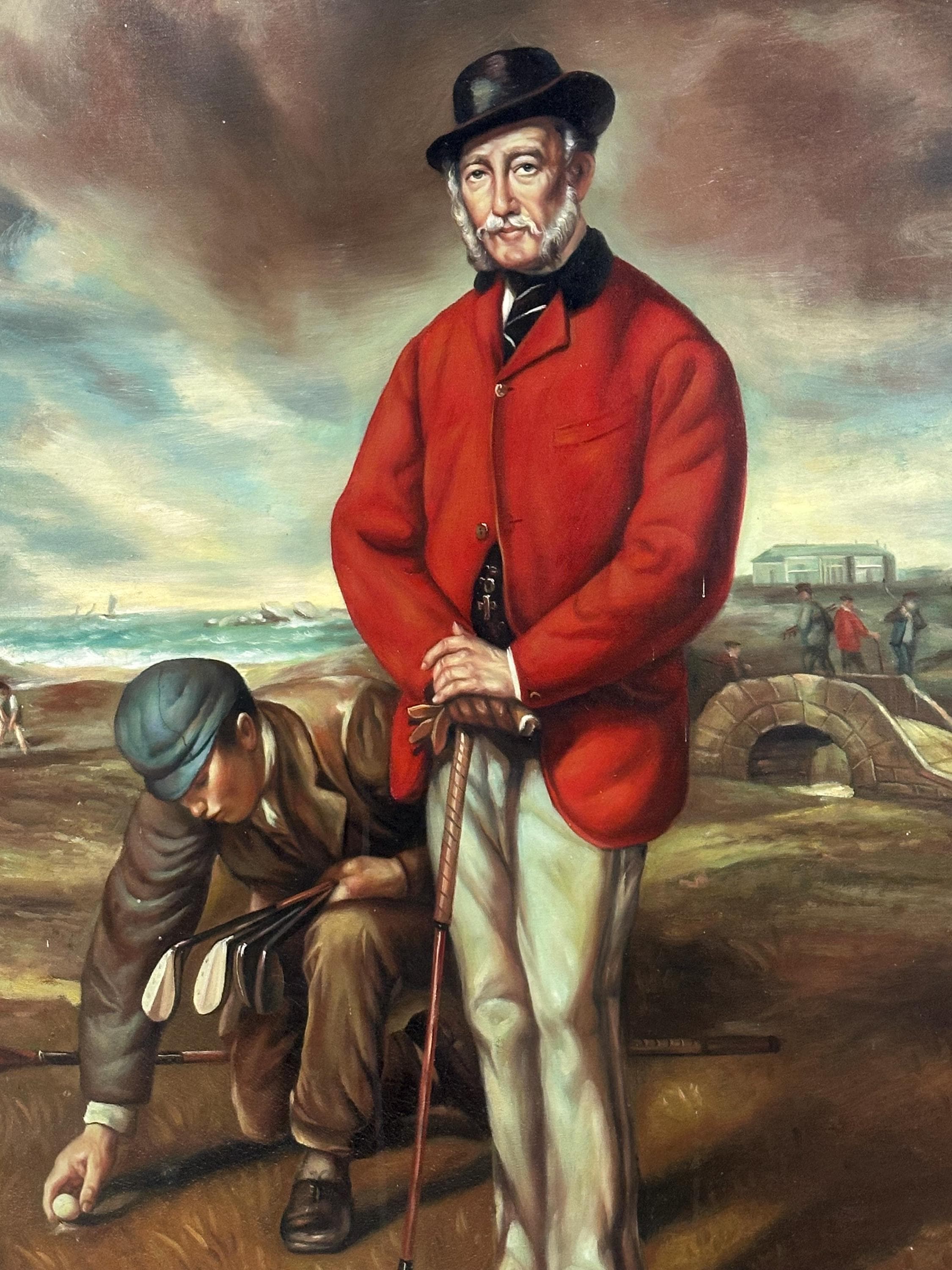 The work successfully combines portraiture with landscape, offering strong narrative interest through the inclusion of a caddie in the foreground and a dramatic, atmospheric sky. The painting has excellent depth and character, making it a particularly appealing piece for collectors of sporting art and Scottish history.