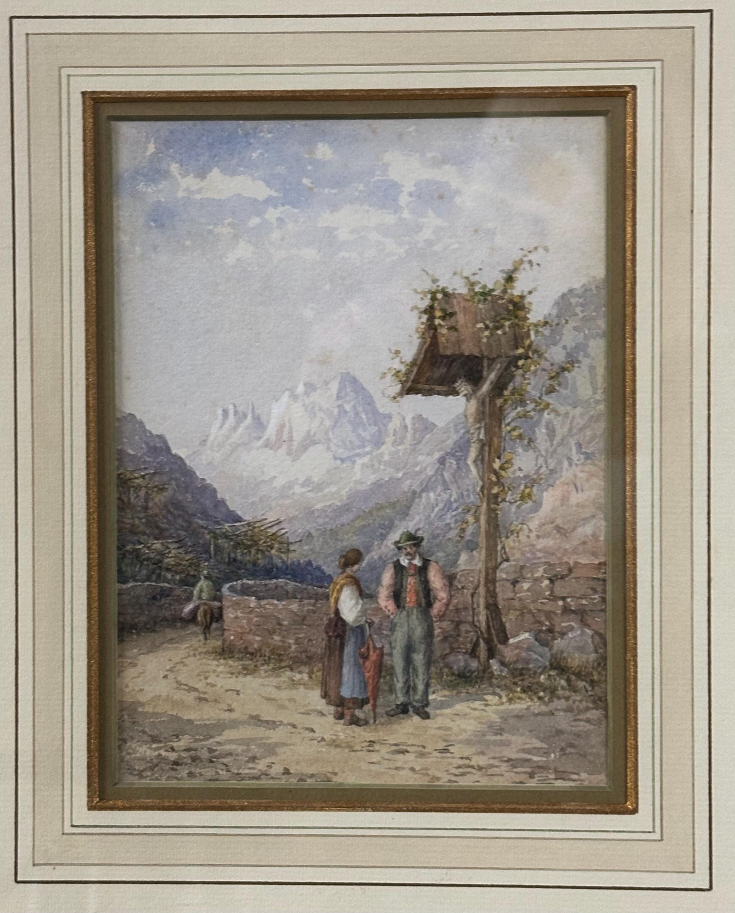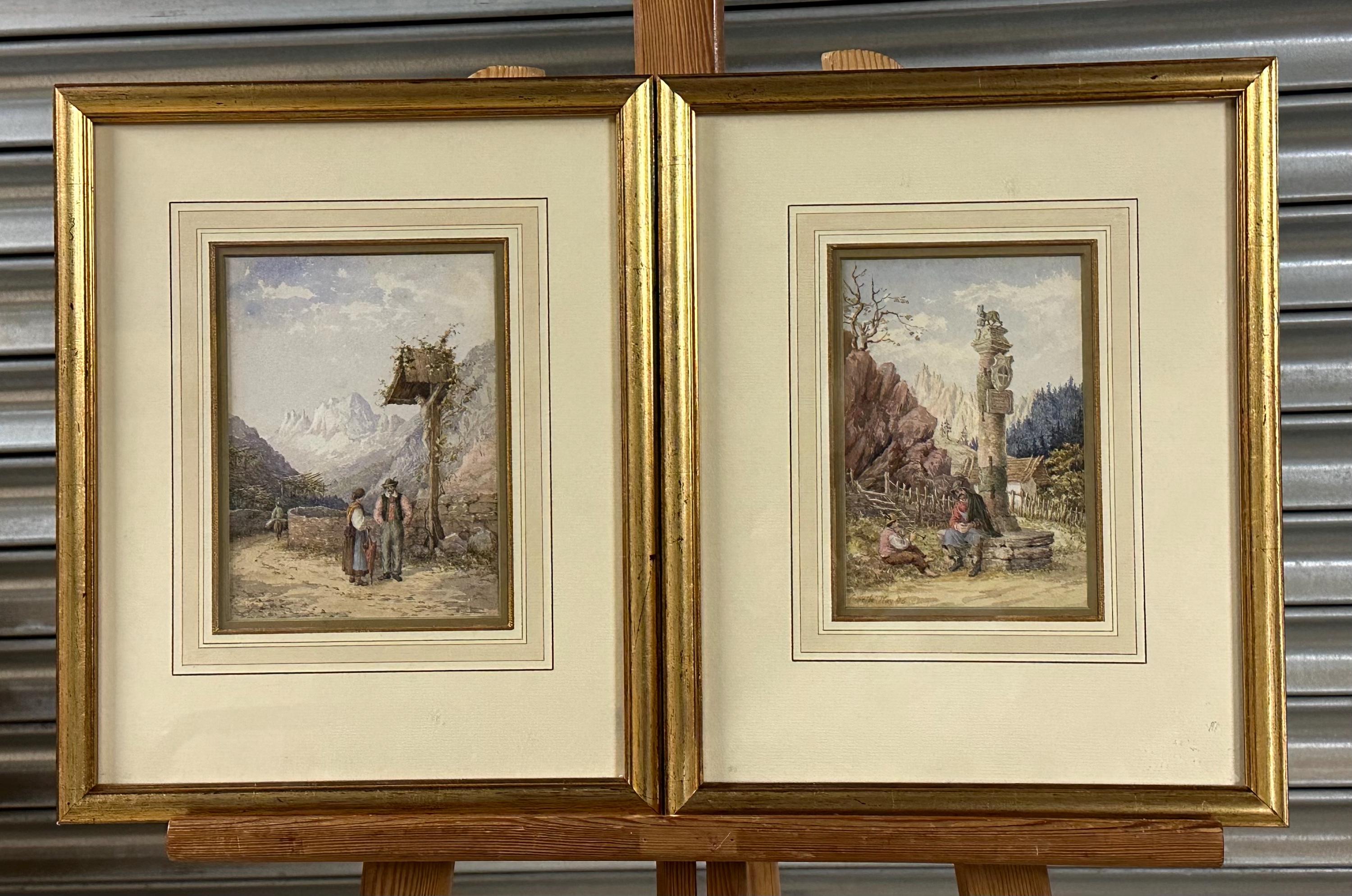 Both works show charming rural figures set within dramatic mountain landscapes, featuring traditional dress, rustic wells and wayside structures, with snow-capped peaks beyond. The palette is soft and harmonious, with confident draughtsmanship and fine detail typical of late Victorian Alpine travel watercolours.