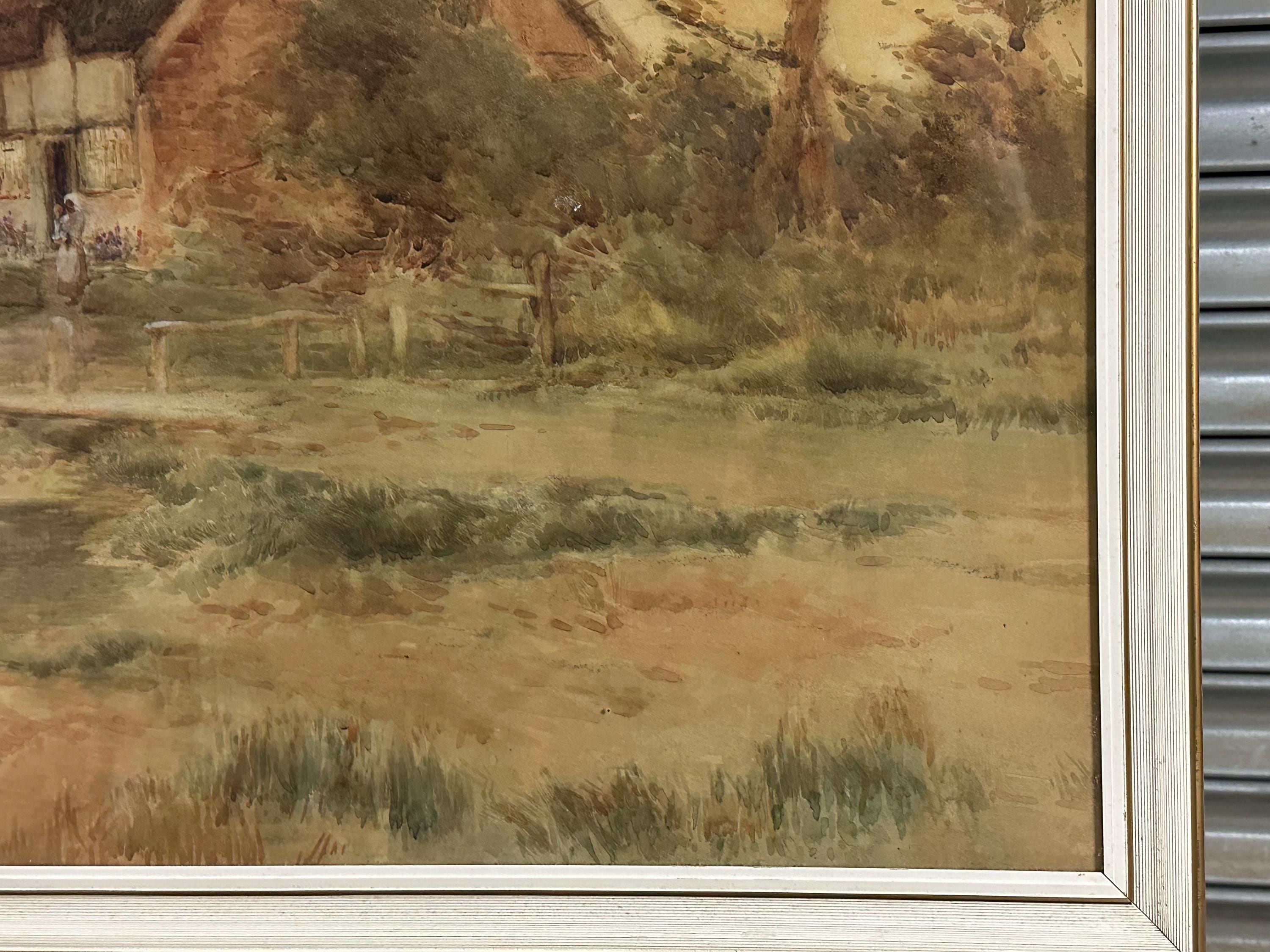 The scene is animated by small figures at the water’s edge, adding scale and narrative interest, while soft reflections in the water enhance the sense of calm. Executed in warm, muted earth tones, the artist uses delicate washes and fine detail to capture light, texture and atmosphere, typical of late Victorian / Edwardian pastoral watercolours.