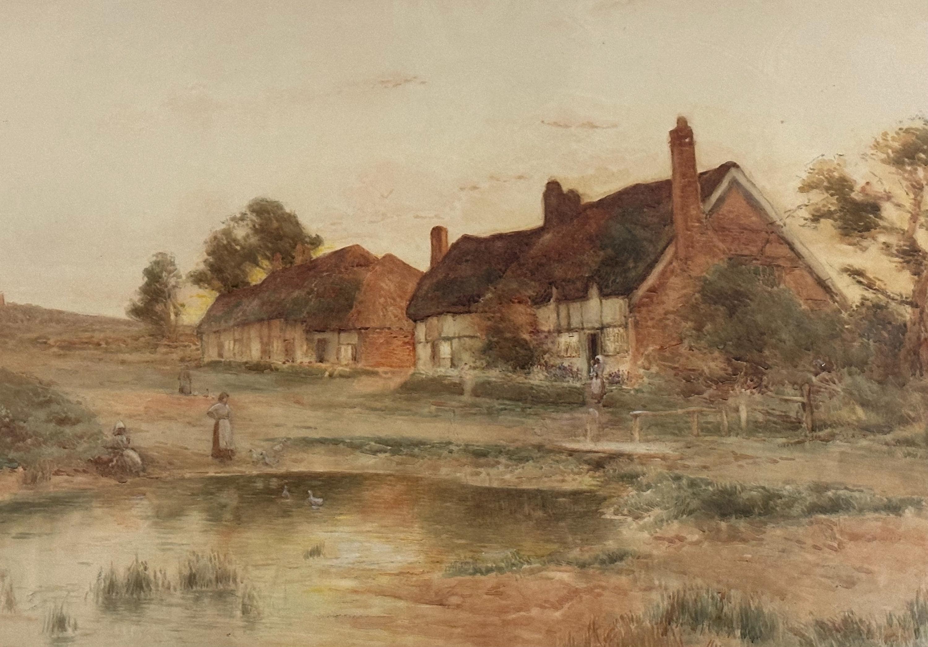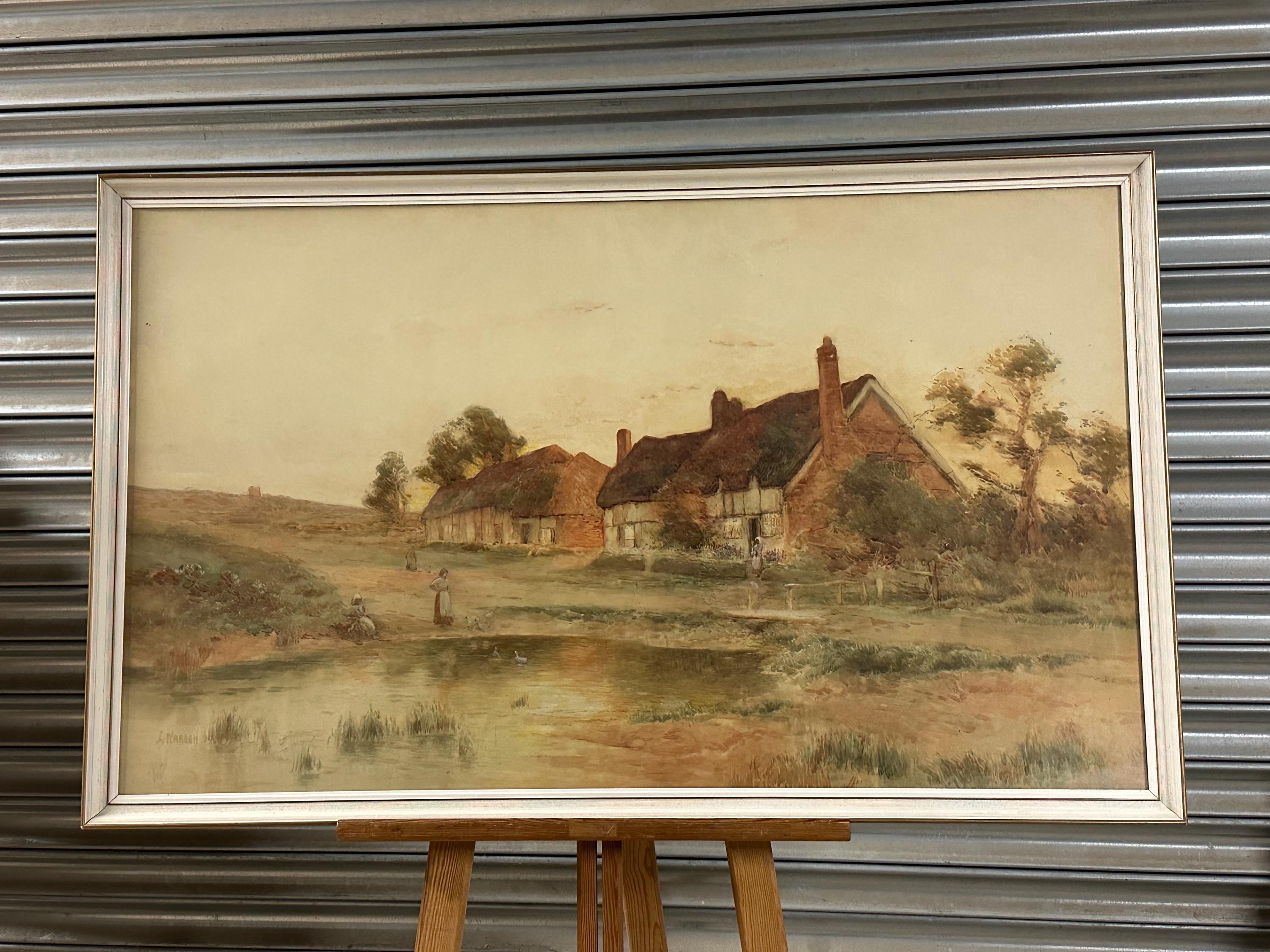 A charming and atmospheric large watercolour dated 1900 by L. Warden, depicting a tranquil English rural scene at the turn of the 20th century. The composition centres on a group of traditional thatched cottages with tall brick chimneys, set beside a shallow pond or stream, with gently rolling countryside beyond.