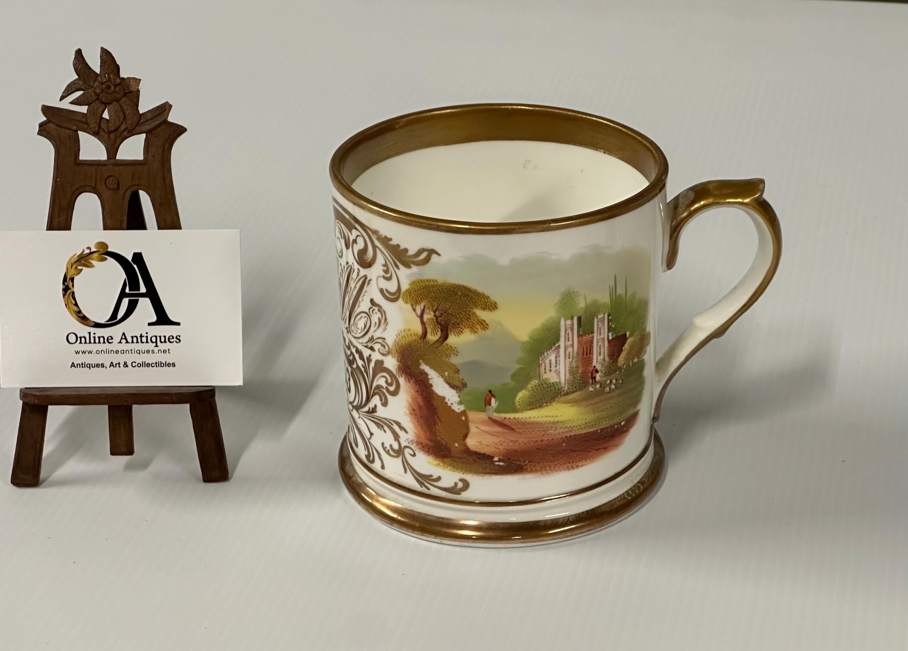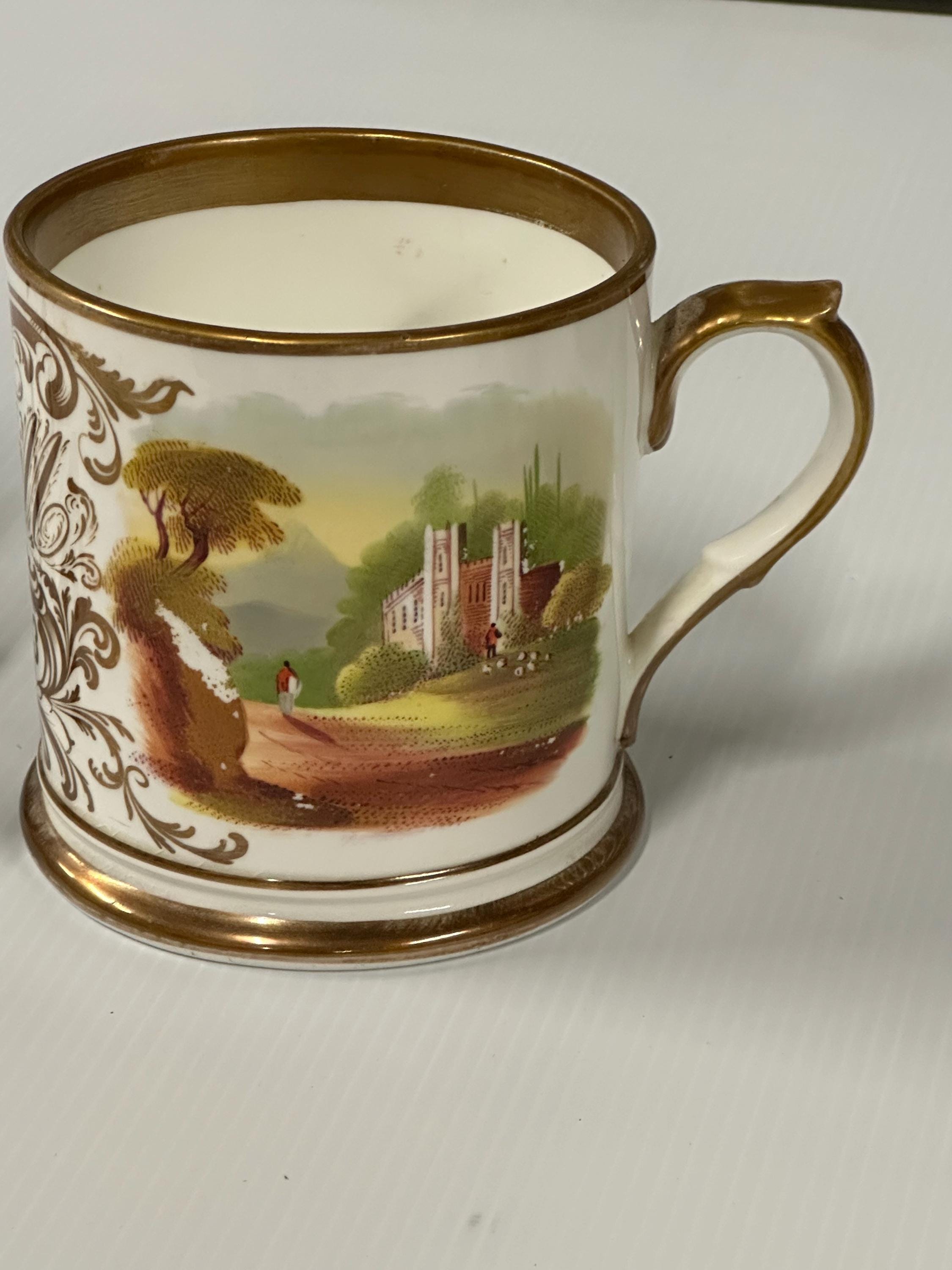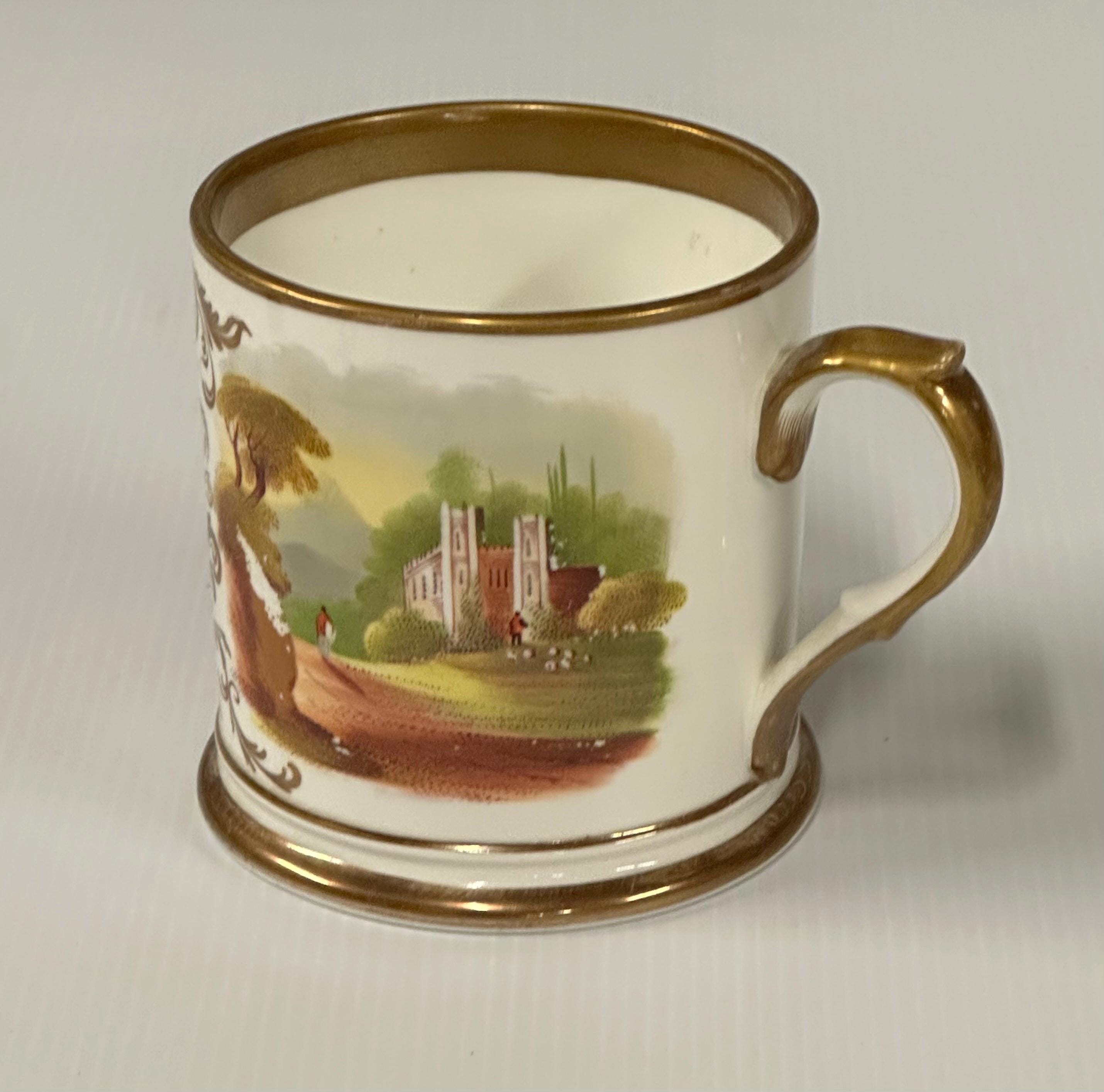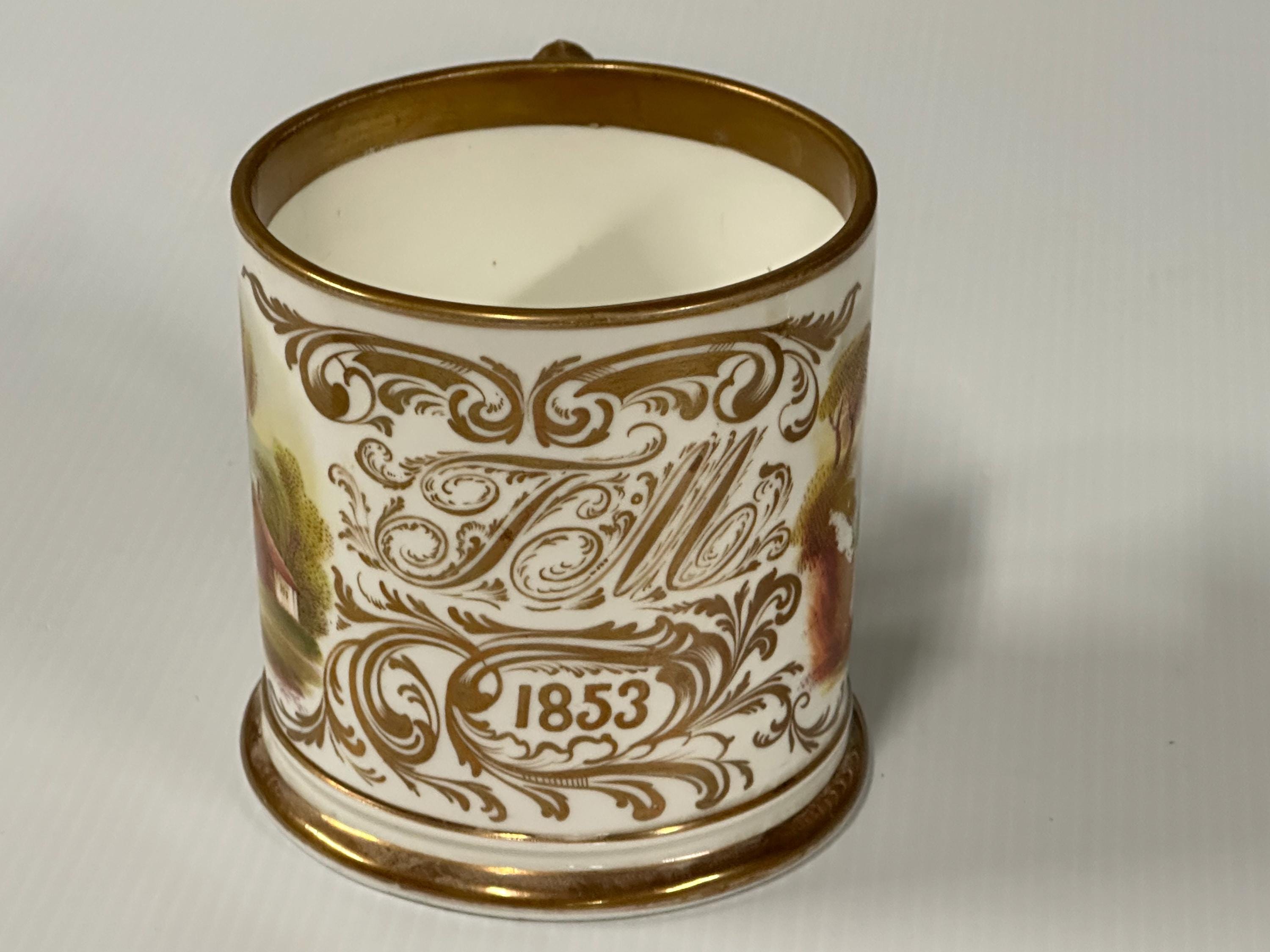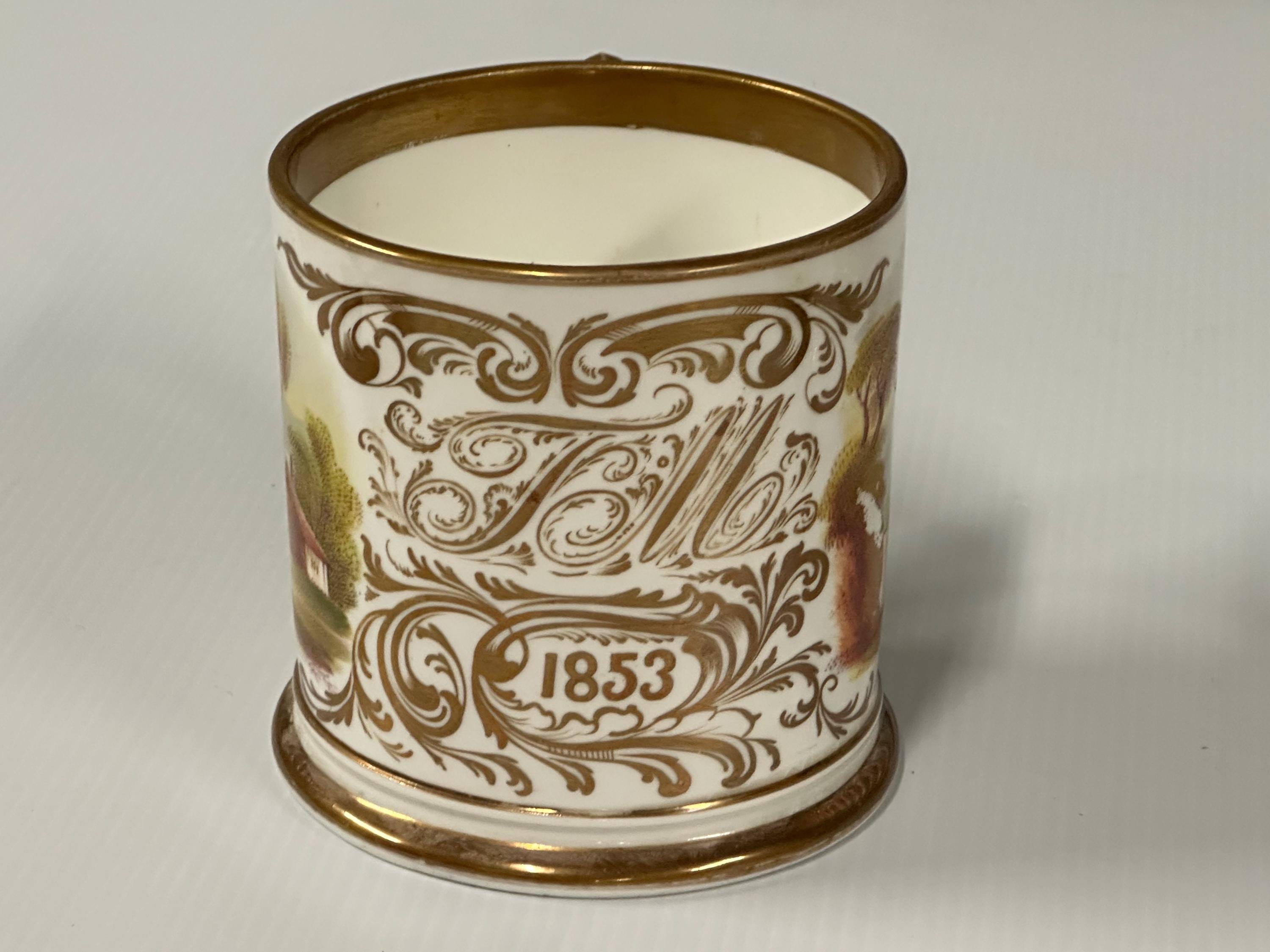 Antique Porcelain Christening Mug / Tankard – Dated 1853 – Hand-Painted Landscape & Gilt Decoration