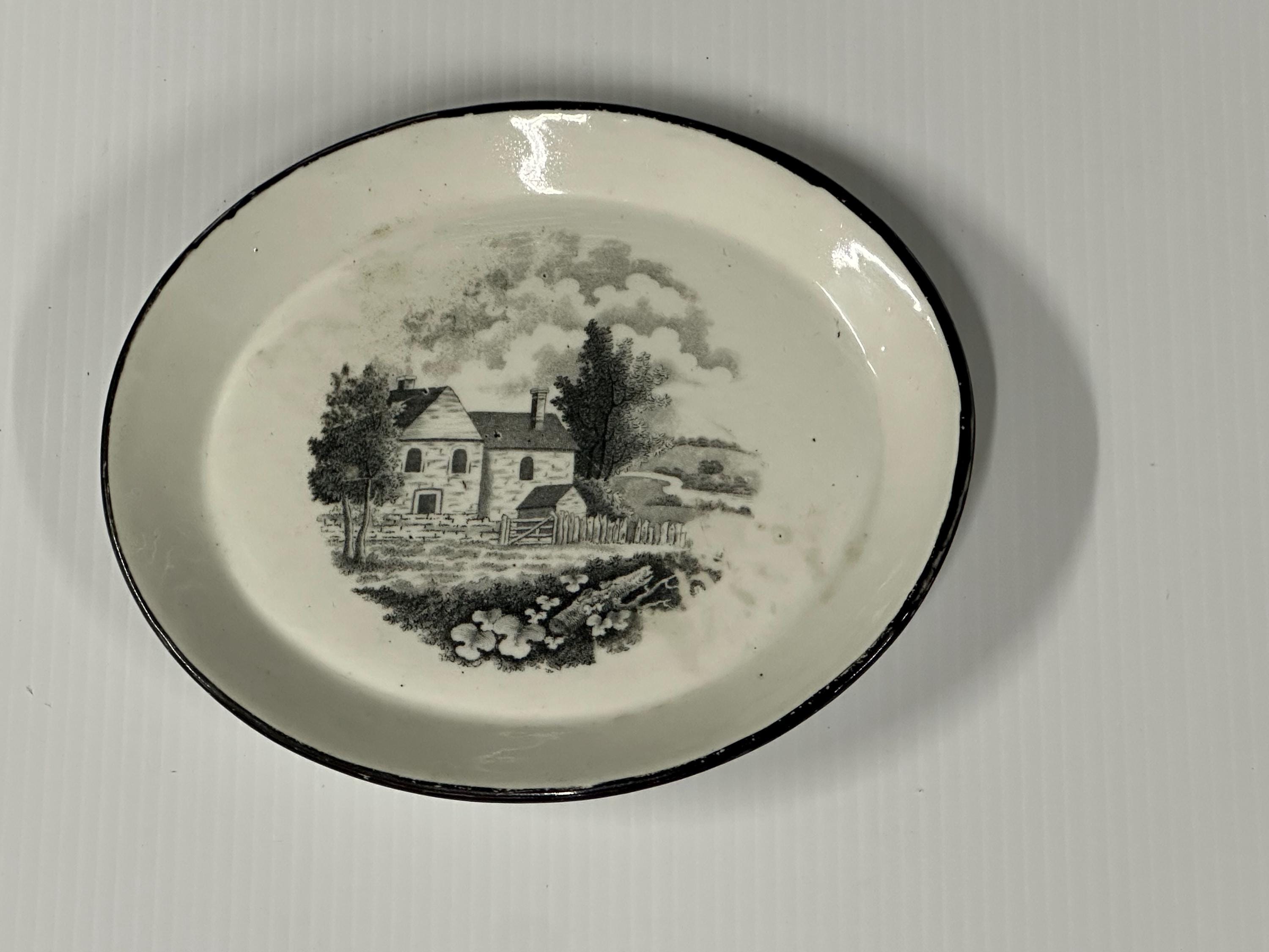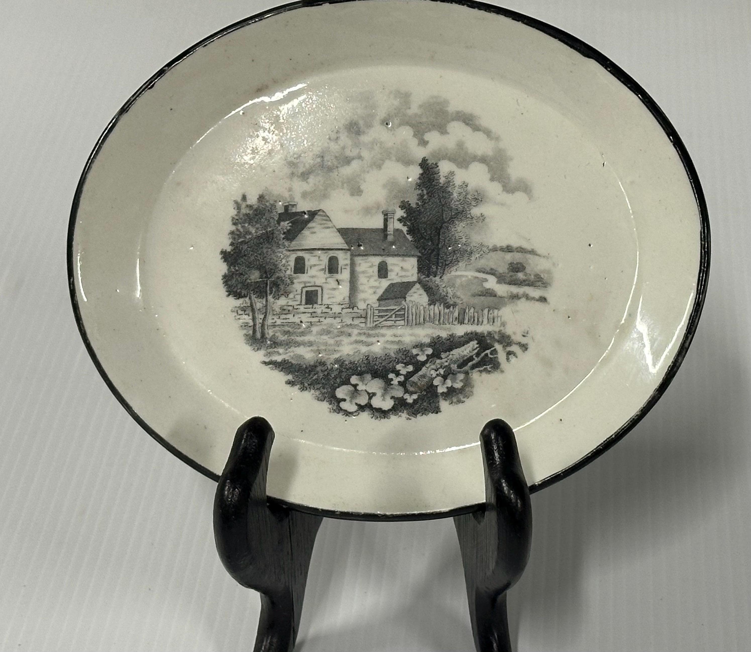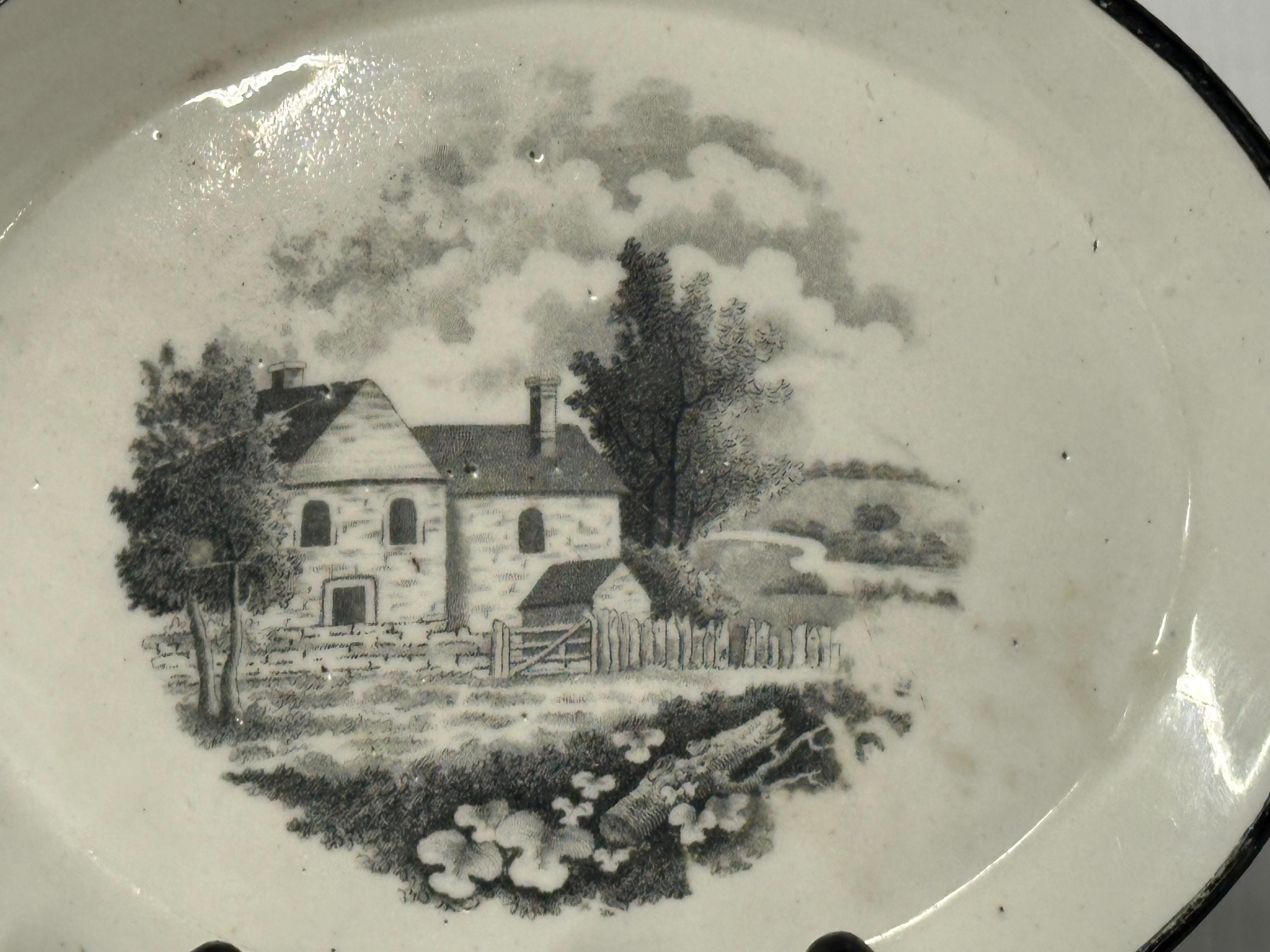 A charming and authentic Georgian-era earthenware plate by New Hall, dating to circa 1795–1805. Decorated with a finely detailed black transfer-printed rural cottage scene, typical of late 18th-century English pottery, with trees, fencing and countryside beyond.