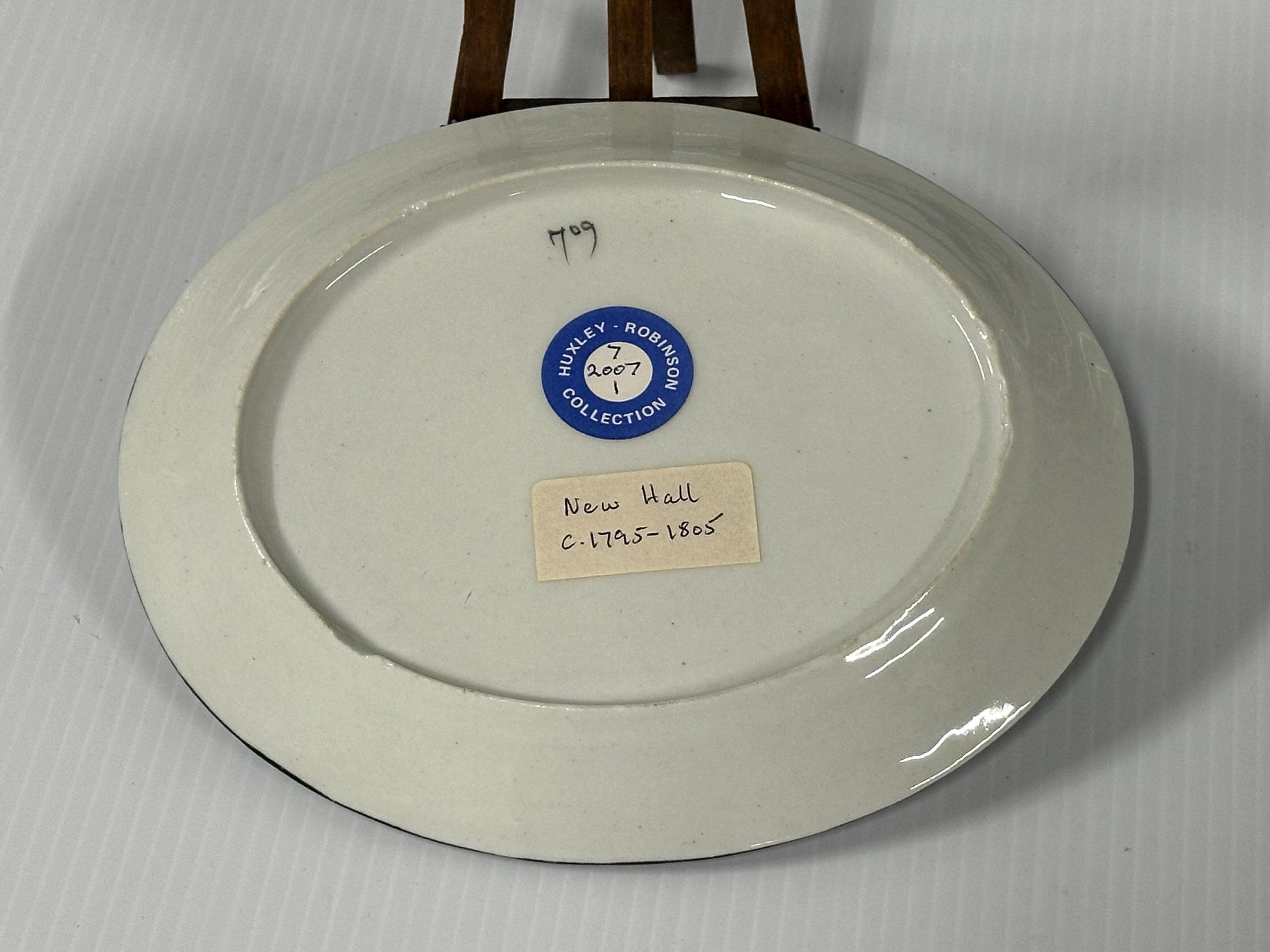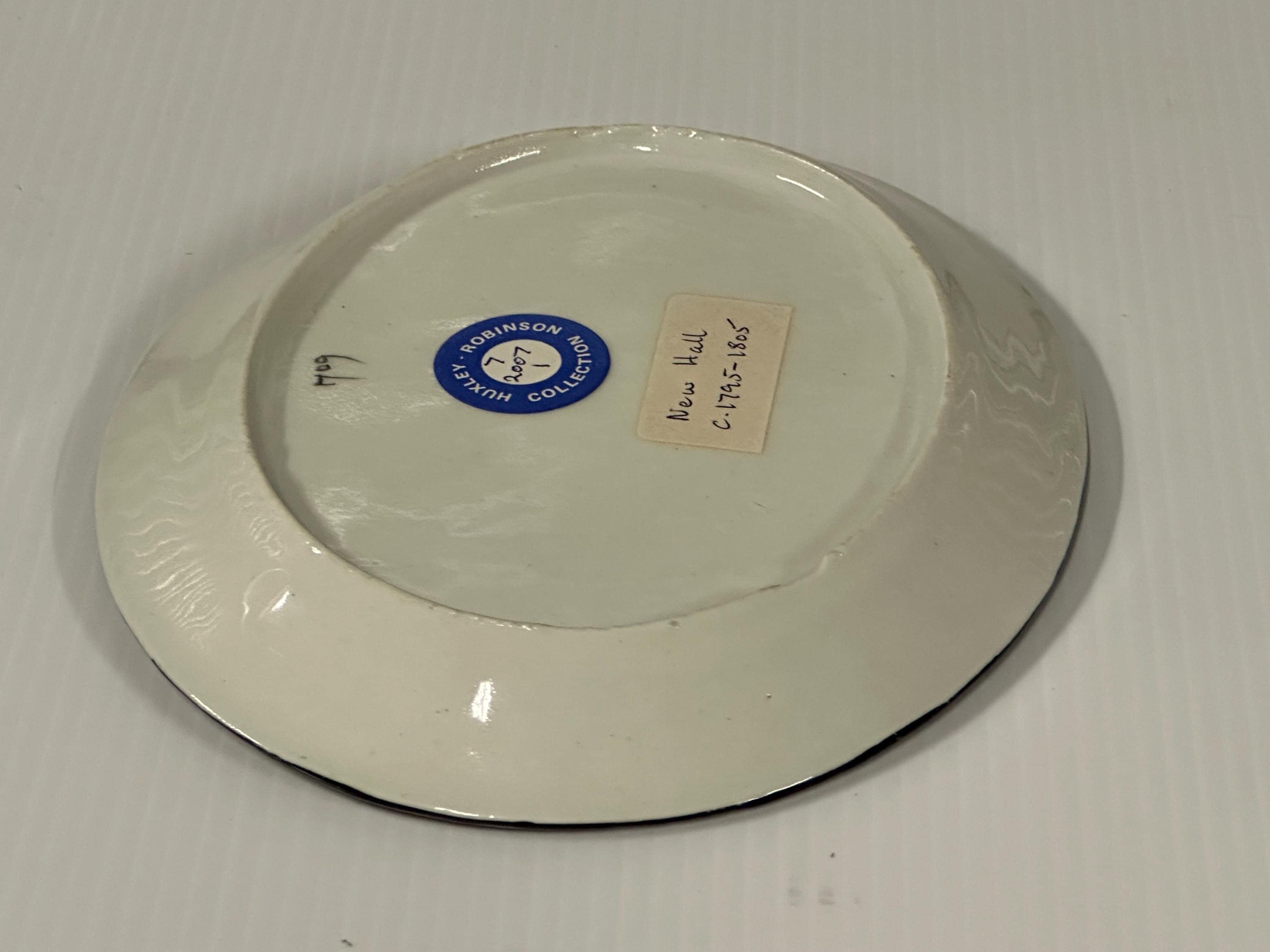 The plate has a creamware body with a black-lined rim, consistent with New Hall production of the period. The reverse bears an old Huxley-Robinson Collection label and a handwritten attribution noting New Hall and the date range, adding to its provenance and collectability.