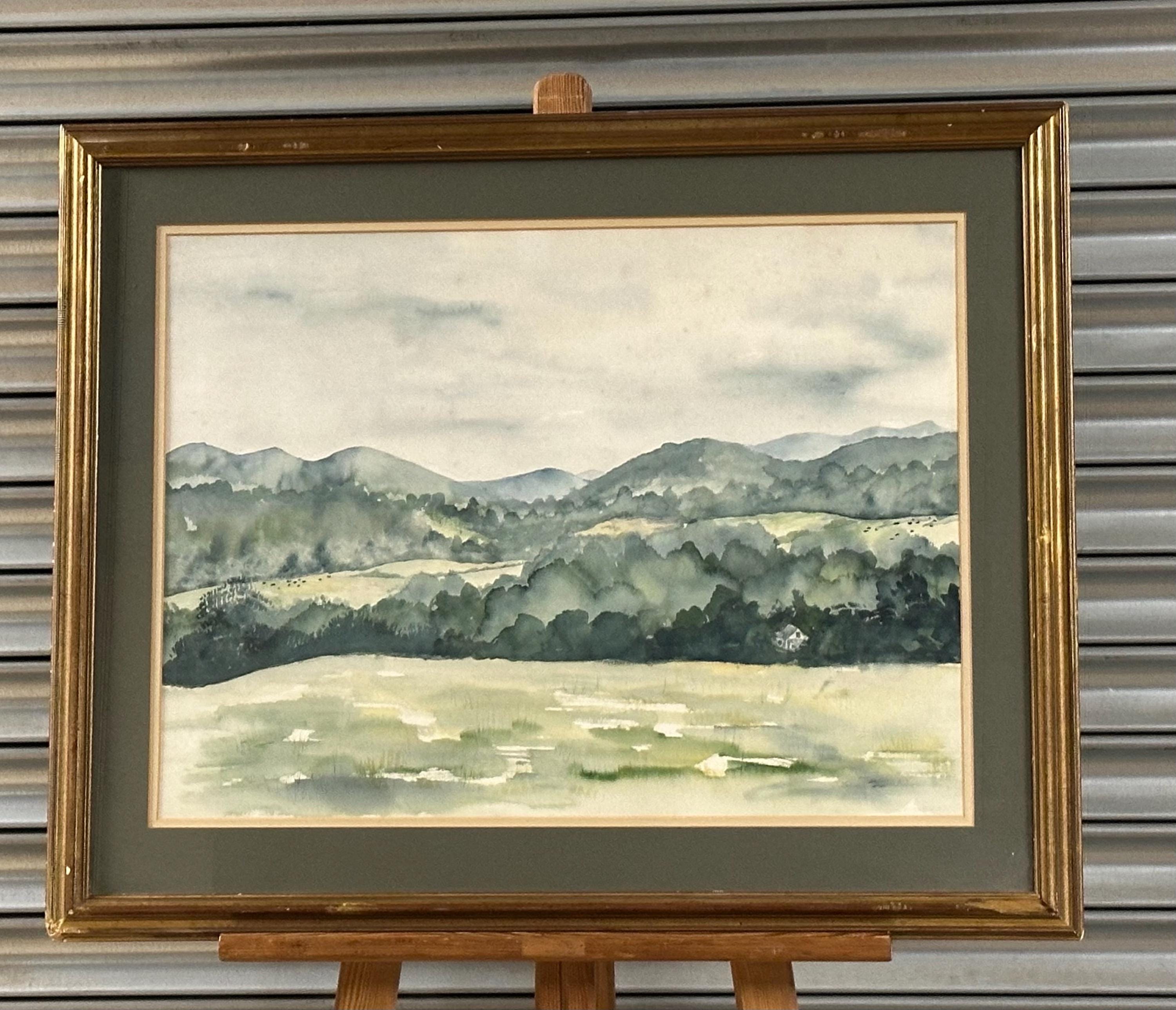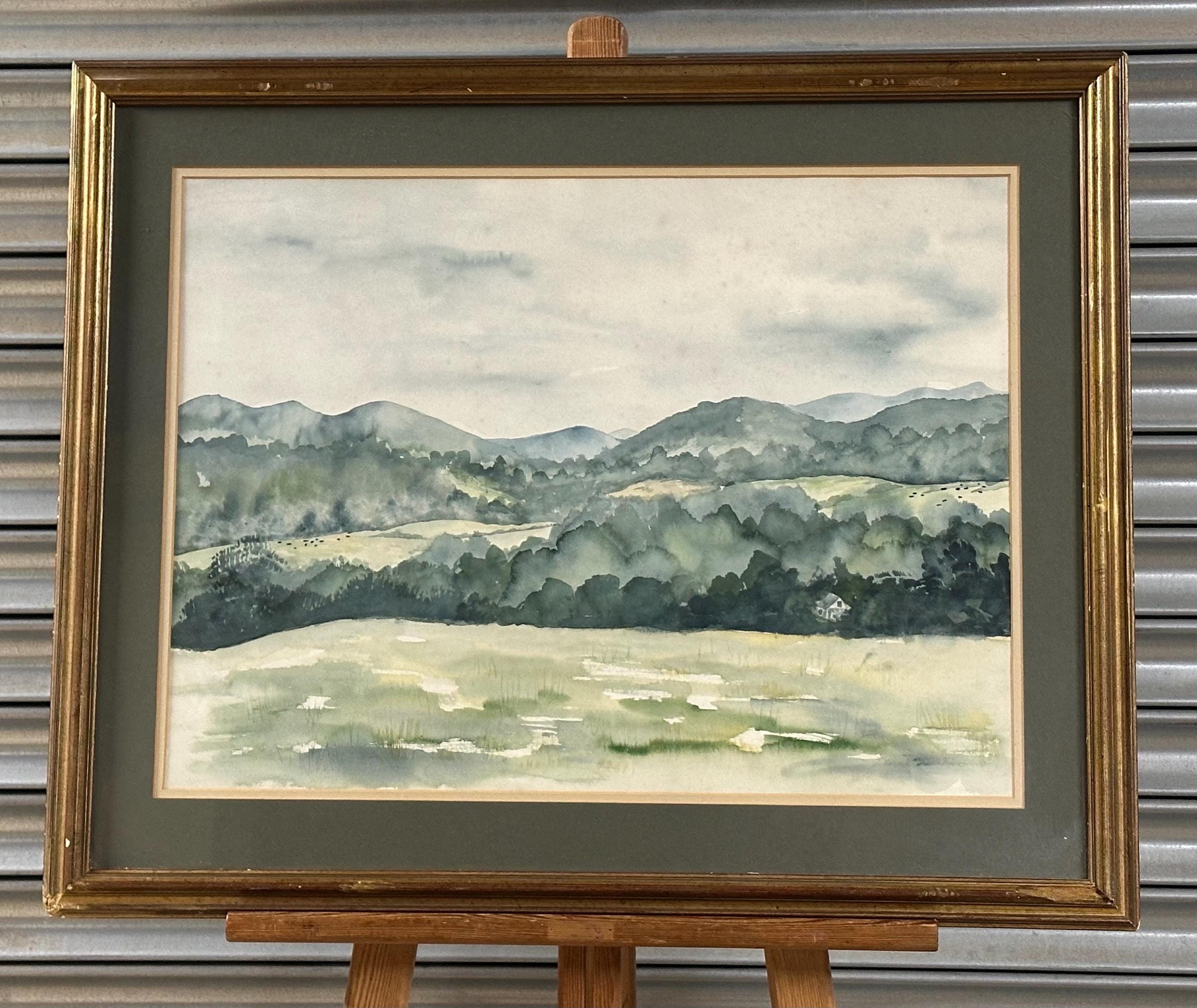 Original watercolour by Carl Zimmerman, depicting a tranquil rolling landscape with distant hills, wooded valleys and open pasture in soft, atmospheric tones. The artist uses gentle washes and subtle colour transitions to create depth and a sense of calm, typical of mid-20th-century American regional watercolour painting.