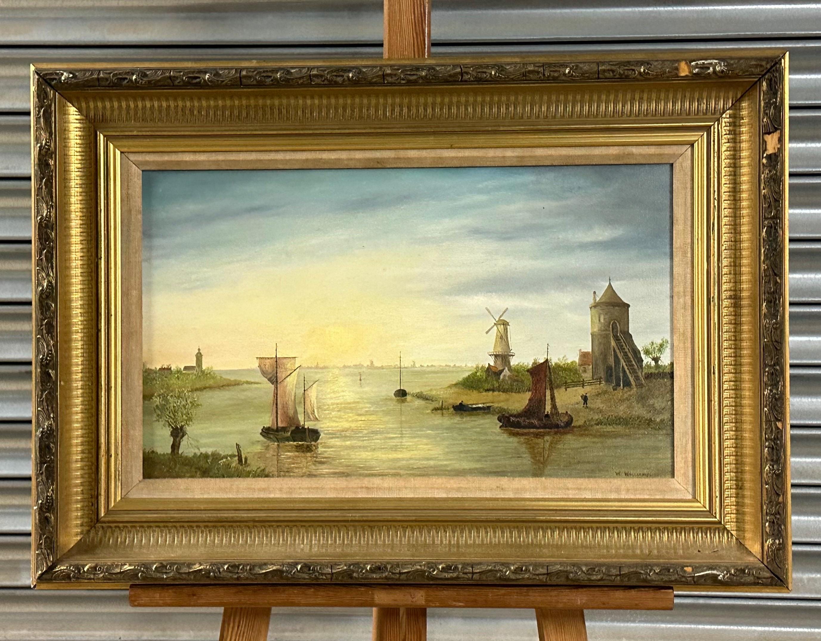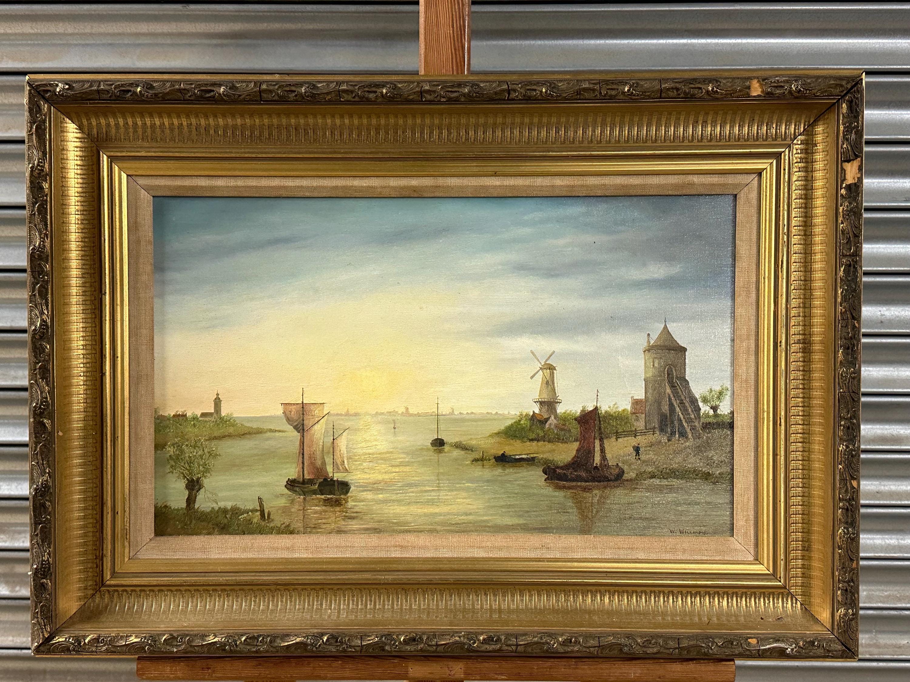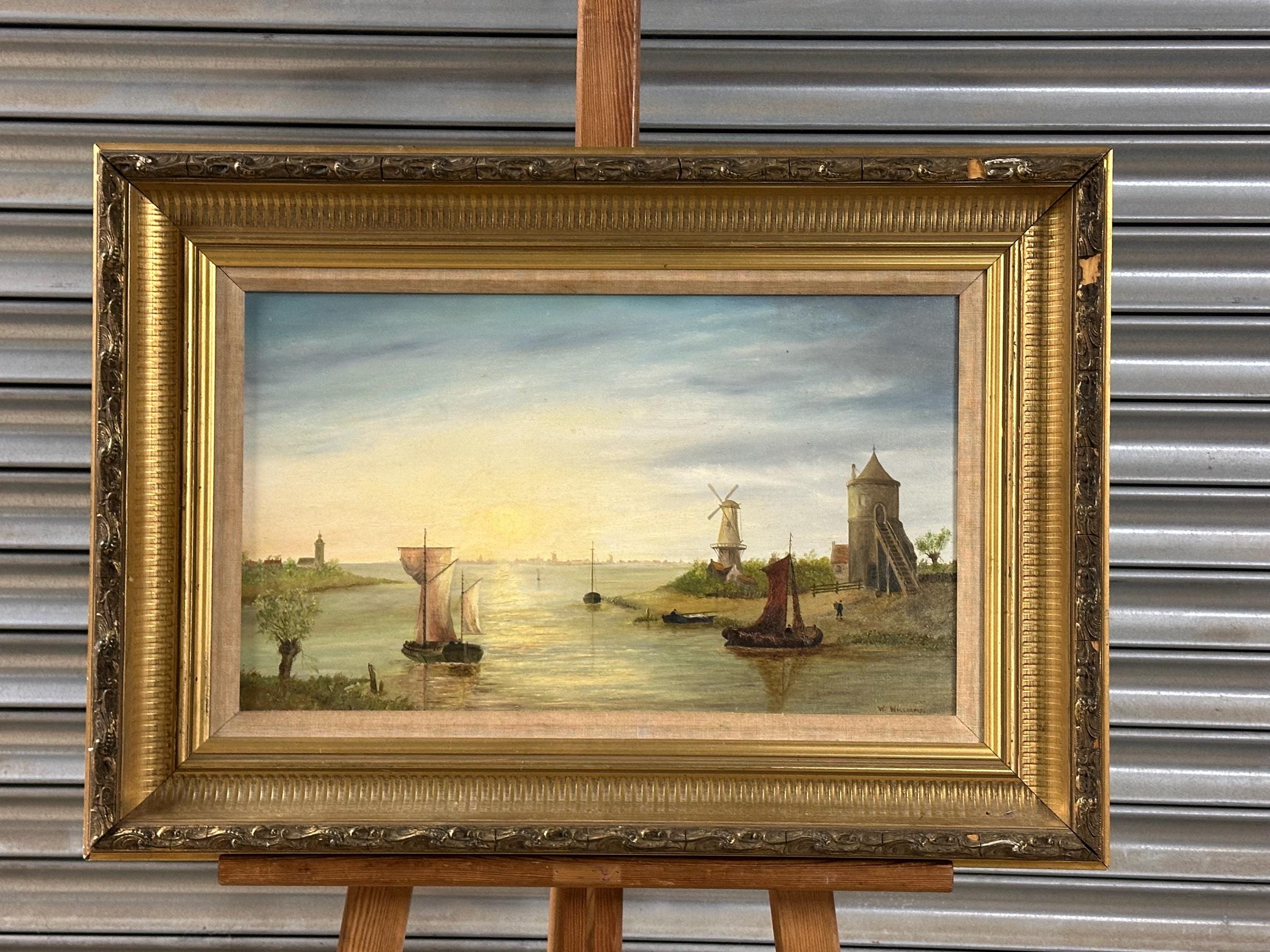 A charming antique oil painting on canvas, beautifully executed and signed W. Williams to the lower right. The scene depicts a tranquil river or estuary landscape with sailing boats, a windmill, and a towered building on the shoreline, all bathed in soft, atmospheric light. Titled Summer Sunrise, the composition and palette are strongly evocative of 19th-century Dutch or Continental river landscapes, with fine attention to reflection, sky, and perspective.