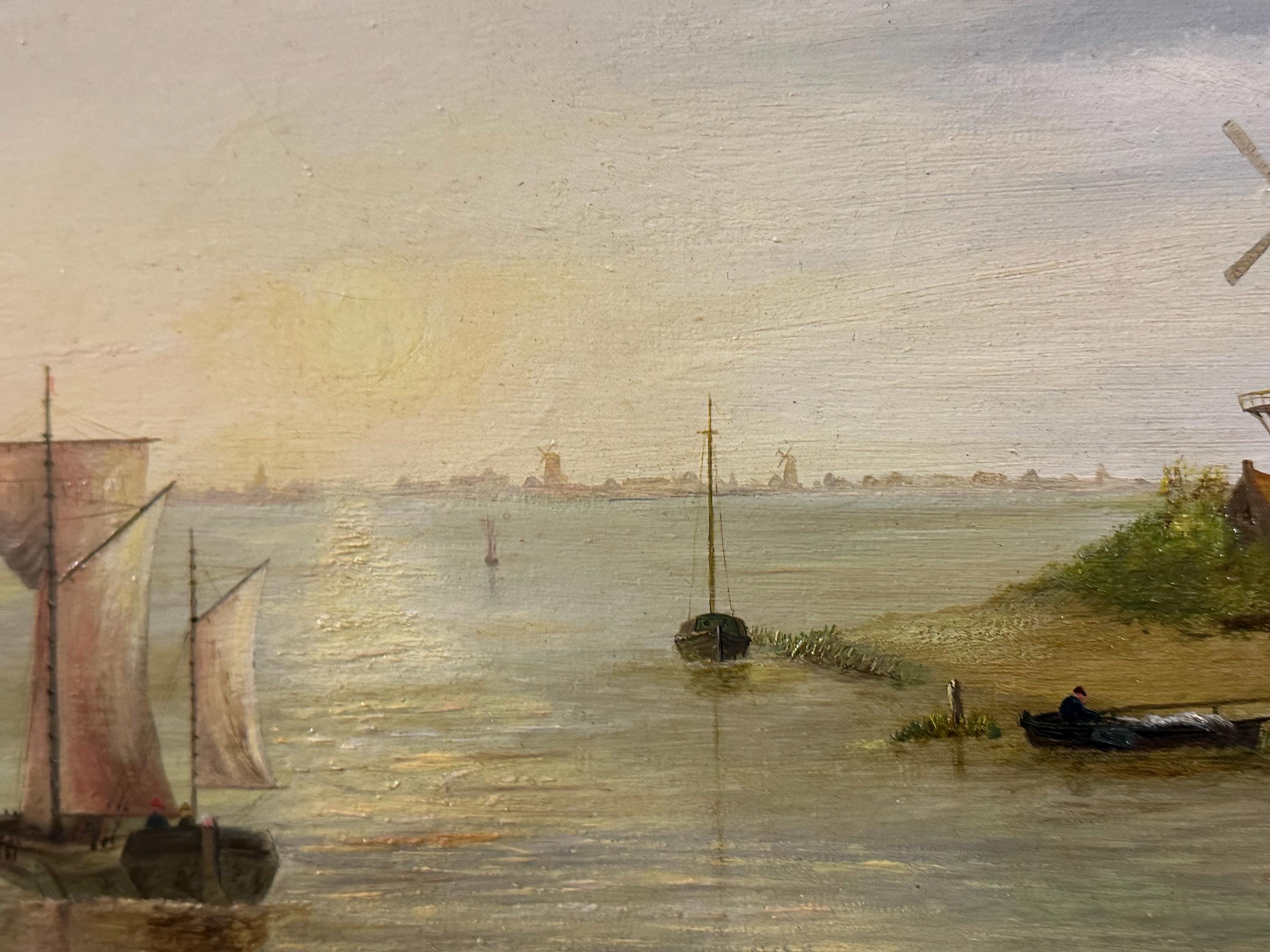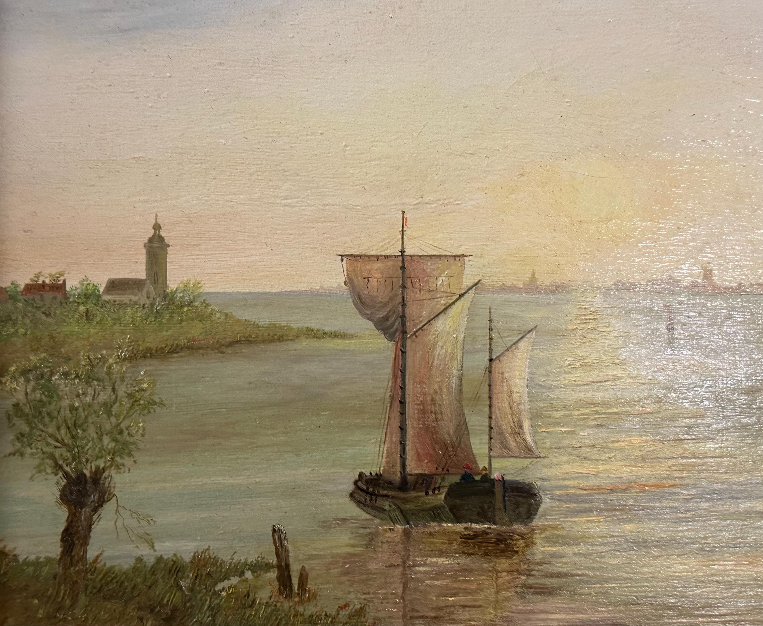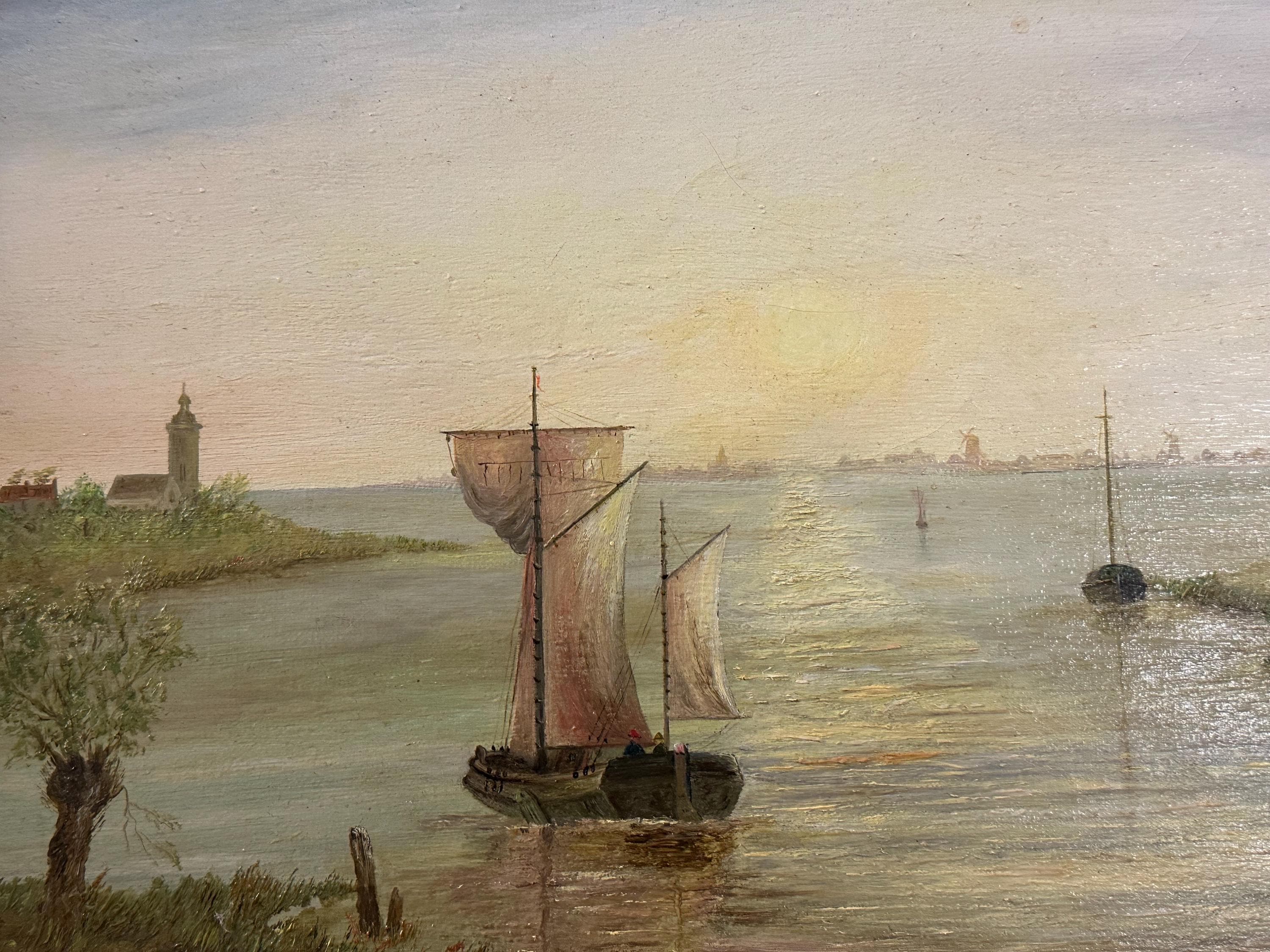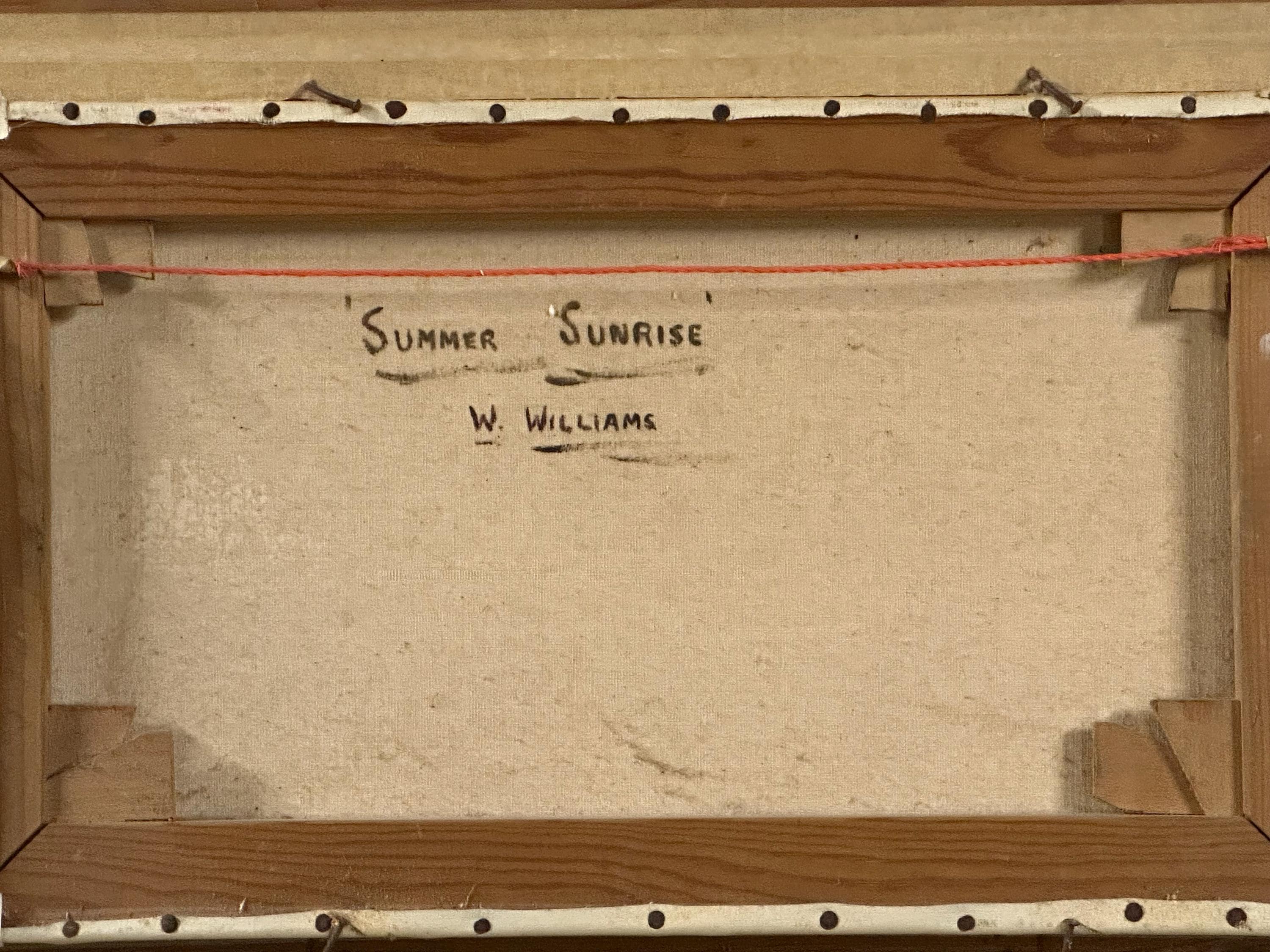 A charming antique oil painting on canvas, beautifully executed and signed W. Williams to the lower right. The scene depicts a tranquil river or estuary landscape with sailing boats, a windmill, and a towered building on the shoreline, all bathed in soft, atmospheric light. Titled Summer Sunrise, the composition and palette are strongly evocative of 19th-century Dutch or Continental river landscapes, with fine attention to reflection, sky, and perspective.