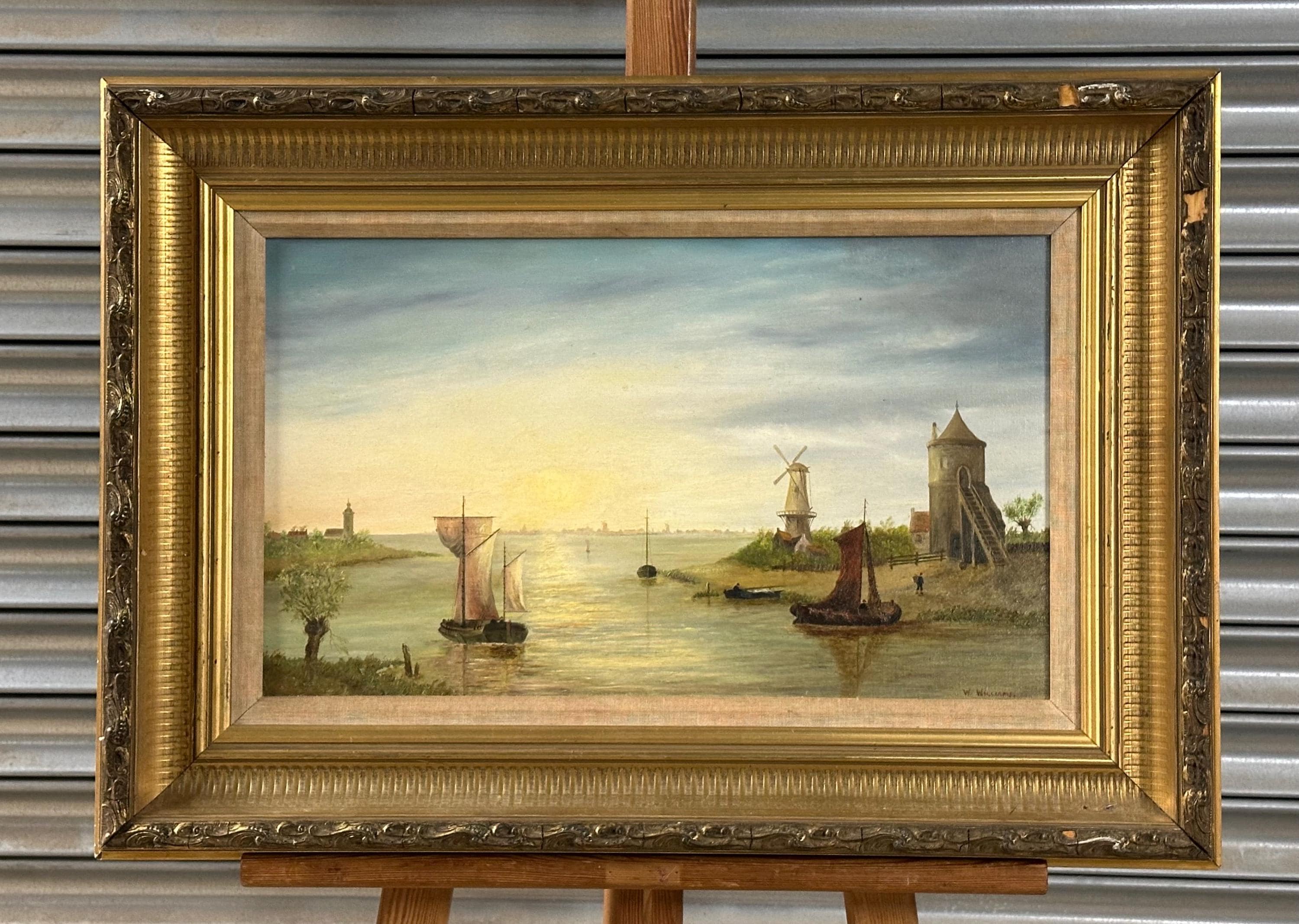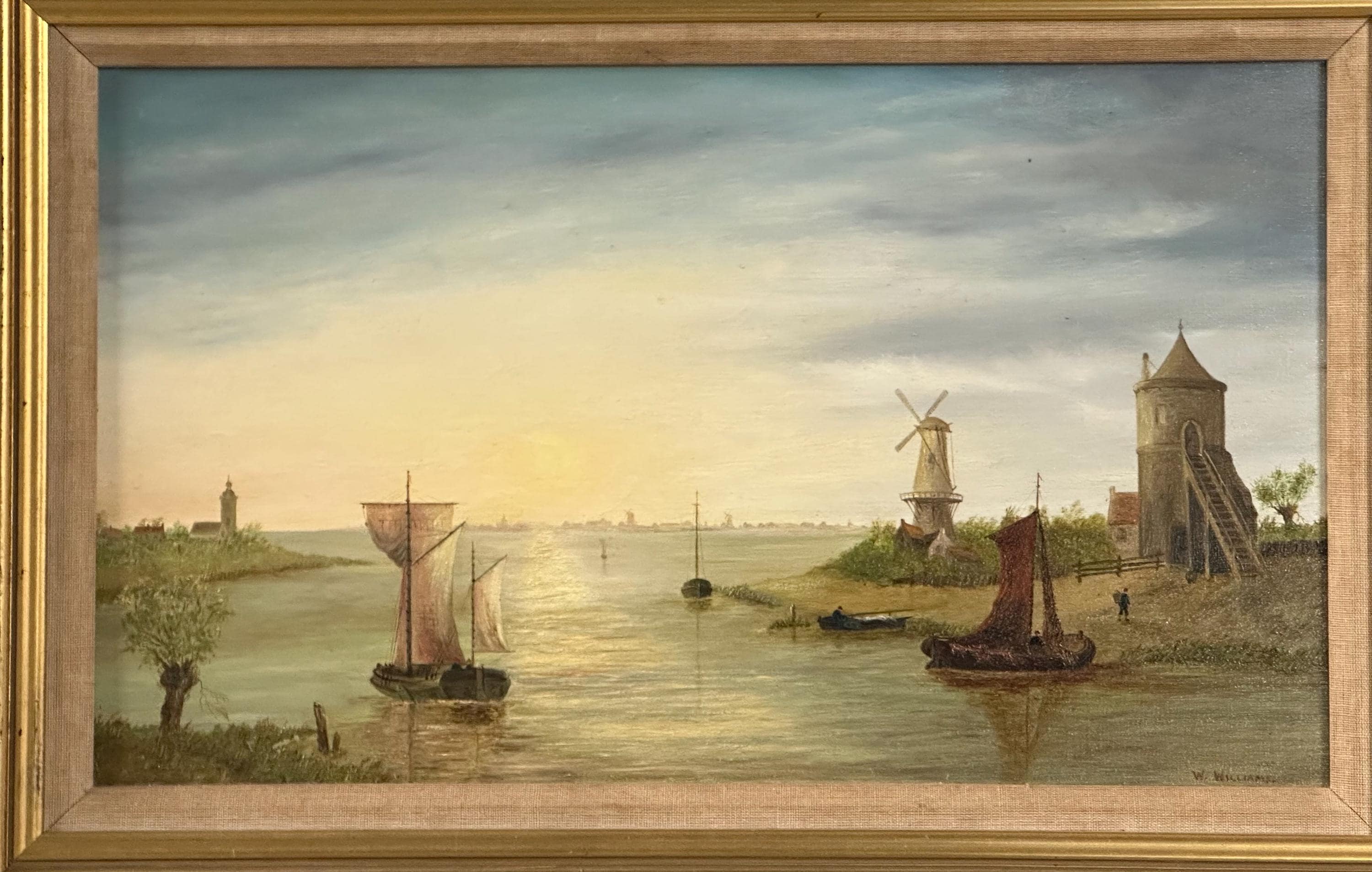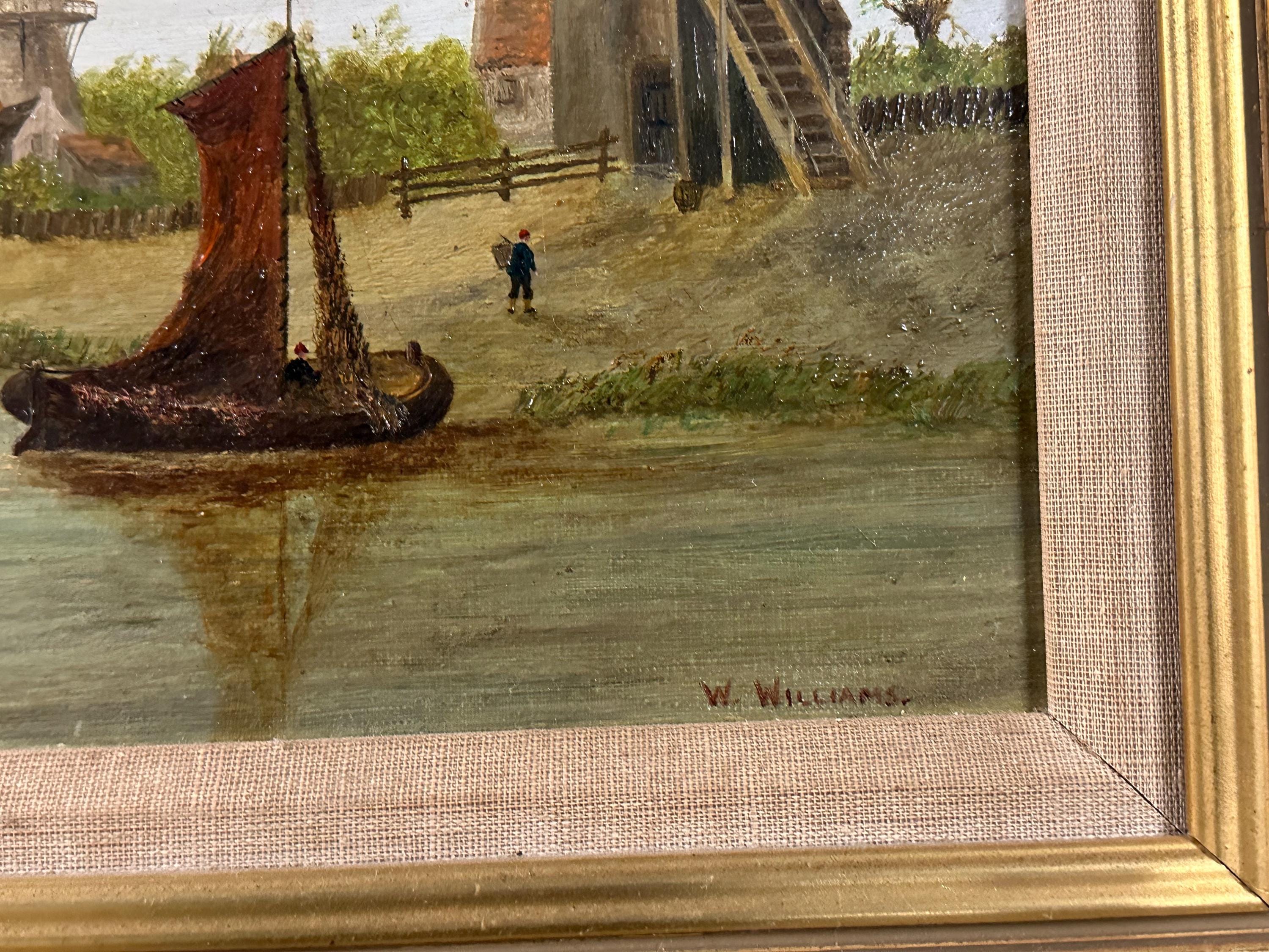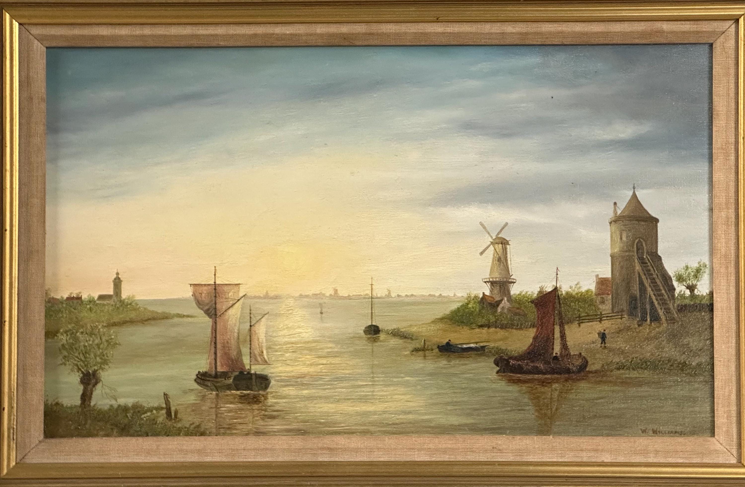 Antique Oil Painting on Canvas – Signed W. Williams – River & Windmill Landscape