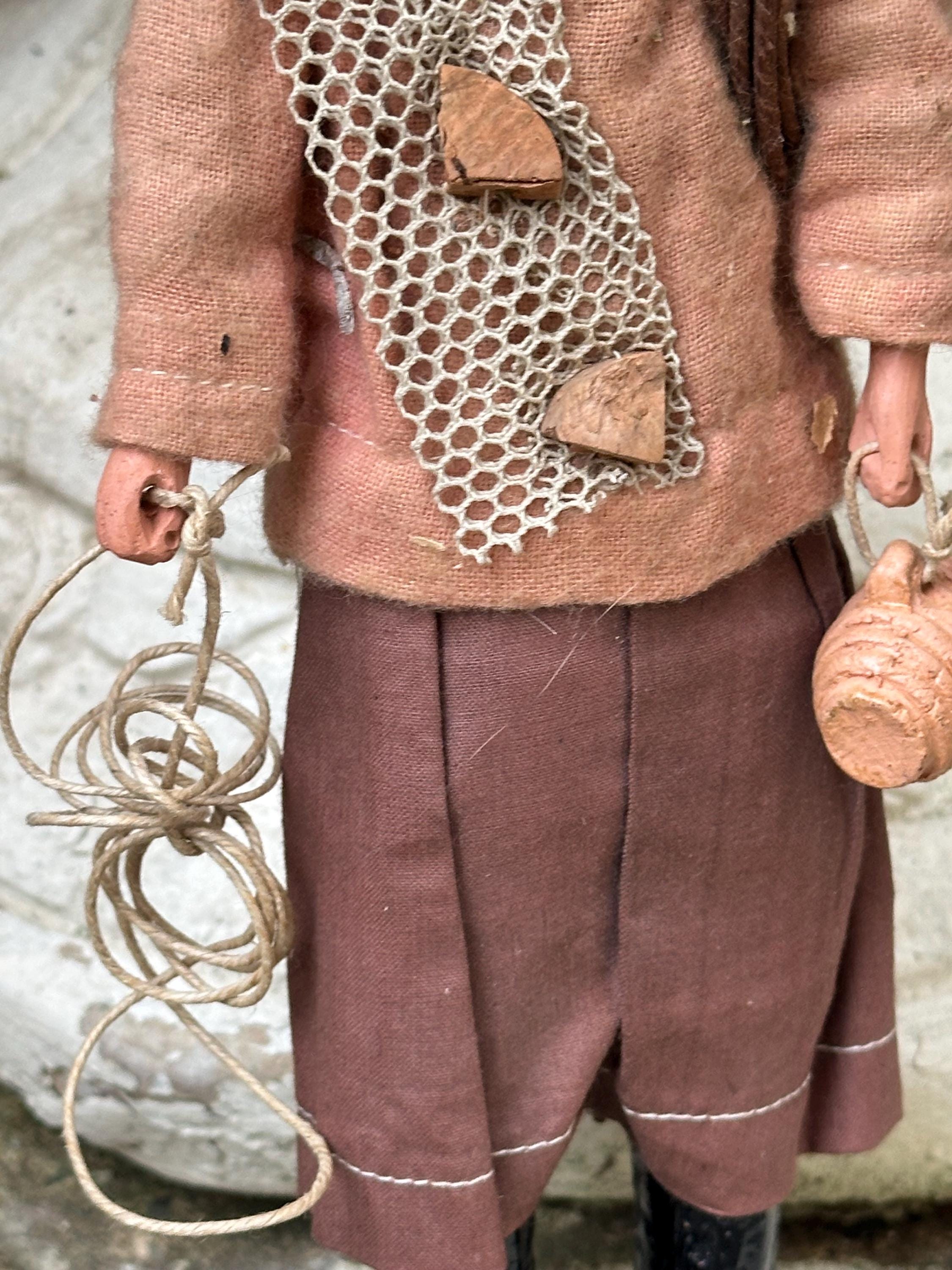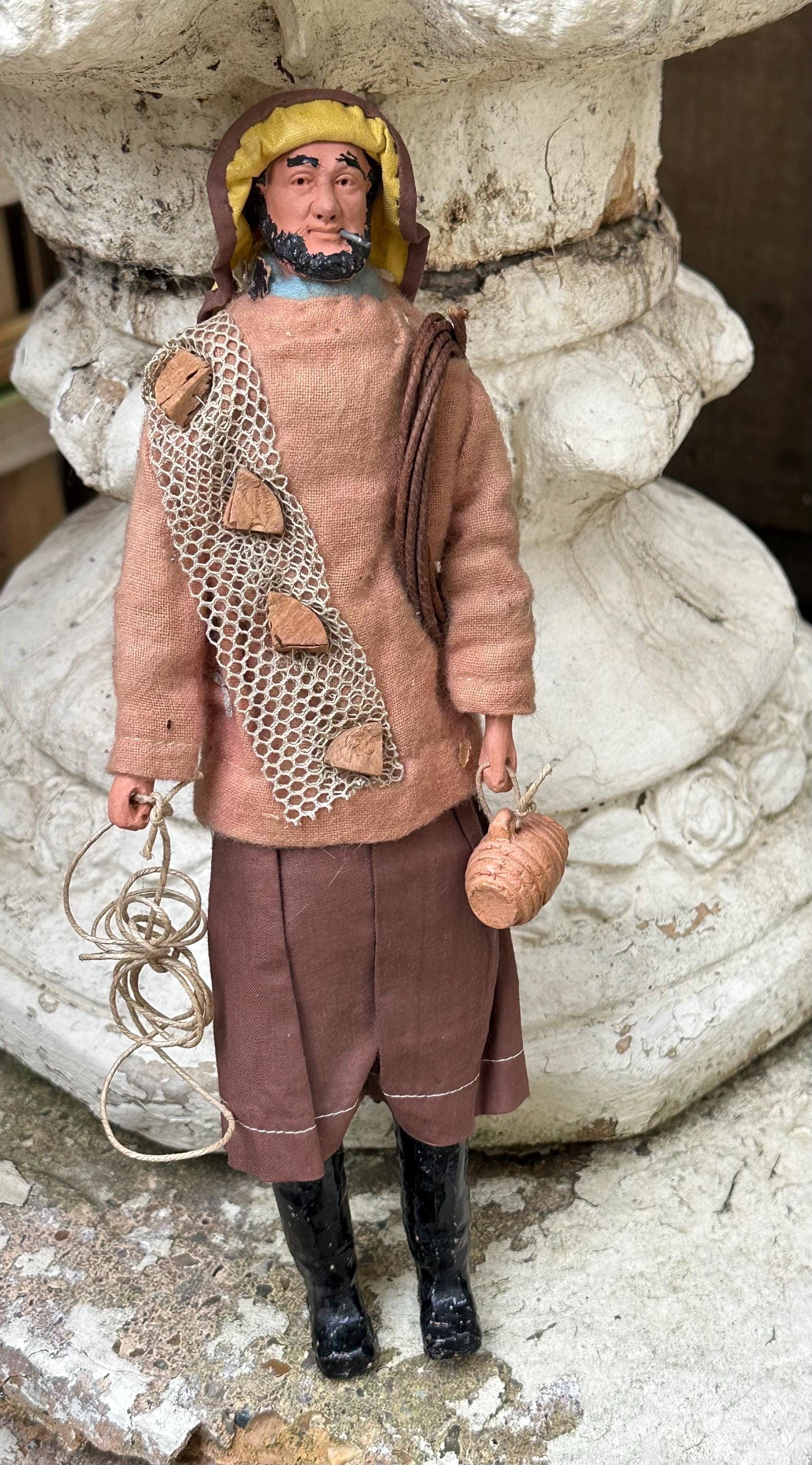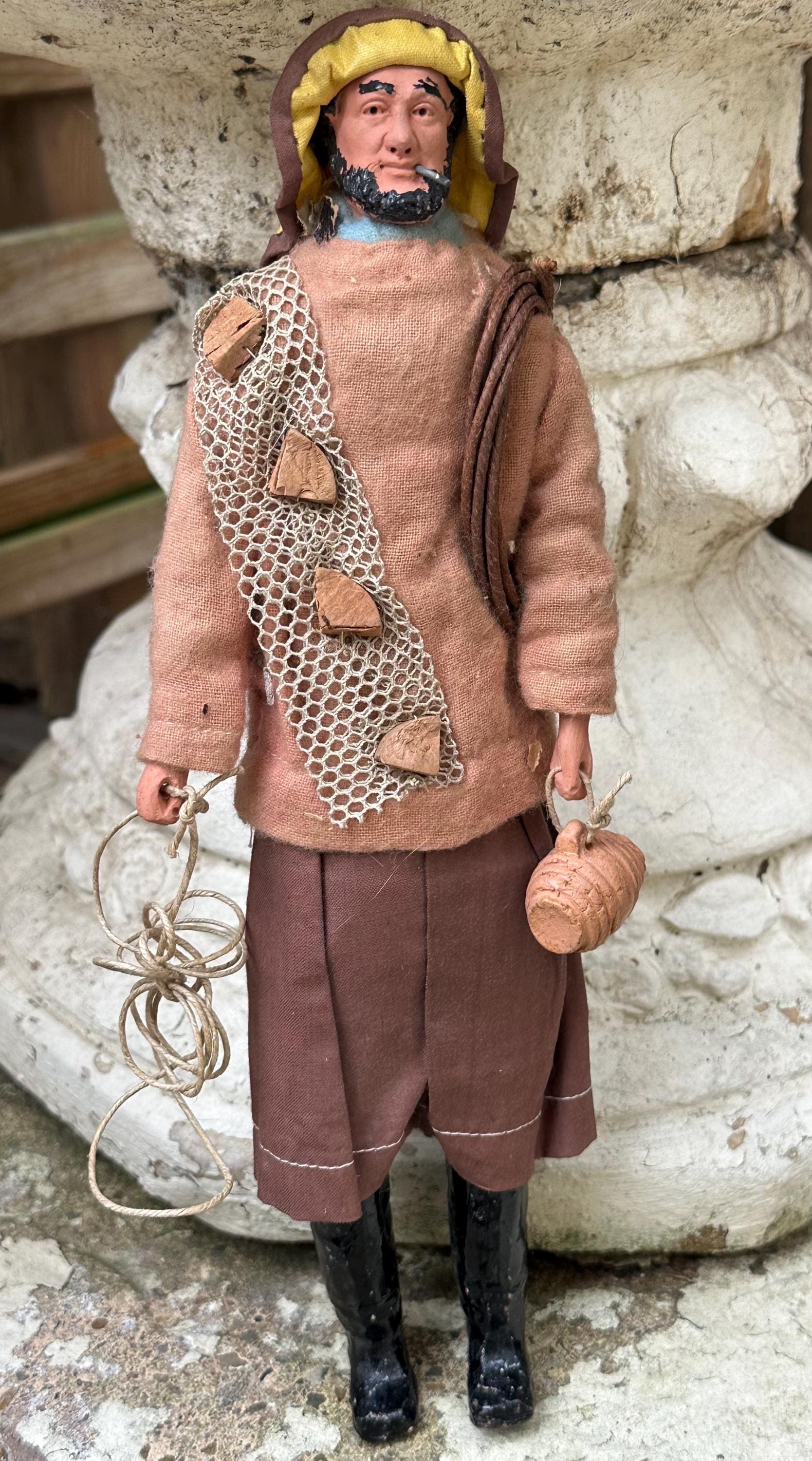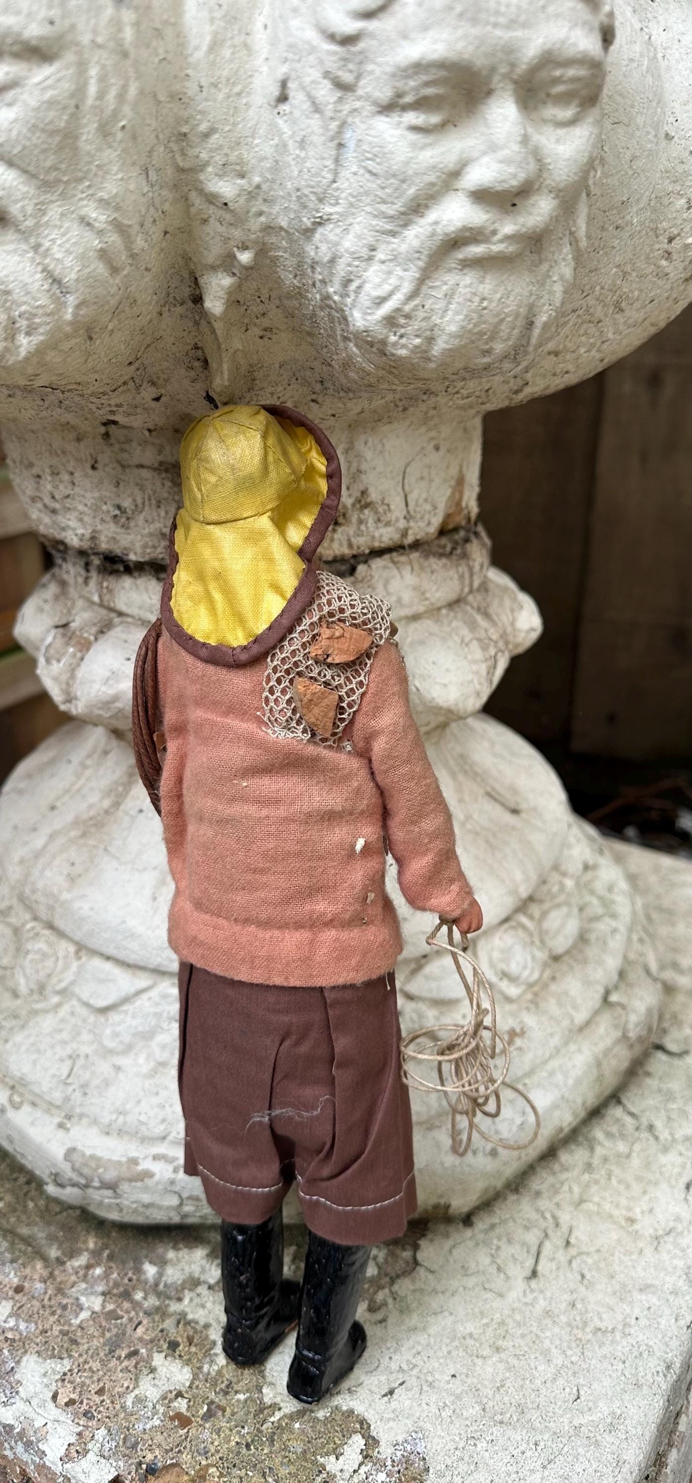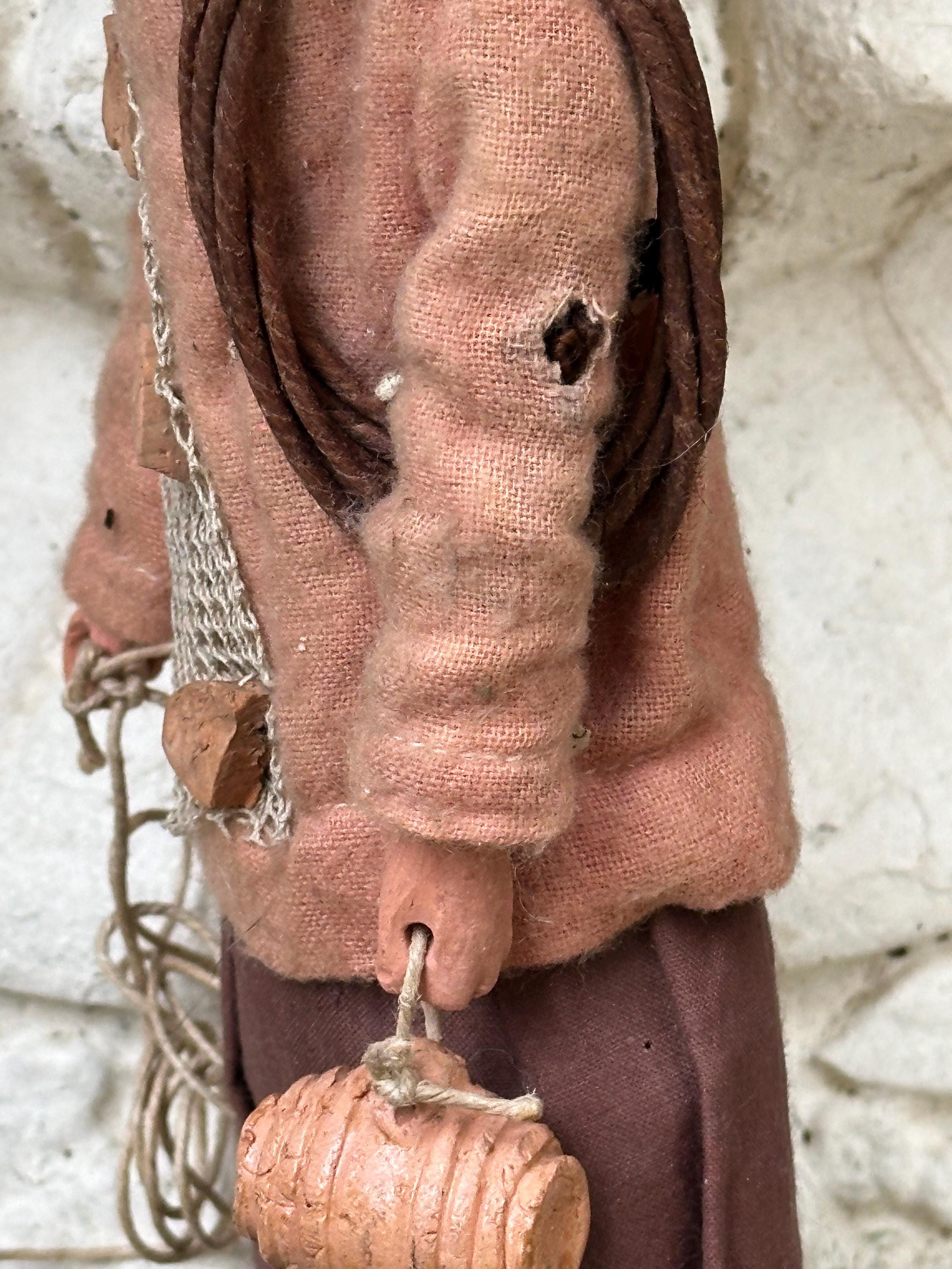 A wonderfully characterful handmade folk art fisherman figure, crafted from terracotta, wood, and mixed natural materials, and dressed in period-style fabric clothing. This charming figure captures a rustic, naïve folk art aesthetic, with expressive hand-painted facial features and beautifully textured details.
