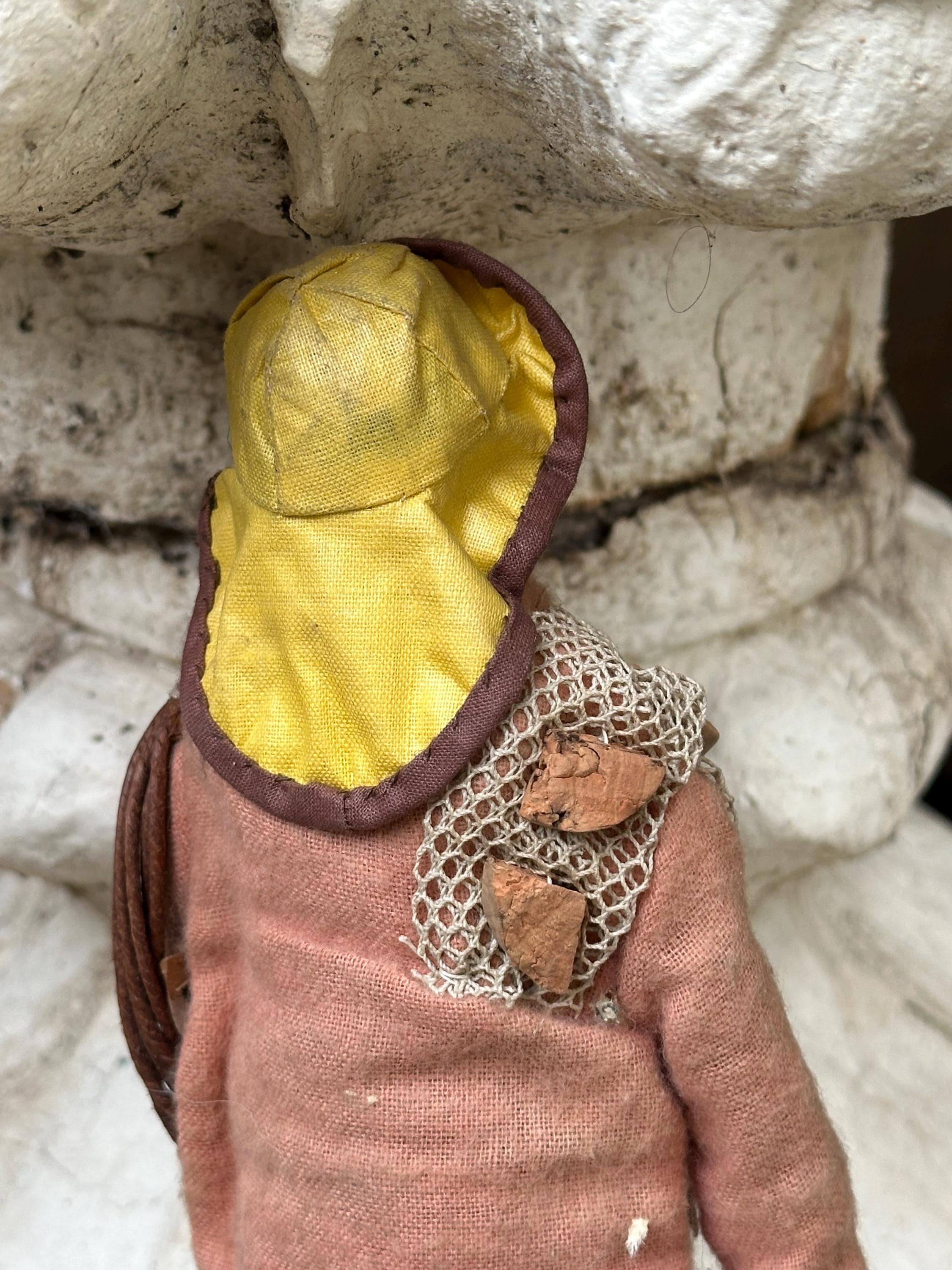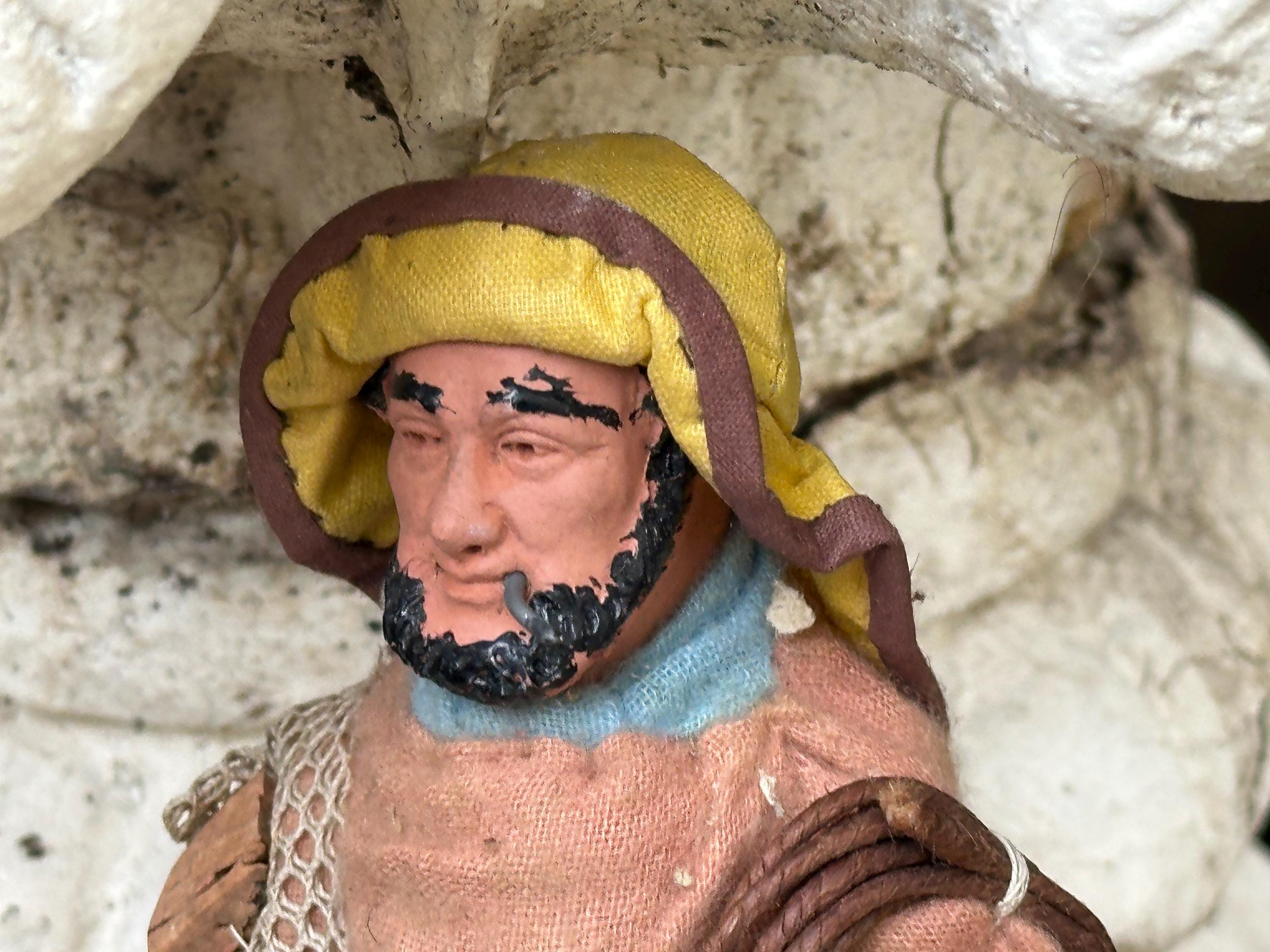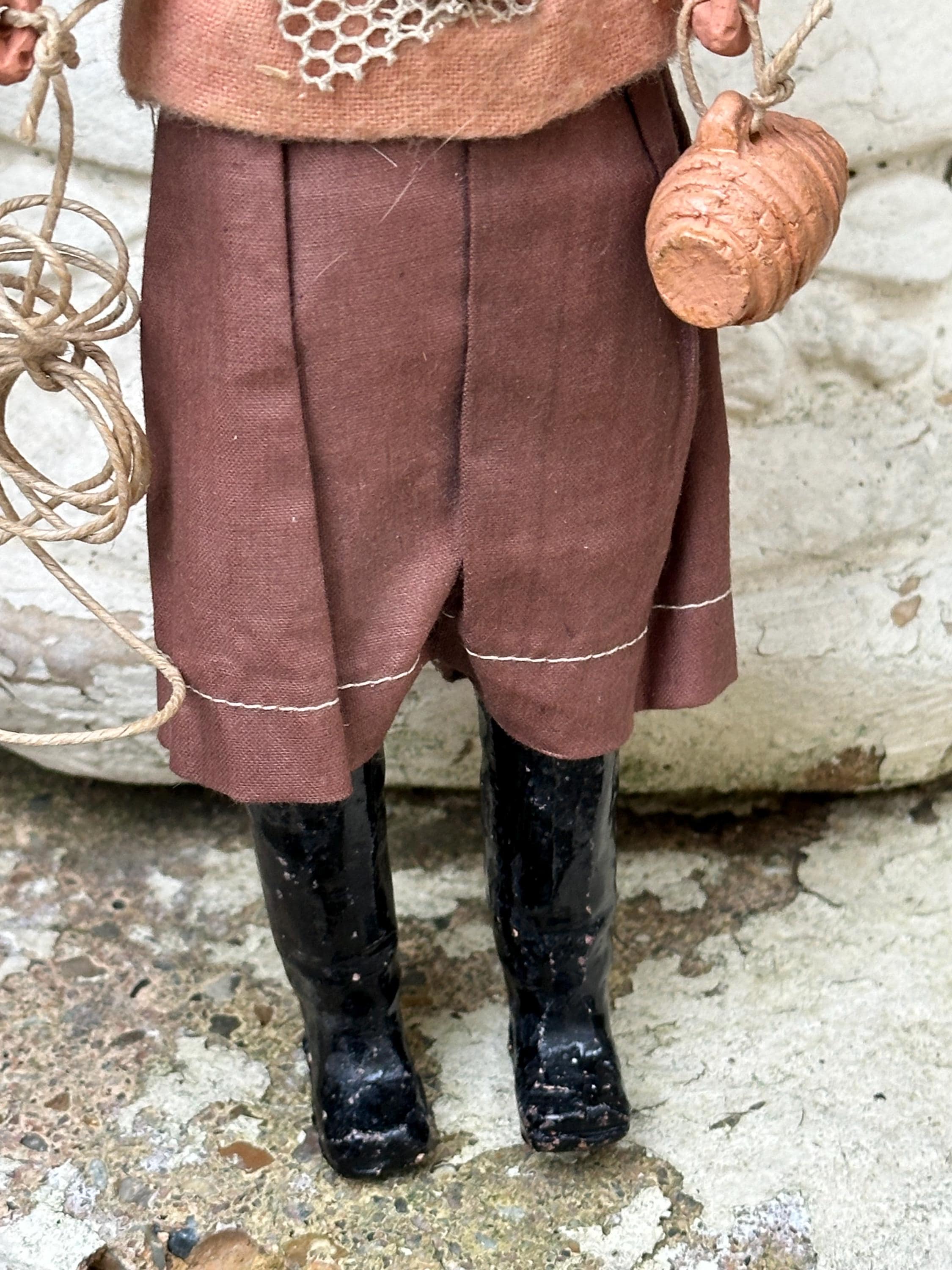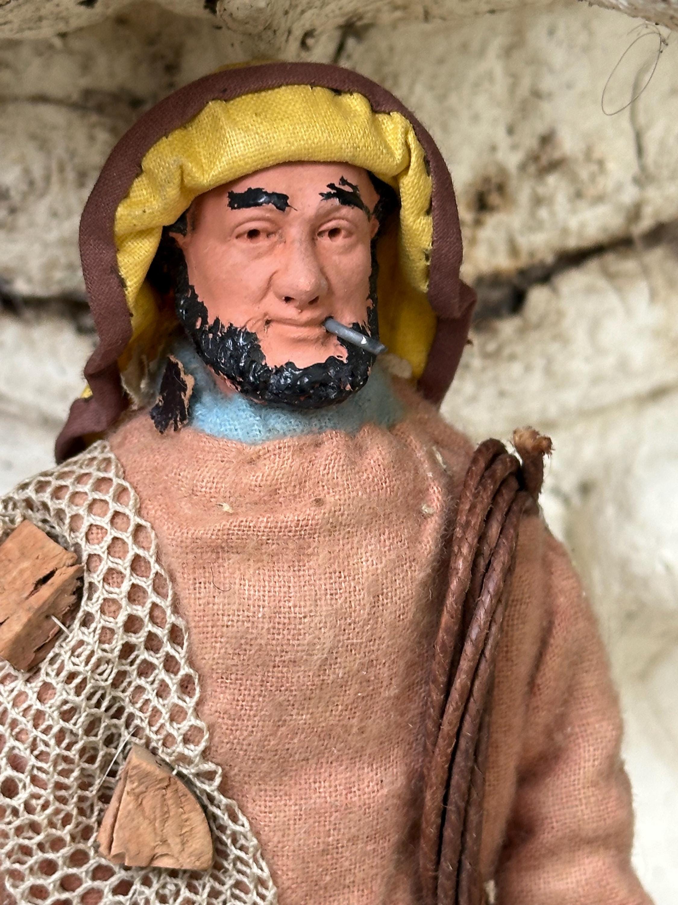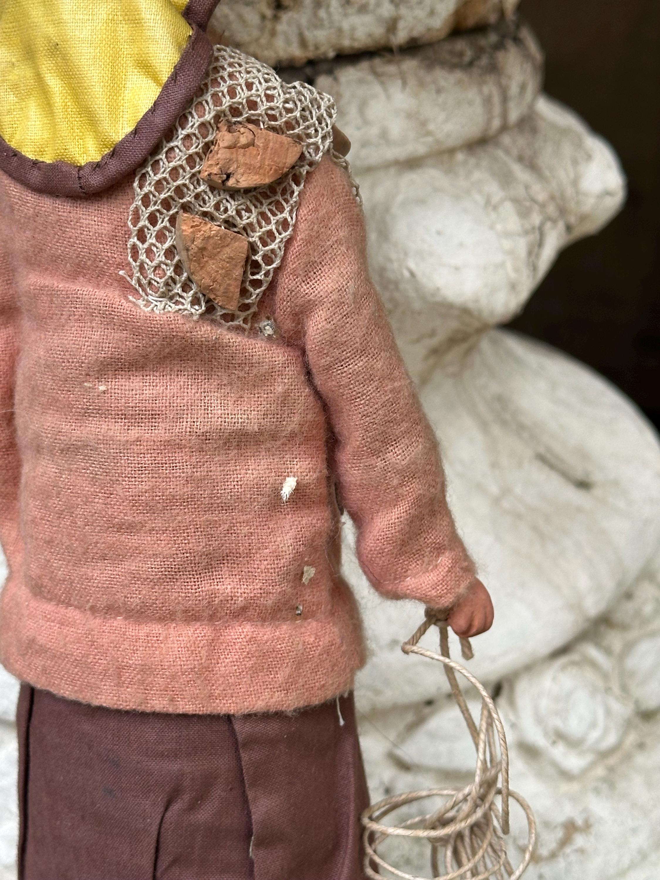 A wonderfully characterful handmade folk art fisherman figure, crafted from terracotta, wood, and mixed natural materials, and dressed in period-style fabric clothing. This charming figure captures a rustic, naïve folk art aesthetic, with expressive hand-painted facial features and beautifully textured details.