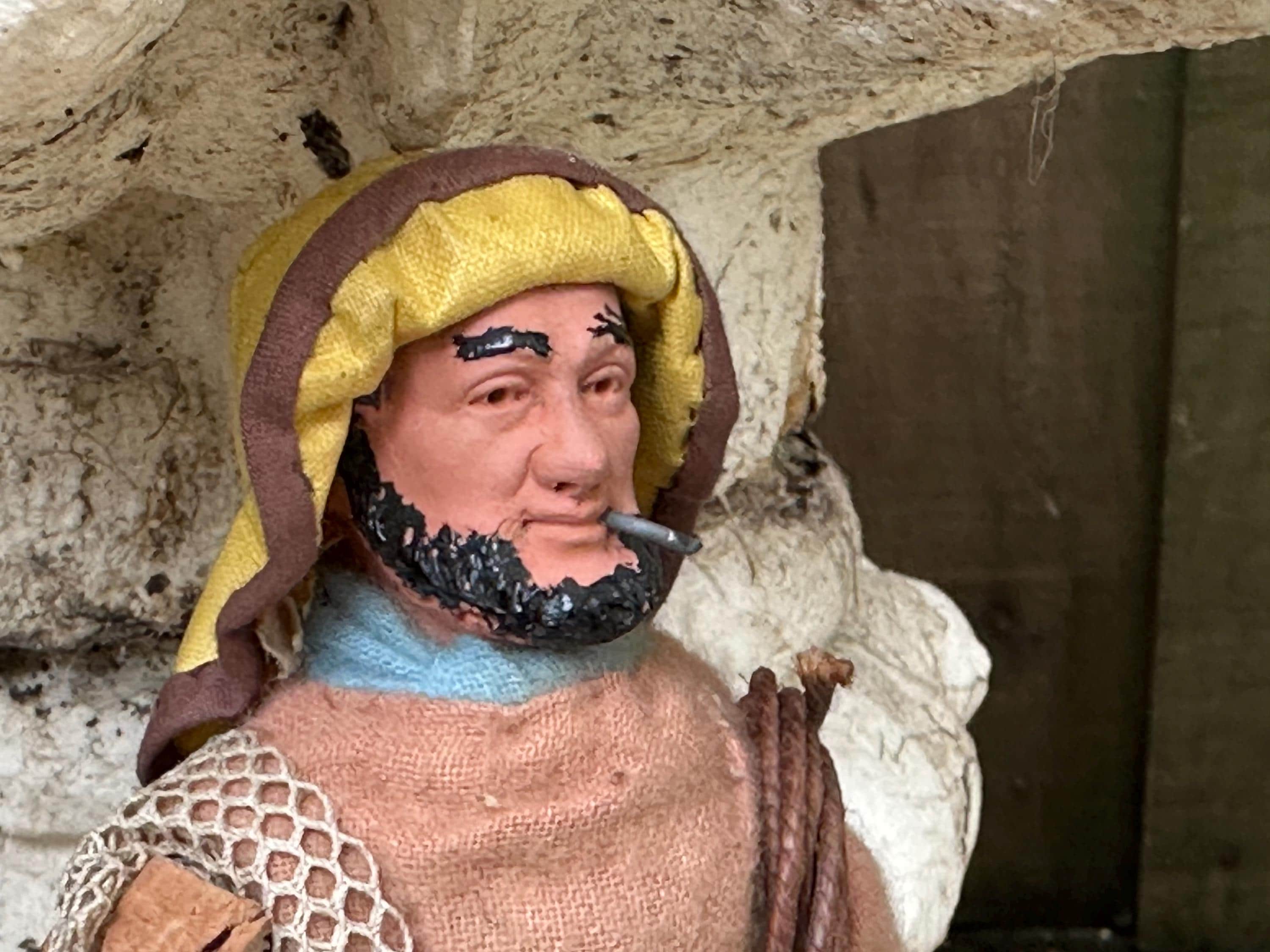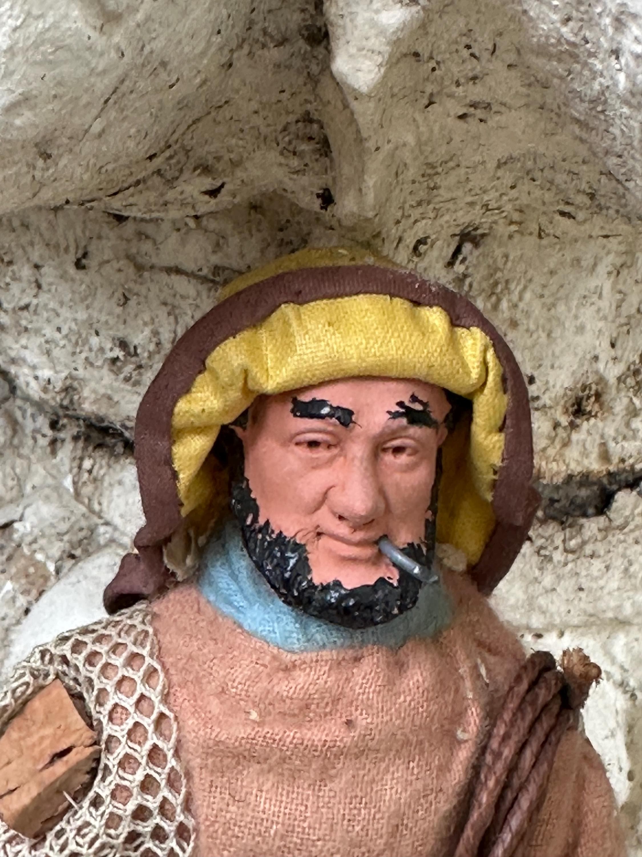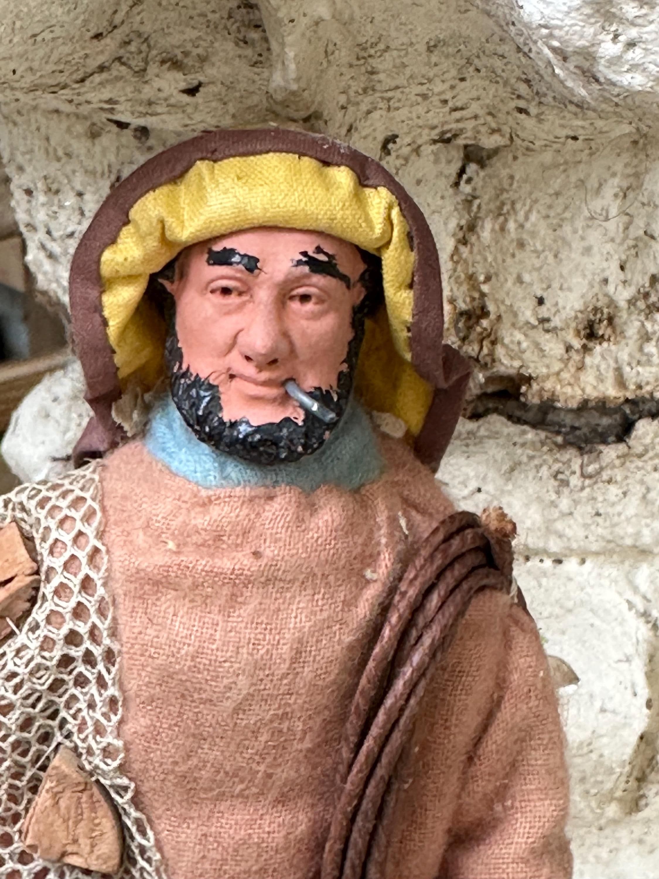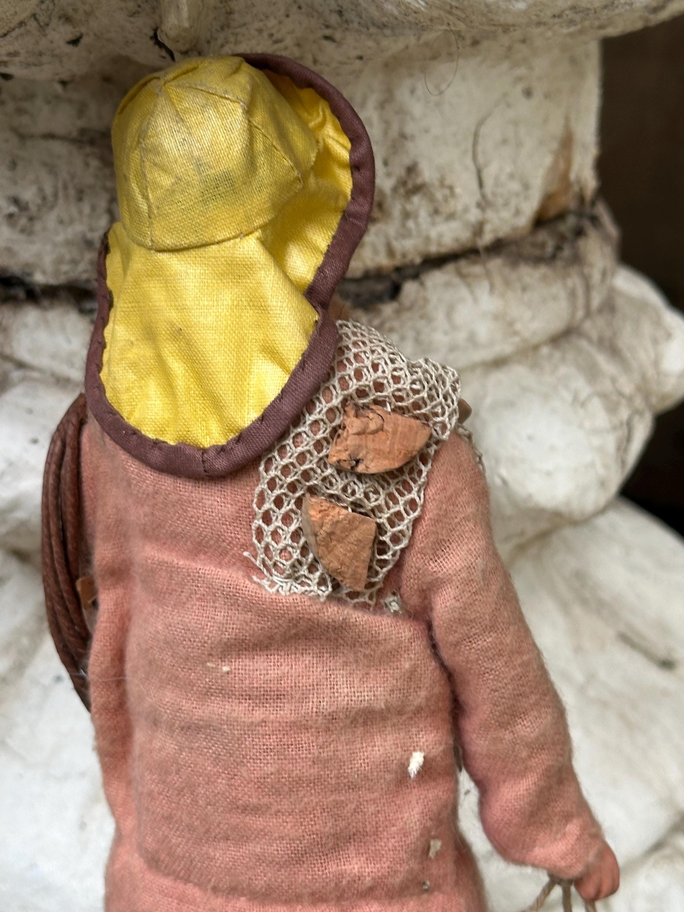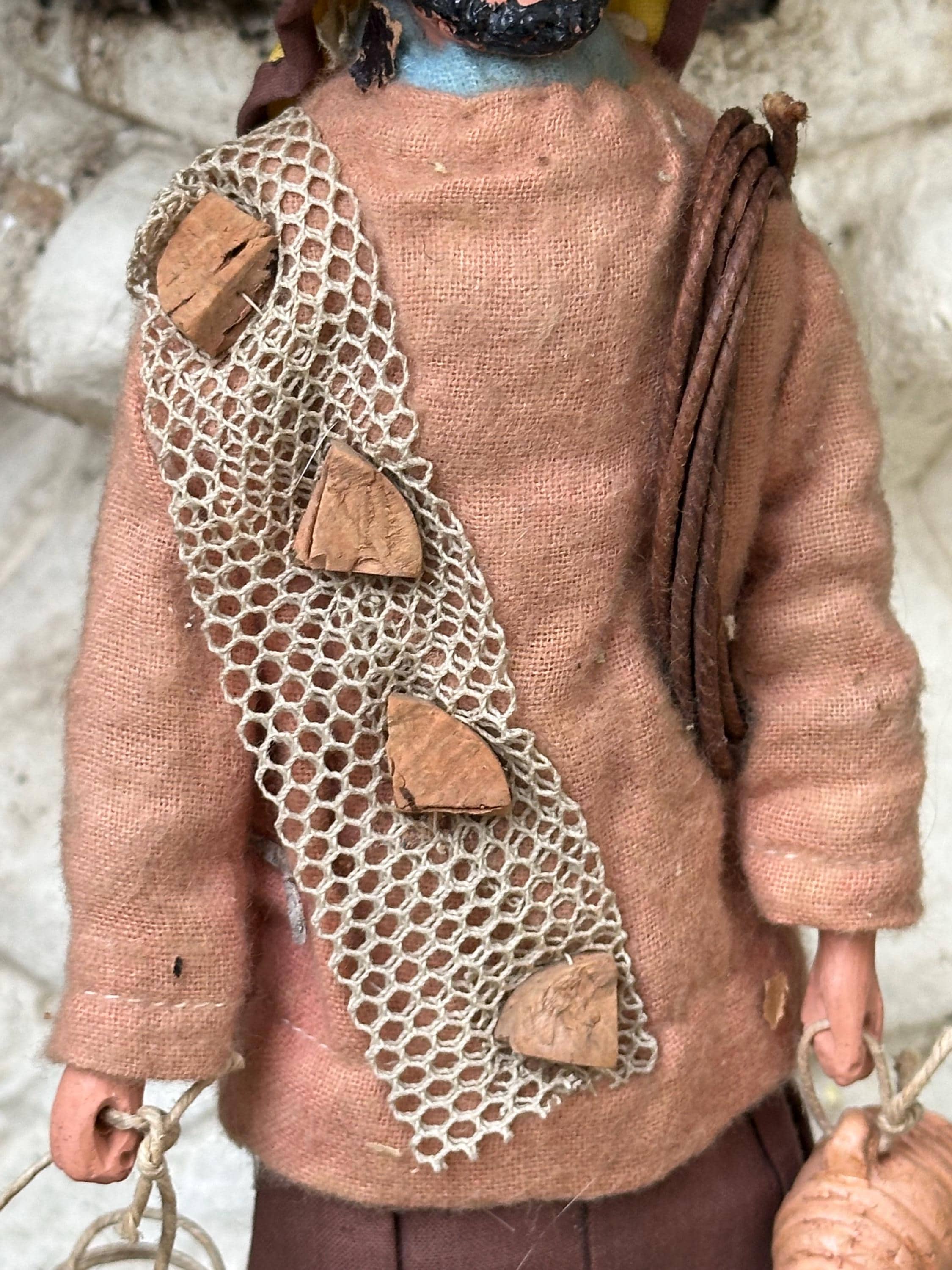 A wonderfully characterful handmade folk art fisherman figure, crafted from terracotta, wood, and mixed natural materials, and dressed in period-style fabric clothing. This charming figure captures a rustic, naïve folk art aesthetic, with expressive hand-painted facial features and beautifully textured details.