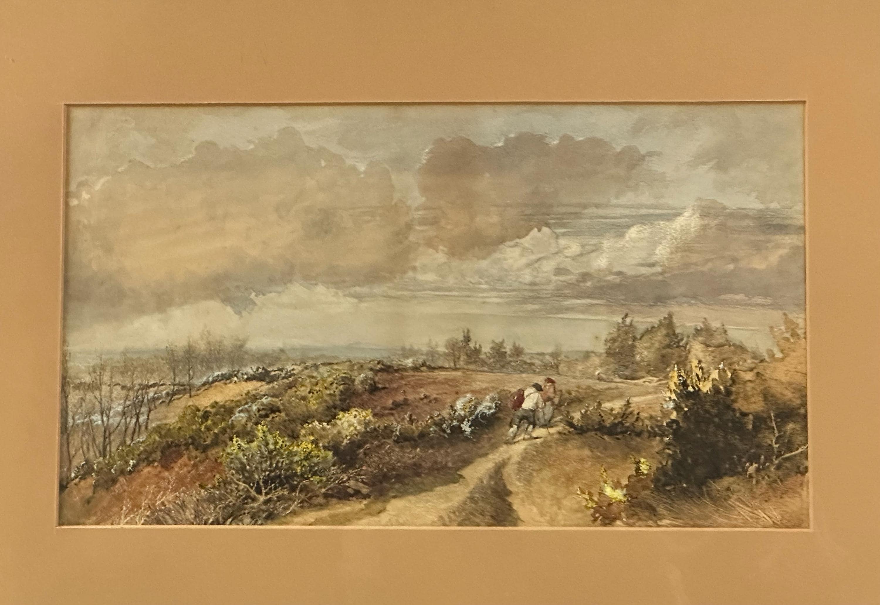 A beautifully executed original watercolour by Robert Thorne Waite, depicting a tranquil rural landscape with a winding country path leading through gently rolling countryside. The scene is animated by subtle human figures walking along the track, adding scale and narrative interest, while soft clouds drift across a delicately washed sky.