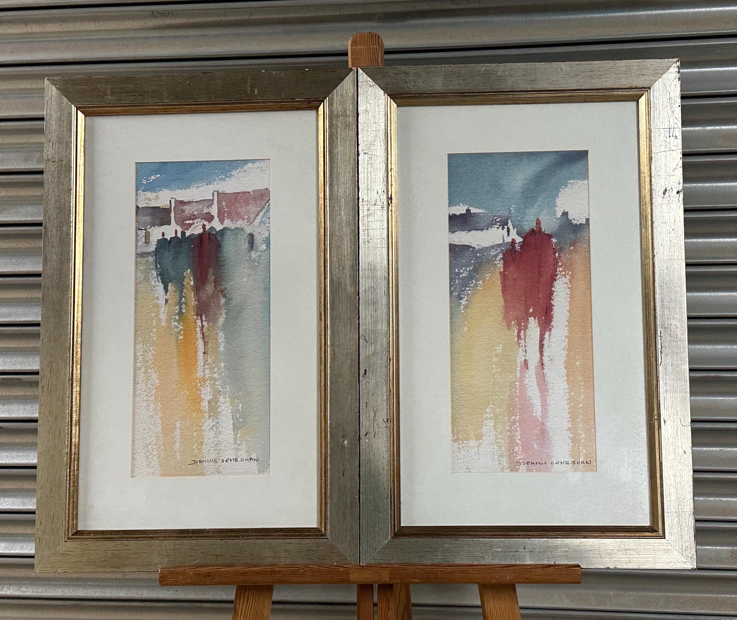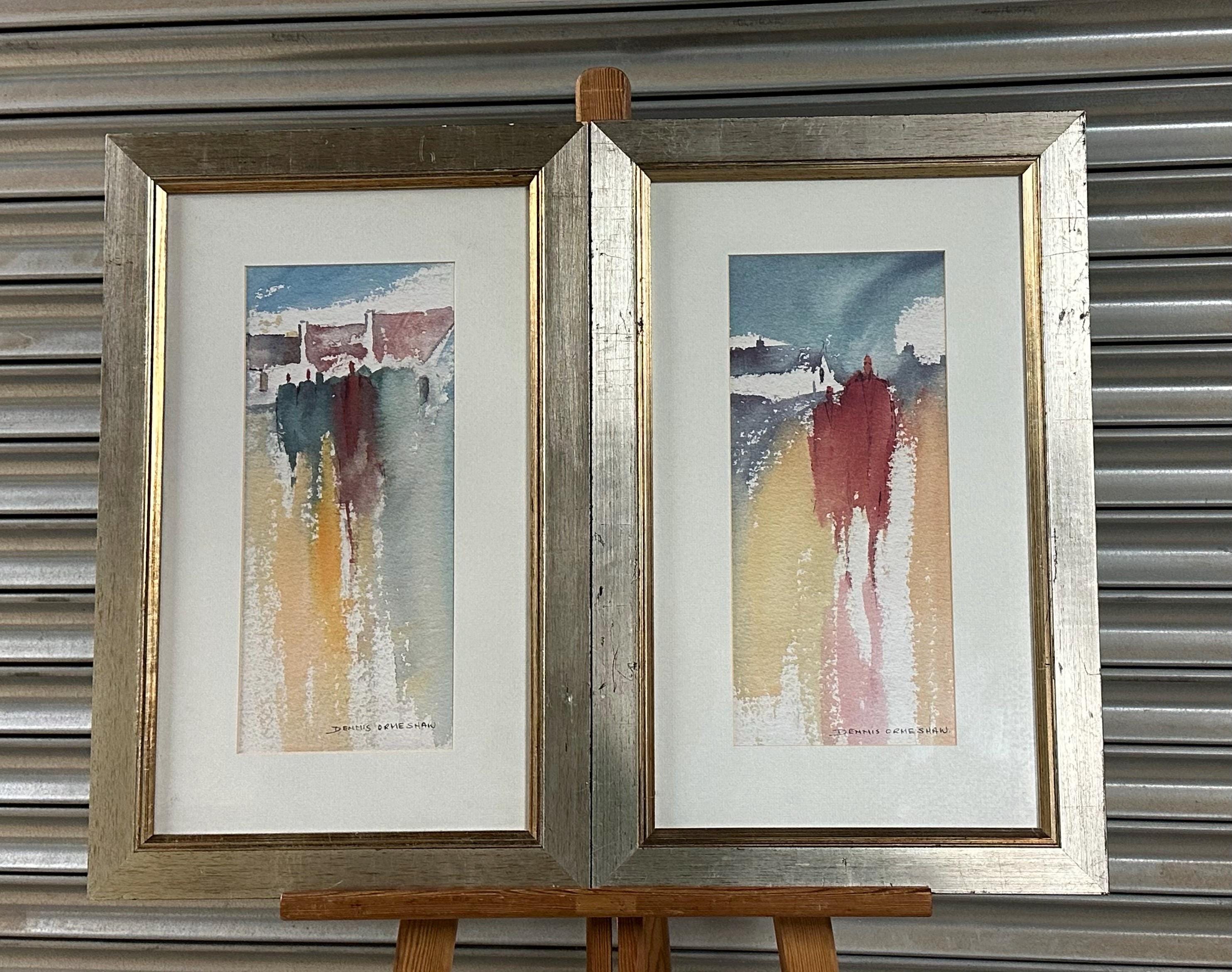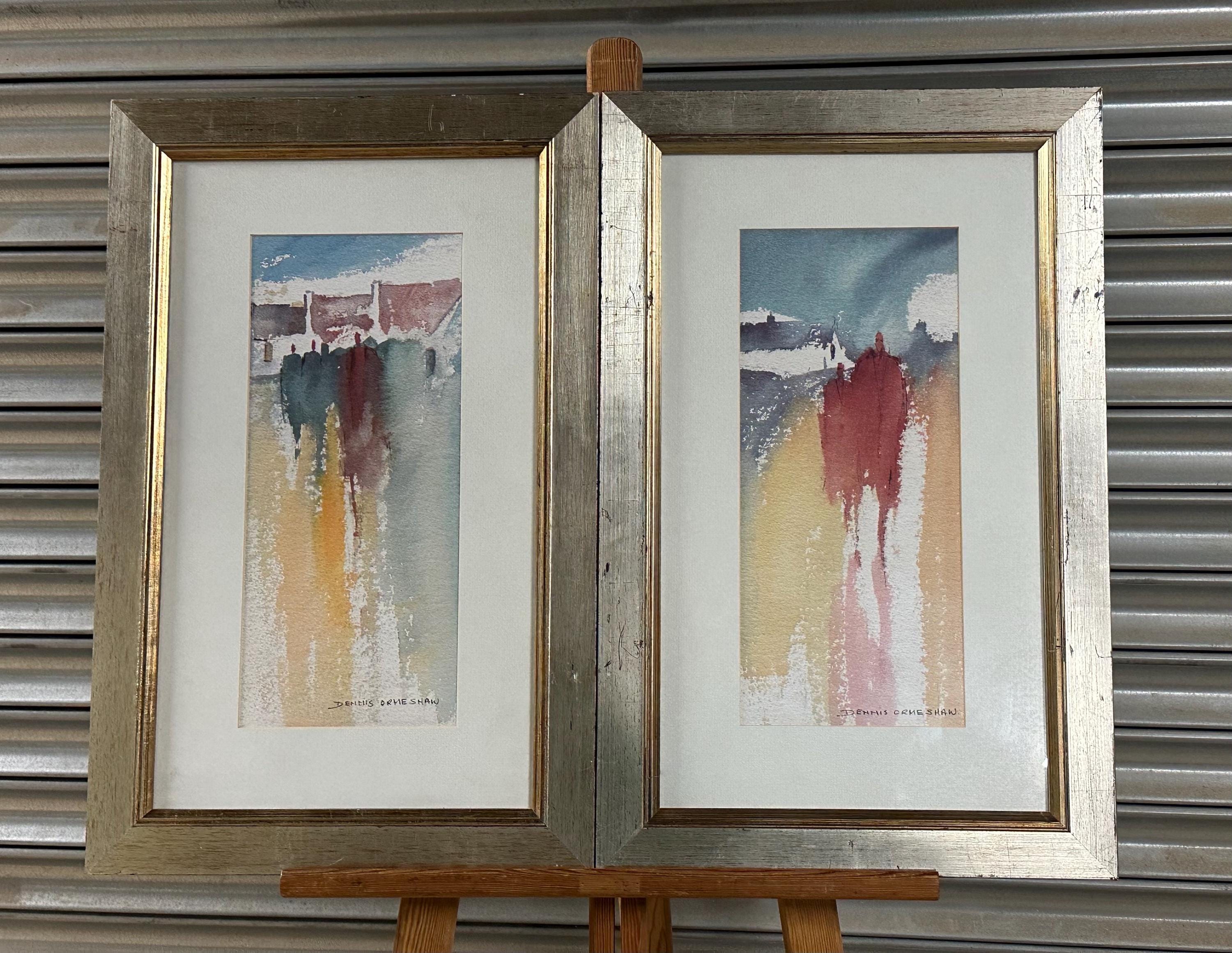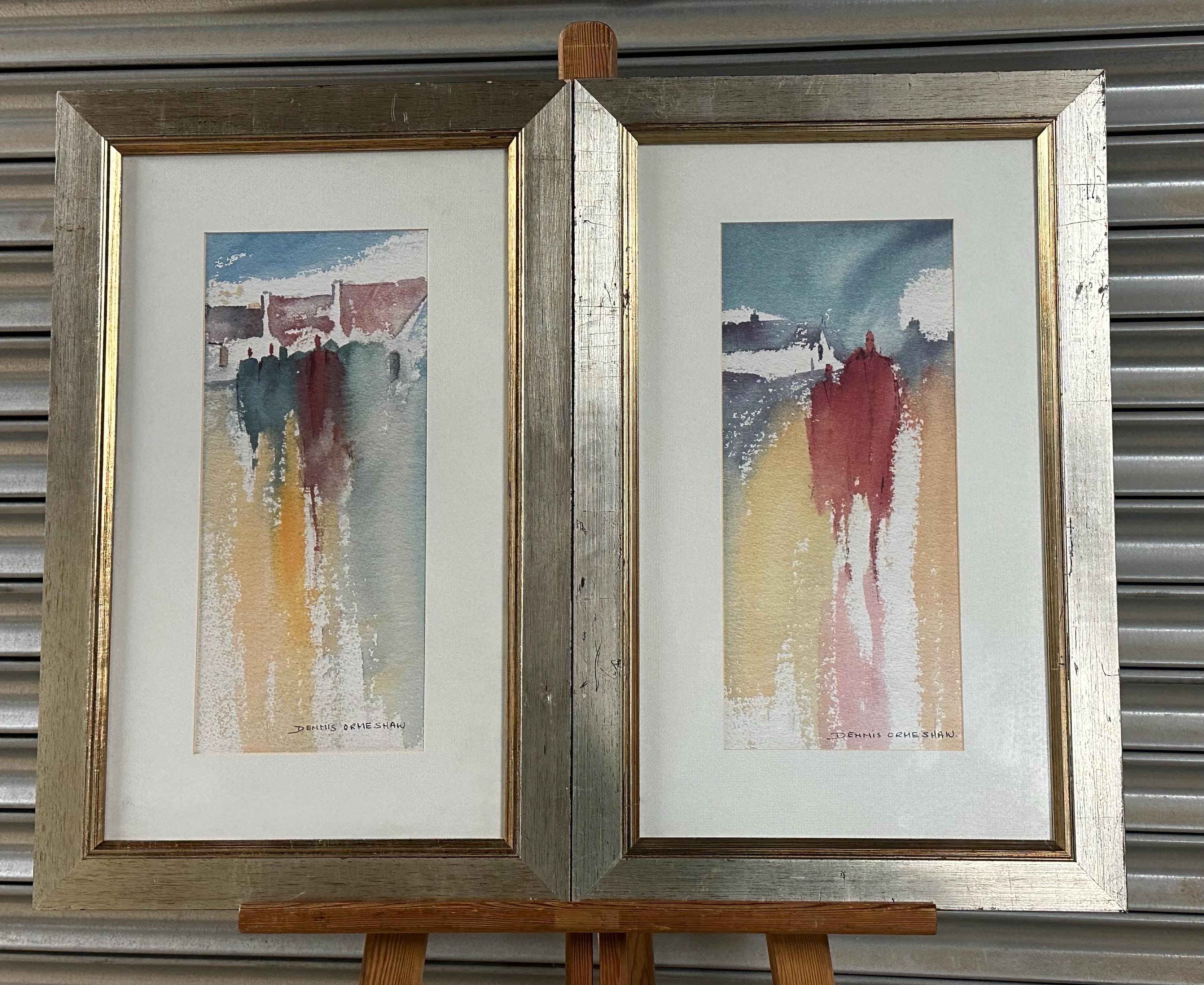 A striking pair of original signed prints by Dennis Orme-Shaw, presented as a complementary duo. These atmospheric works depict abstract coastal or shoreline scenes with elongated figures, using soft washes of colour and expressive vertical movement.