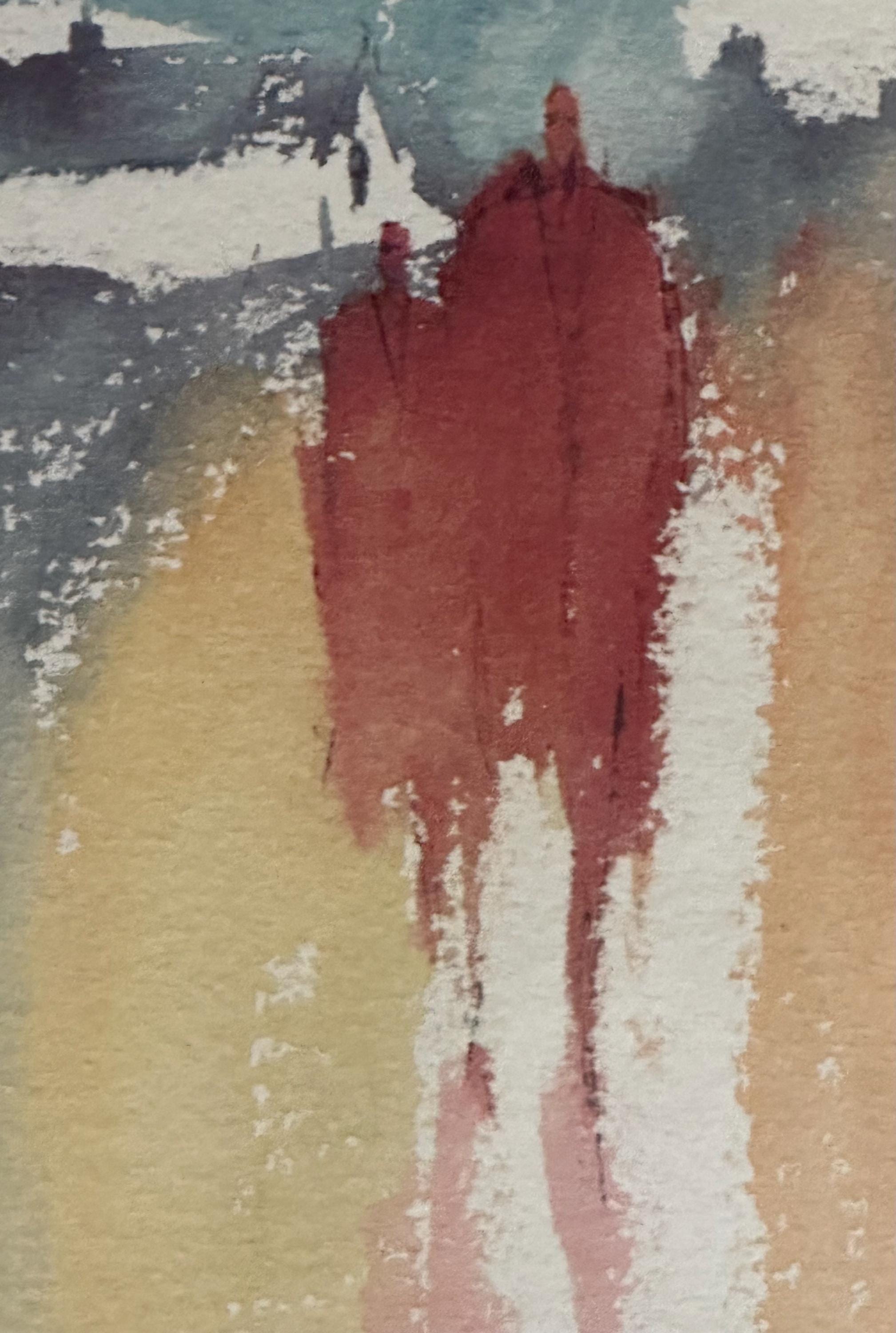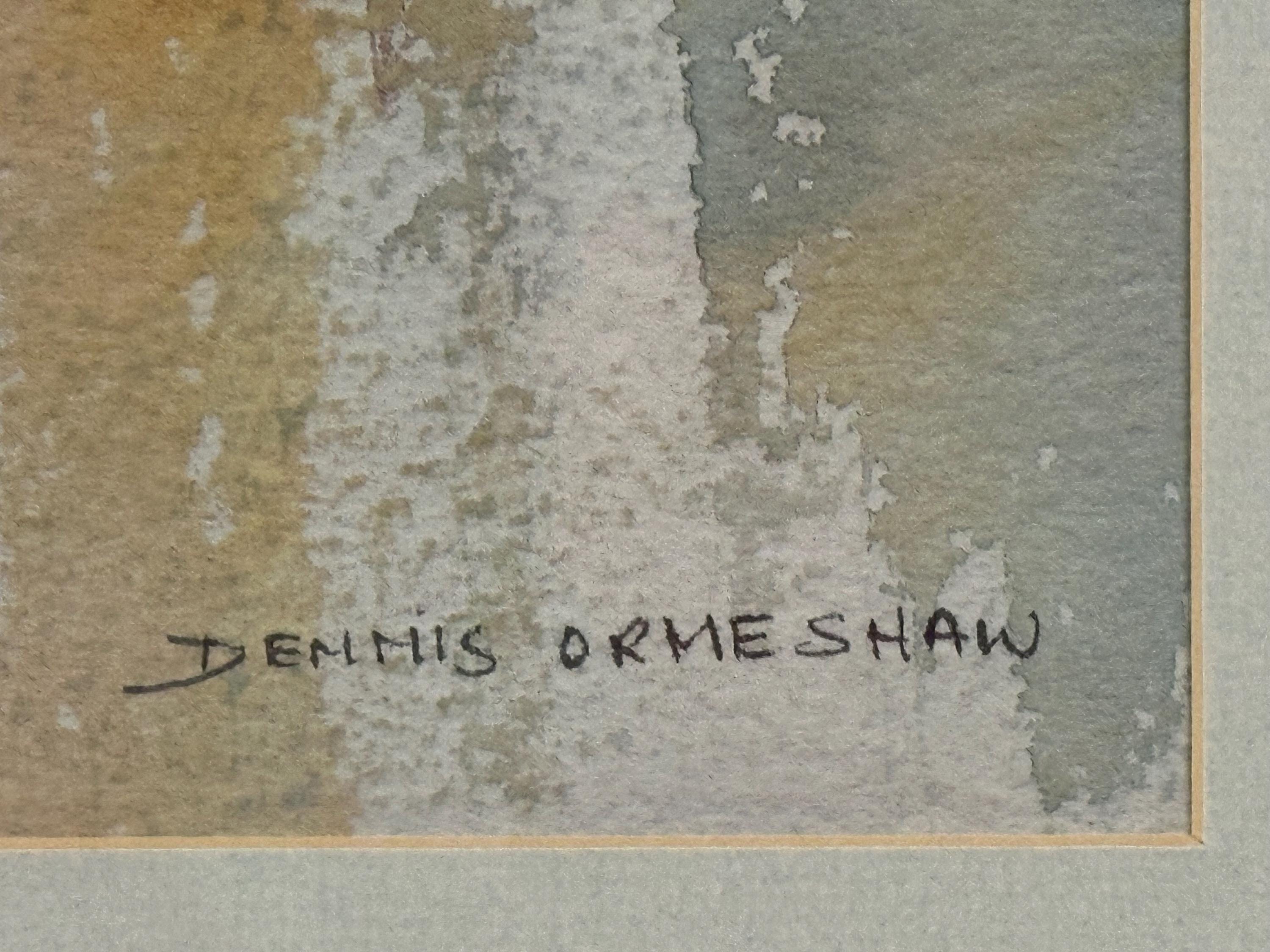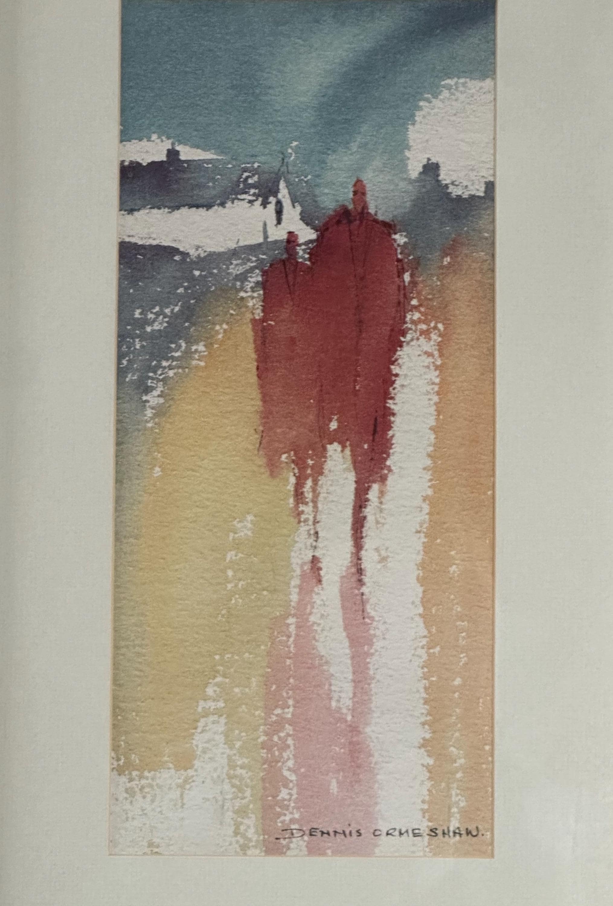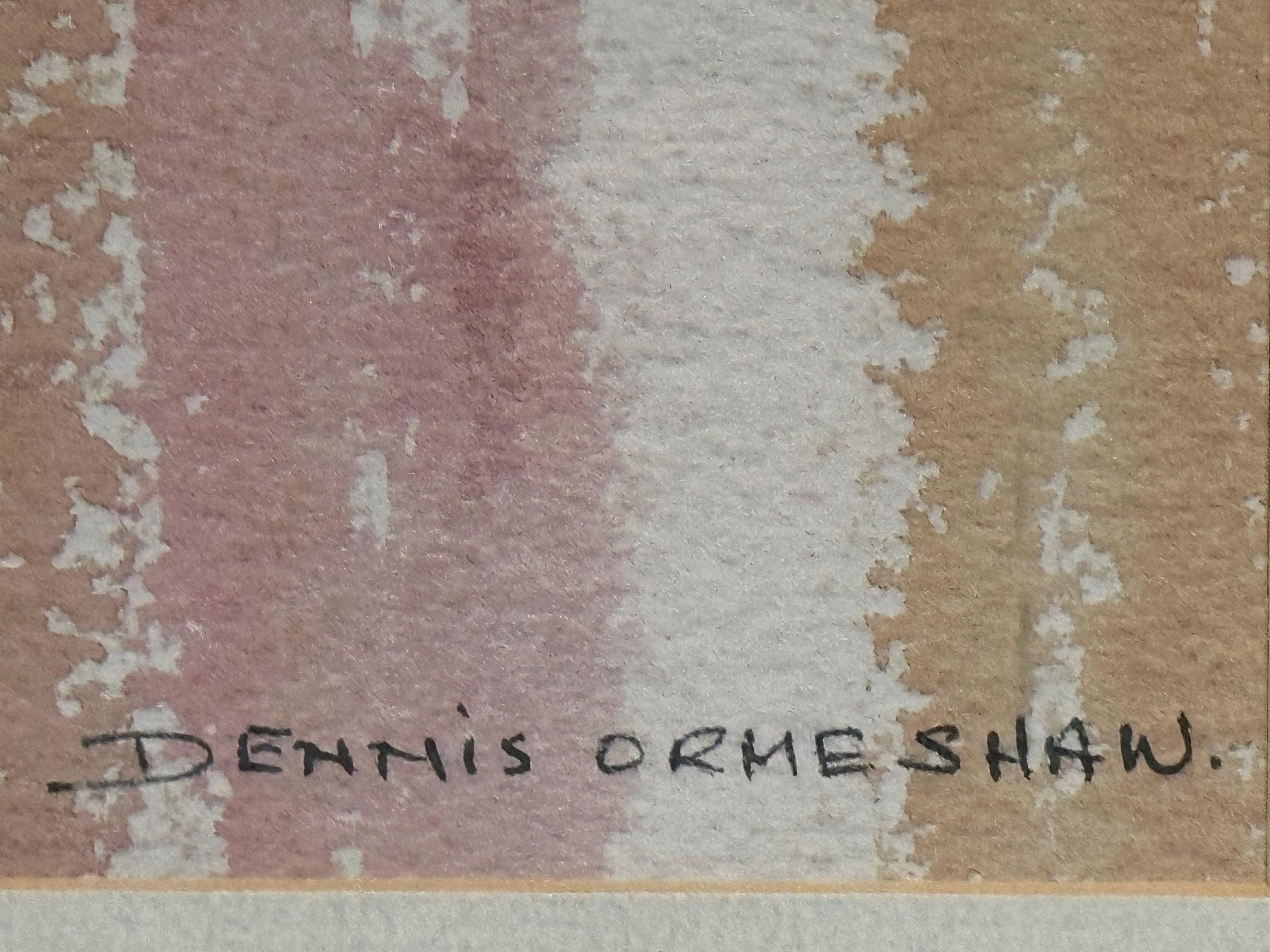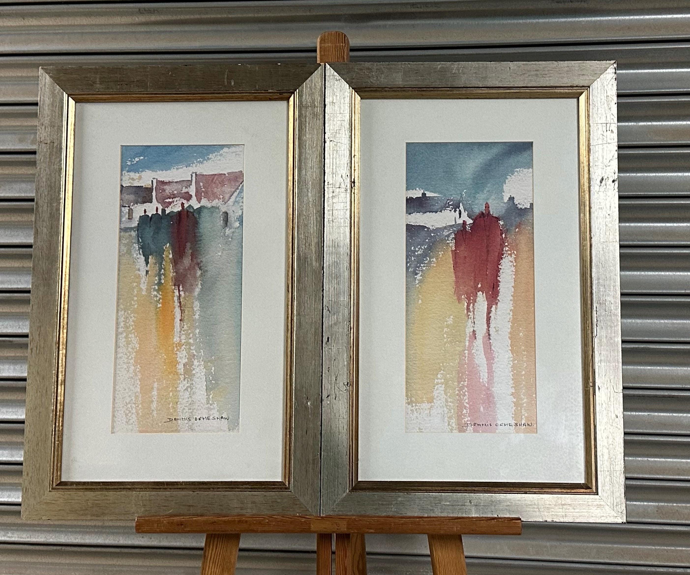 A striking pair of original signed prints by Dennis Orme-Shaw, presented as a complementary duo. These atmospheric works depict abstract coastal or shoreline scenes with elongated figures, using soft washes of colour and expressive vertical movement.