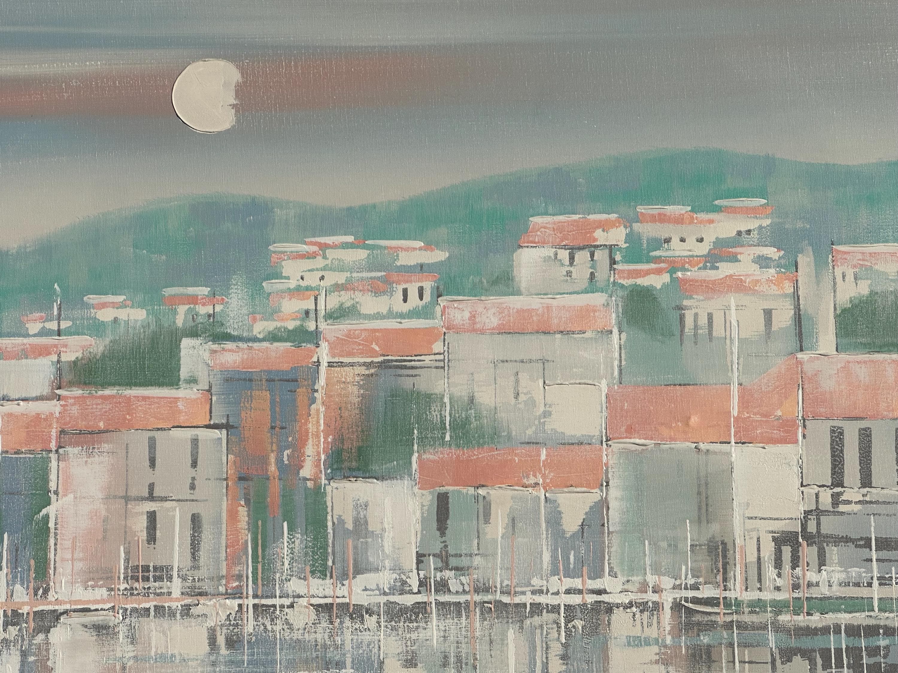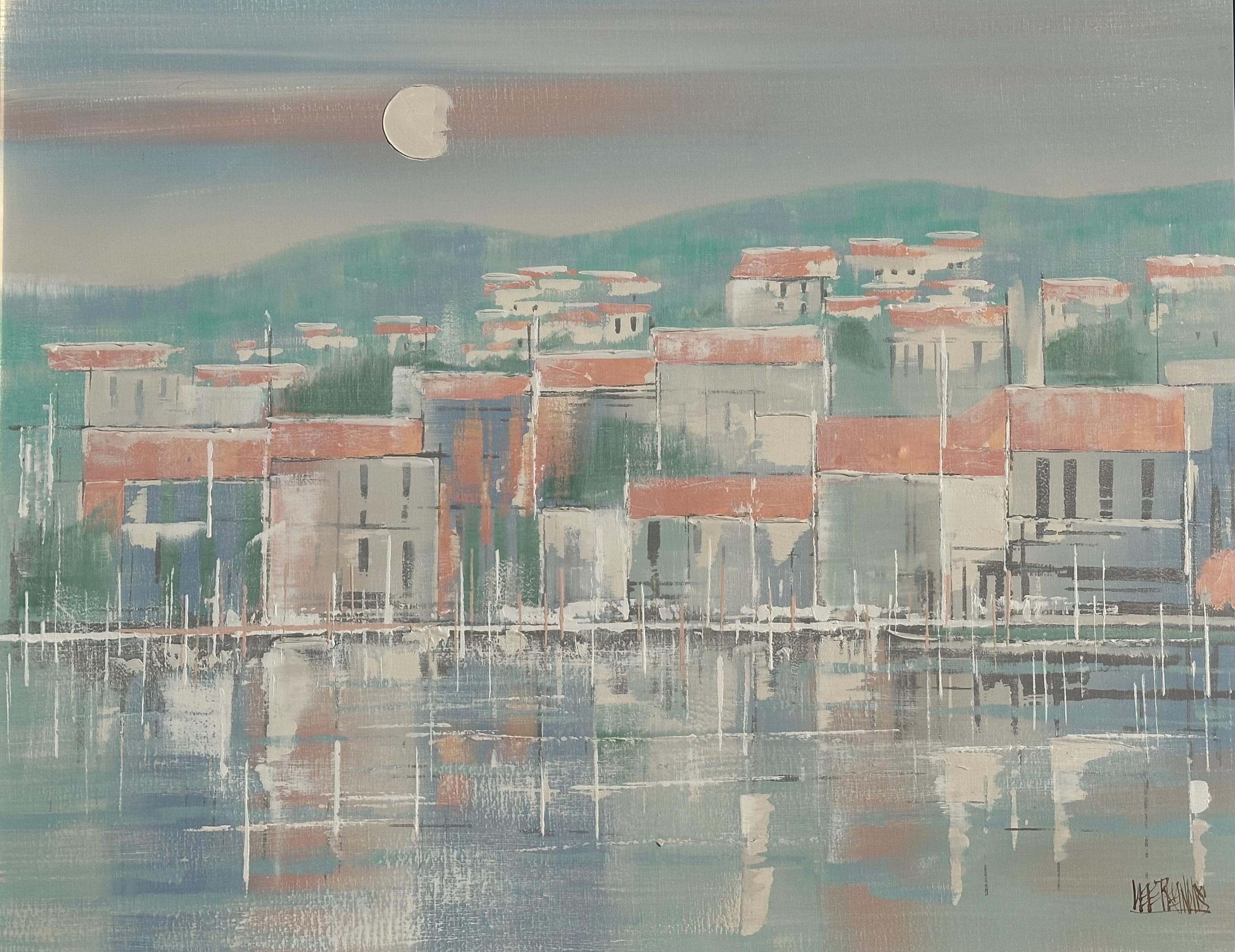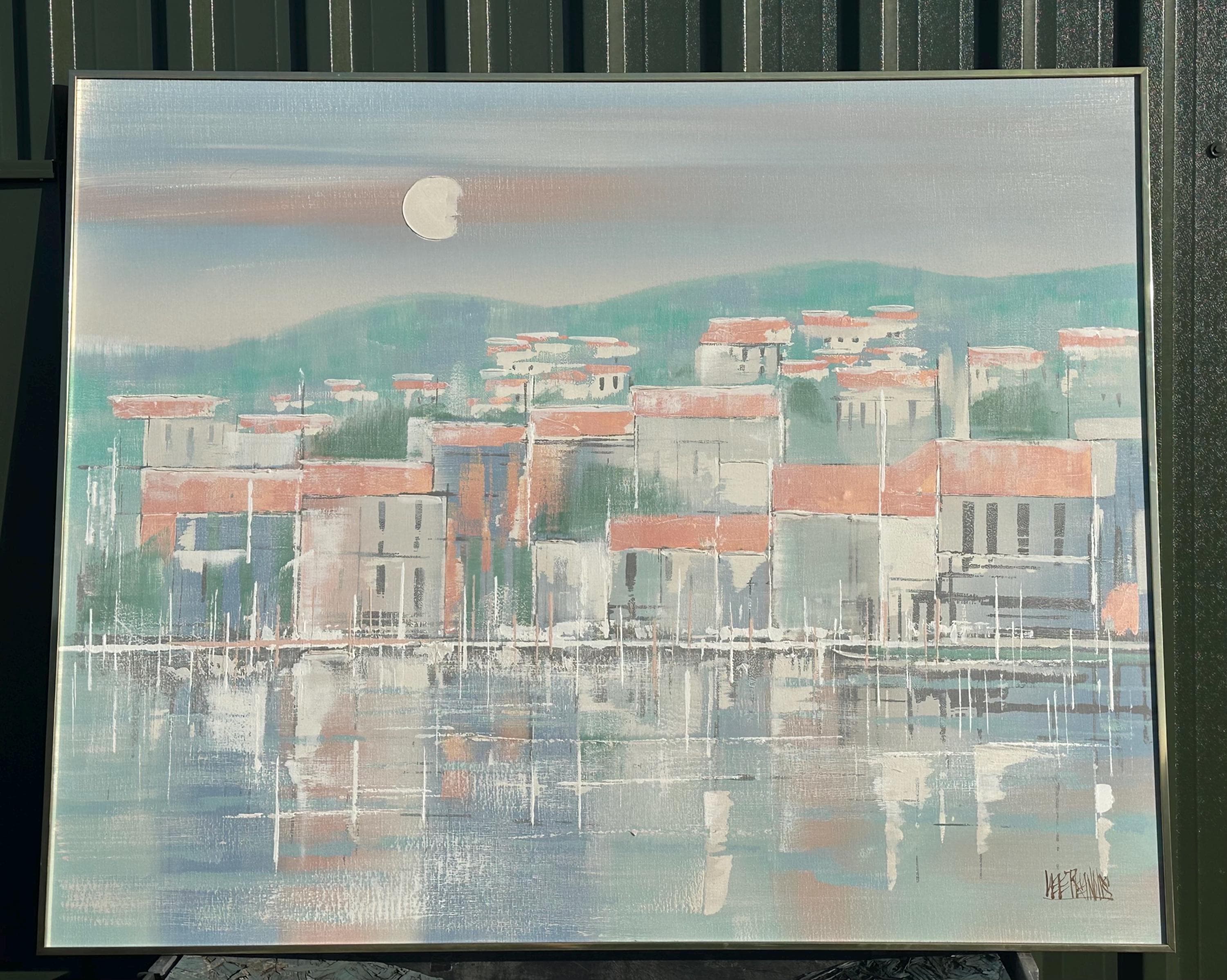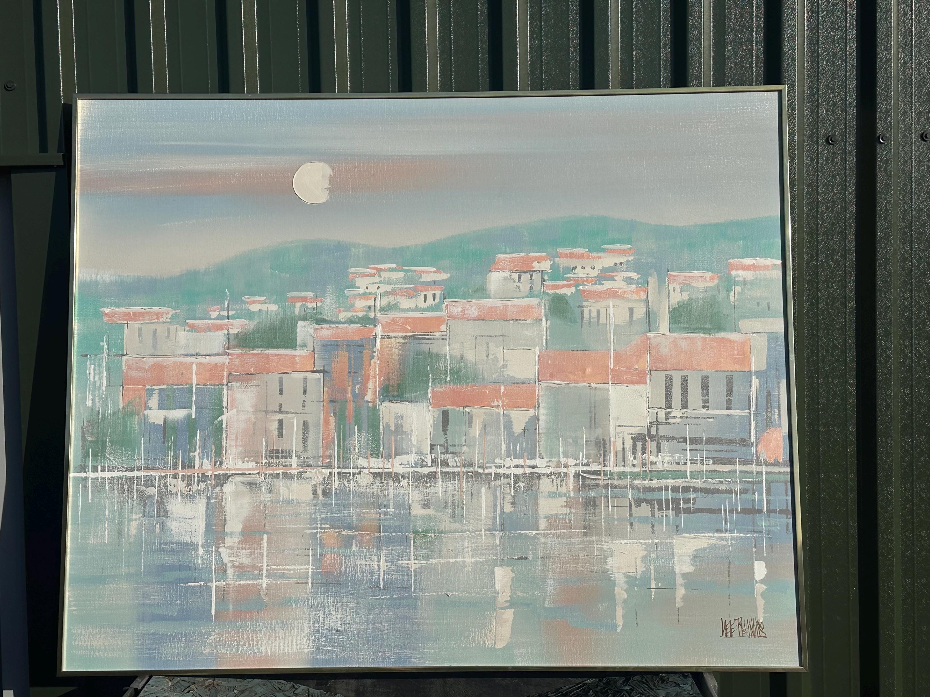 A striking original oil painting by Lee Reynolds, depicting a serene coastal townscape reflected in calm water beneath a pale moonlit sky. Executed in Reynolds’ highly recognisable mid-century modern style, the composition features softly abstracted buildings with terracotta roofs, layered against rolling green hills and atmospheric pastel tones.