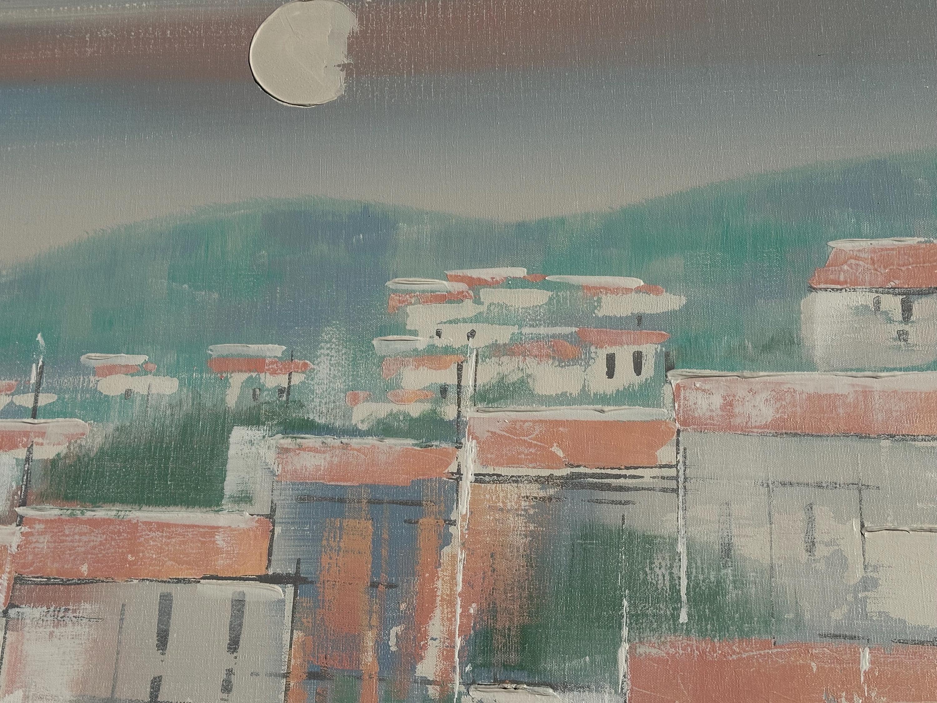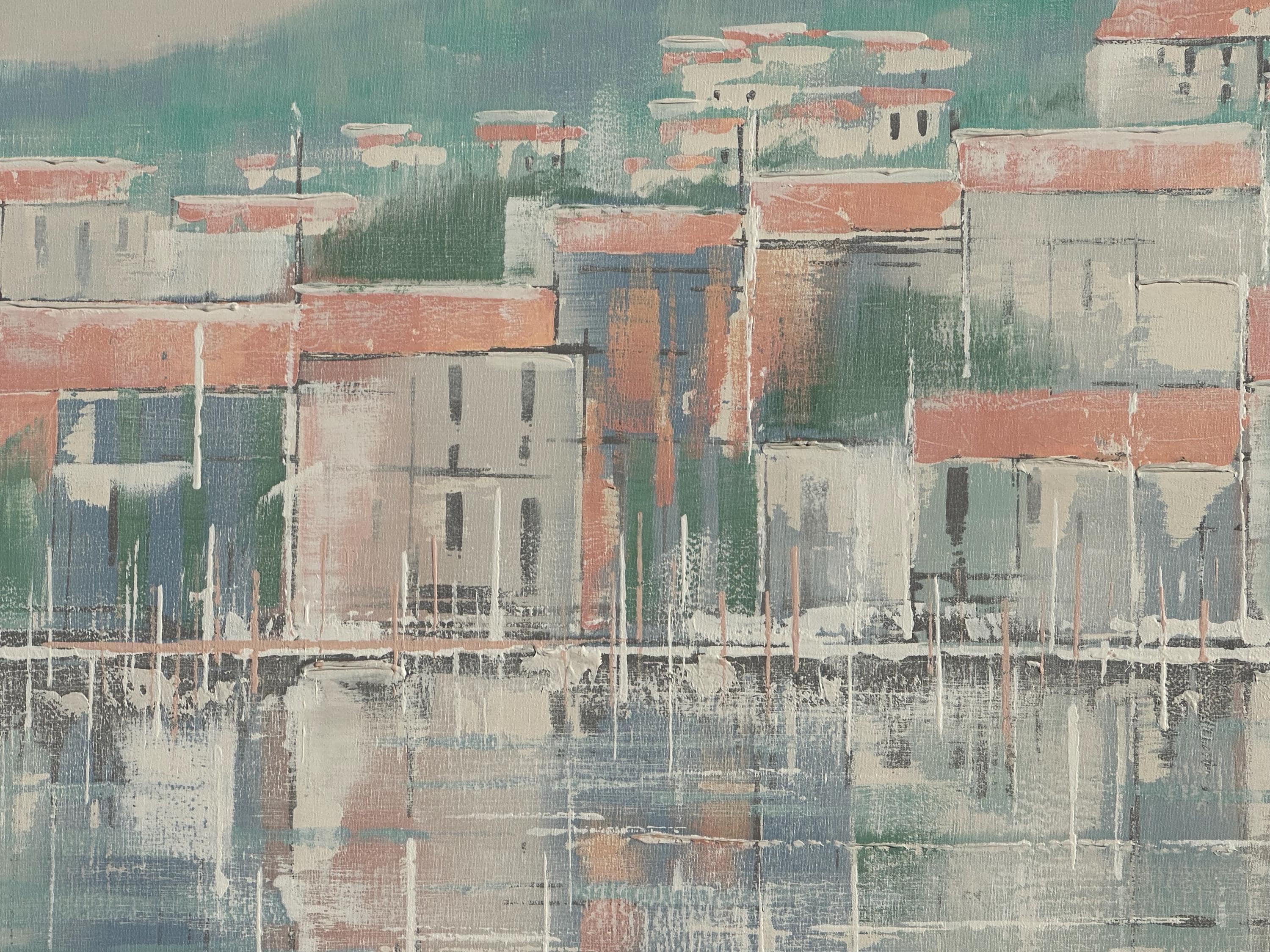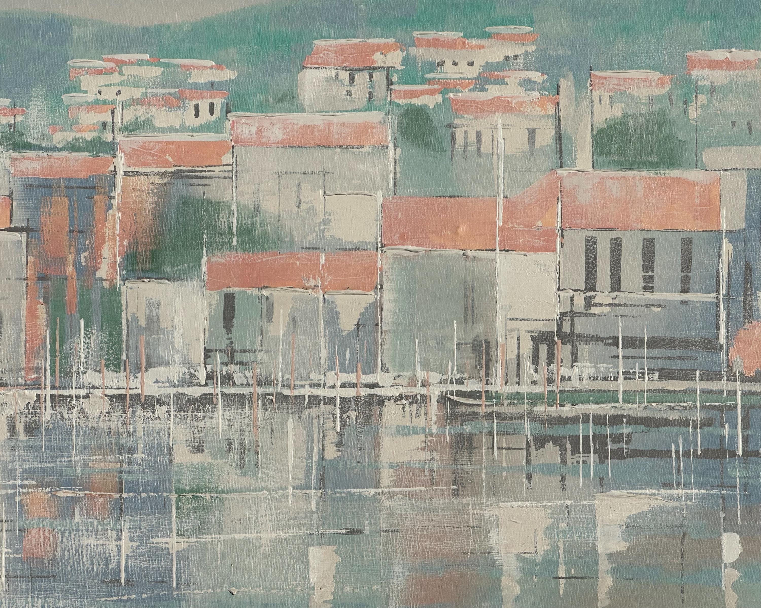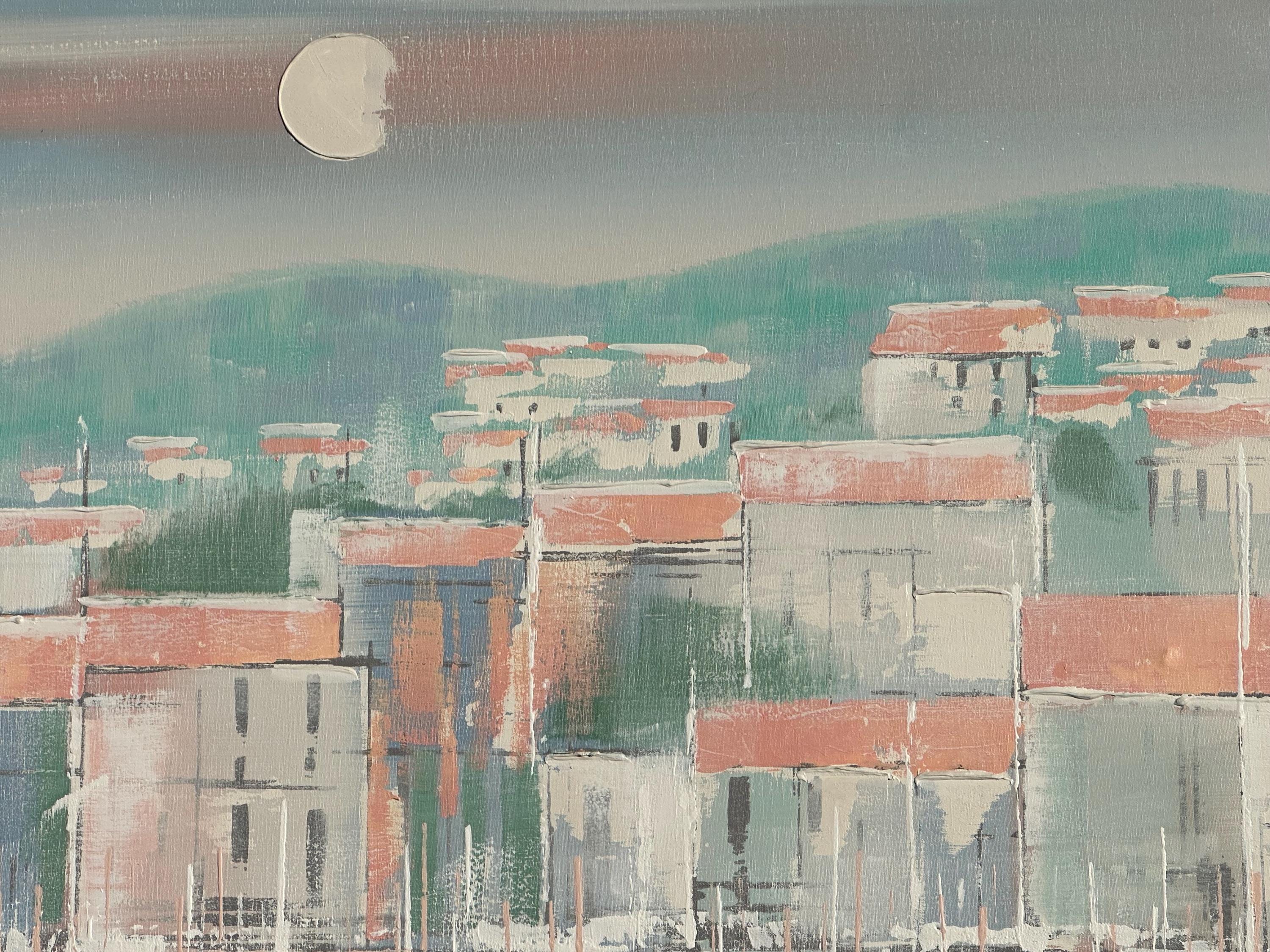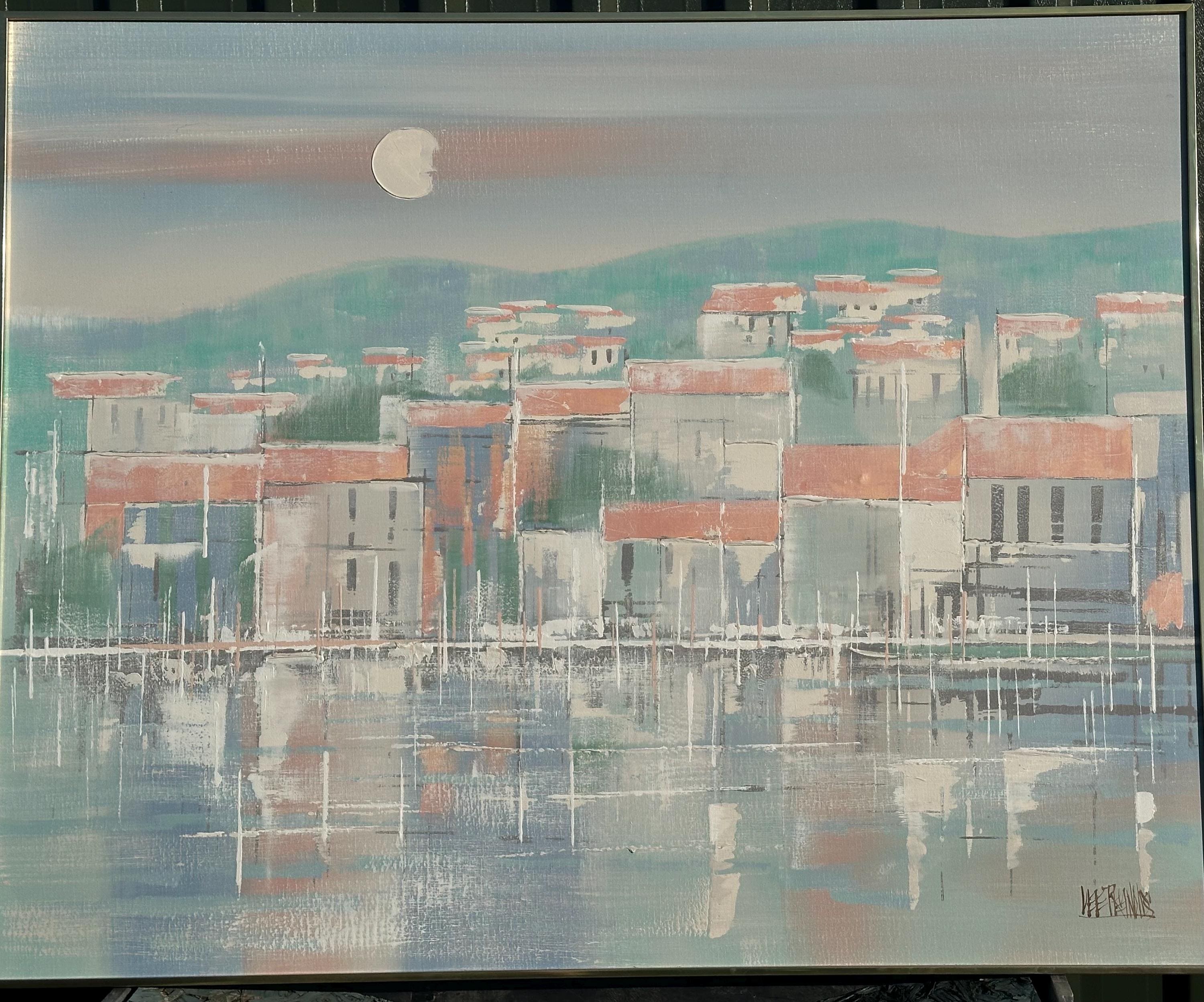 A striking original oil painting by Lee Reynolds, depicting a serene coastal townscape reflected in calm water beneath a pale moonlit sky. Executed in Reynolds’ highly recognisable mid-century modern style, the composition features softly abstracted buildings with terracotta roofs, layered against rolling green hills and atmospheric pastel tones.