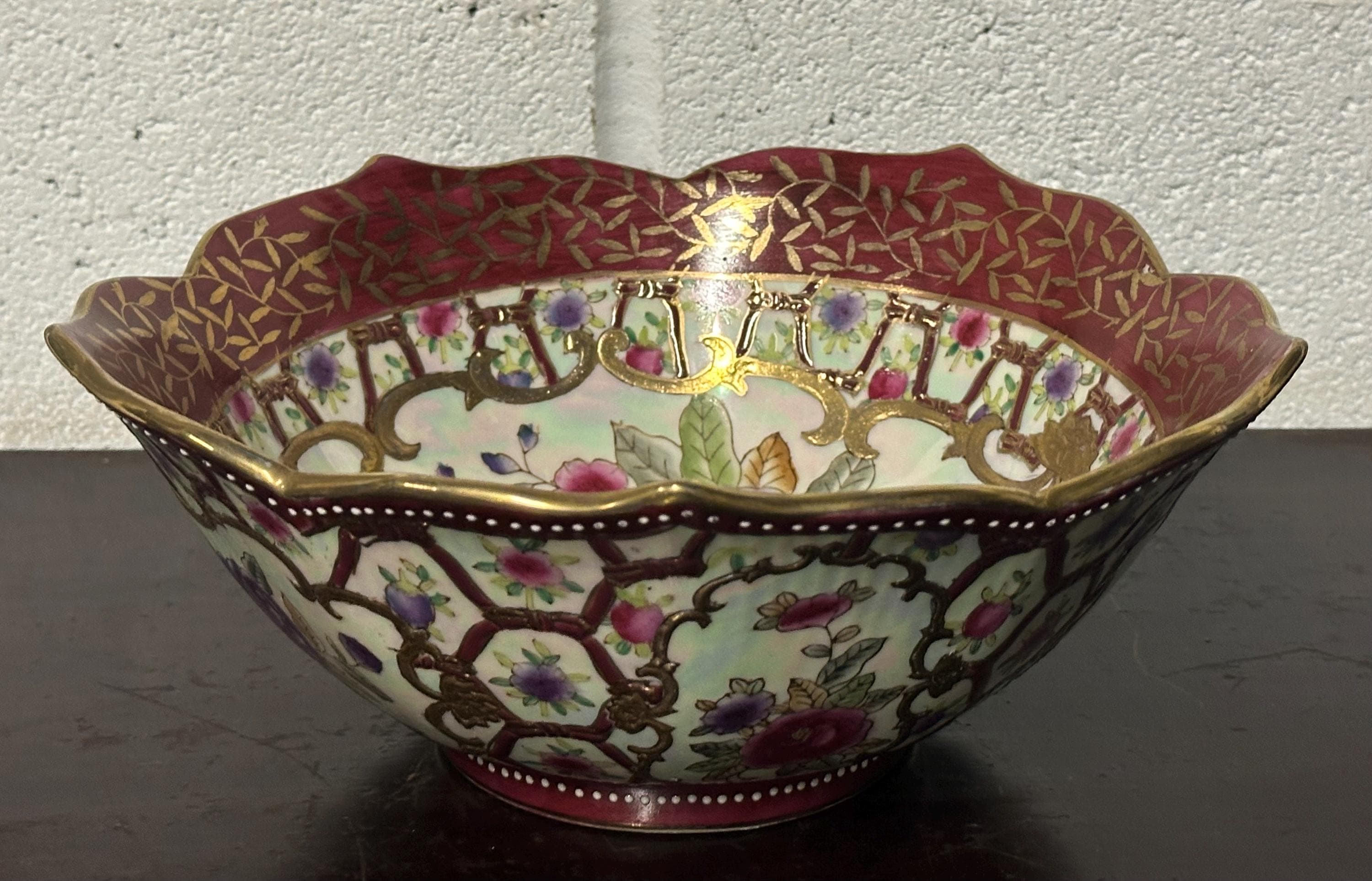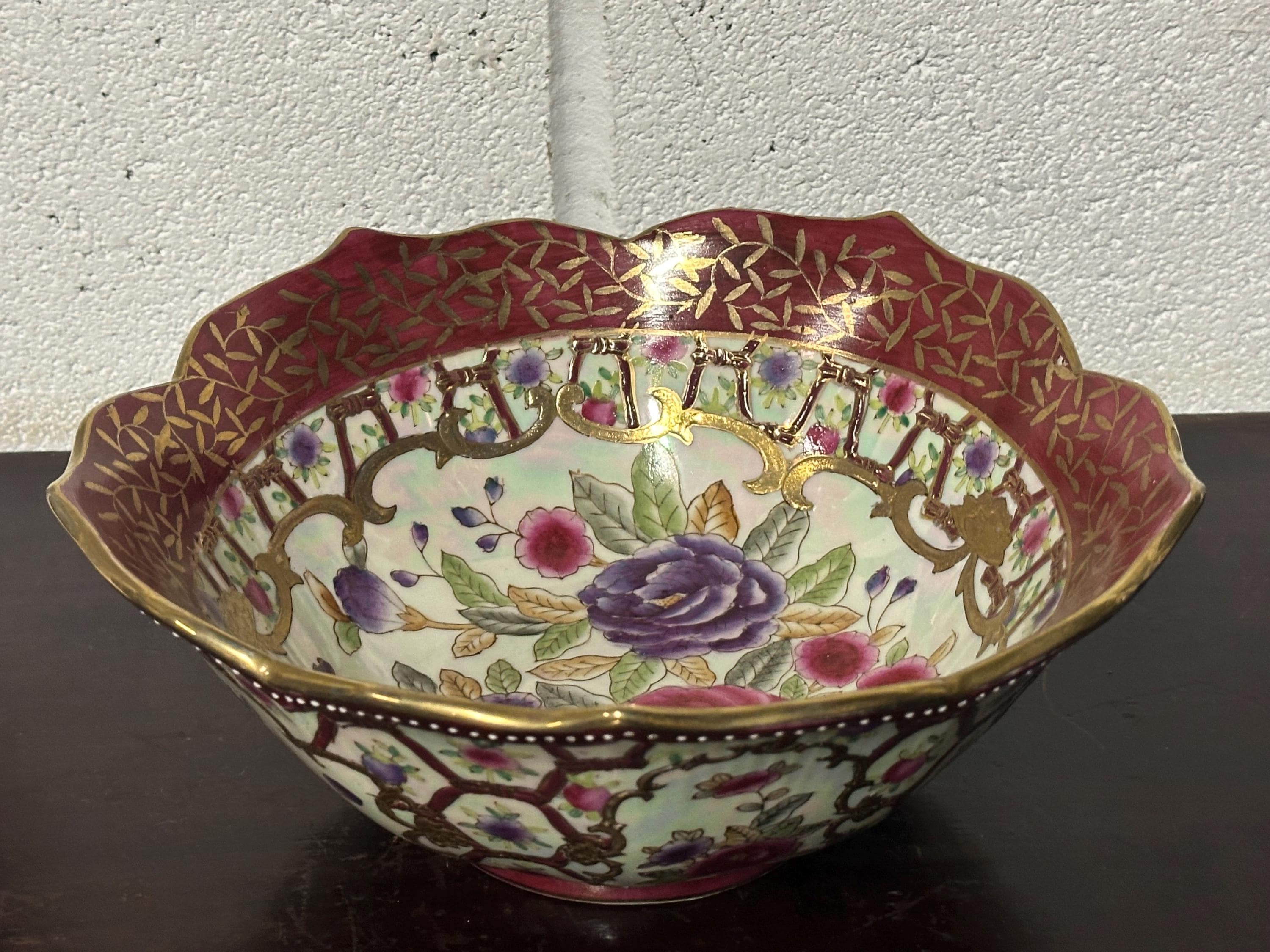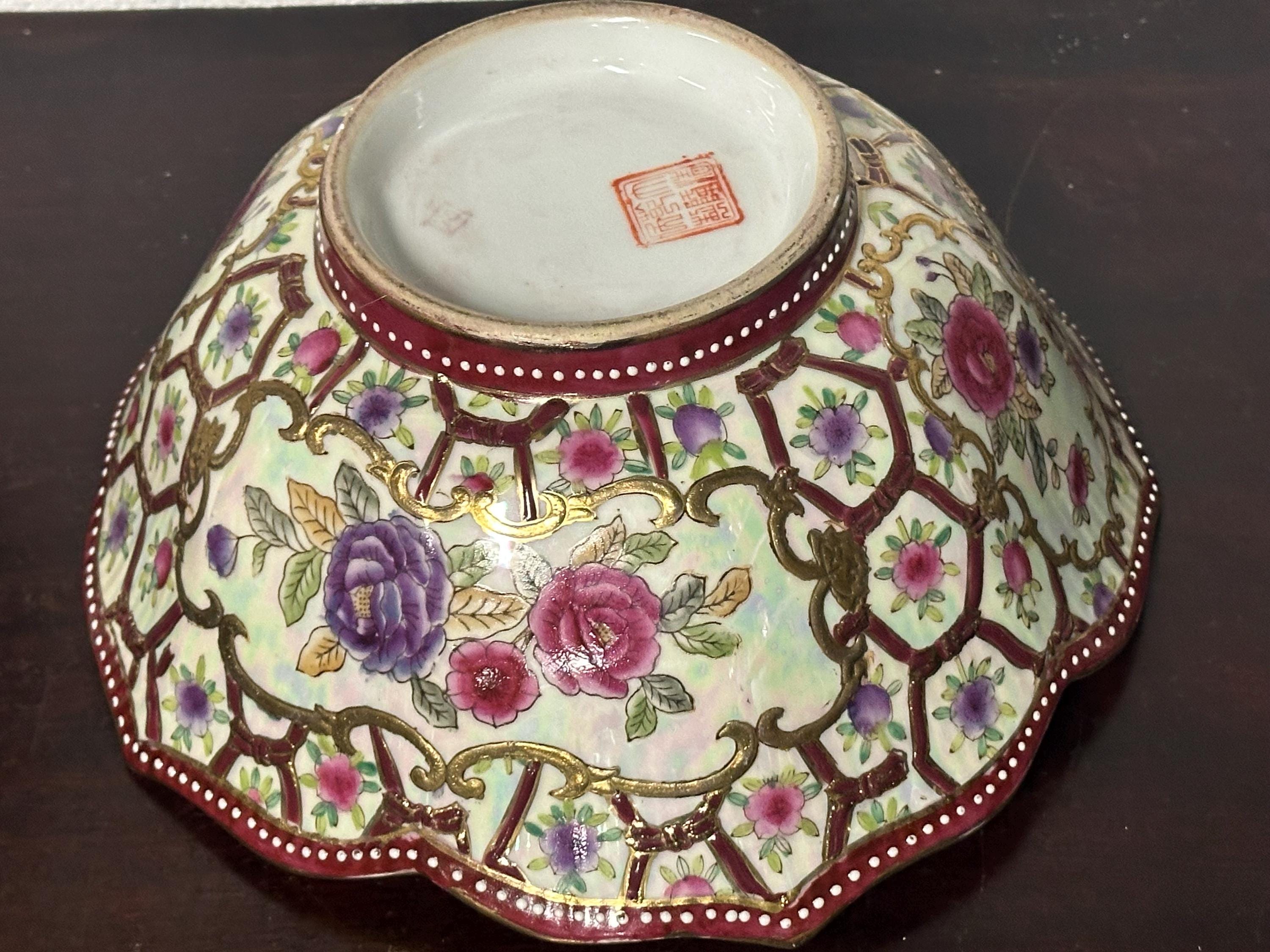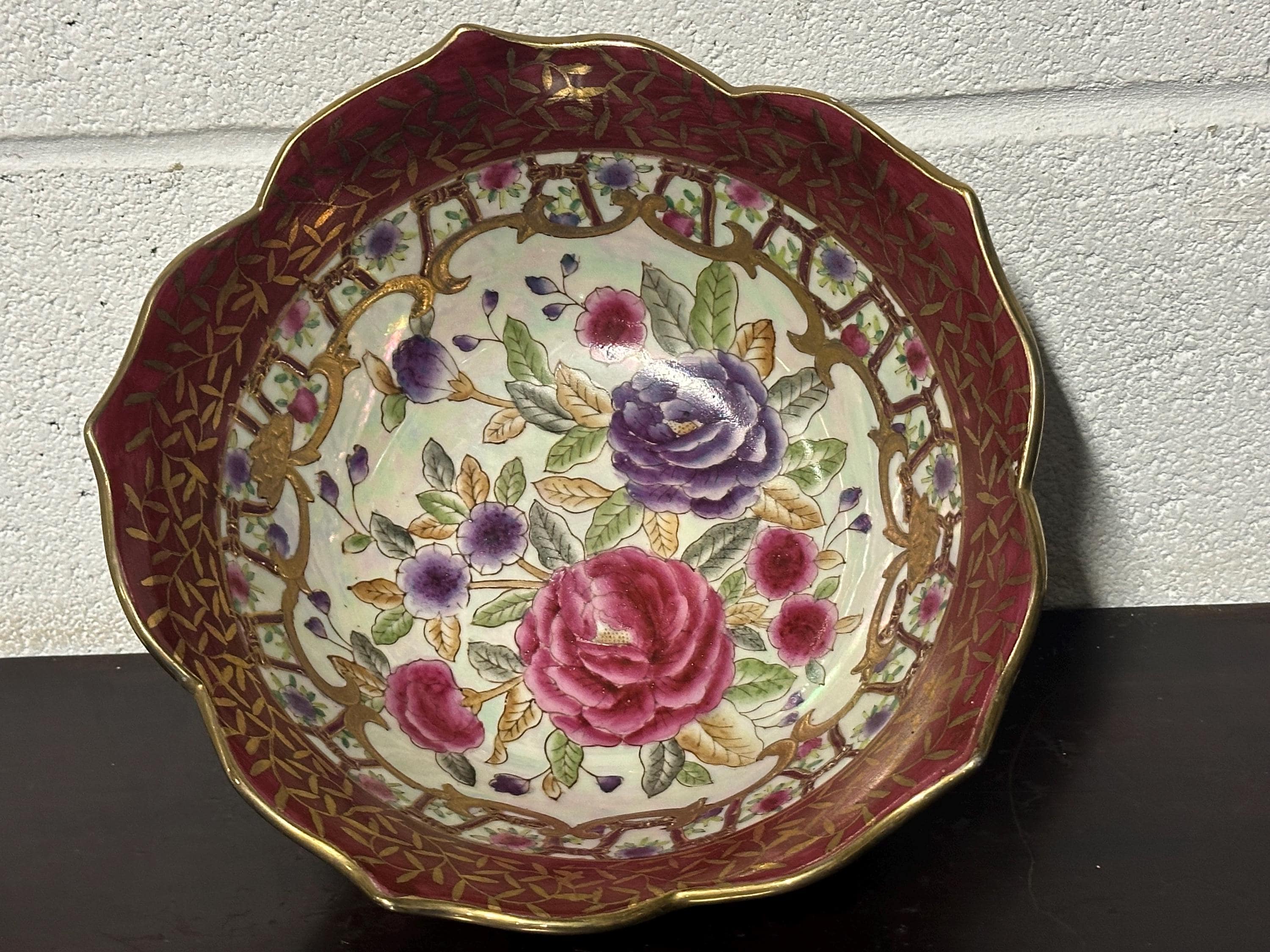 Antique Chinese Famille Rose Style Porcelain Bowl, Scalloped Rim Gilt Decoration