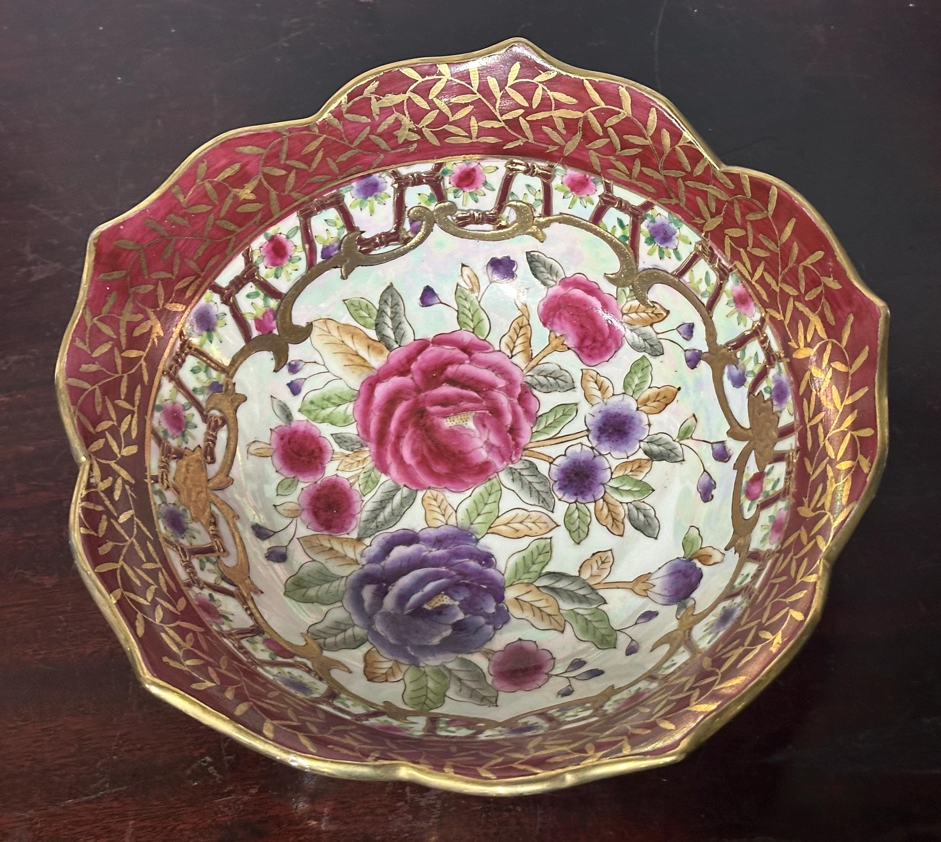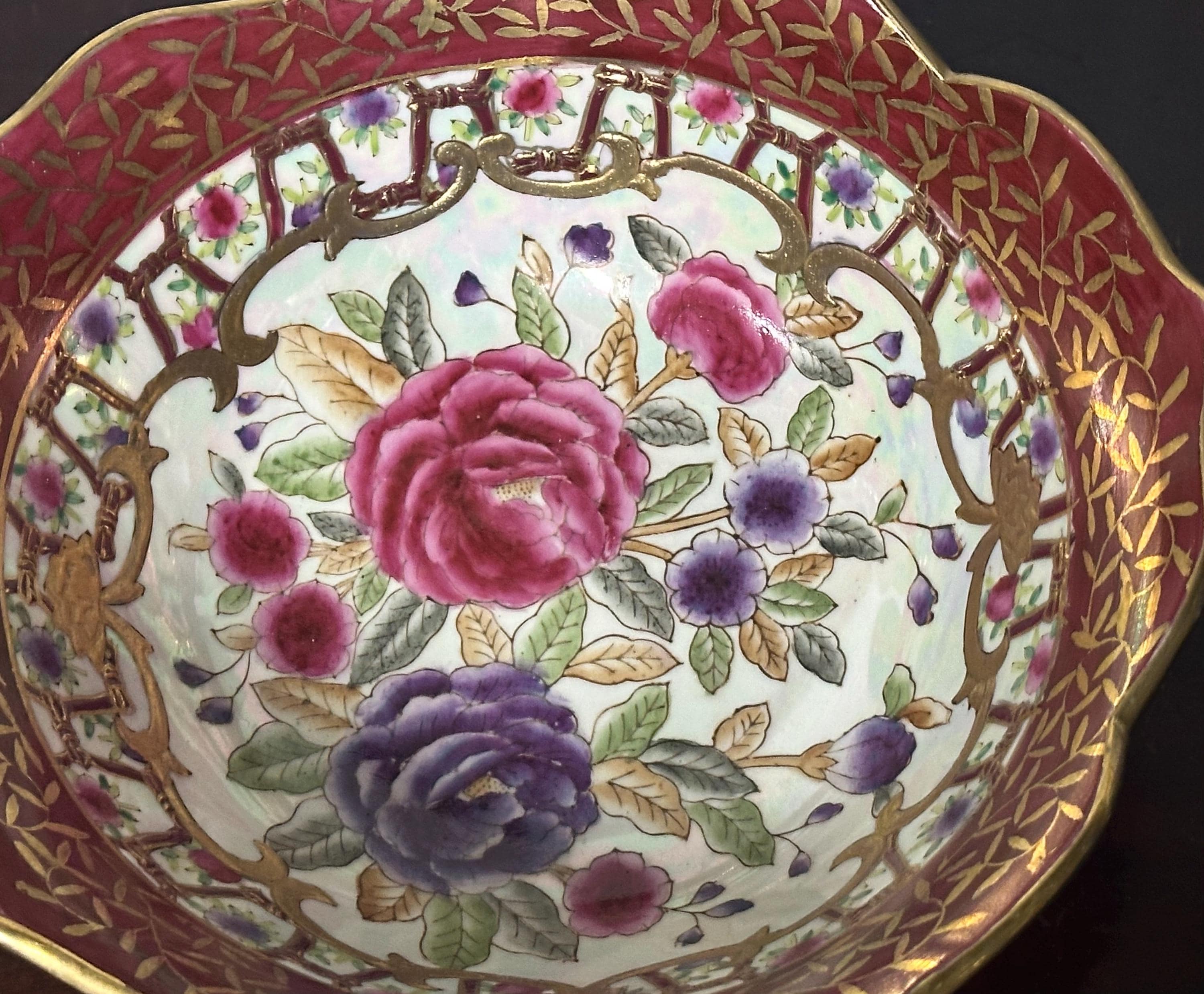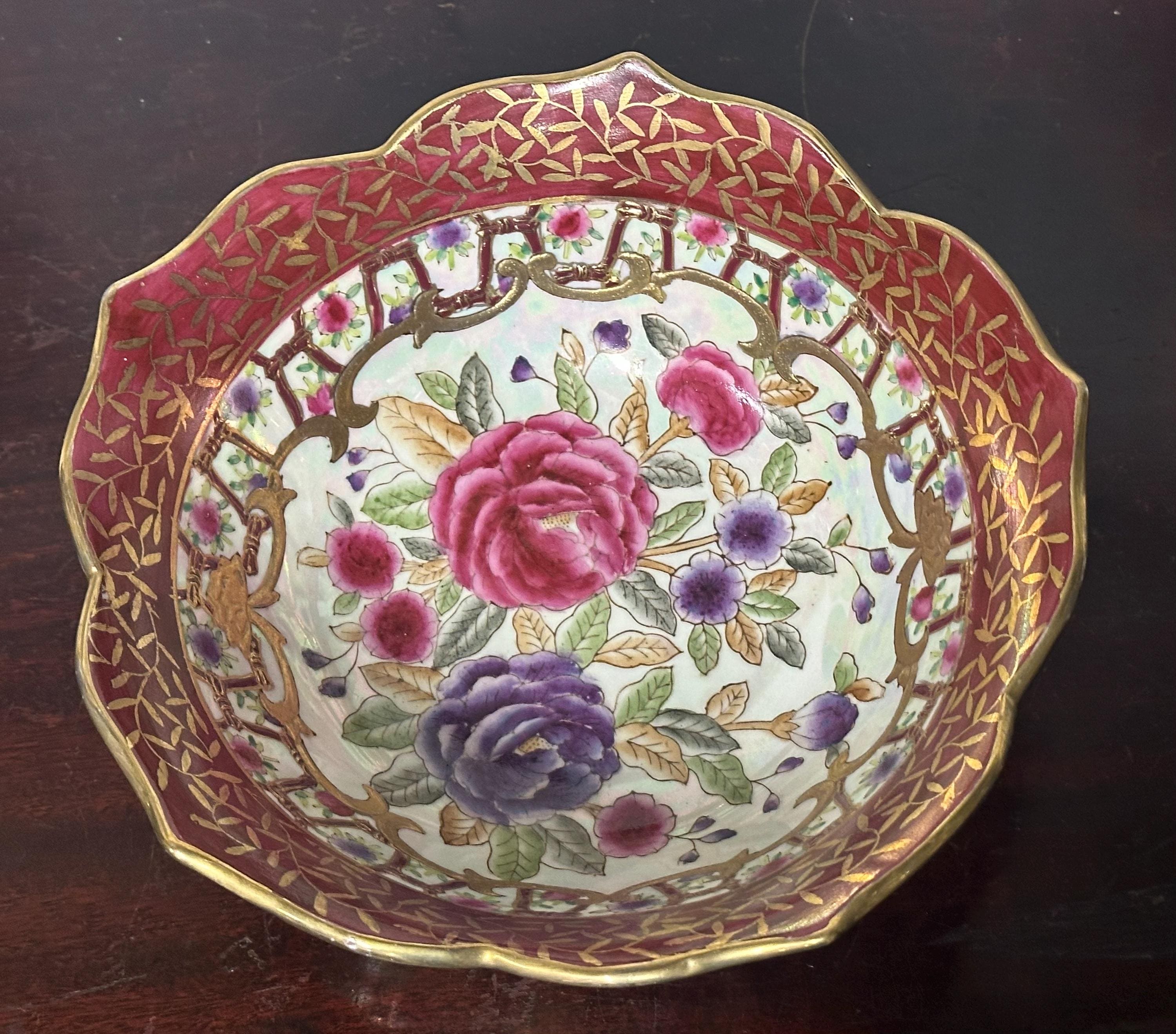Antique Chinese Famille Rose Style Porcelain Bowl, Scalloped Rim Gilt Decoration