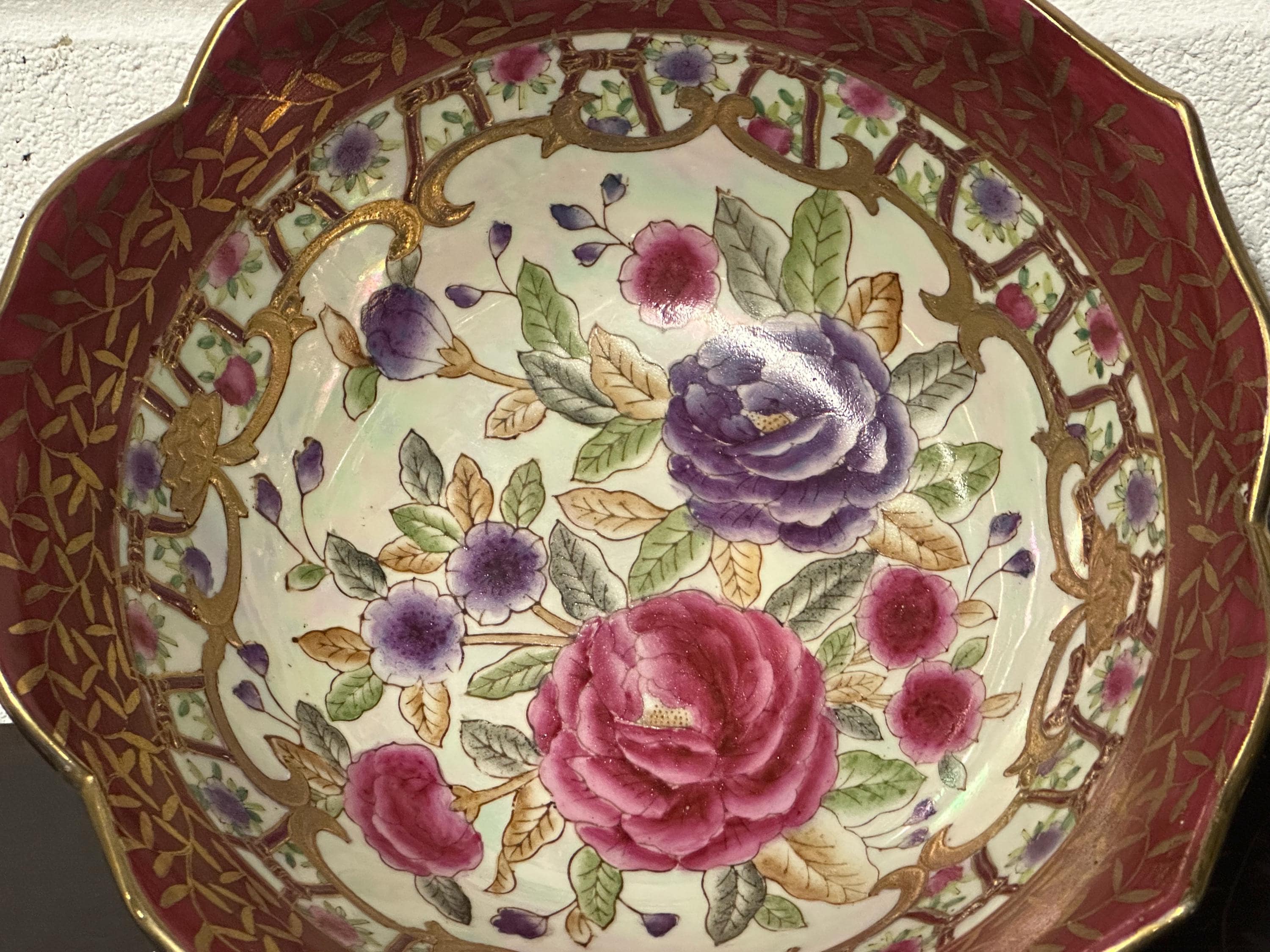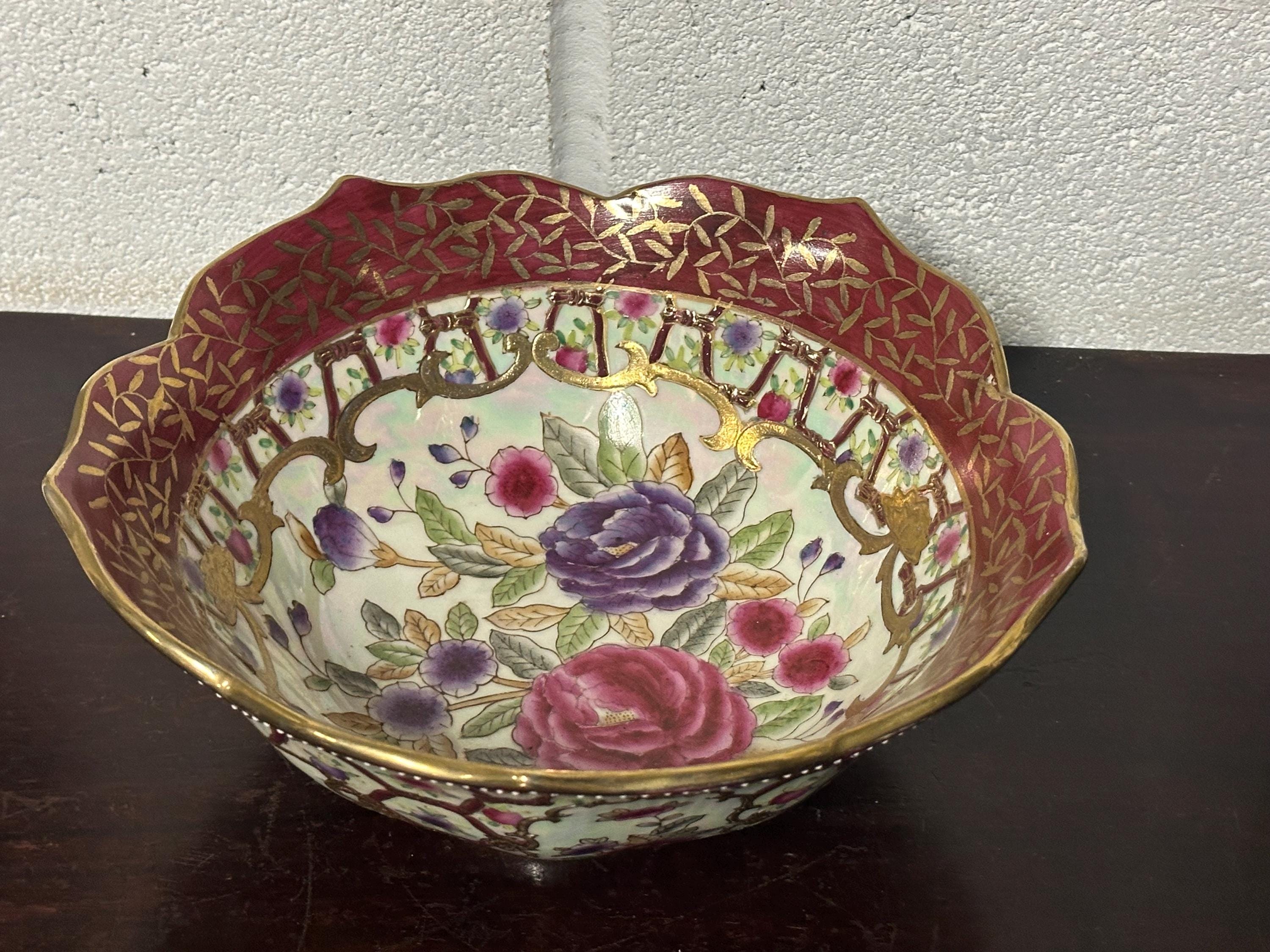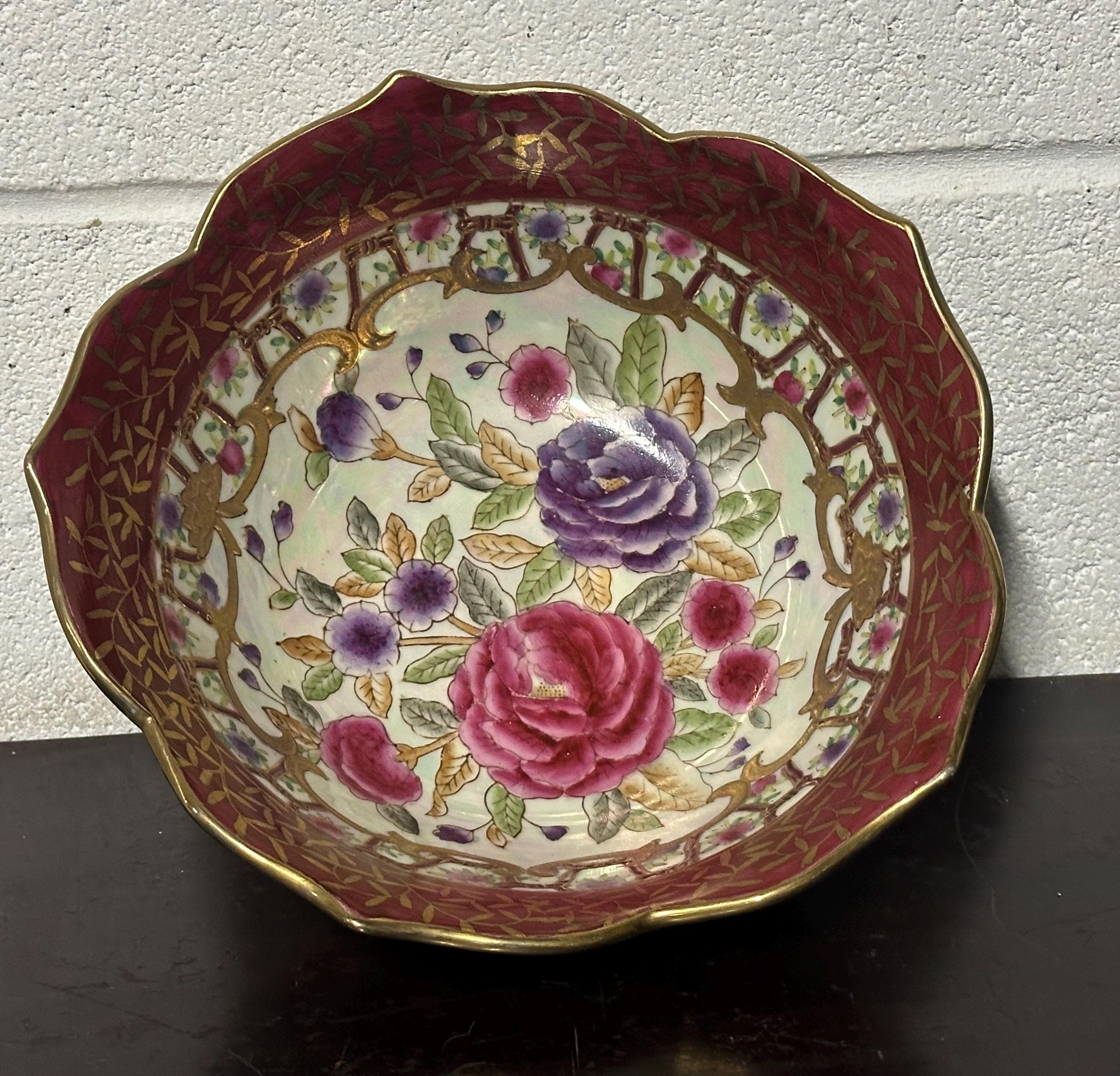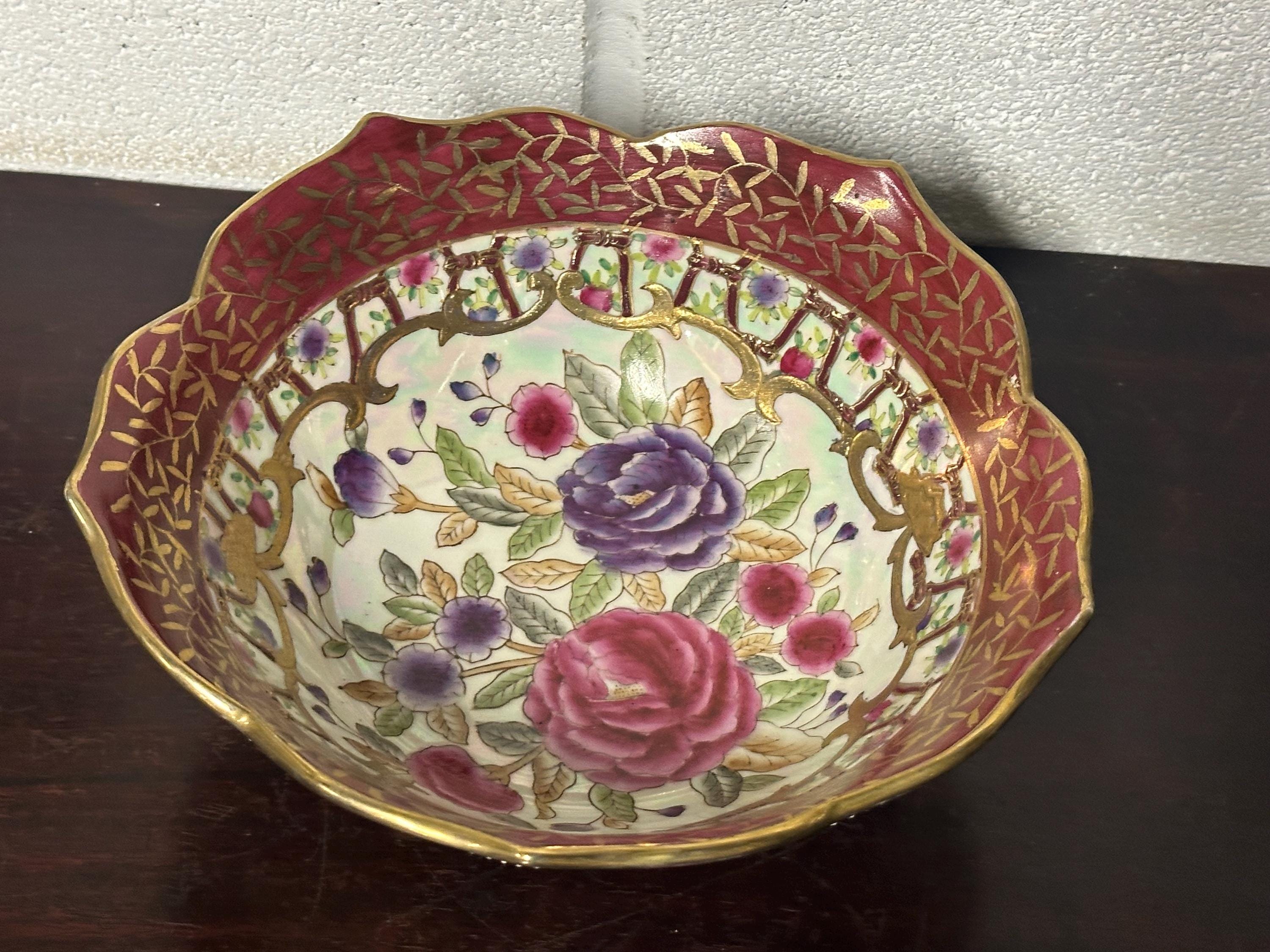 Antique Chinese Famille Rose Style Porcelain Bowl, Scalloped Rim Gilt Decoration