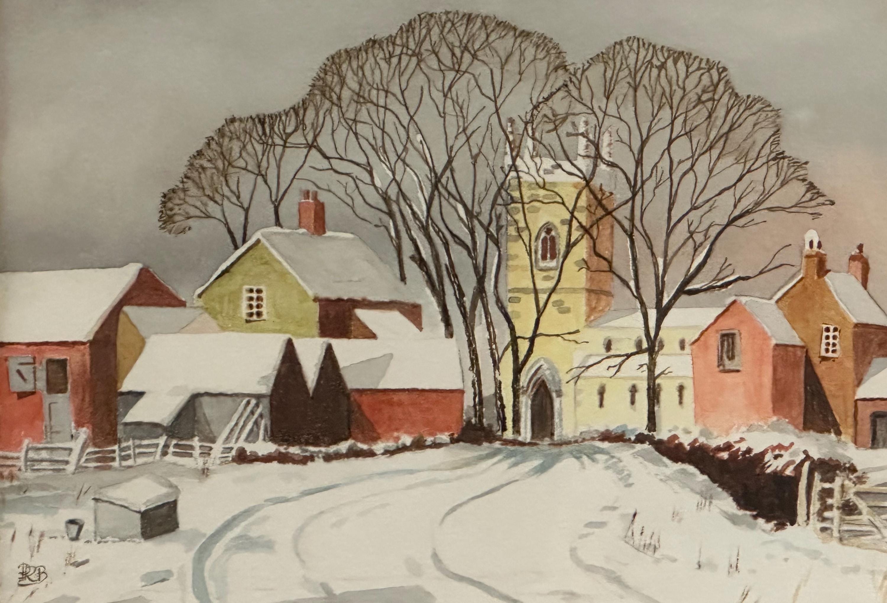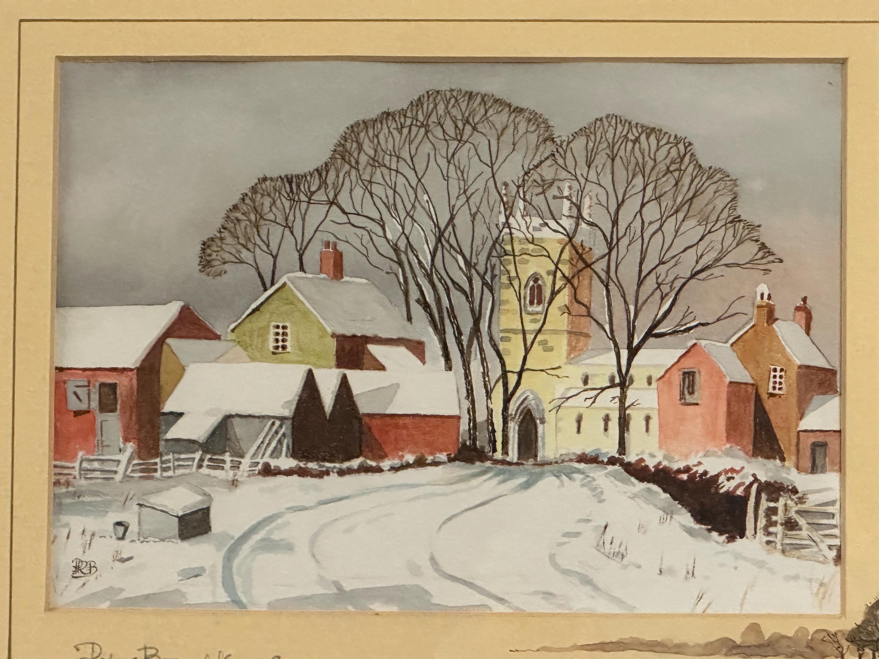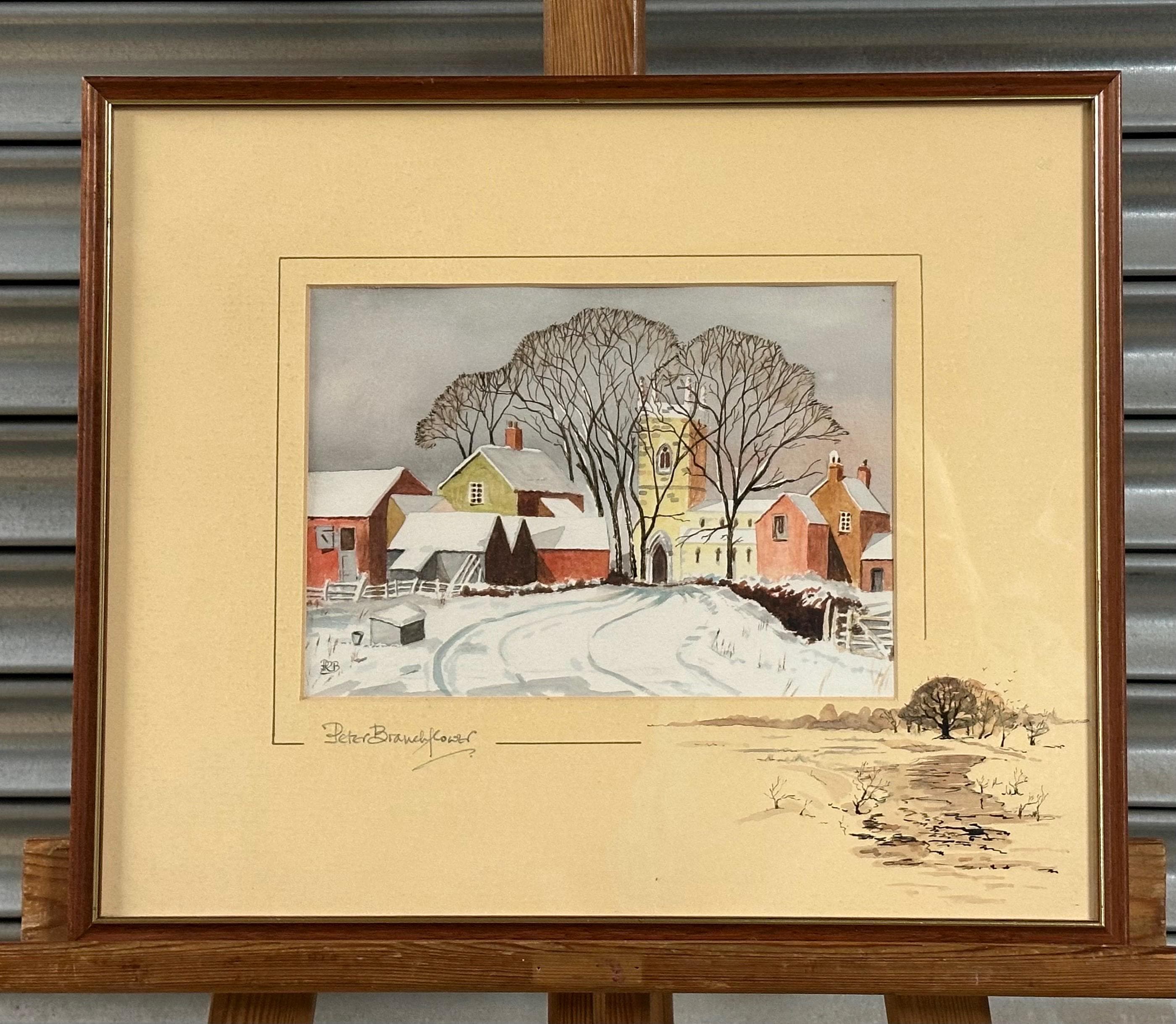 A delightful original watercolour painting by Peter Branchflower, depicting a peaceful winter village scene. The composition shows snow-covered cottages and barns leading towards a village church, framed by tall bare winter trees. Soft, muted tones and careful detailing create a calm, atmospheric rural landscape with a strong sense of depth and season.