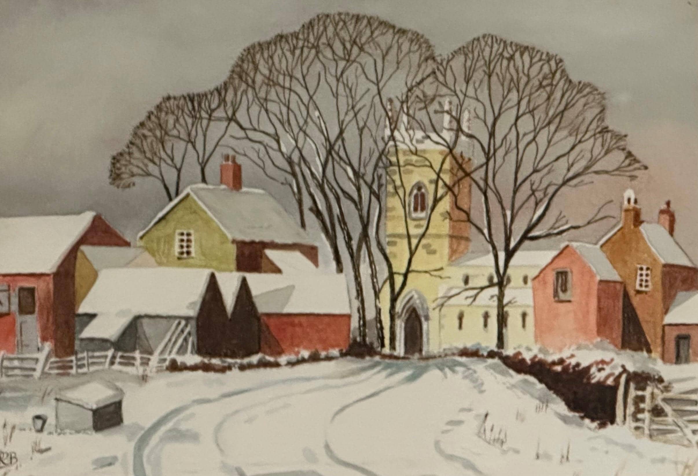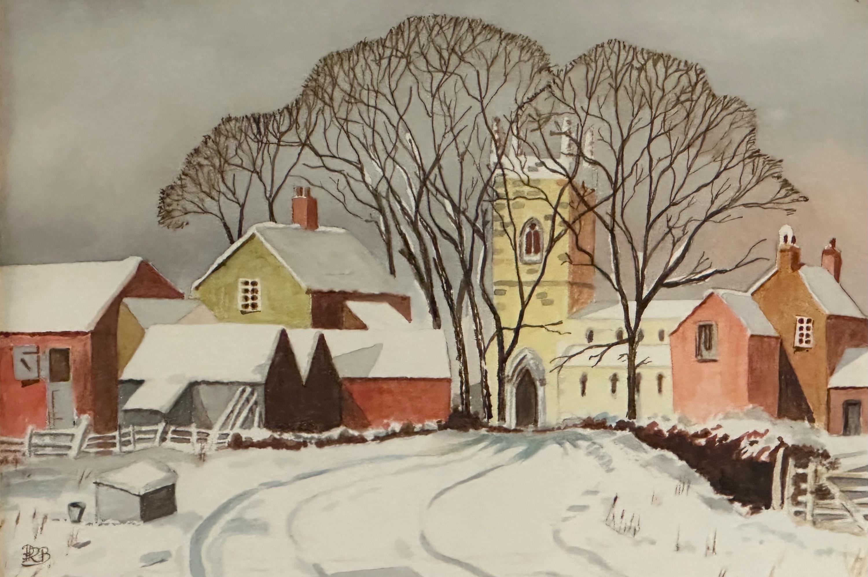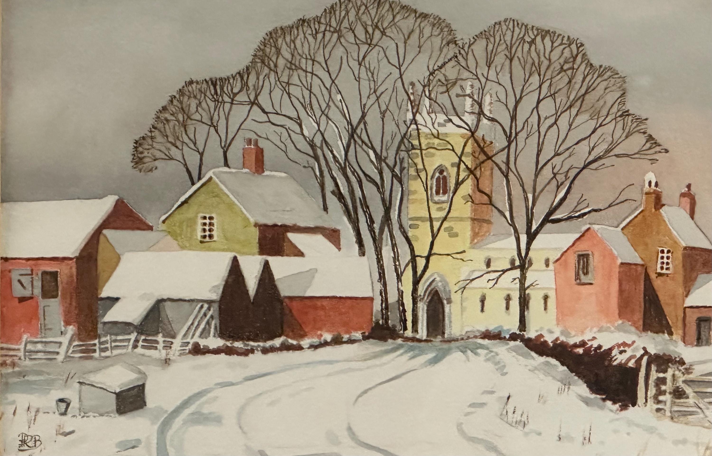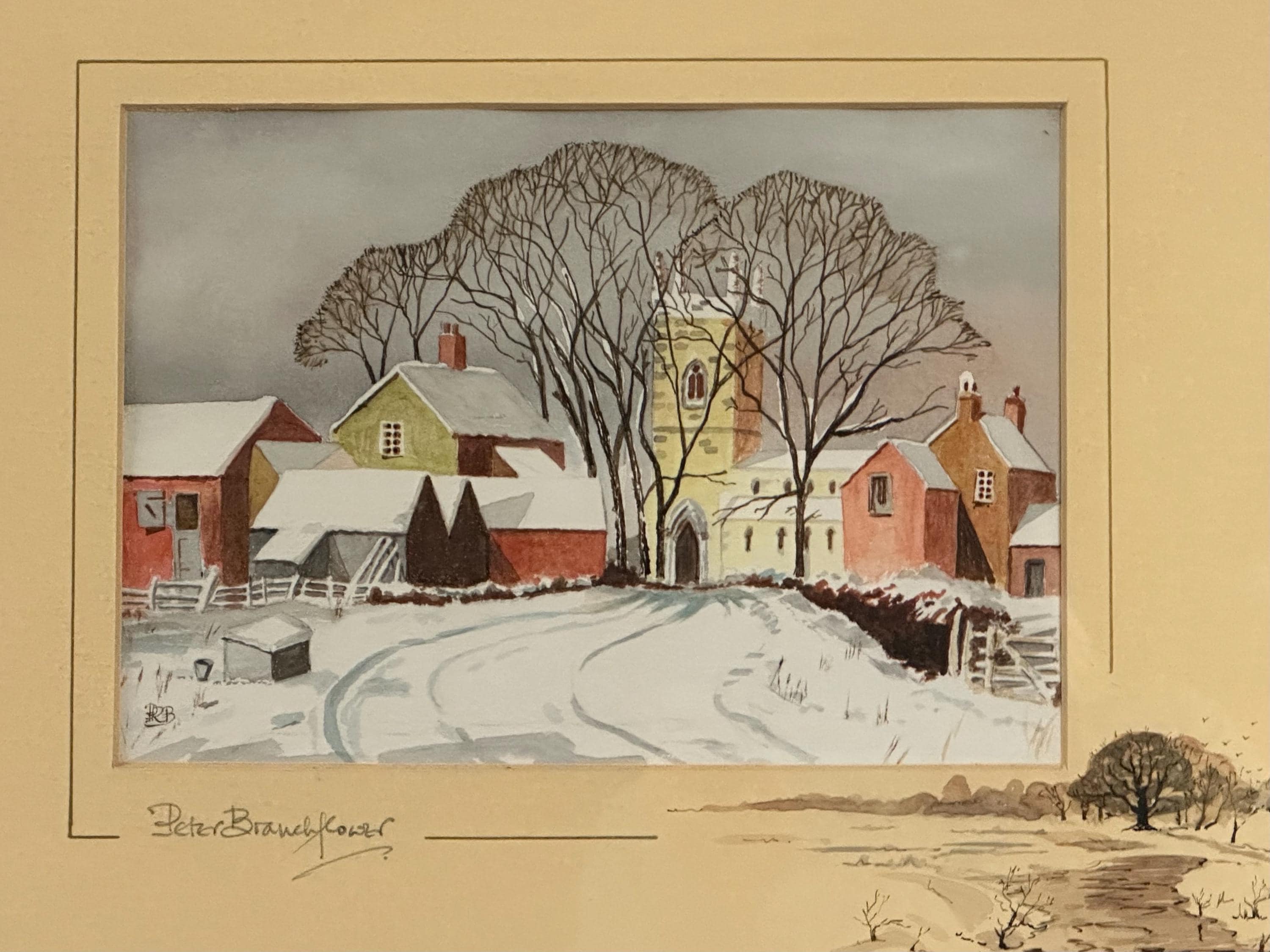 A delightful original watercolour painting by Peter Branchflower, depicting a peaceful winter village scene. The composition shows snow-covered cottages and barns leading towards a village church, framed by tall bare winter trees. Soft, muted tones and careful detailing create a calm, atmospheric rural landscape with a strong sense of depth and season.