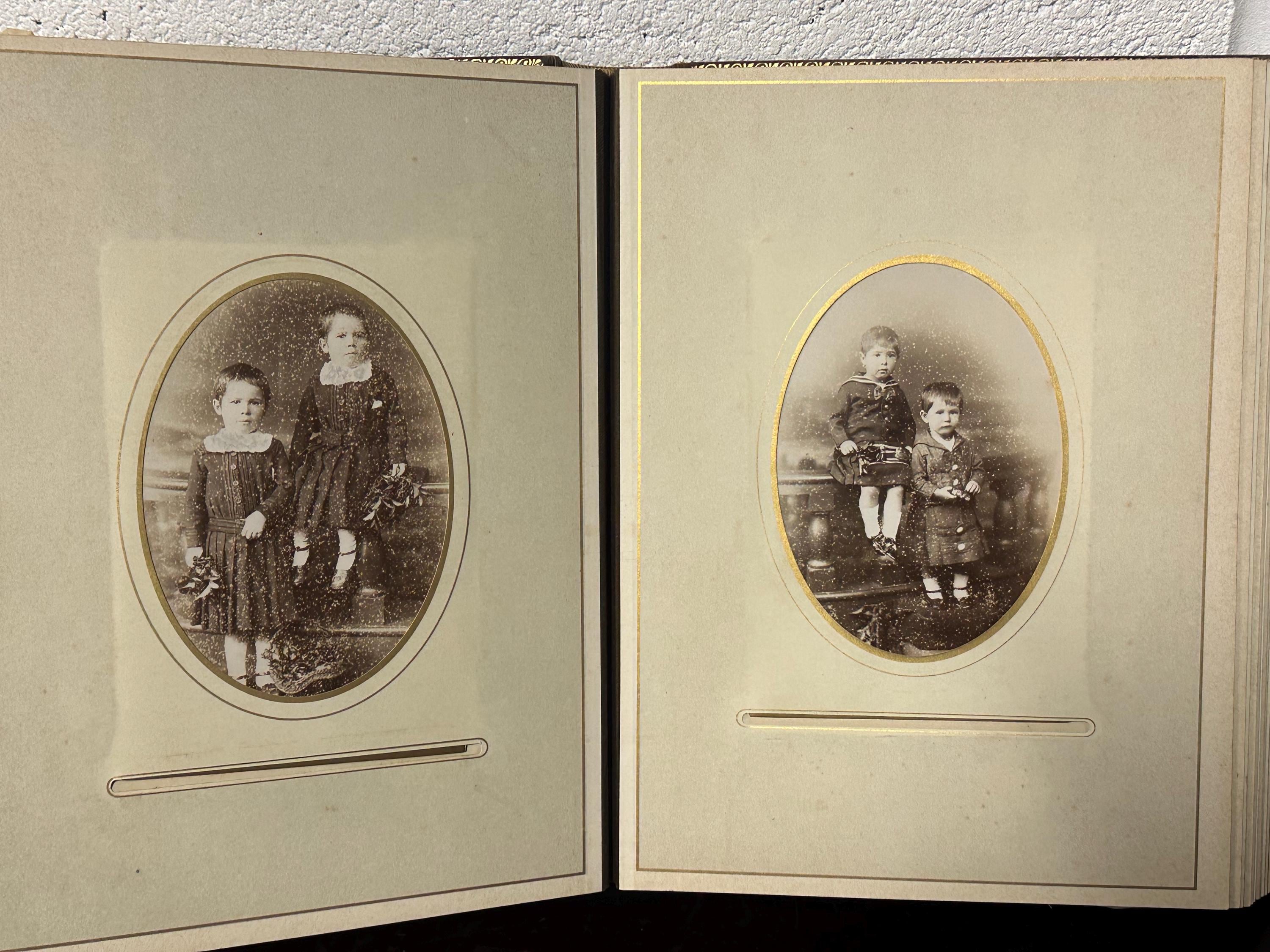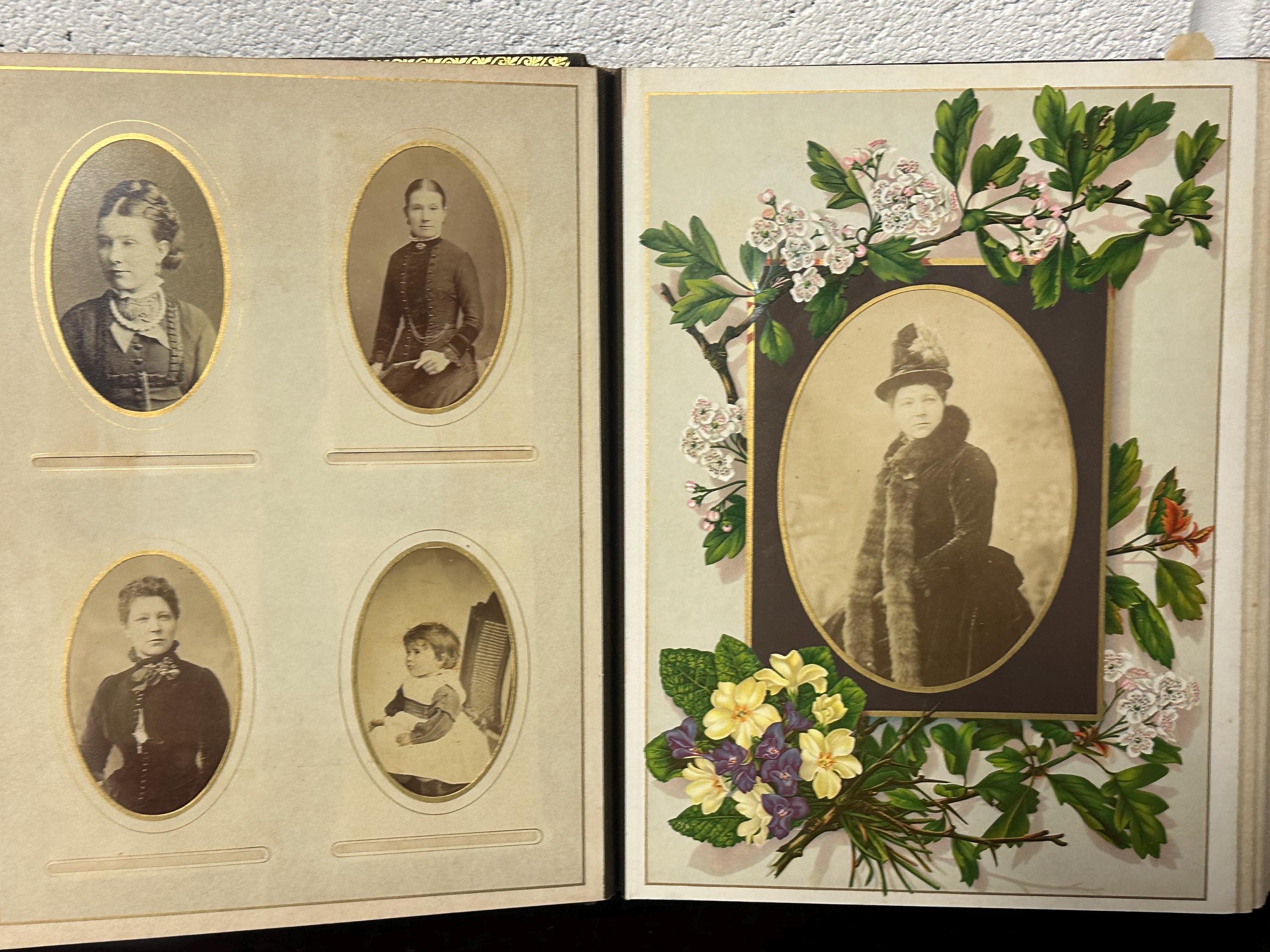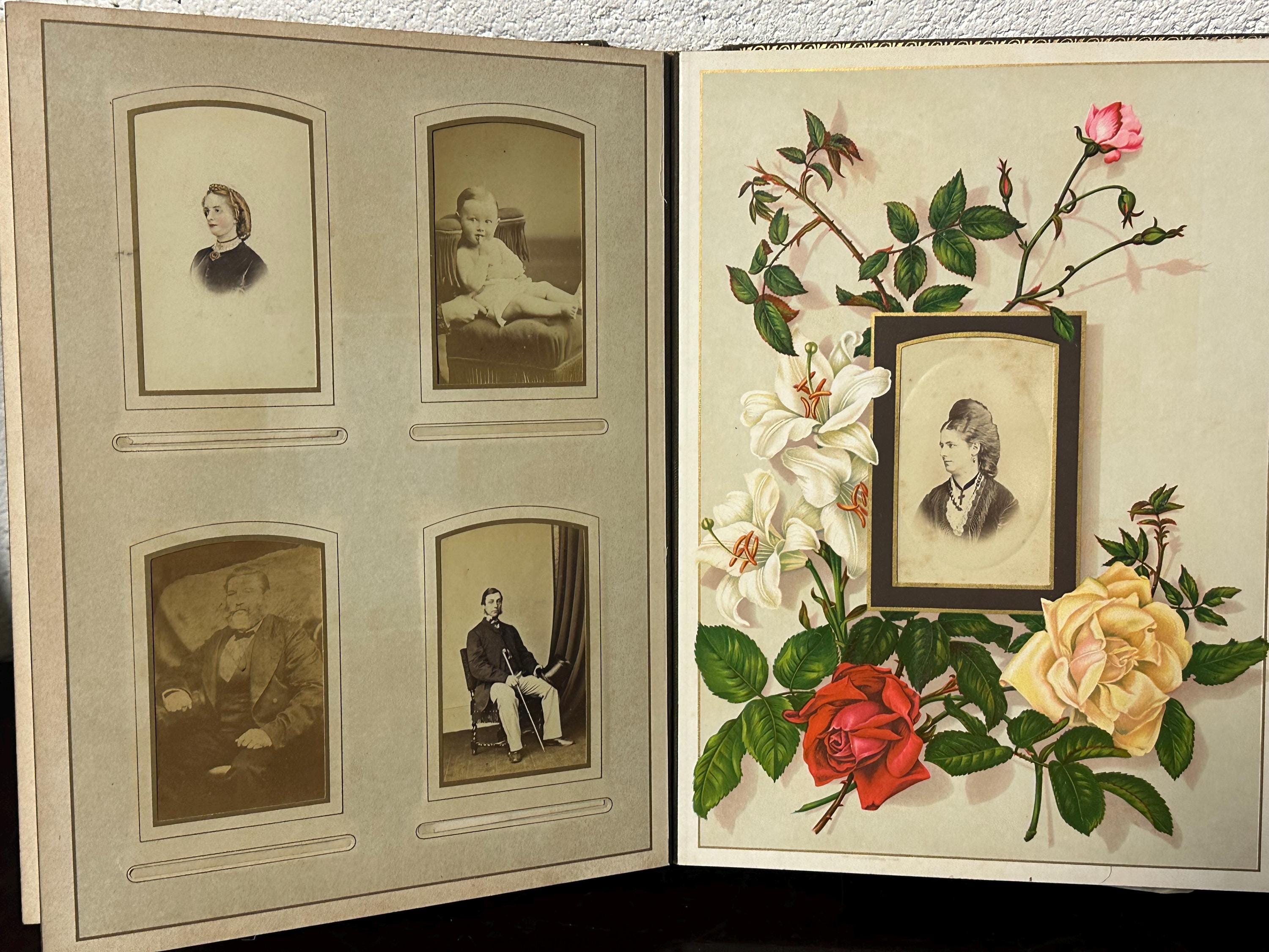 The album contains approx 49 original photographs, dating to the Victorian and Edwardian period, showing a variety of formal studio portraits and candid images. Subjects include men, women and children, dressed in period attire typical of the late 19th and early 20th centuries. Many of the boards are framed by vibrant floral decoration, typical of quality albums of this era.