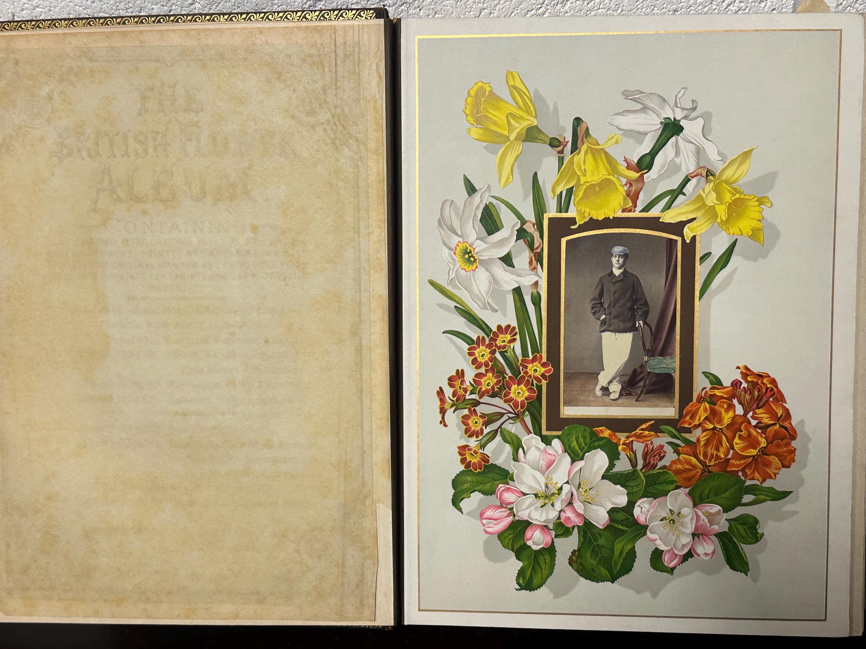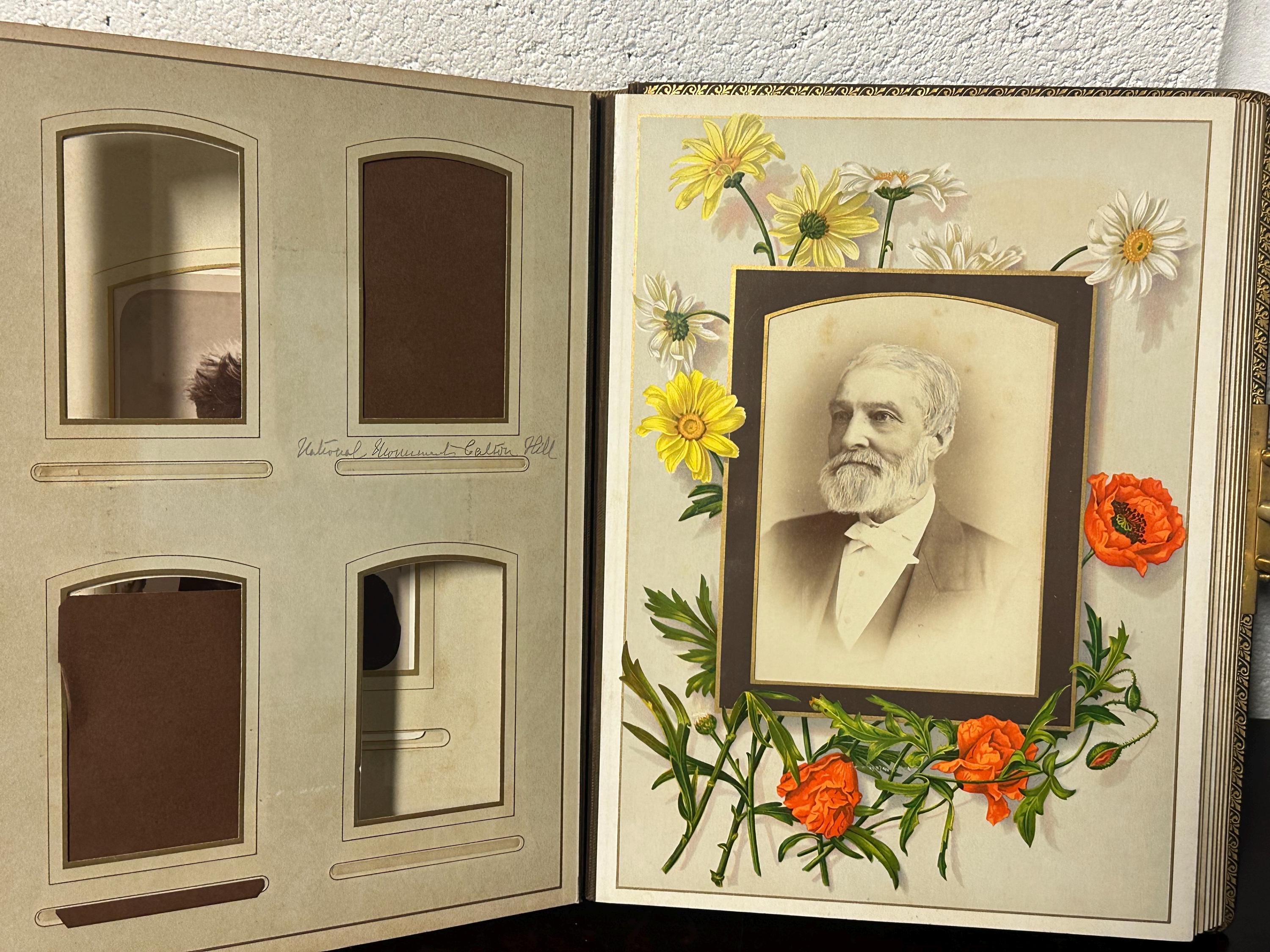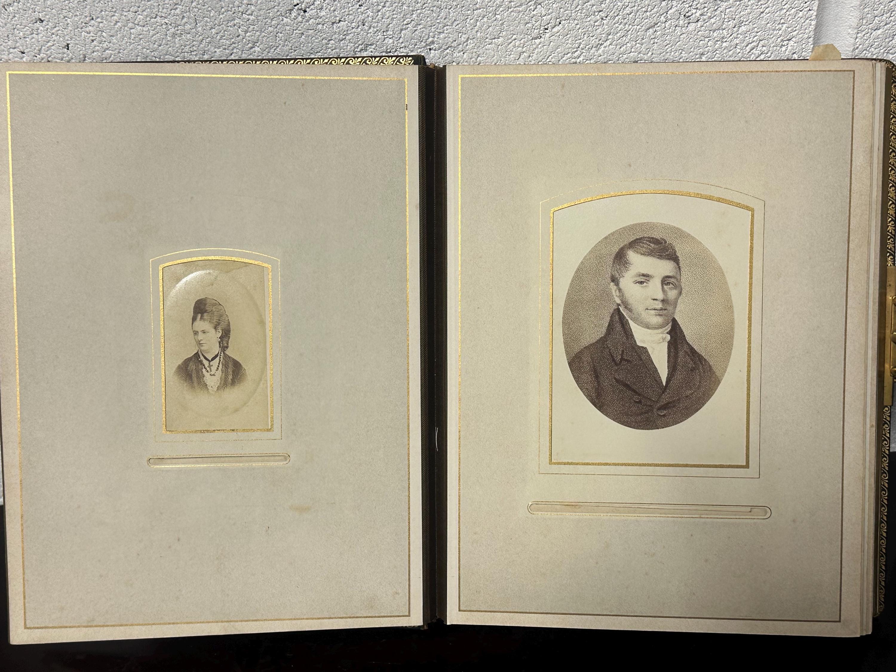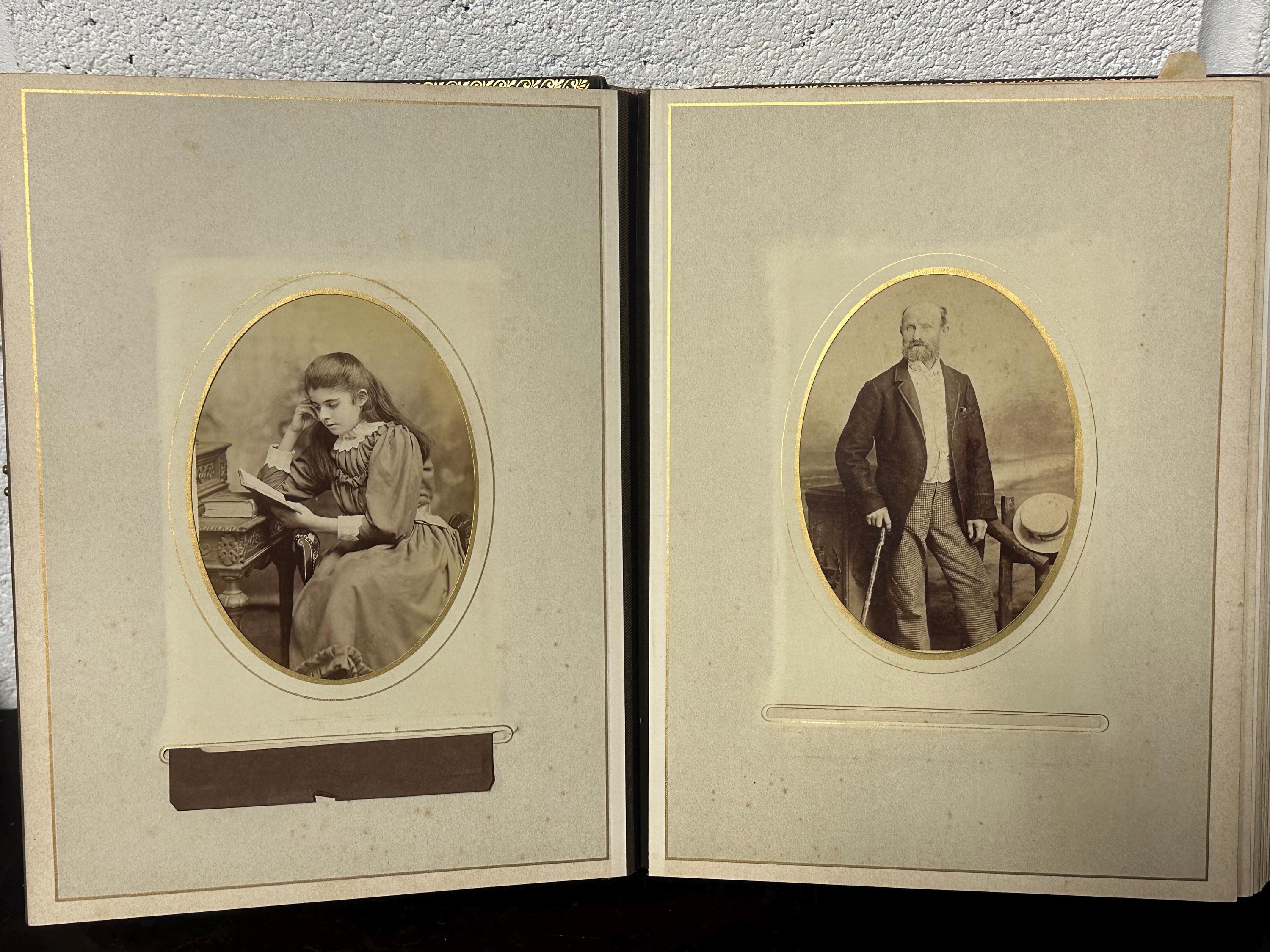 The album contains approx 49 original photographs, dating to the Victorian and Edwardian period, showing a variety of formal studio portraits and candid images. Subjects include men, women and children, dressed in period attire typical of the late 19th and early 20th centuries. Many of the boards are framed by vibrant floral decoration, typical of quality albums of this era.