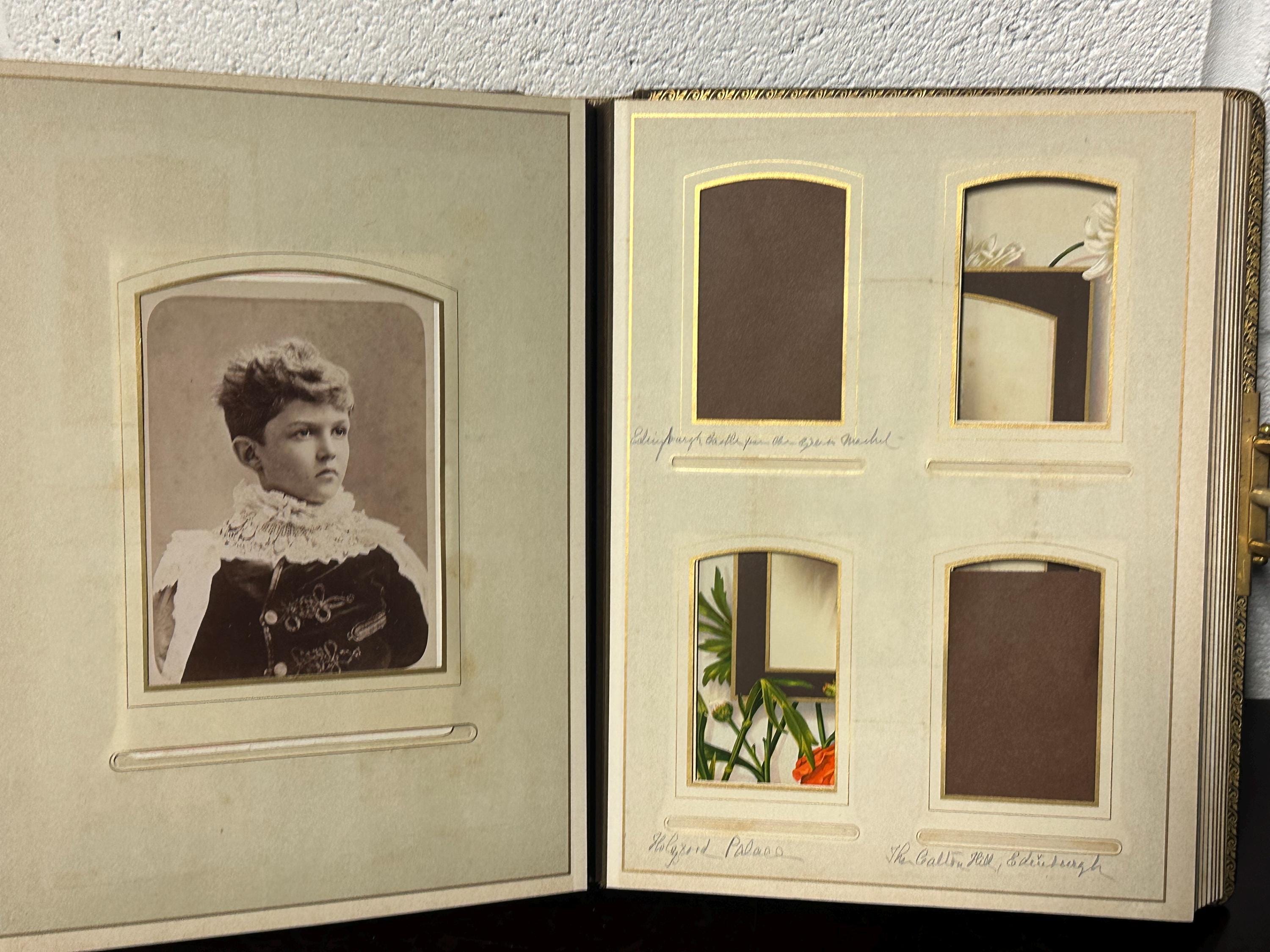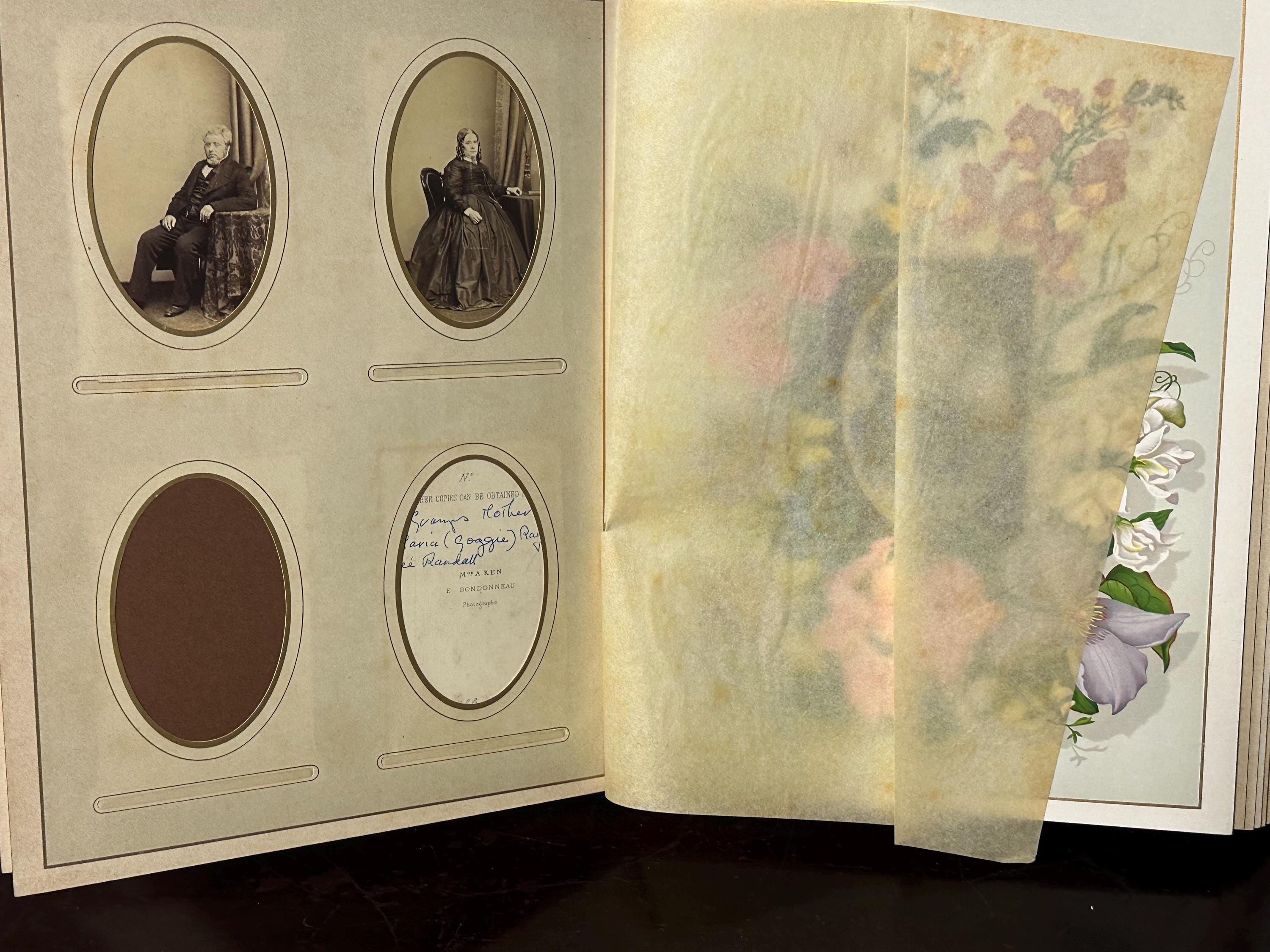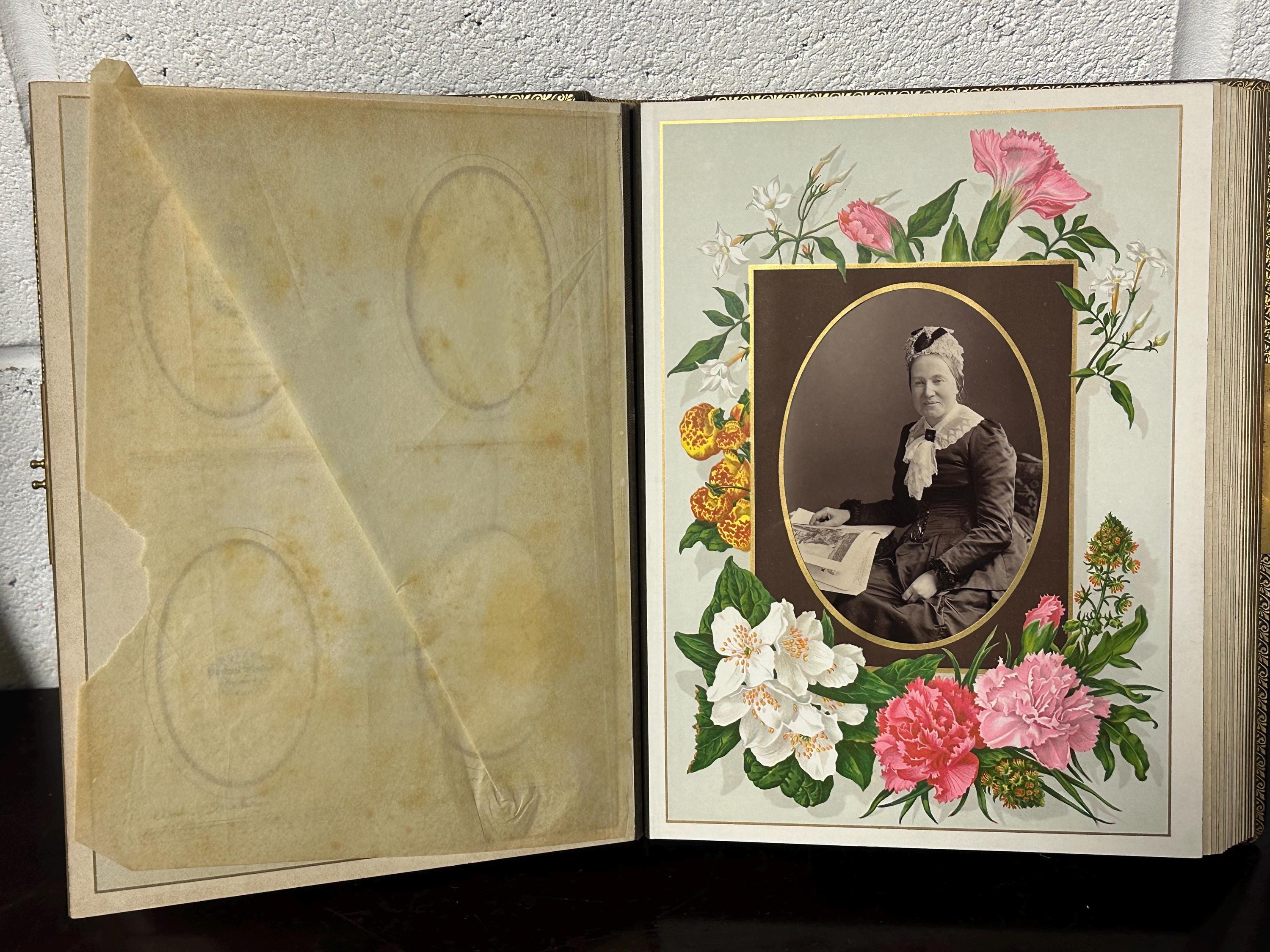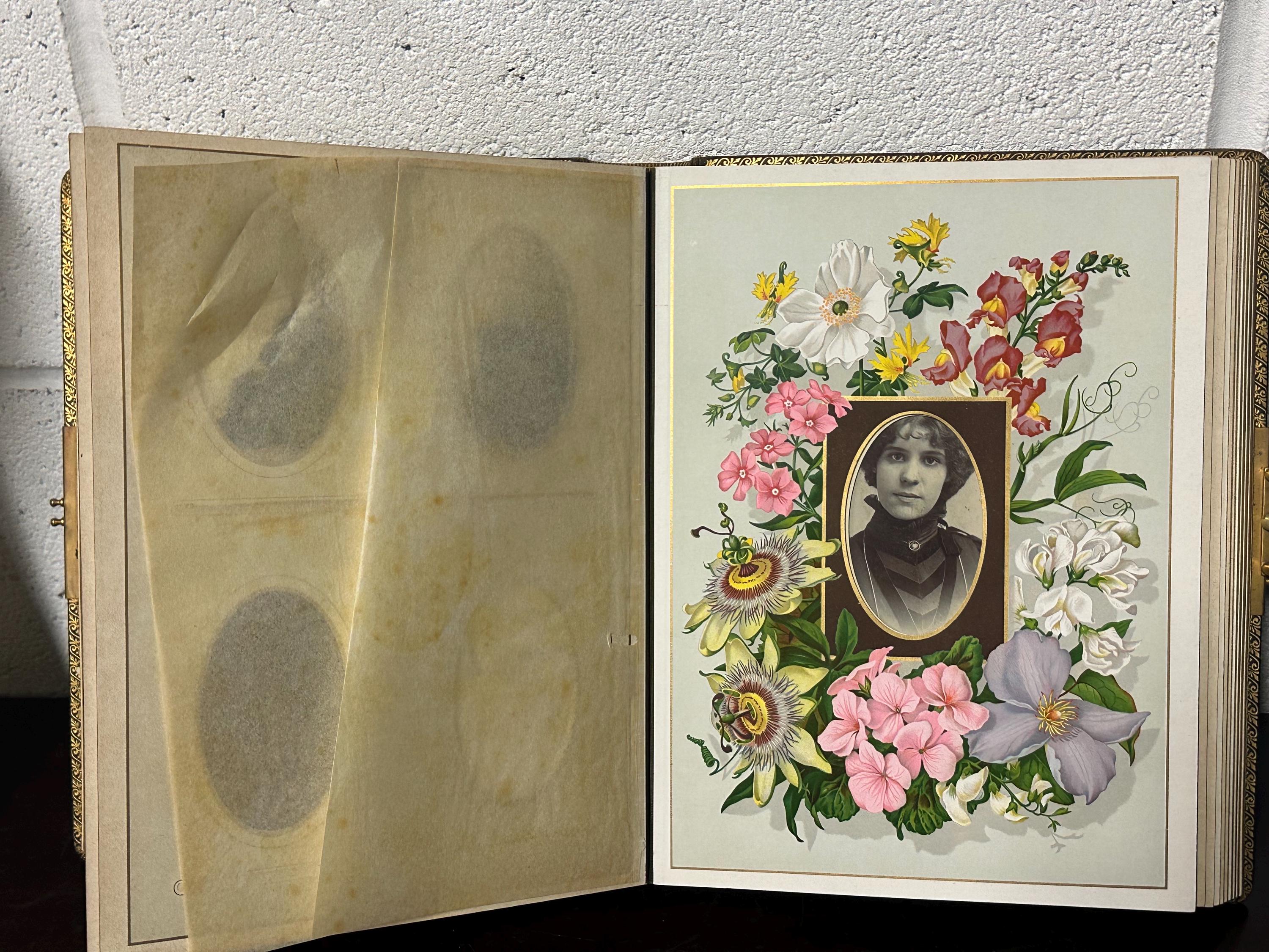 A charming and substantial late Victorian to Edwardian photograph album, beautifully bound in dark leather with gilt decorative tooling to the spine. The album retains its original ornate floral chromolithographed pages, a particularly attractive feature that makes it highly decorative even when closed or displayed open.