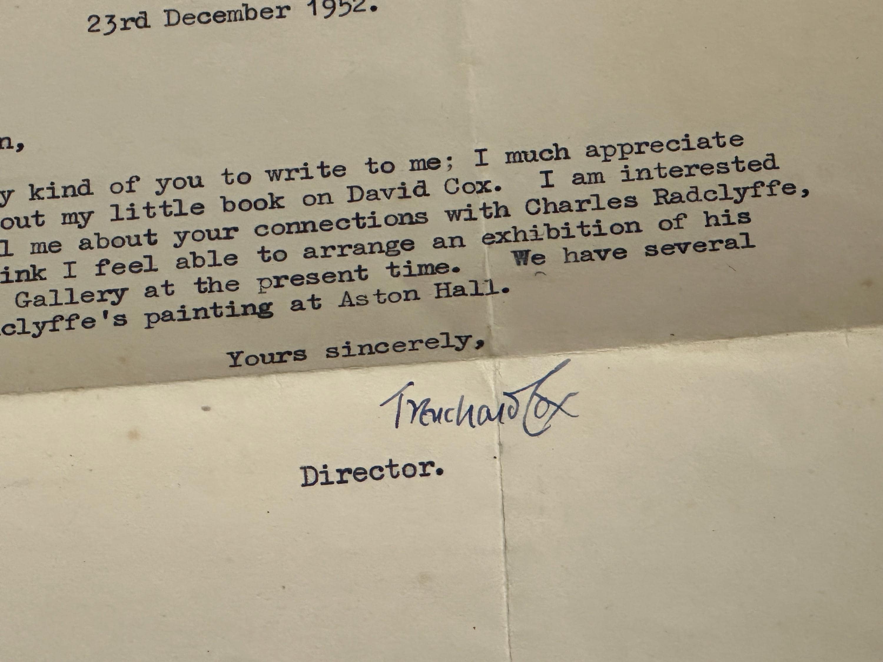 Includes original correspondence from Trenchard Cox who also wrote a book about David Cox and also a handwritten Christmas note loosely inserted as though this was a gift from this person (as shown), adding historical interest and provenance