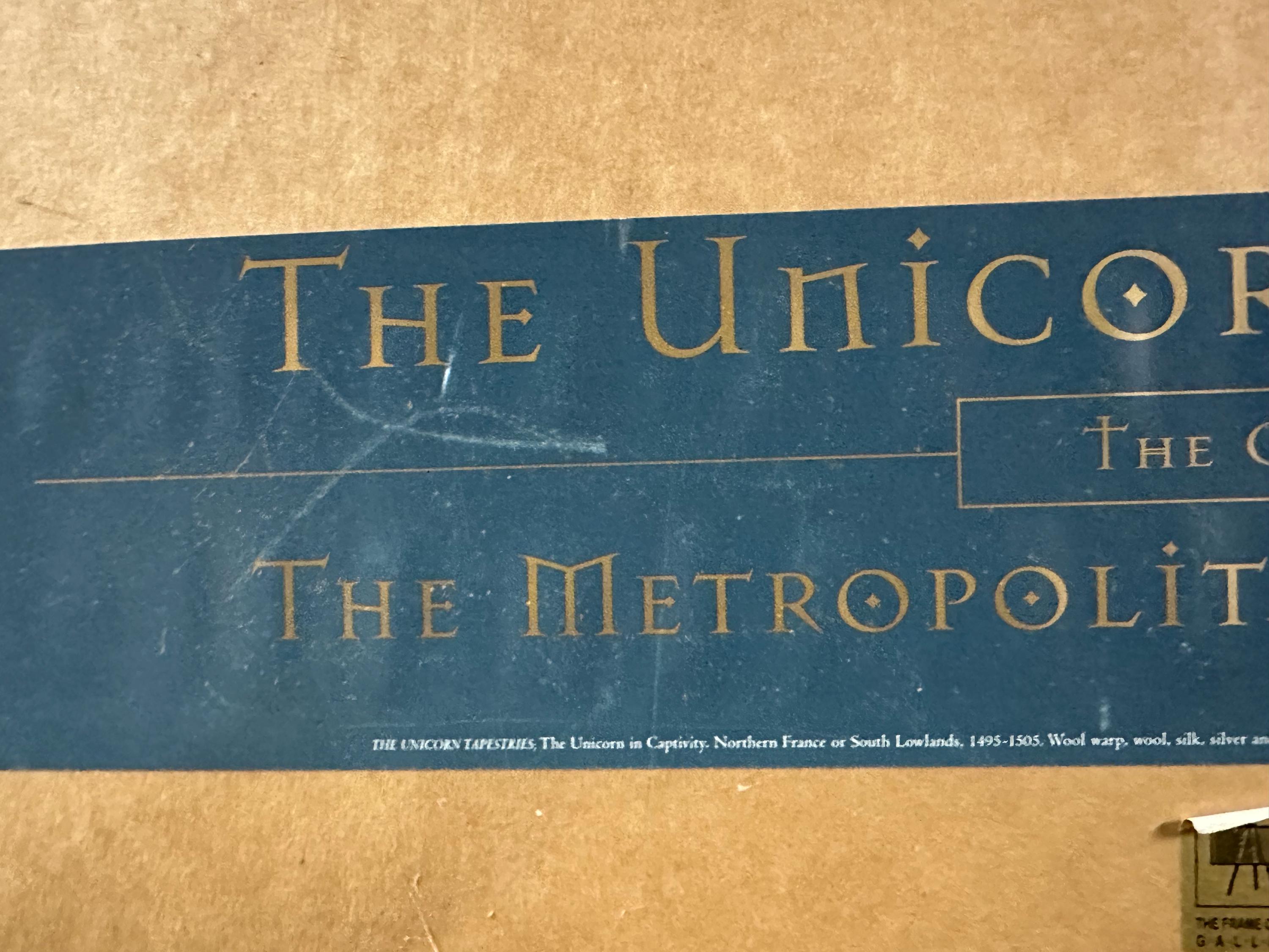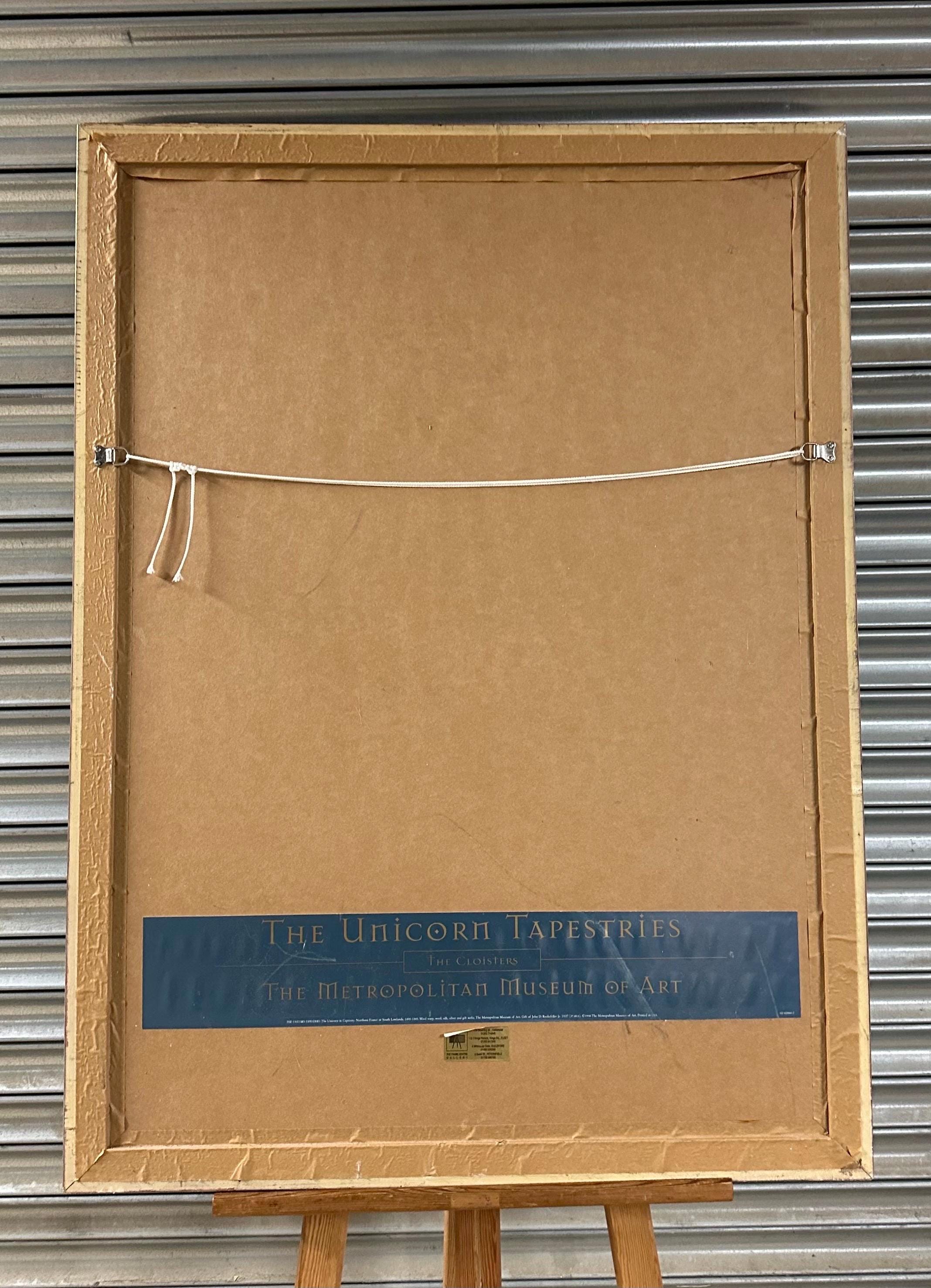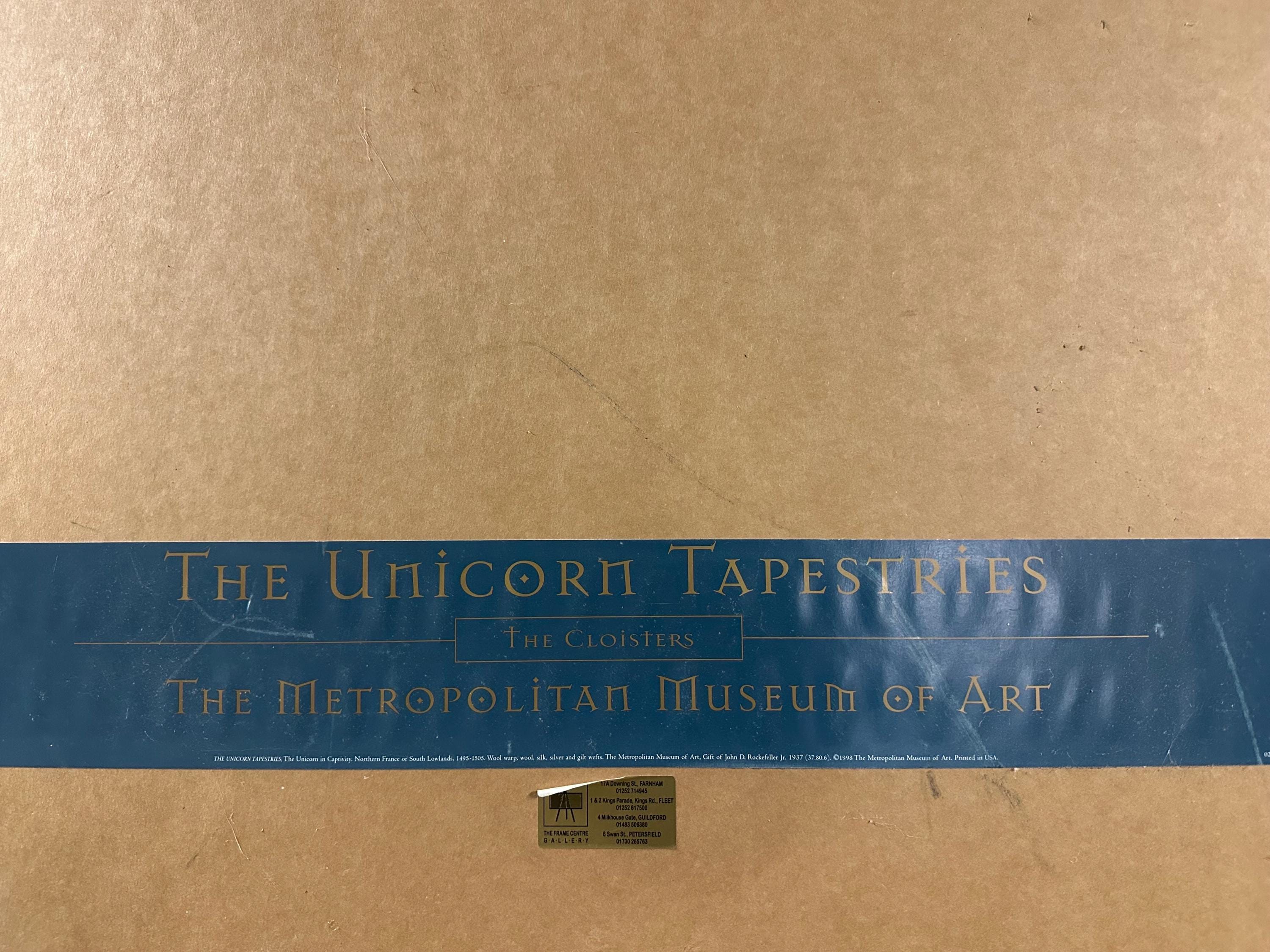 This example is an official 1998 print poster published by the Metropolitan Museum, faithfully reproducing the famous millefleurs (thousand flowers) garden scene with the unicorn enclosed within a circular fence—an enduring symbol of purity, love, and mysticism in medieval art.