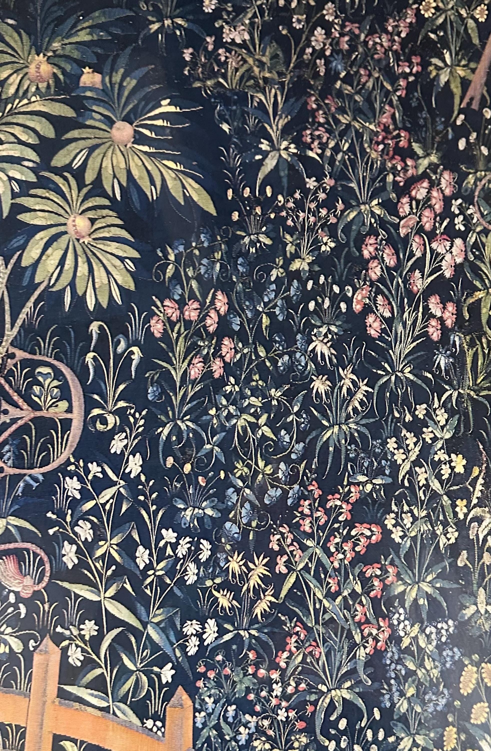 “The Unicorn Rests in a Garden" may have been created as a single image rather than part of a series. In this instance, the unicorn probably represents the beloved tamed. He is tethered to a tree and constrained by a fence, but the chain is not secure and the fence is low enough to leap over: The unicorn could escape if he wished. Clearly, however, his confinement is a happy one, to which the ripe, seed-laden pomegranates in the tree—a medieval symbol of fertility and marriage—testify. The red stains on his flank do not appear to be blood, as there are no visible wounds like those in the hunting series; rather, they represent juice dripping from bursting pomegranates above. Many of the other plants represented here, such as wild orchid, bistort, and thistle, echo this theme of marriage and procreation: they were acclaimed in the Middle Ages as fertility aids for both men and women. Even the little frog, nestled among the violets at the lower right, was cited by medieval writers for its noisy mating.