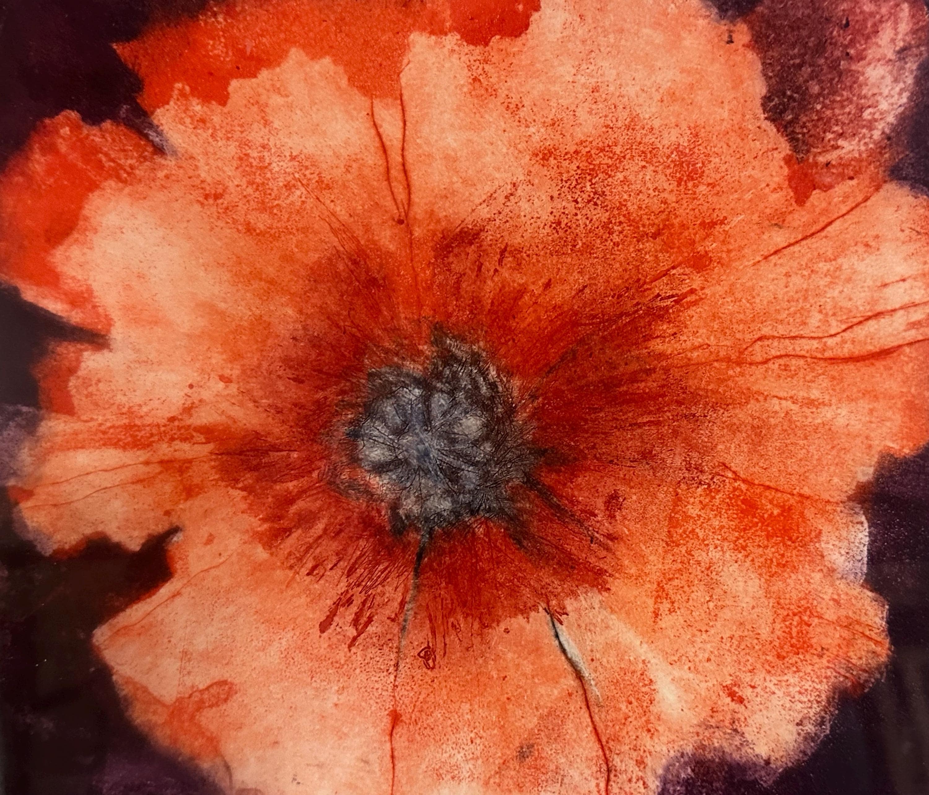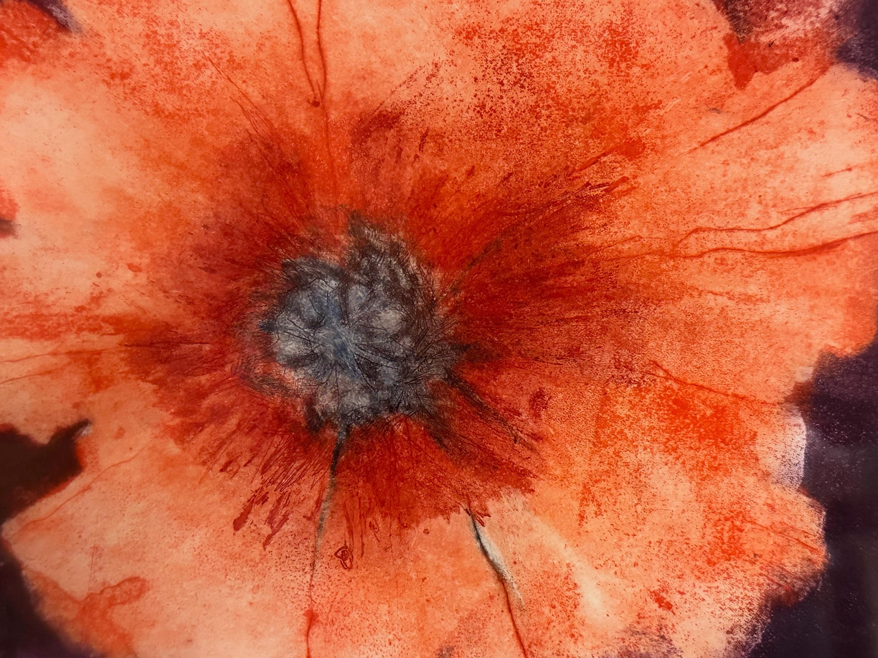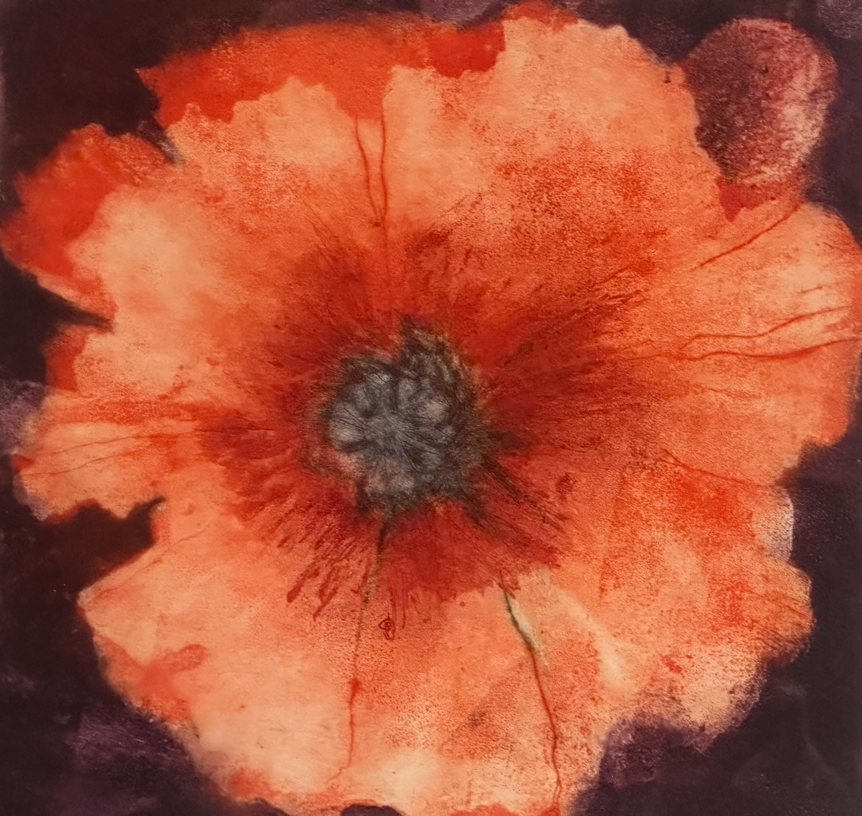 A striking contemporary original etching by Felise Dumas, titled “Poppy, Blowup I”. This bold, close-up floral composition captures the dramatic intensity of a single poppy in full bloom, rendered in rich red-orange tones against a dark, atmospheric background.