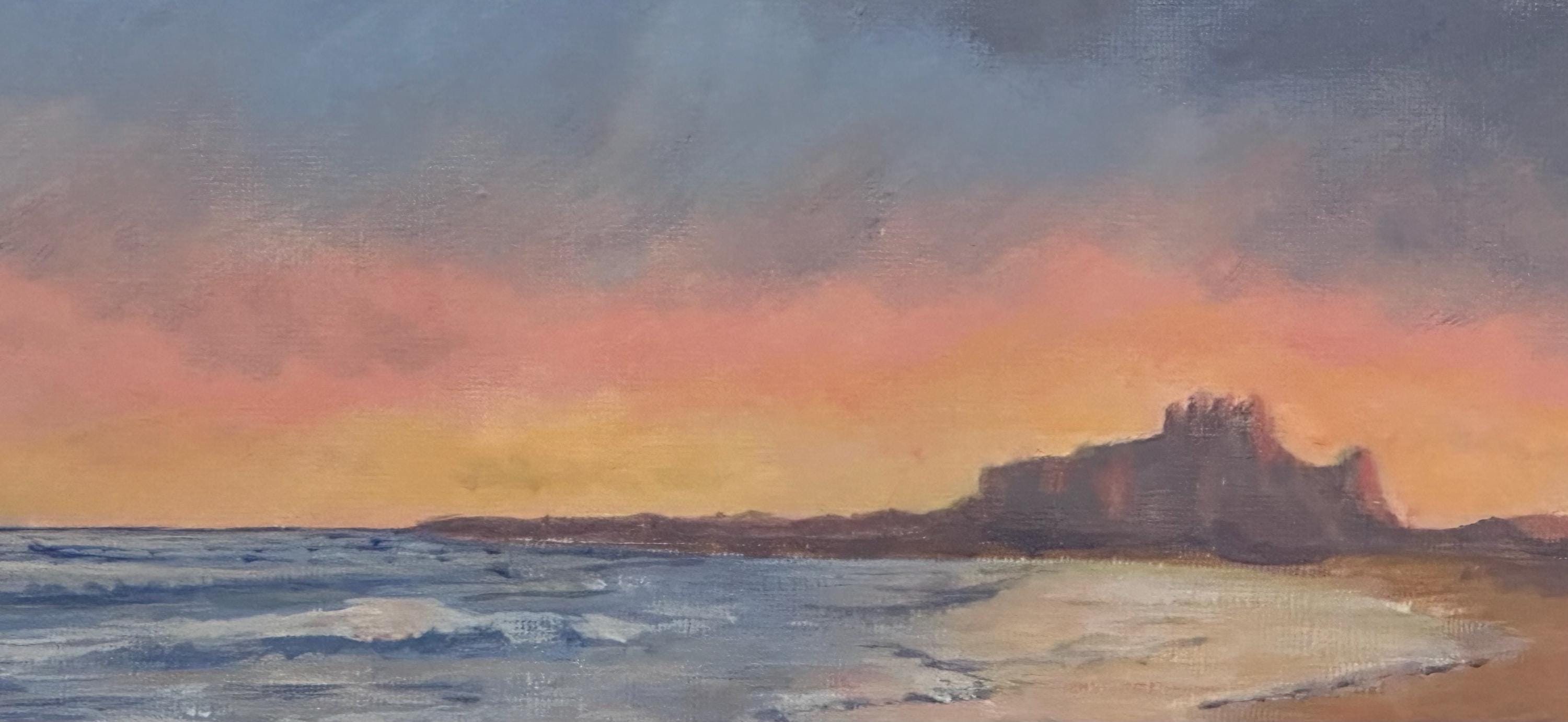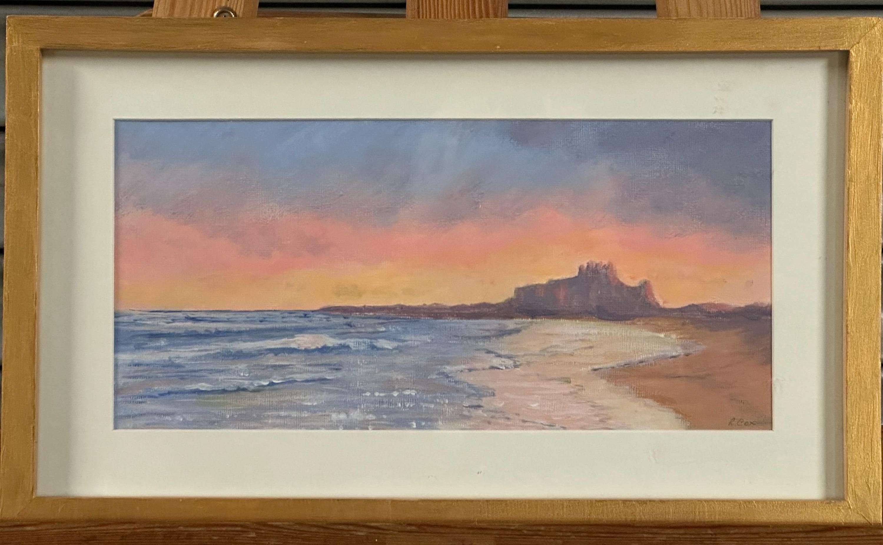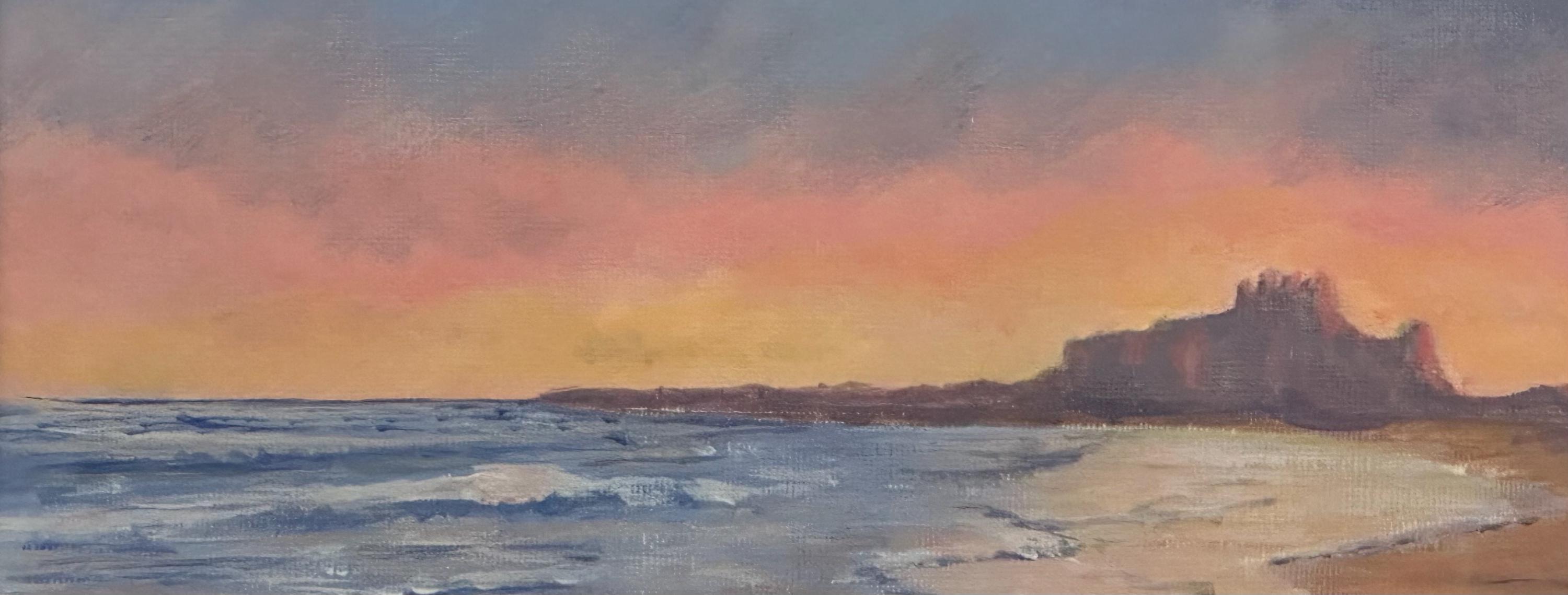 A beautifully atmospheric original acrylic painting depicting Bamburgh Castle, Northumberland, captured at dusk under a glowing Northumbrian sky. Titled Northumbrian Evening, this work by Ruth Cox conveys the calm and majesty of the coastline as soft waves meet the shore and the castle rises silhouetted against warm sunset tones.