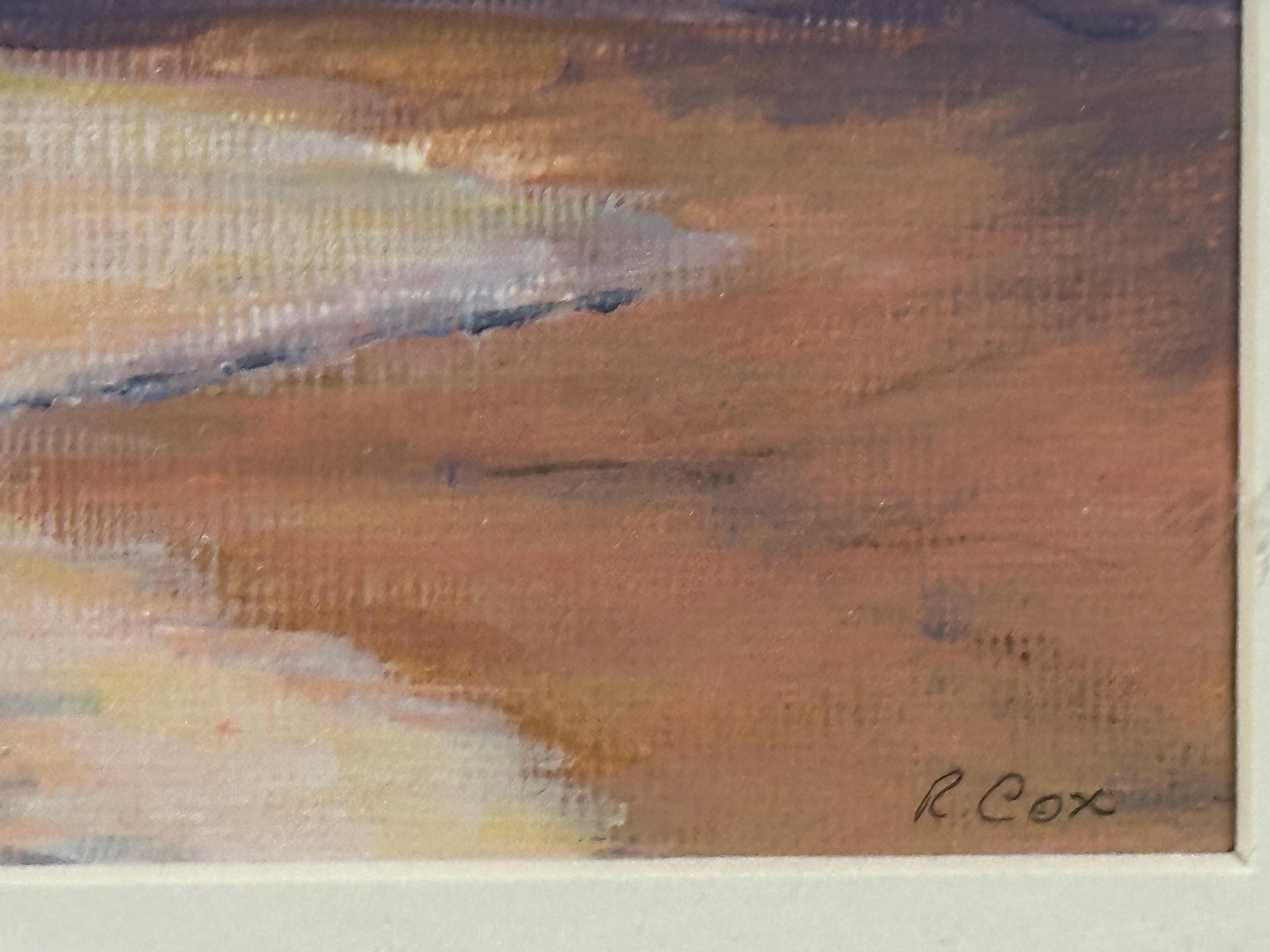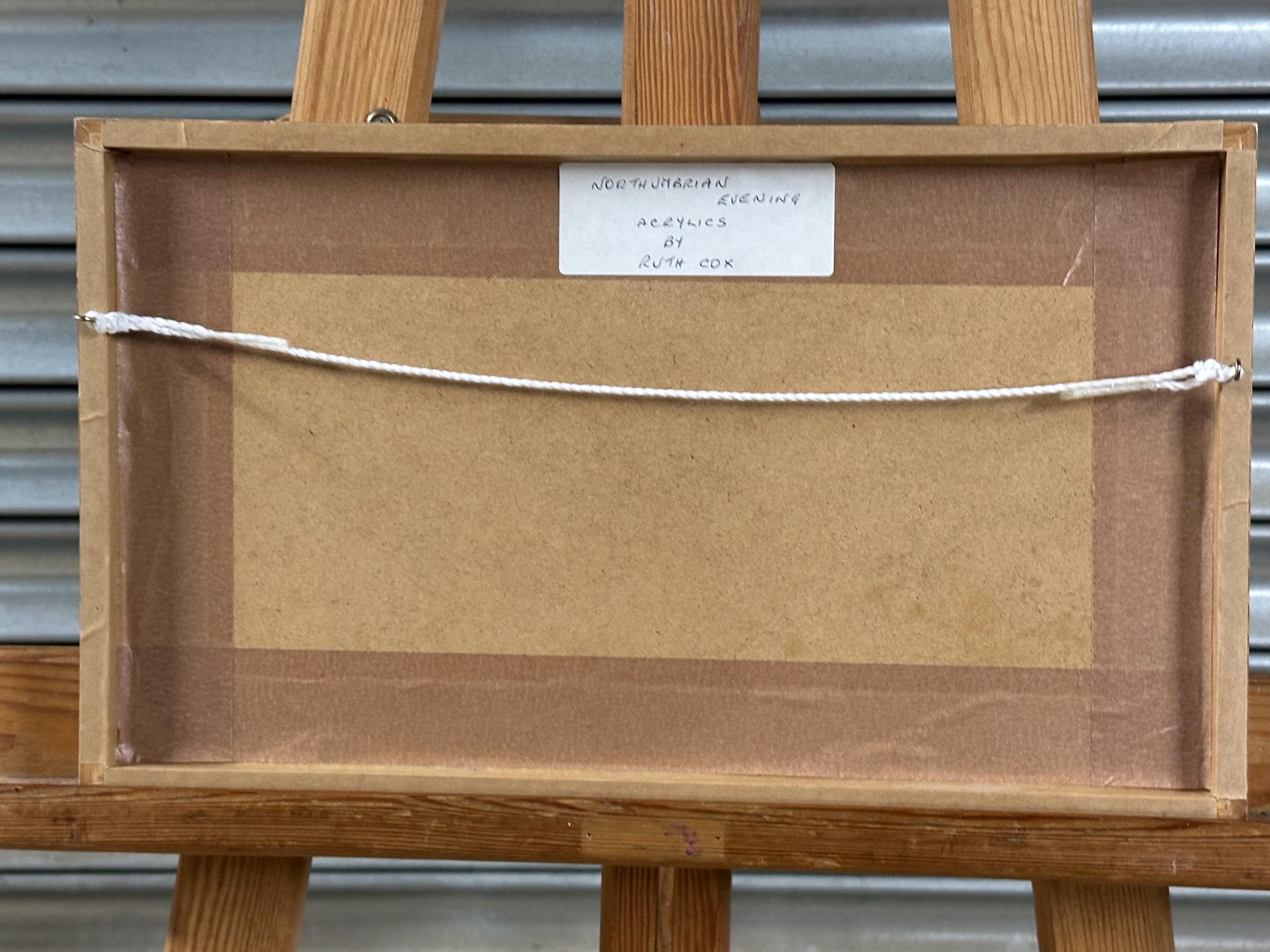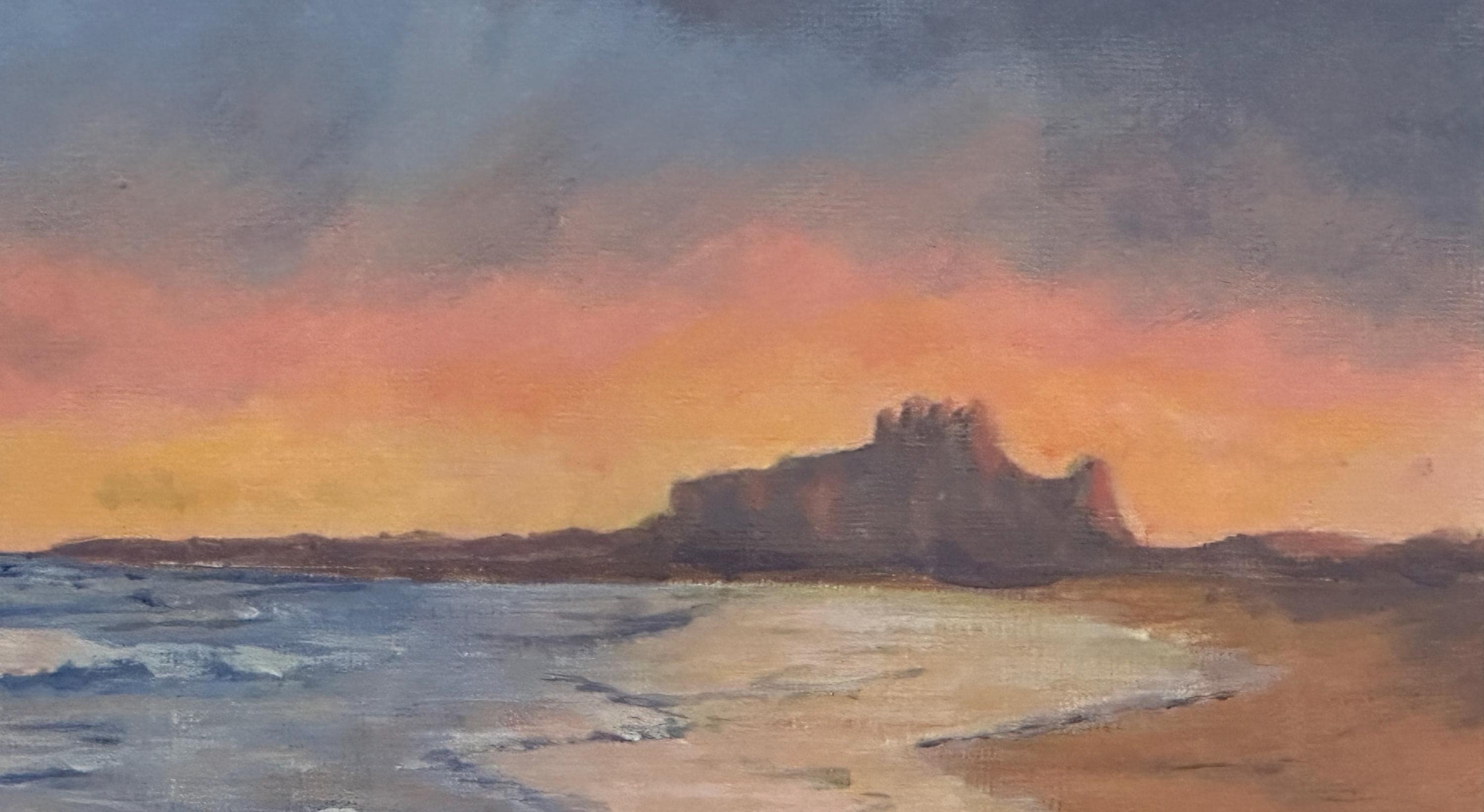 A beautifully atmospheric original acrylic painting depicting Bamburgh Castle, Northumberland, captured at dusk under a glowing Northumbrian sky. Titled Northumbrian Evening, this work by Ruth Cox conveys the calm and majesty of the coastline as soft waves meet the shore and the castle rises silhouetted against warm sunset tones.