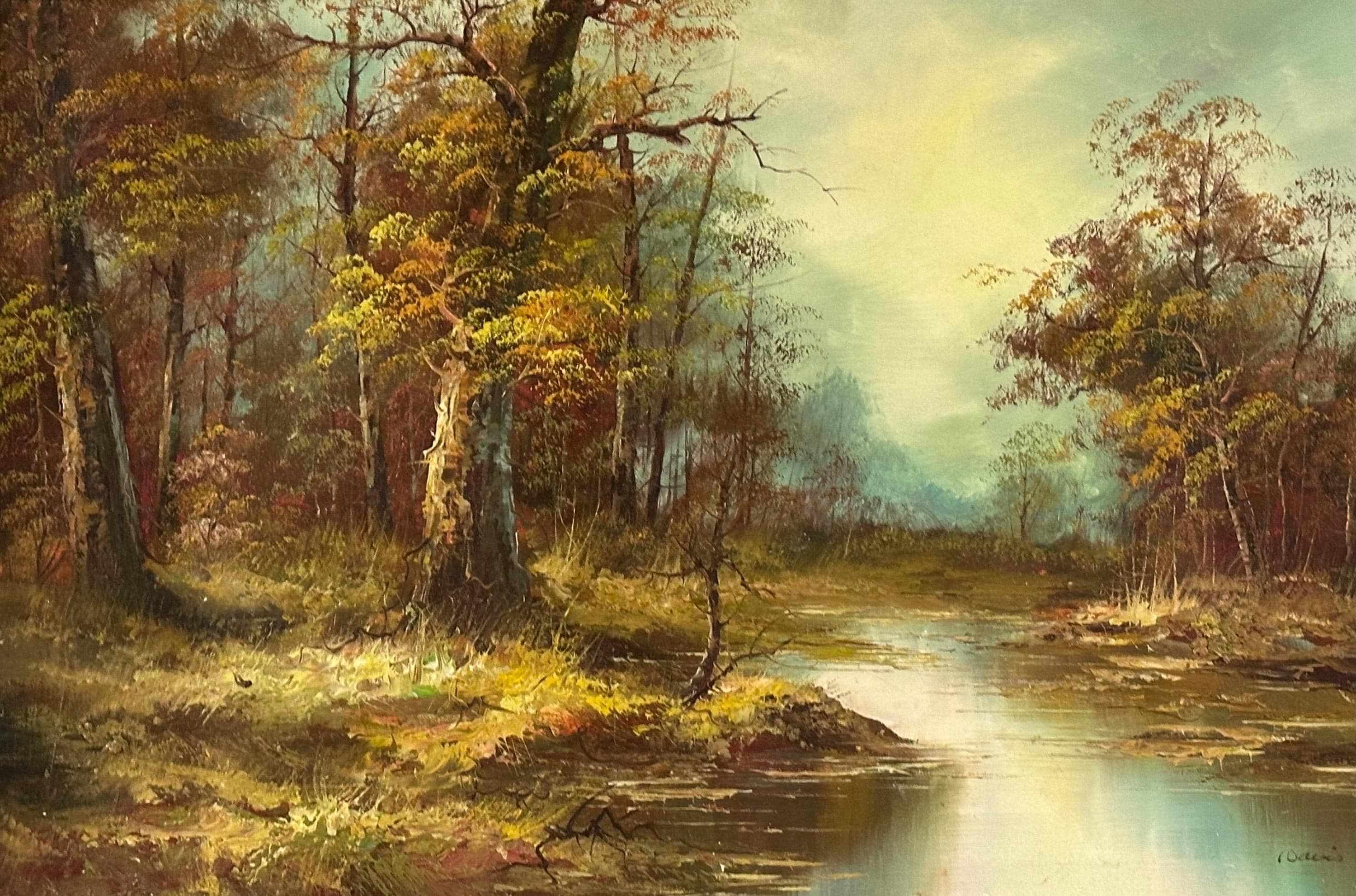 A beautifully executed large oil painting on canvas, depicting a tranquil woodland landscape with a winding river, tall trees and rich autumnal tones. The composition draws the eye gently through the scene, with soft light reflecting on the water and layered foliage creating depth and atmosphere.