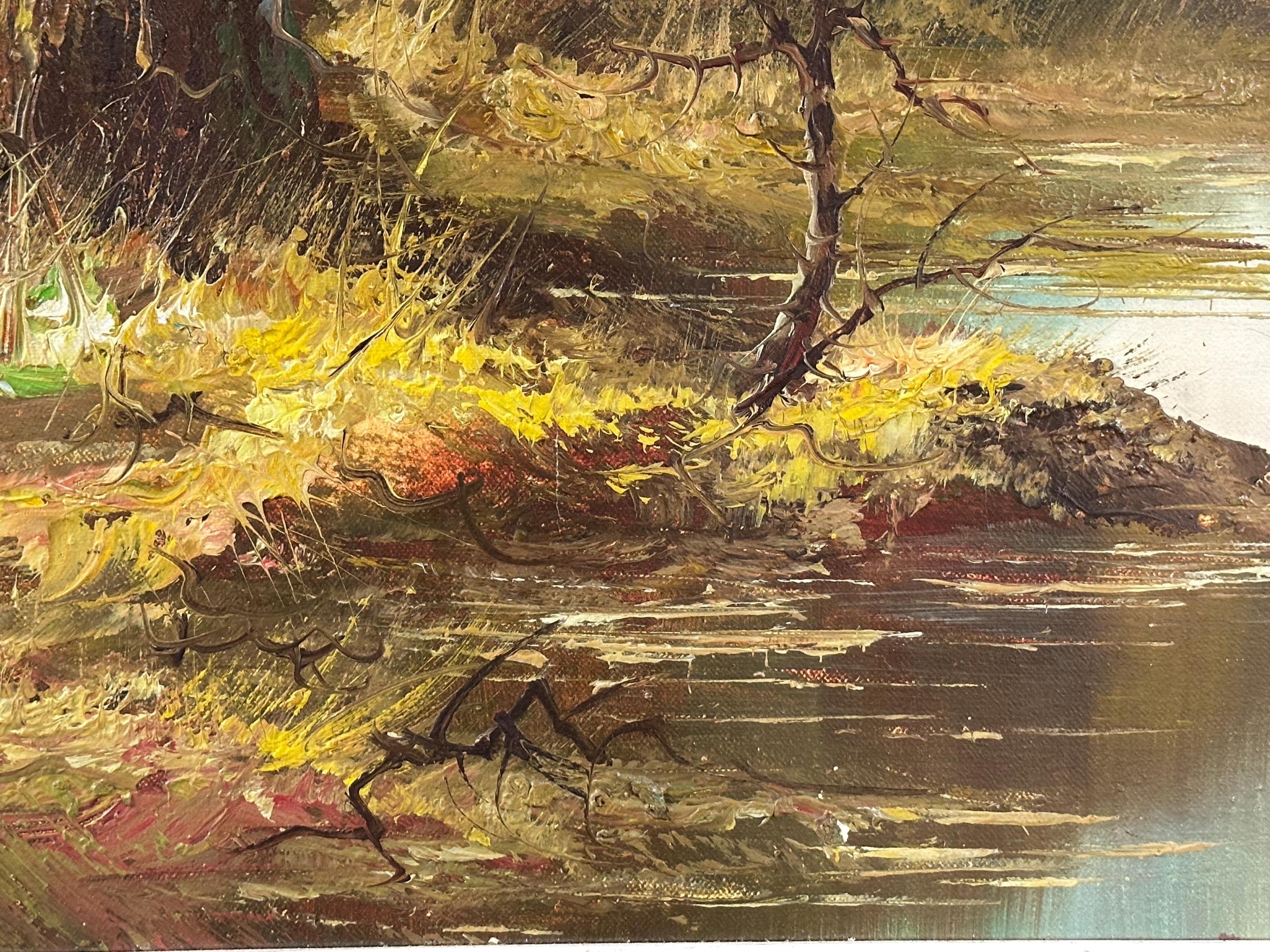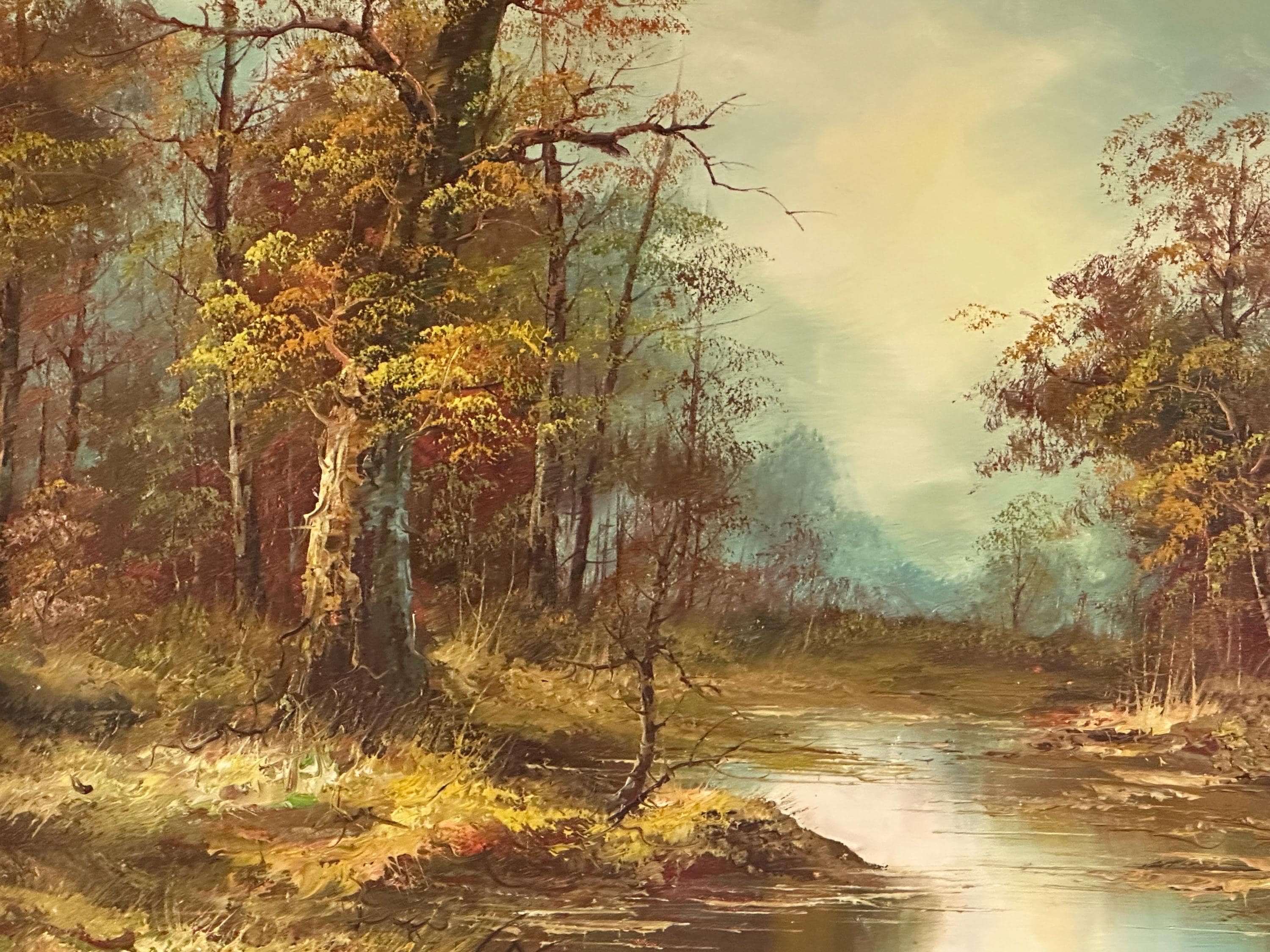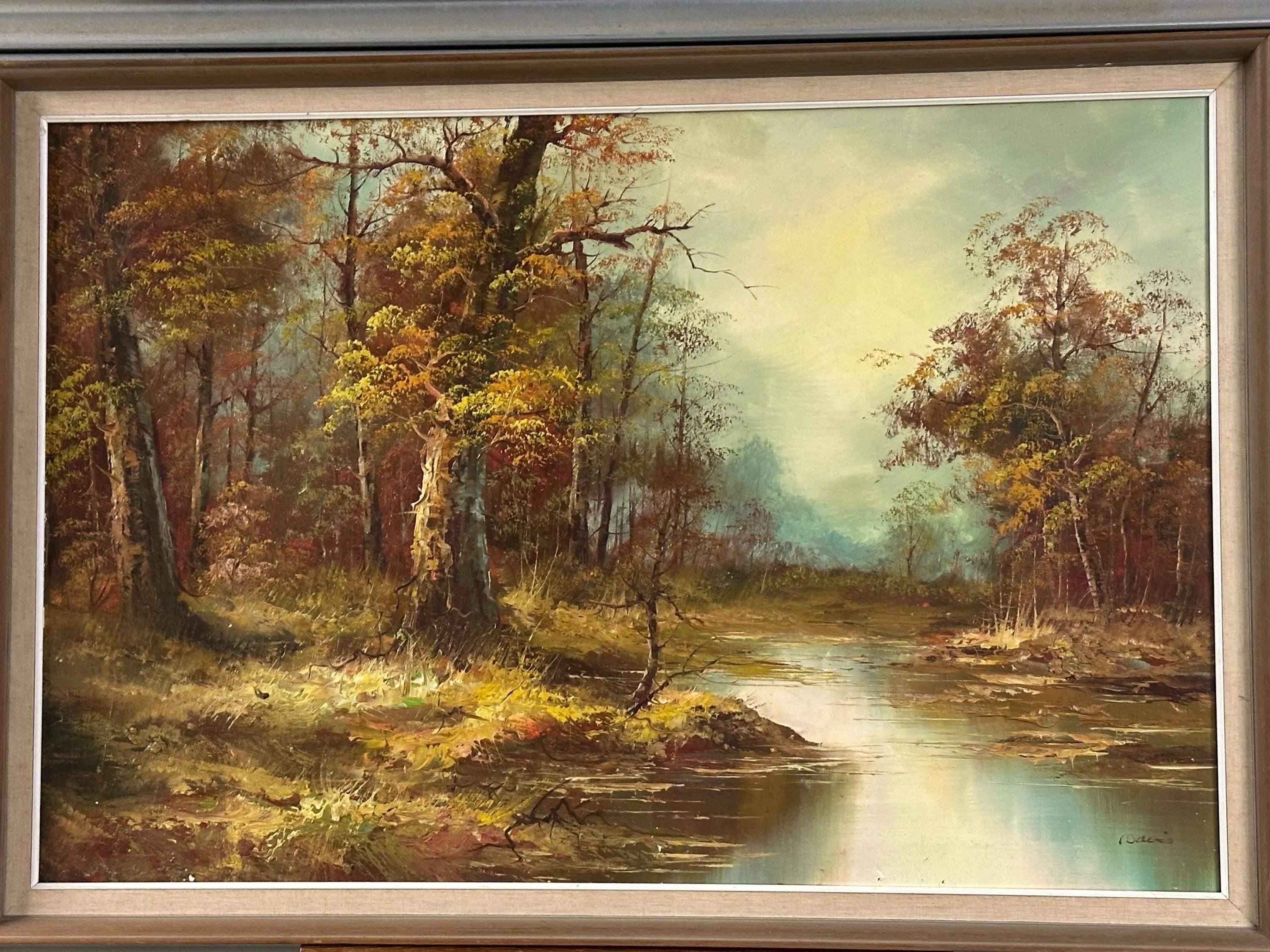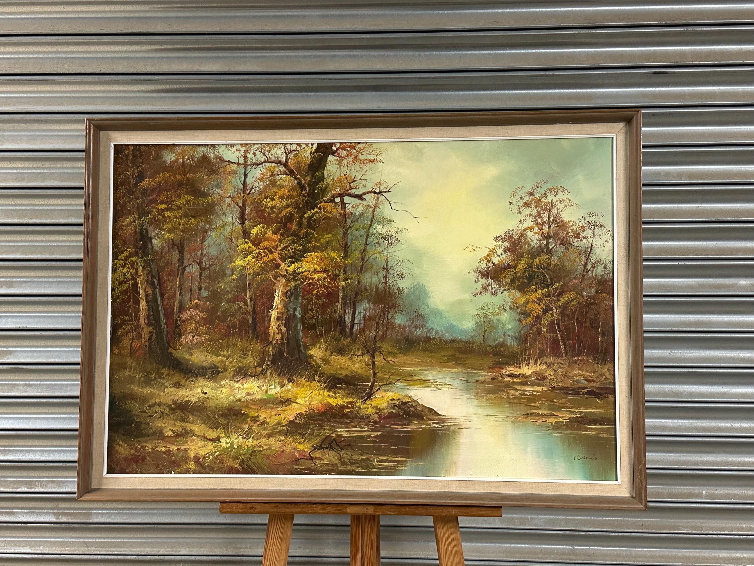 Large Signed Oil Painting on Canvas – Woodland River Landscape – Framed