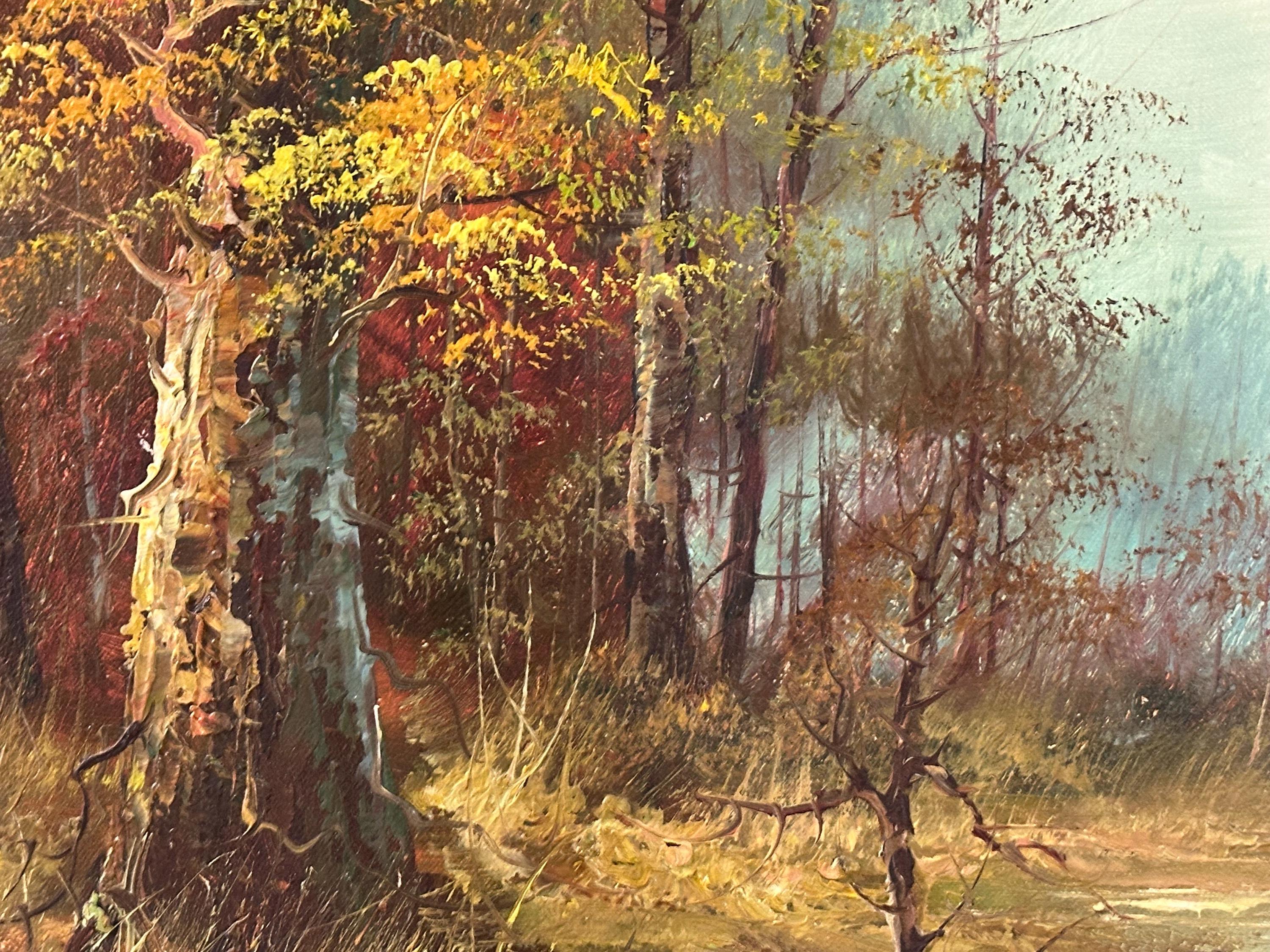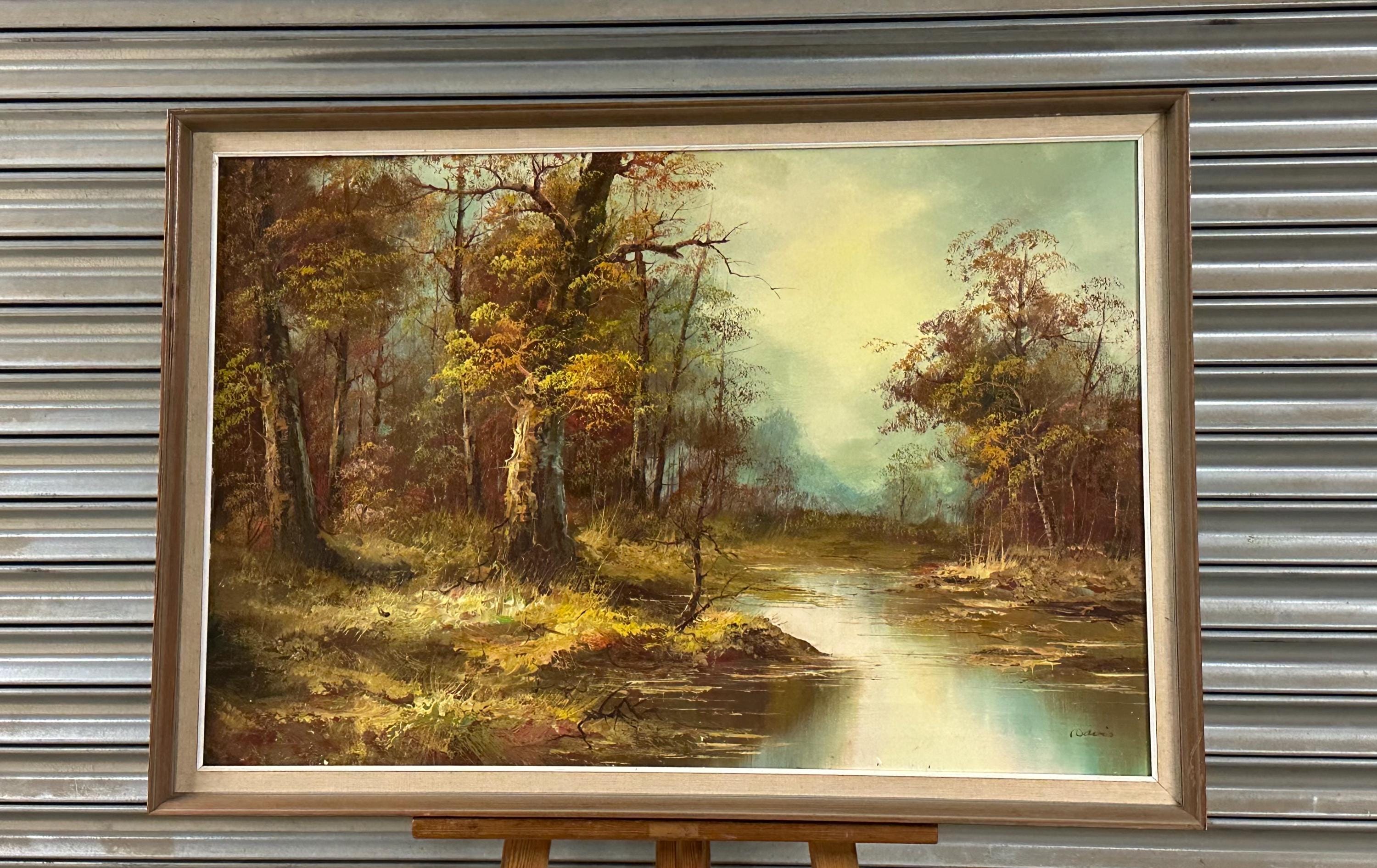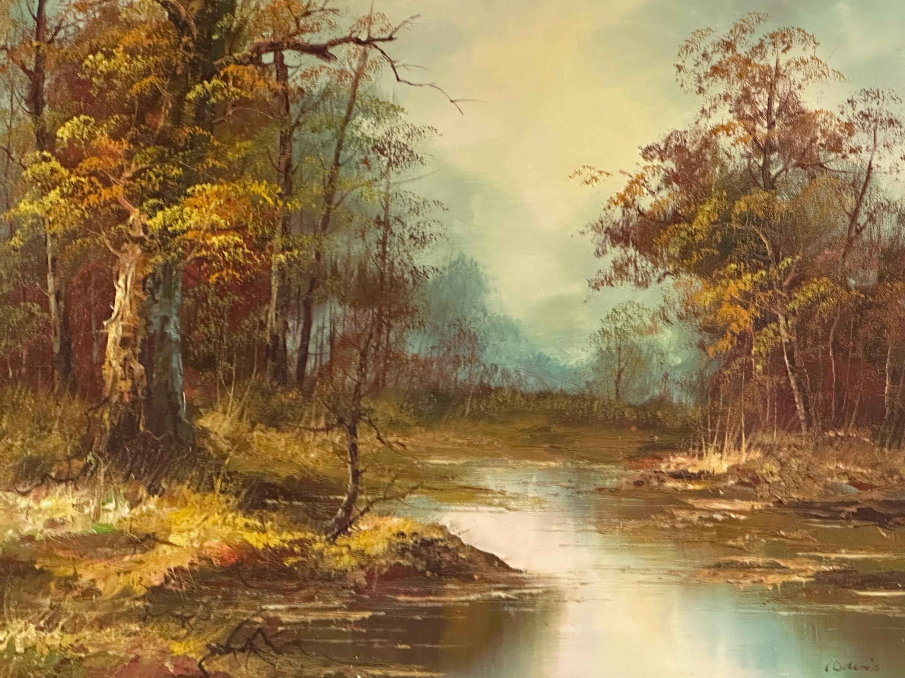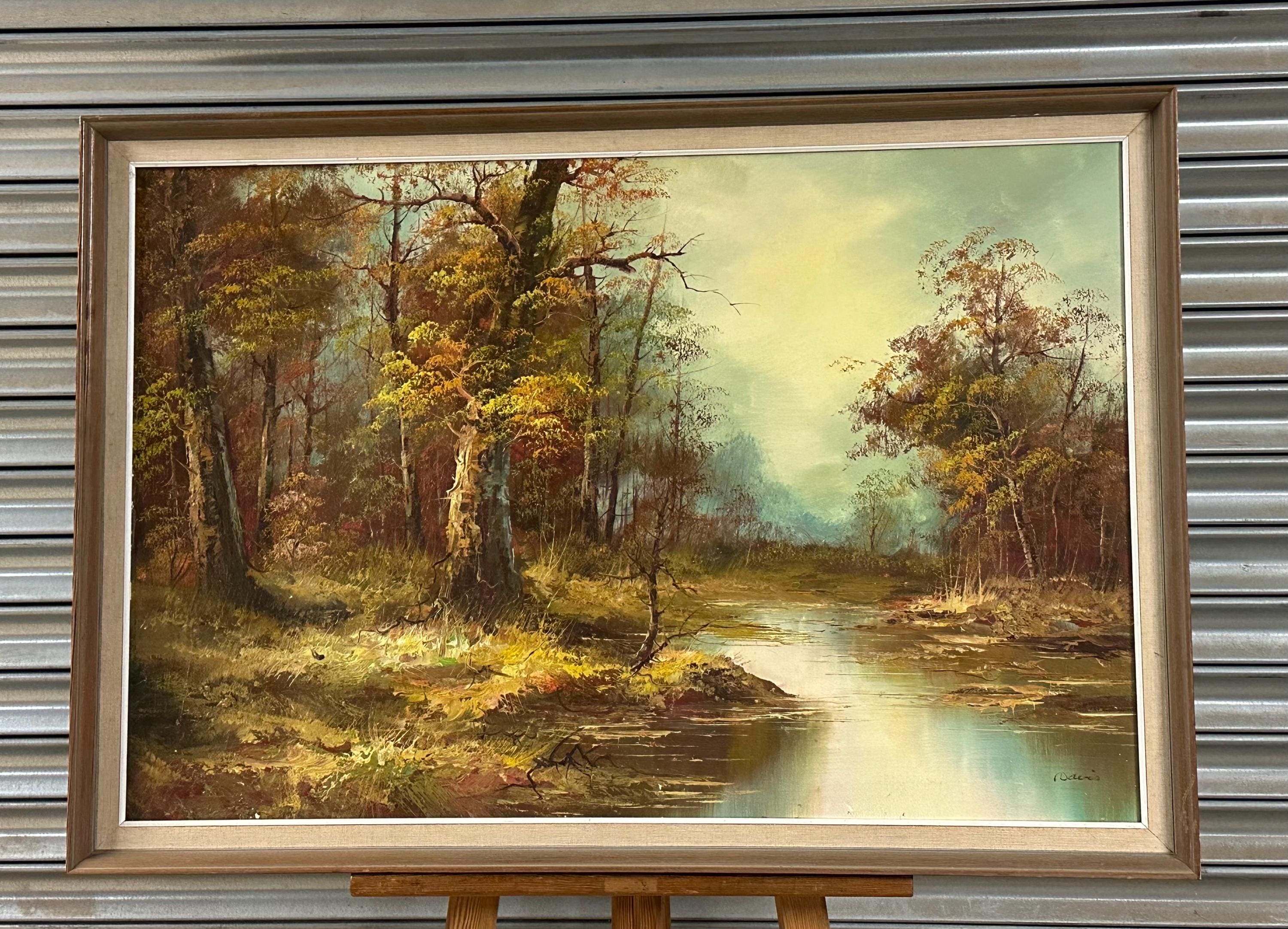 Large Signed Oil Painting on Canvas – Woodland River Landscape – Framed