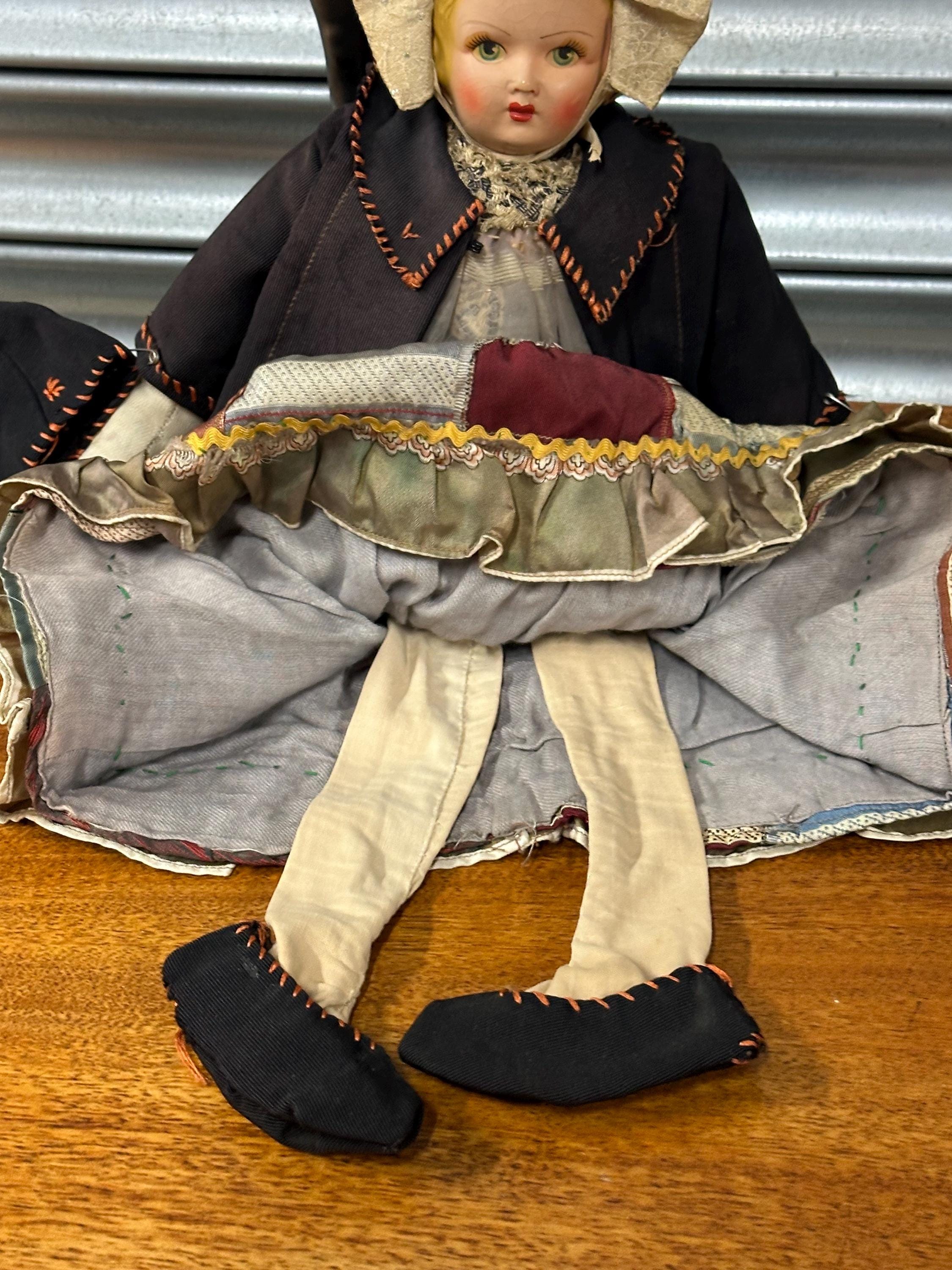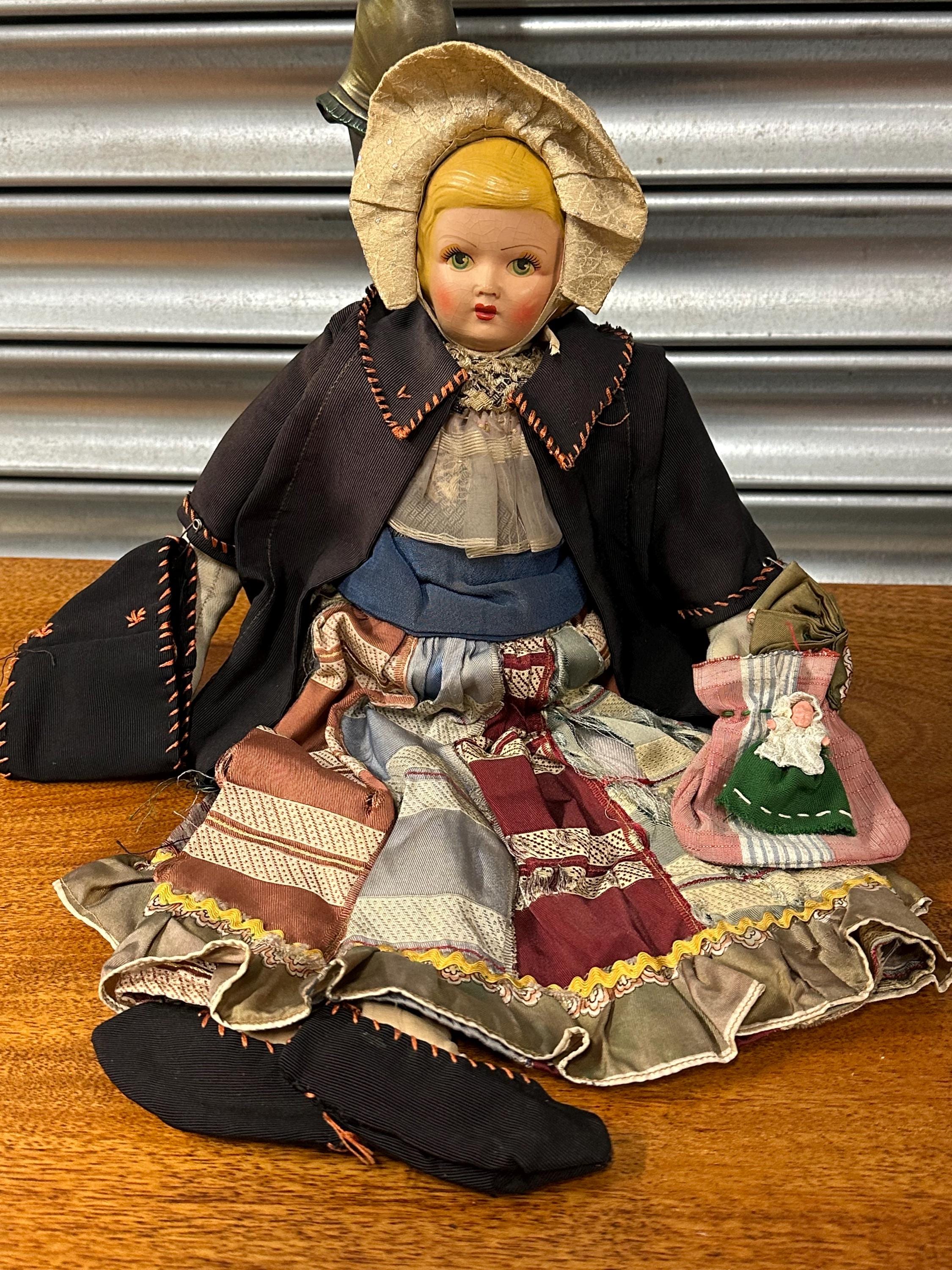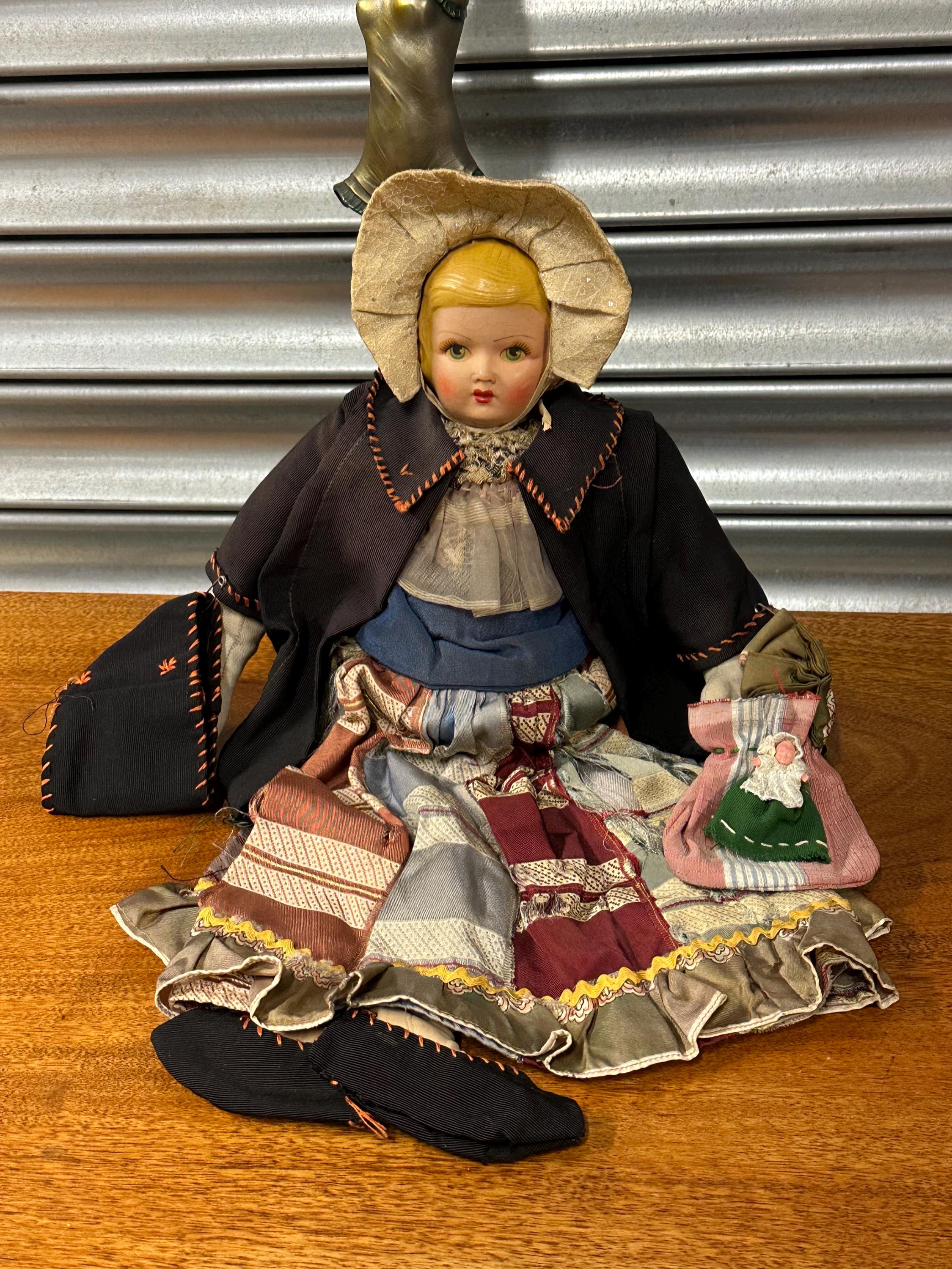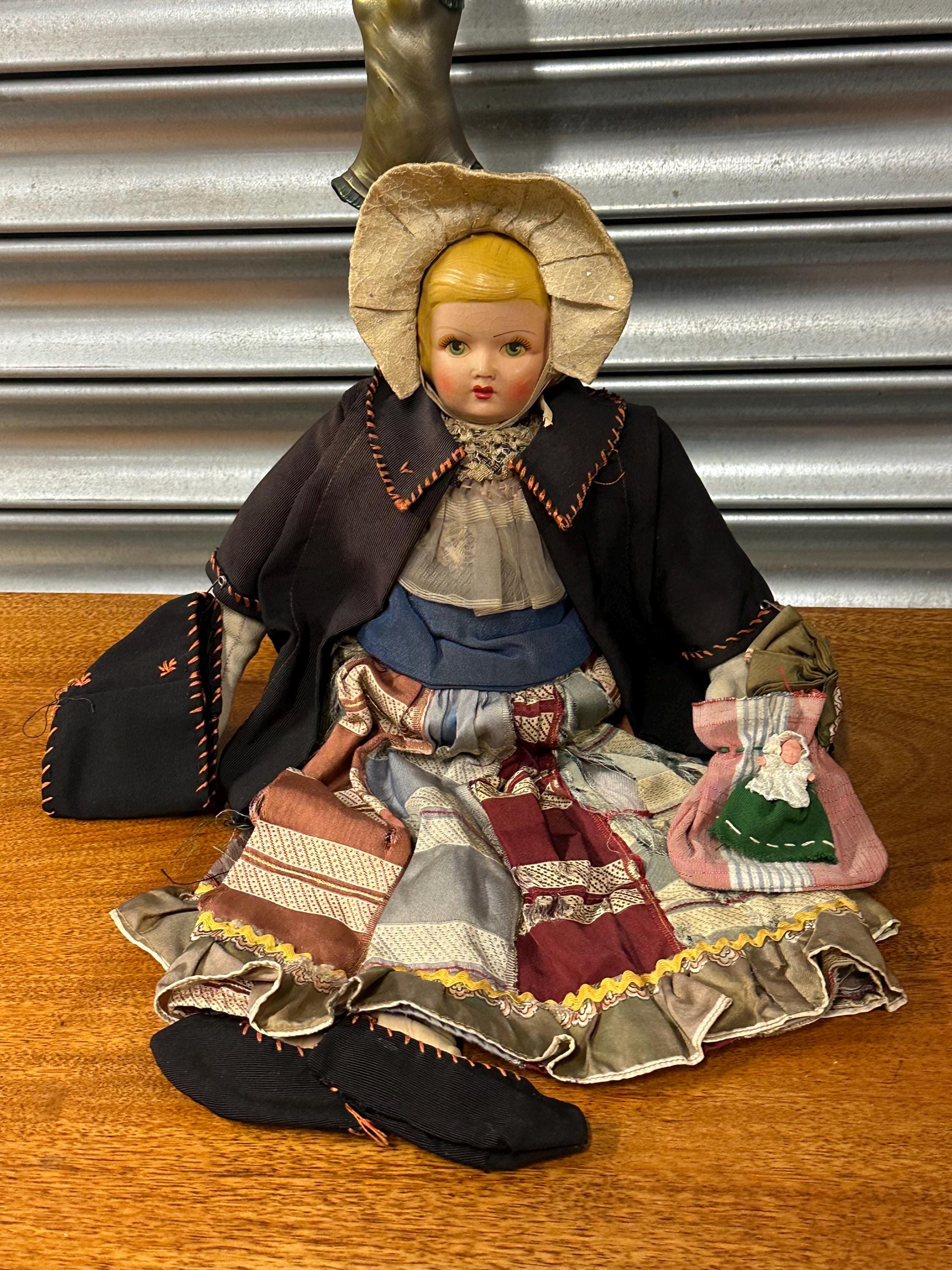 A particularly delightful feature is the miniature handmade doll carried in her fabric bag, adding rarity and extra appeal for collectors of folk art and antique dolls.