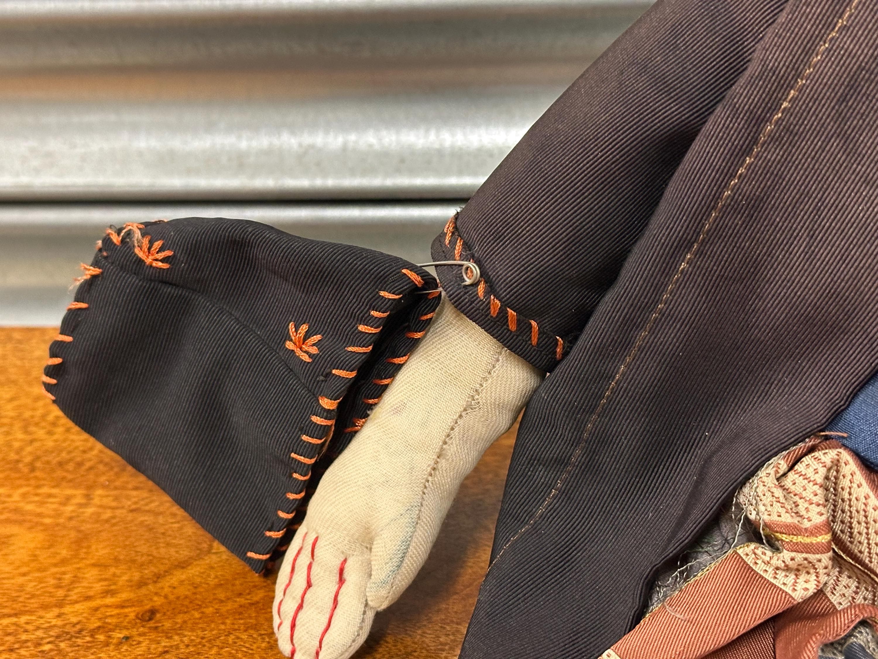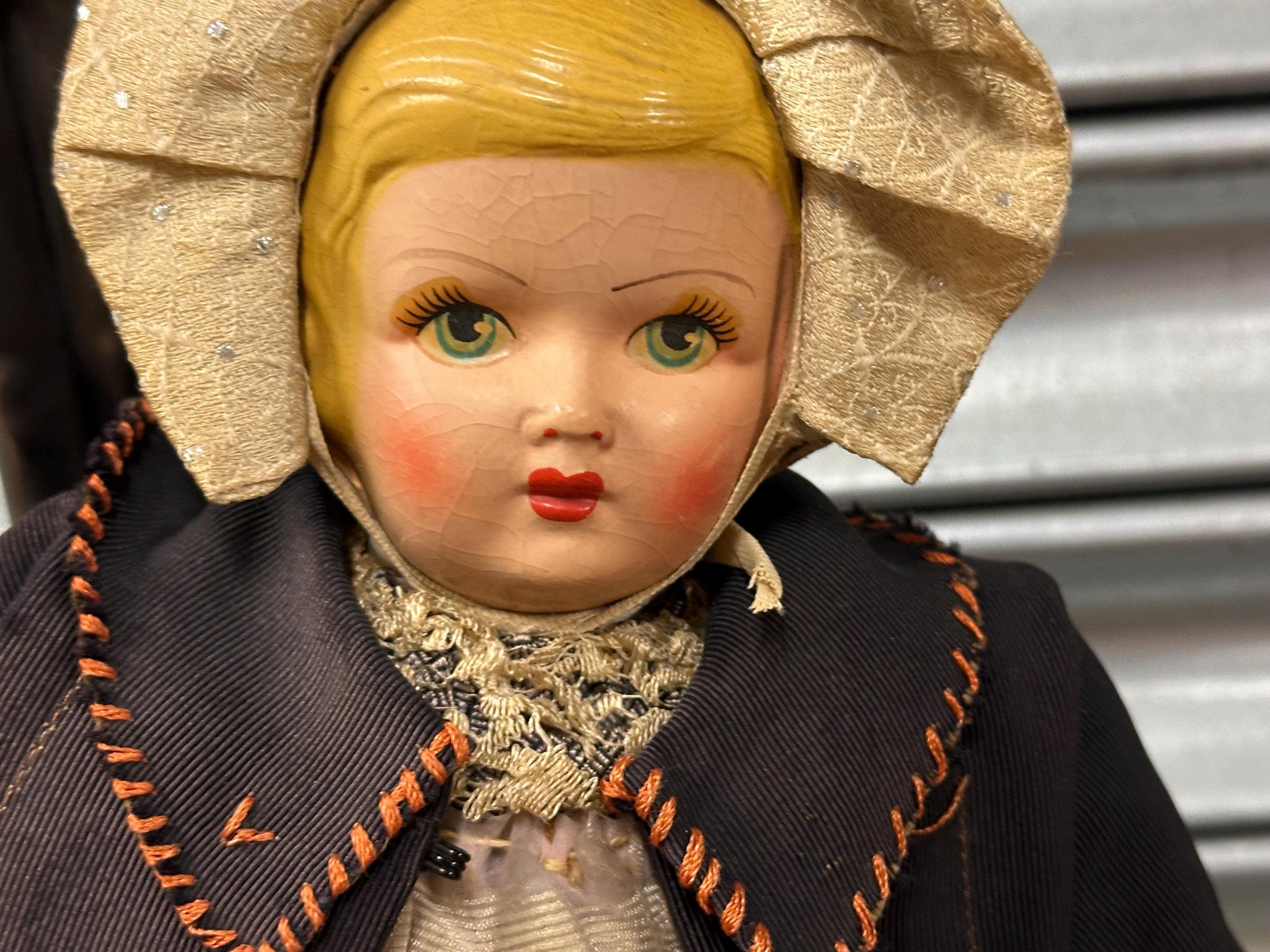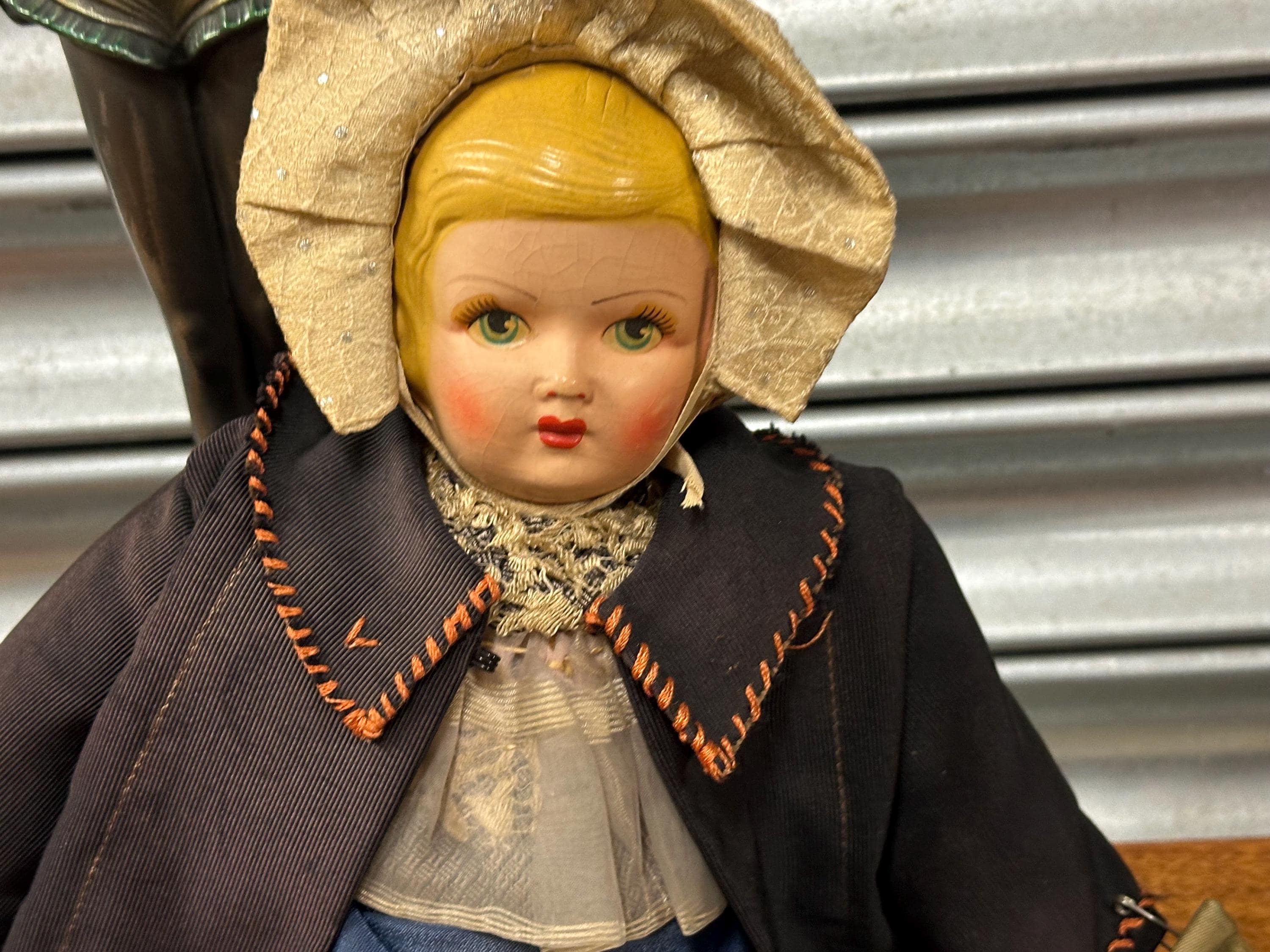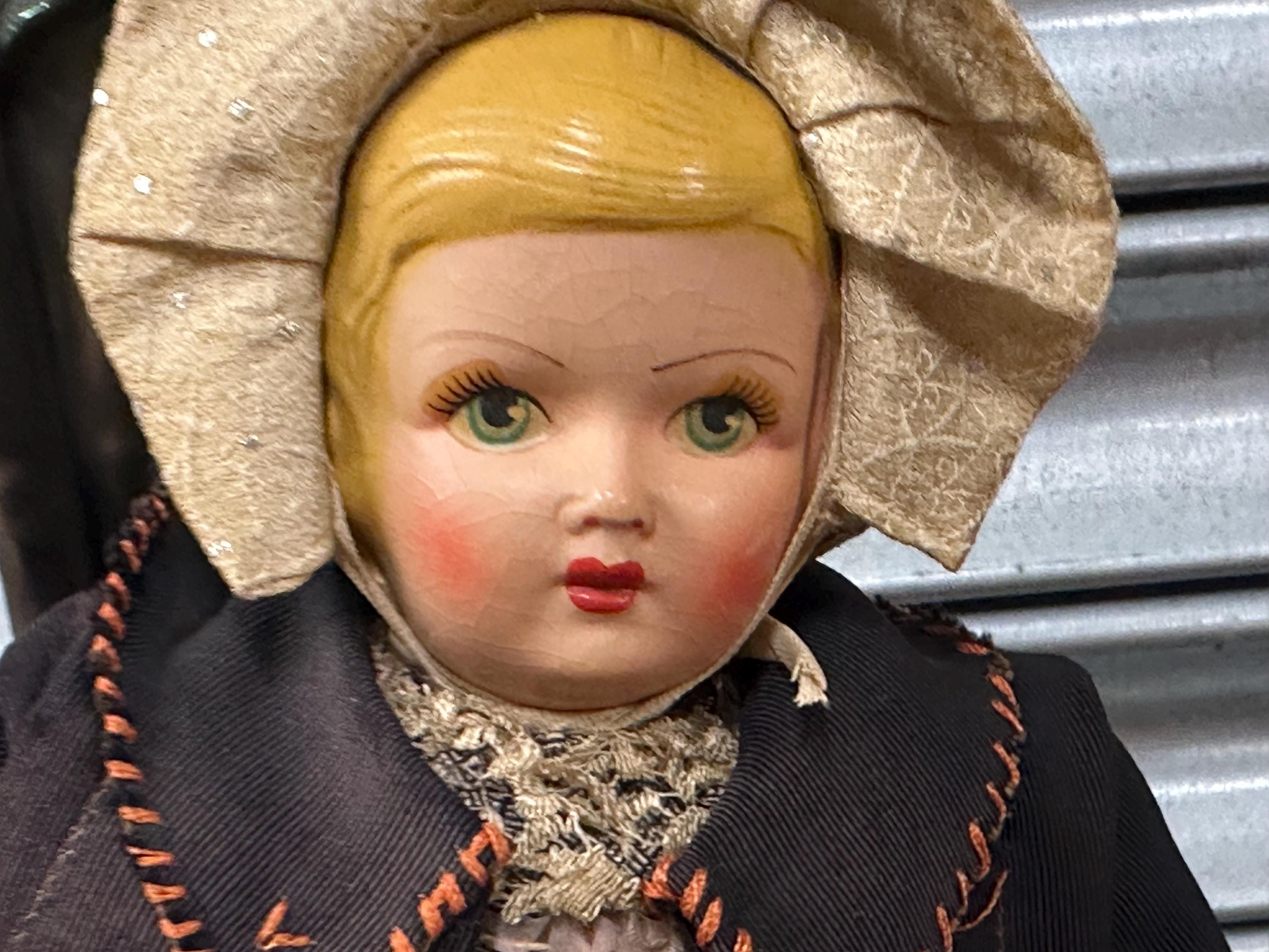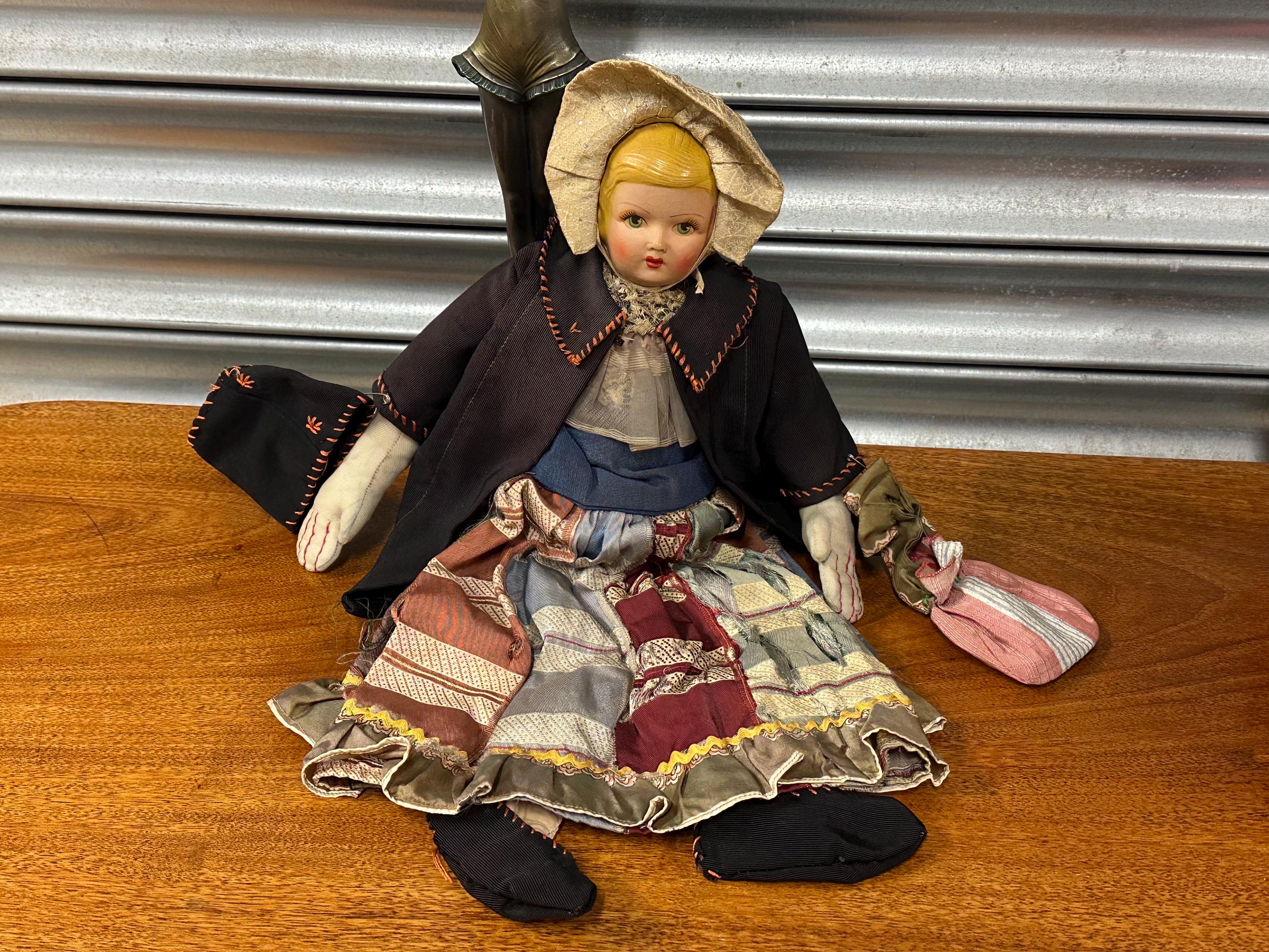 A particularly delightful feature is the miniature handmade doll carried in her fabric bag, adding rarity and extra appeal for collectors of folk art and antique dolls.