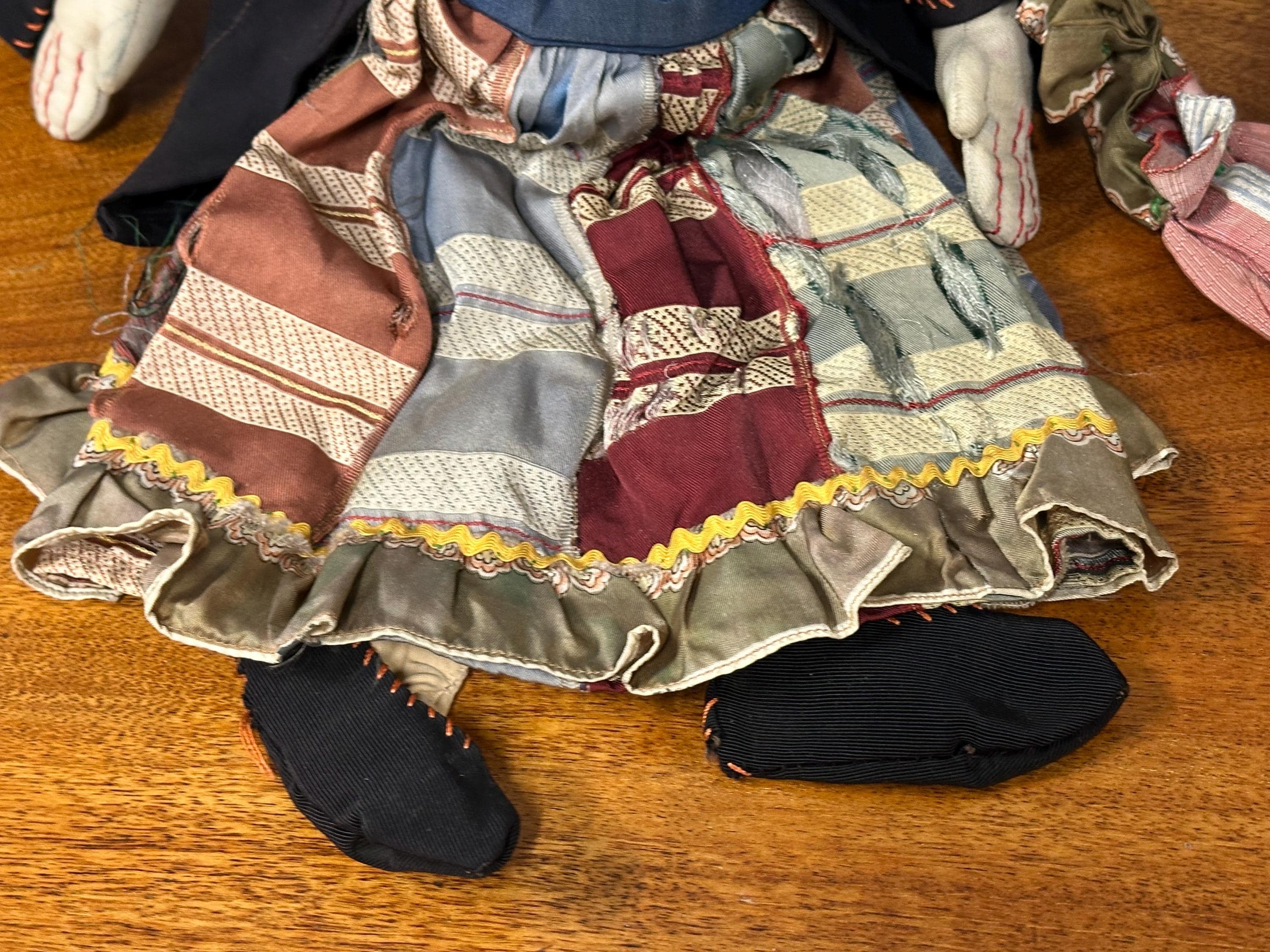 A charming and characterful vintage handmade rag doll, featuring a papier mâché head with painted facial features and a soft cloth body. The doll is beautifully dressed in traditional-style clothing, including a patchwork skirt, blouse, bonnet, and stitched jacket, all showing careful hand craftsmanship.