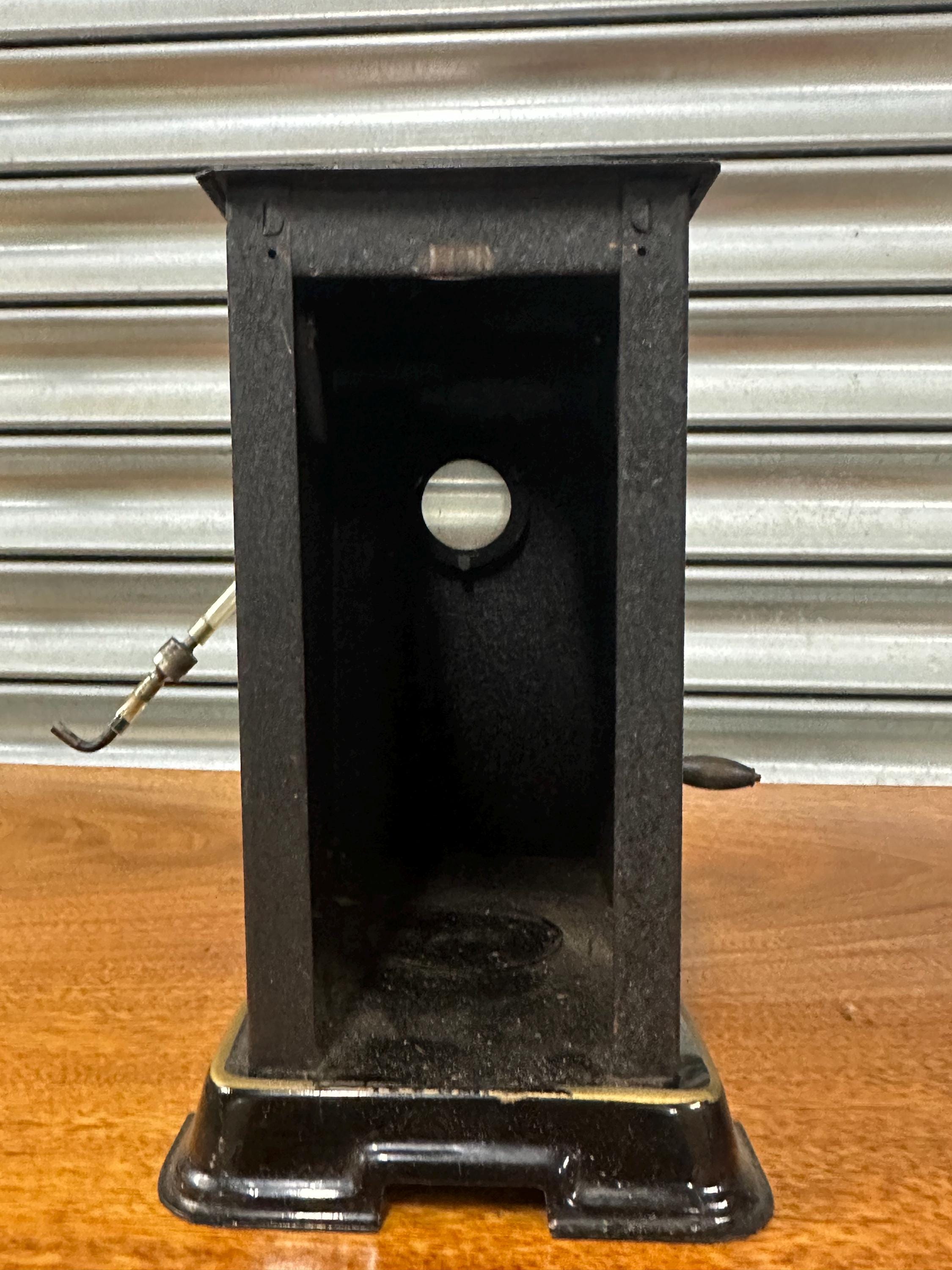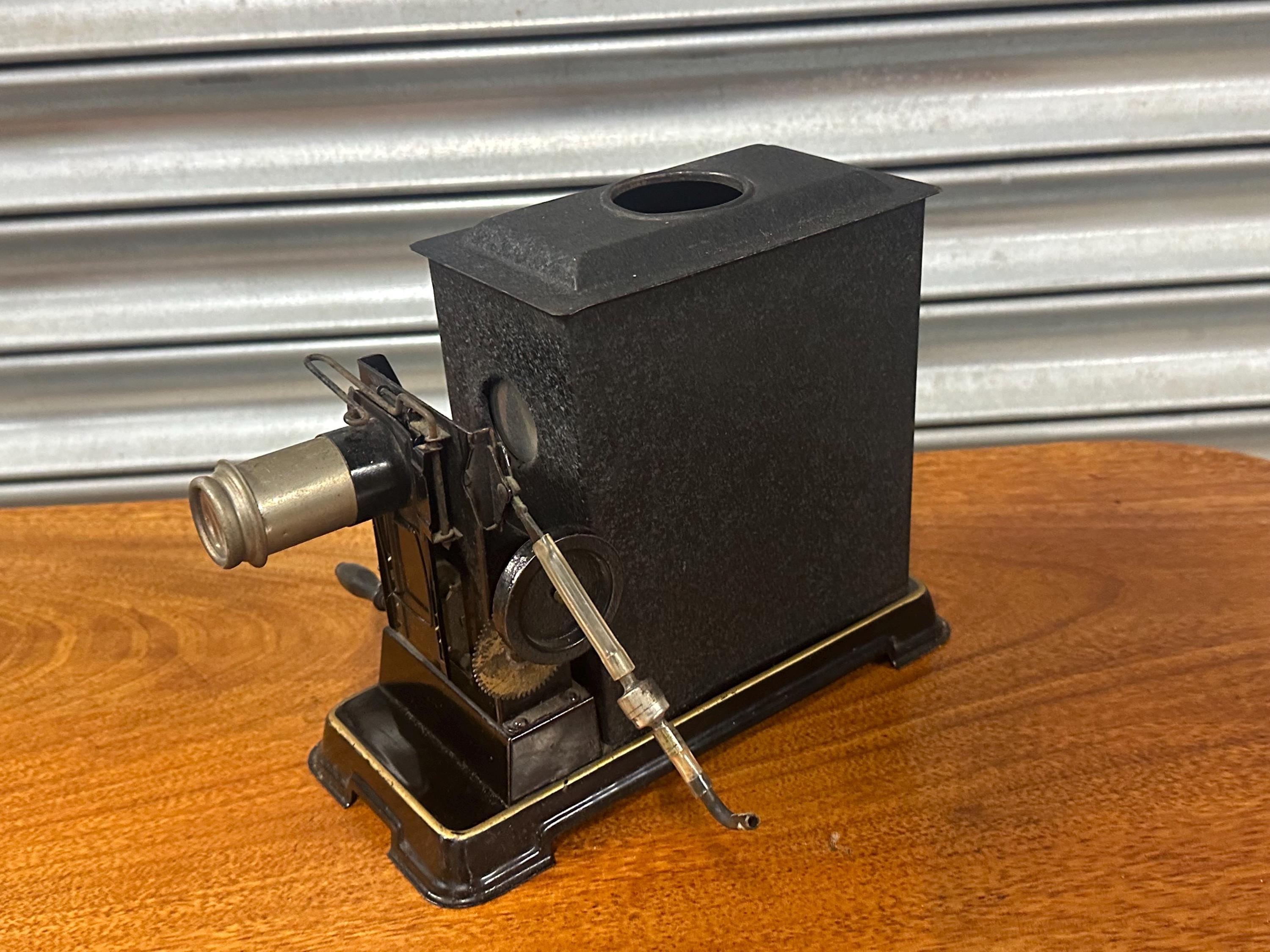 Constructed from blackened metal with a weighted base, this projector features a manual winding mechanism, front lens assembly, and an open top chimney for heat ventilation, typical of early pre-cinema and toy cinema projectors. The projector is operated by turning the side crank, which advances the film frame-by-frame in front of the light source. (Not tested so sold as not working. Not sure if all parts are present so sold as an item for display only)