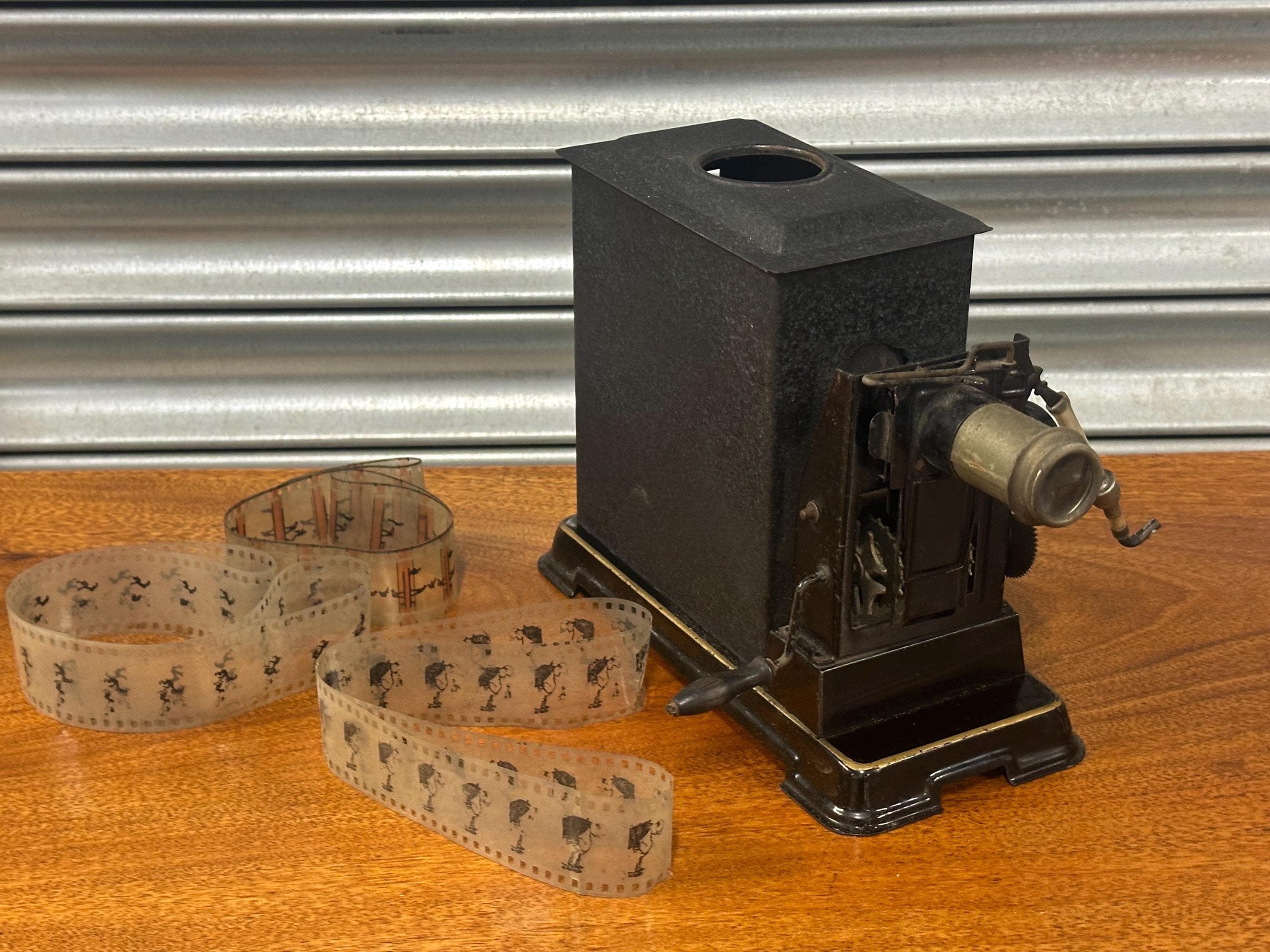 A fascinating early hand-cranked film projector, designed to display 35mm film strips or continuous rolls, dating to the late 19th / early 20th century.