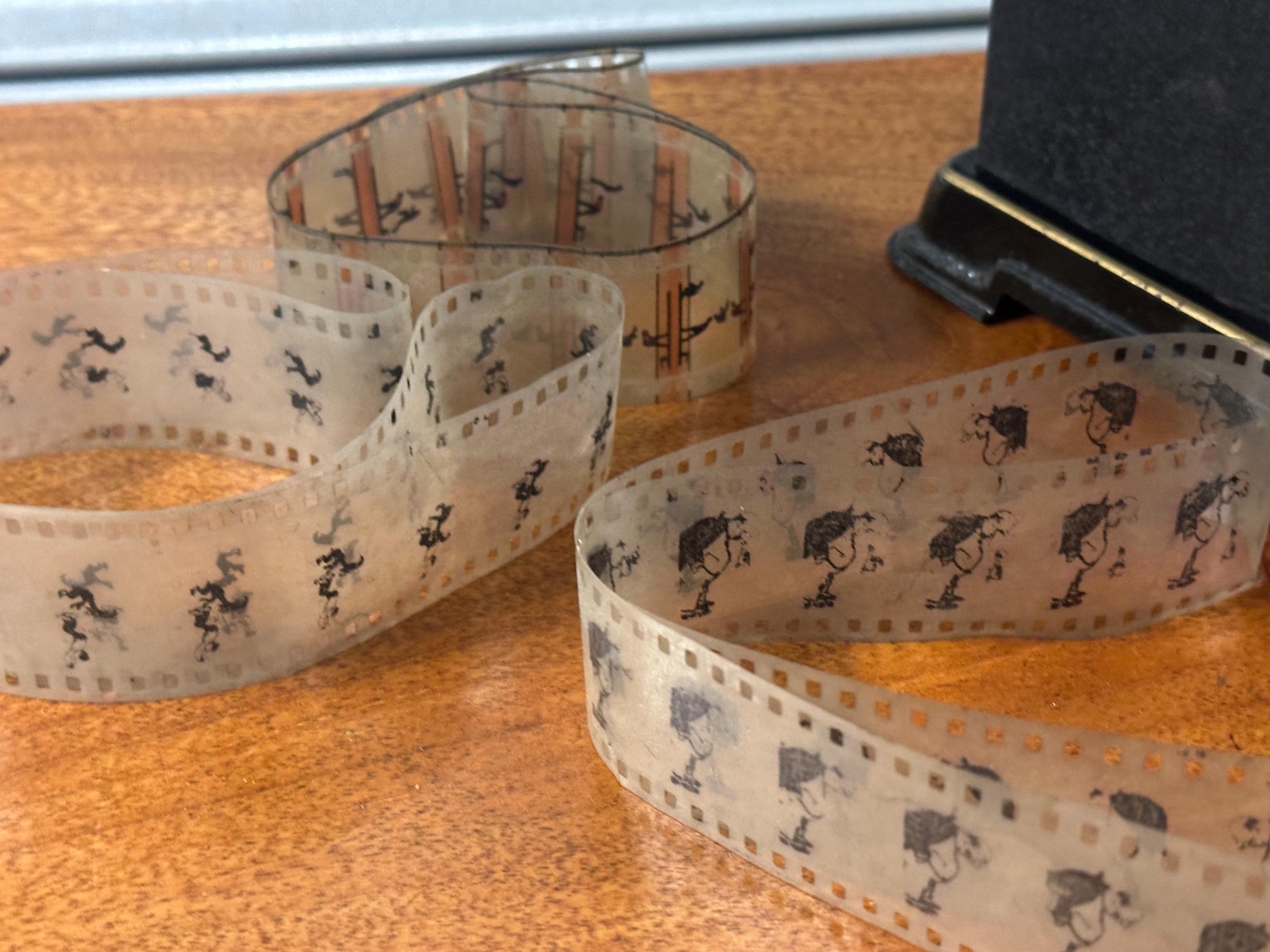 Included are original 35mm film strips, decorated with repeating illustrated scenes and figures, intended for projection onto a wall or screen in a darkened room. These types of strips were commonly used for home entertainment, educational demonstrations, or children’s magic lantern shows before the widespread adoption of electric cinema projectors.