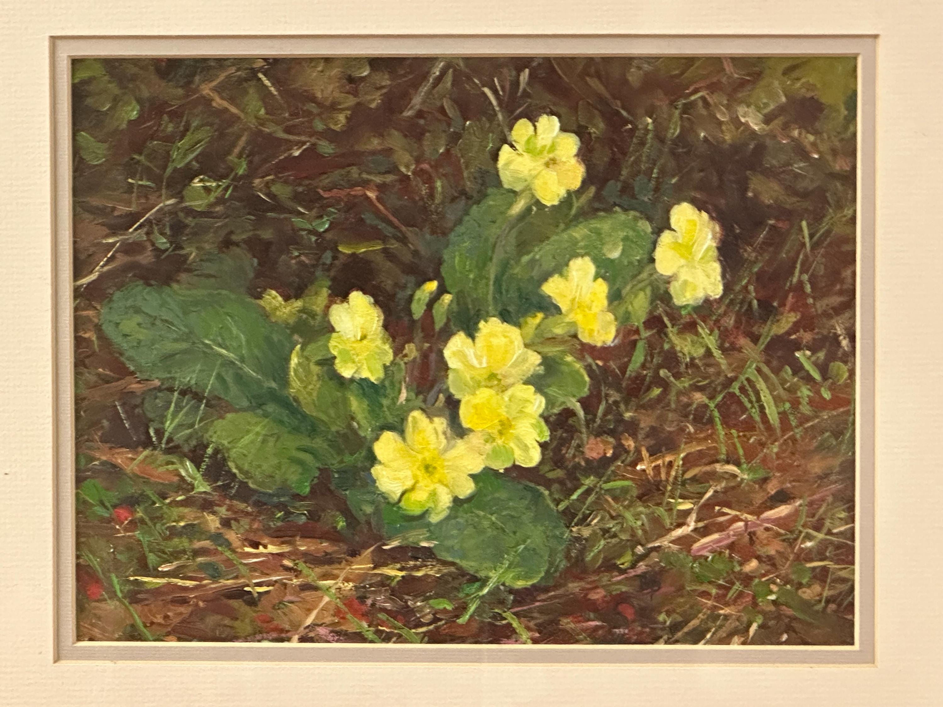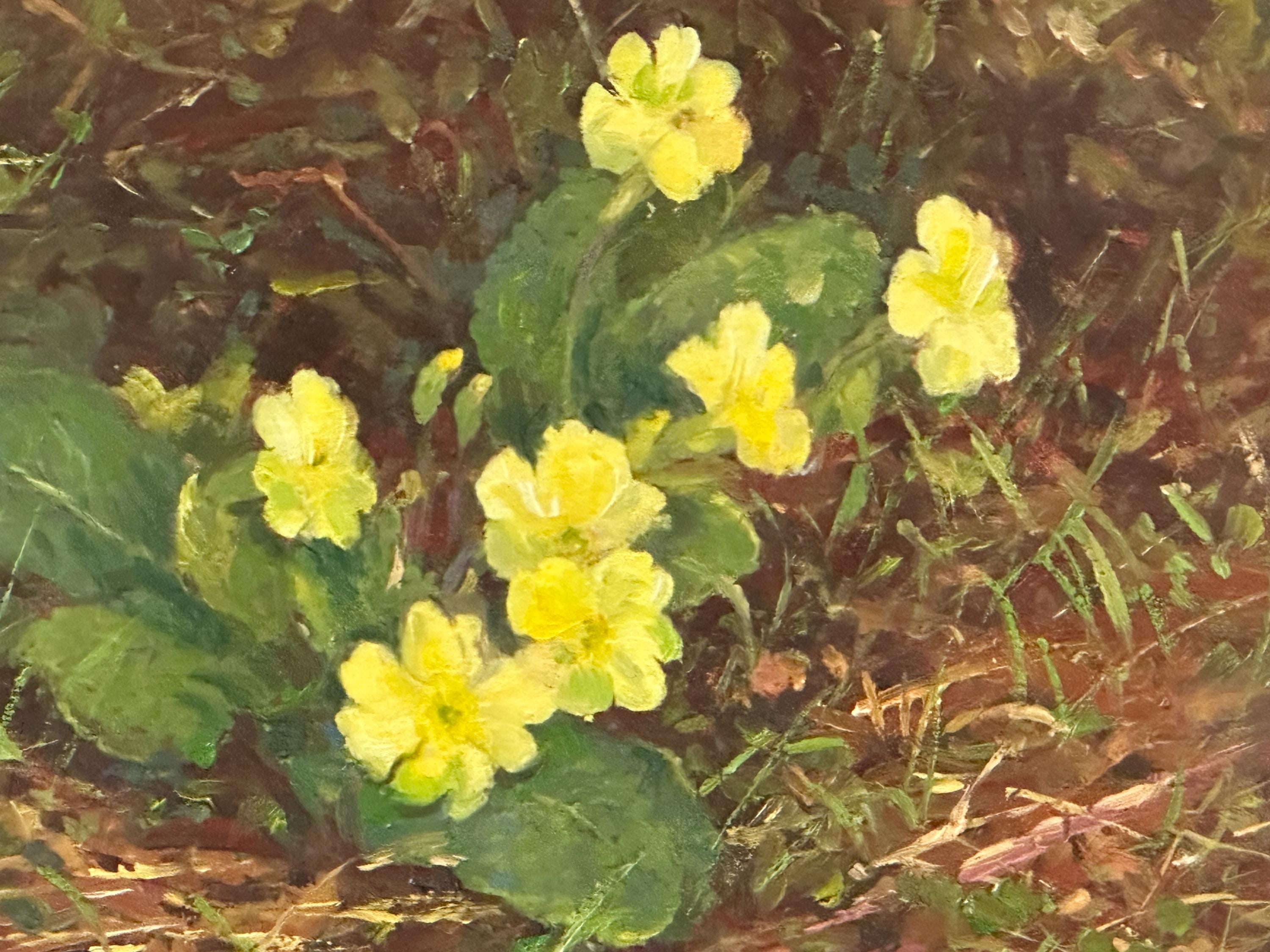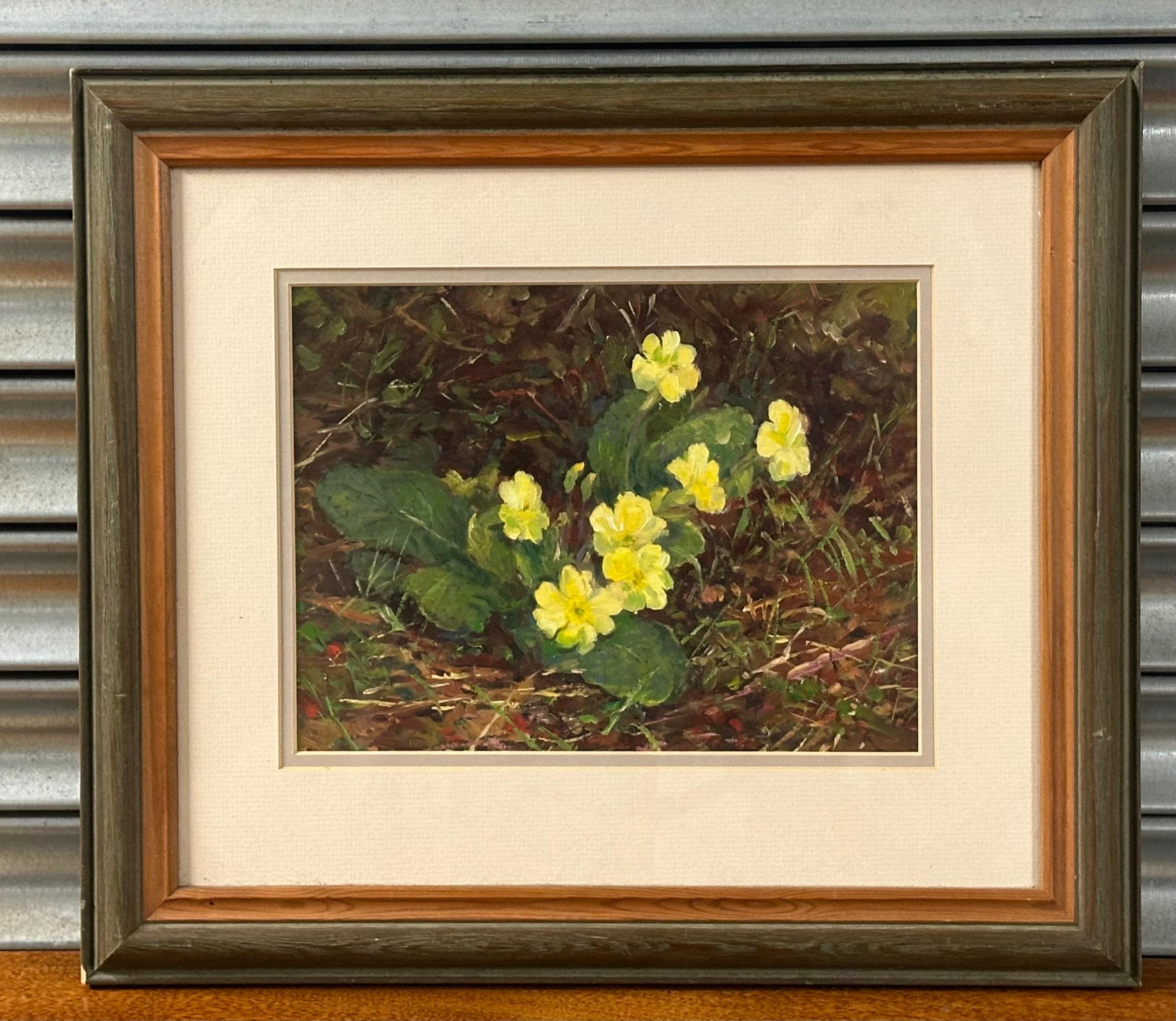 Charming original oil painting depicting a small cluster of yellow evening primrose flowers set against earthy woodland tones. The artist has used confident, textured brushwork to capture the delicate blooms and rich foliage, creating a warm, naturalistic composition.