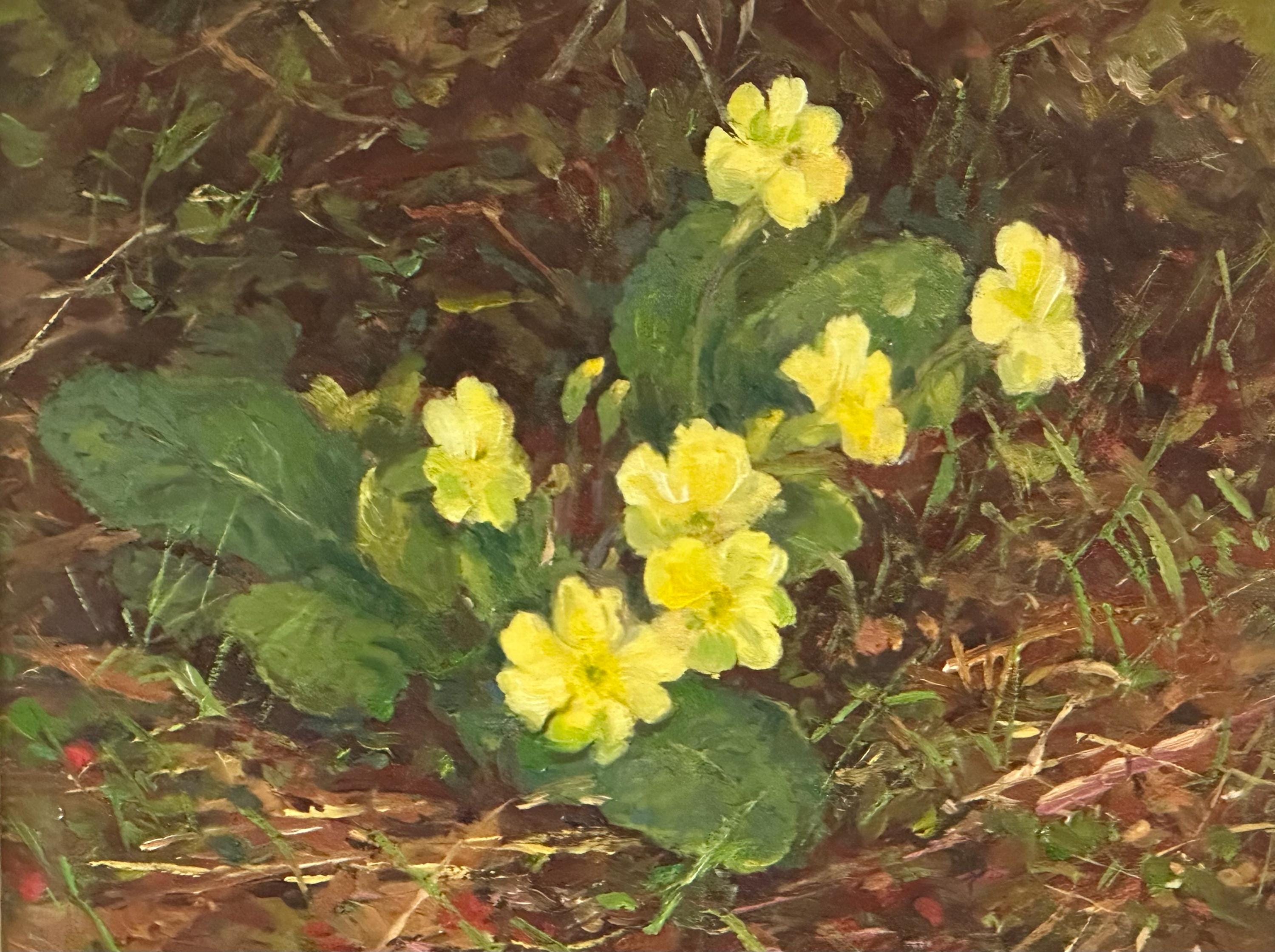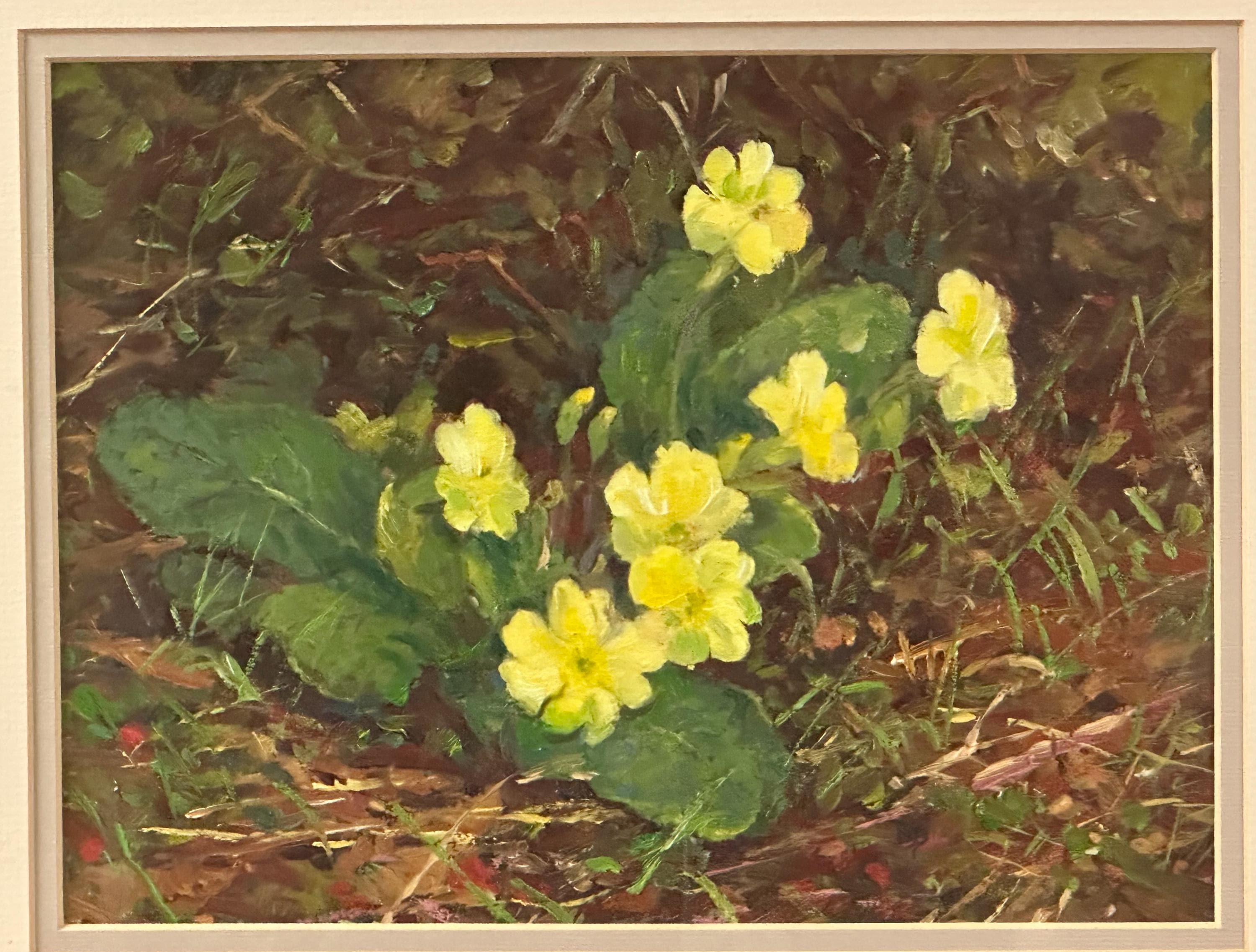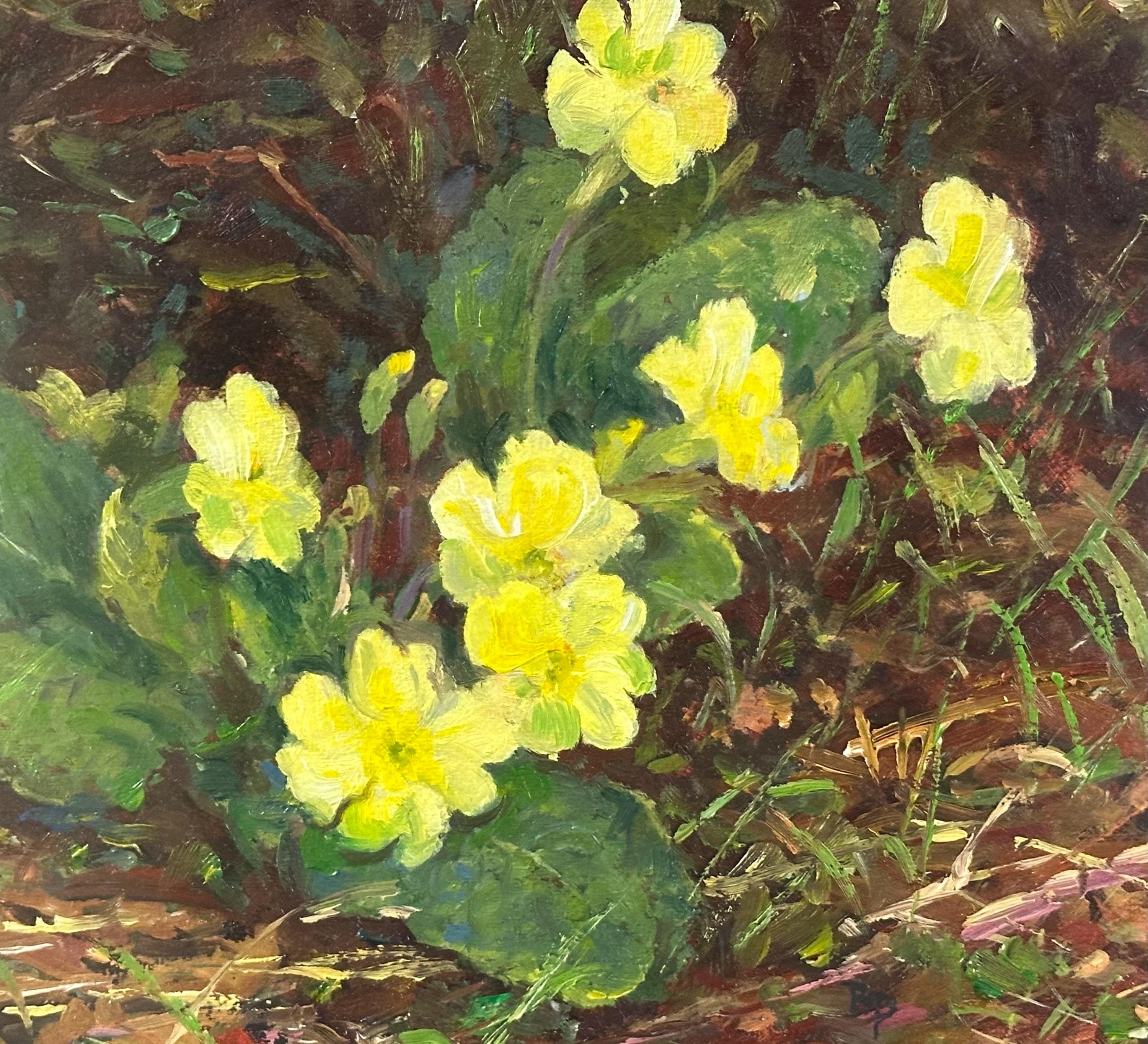 Charming original oil painting depicting a small cluster of yellow evening primrose flowers set against earthy woodland tones. The artist has used confident, textured brushwork to capture the delicate blooms and rich foliage, creating a warm, naturalistic composition.