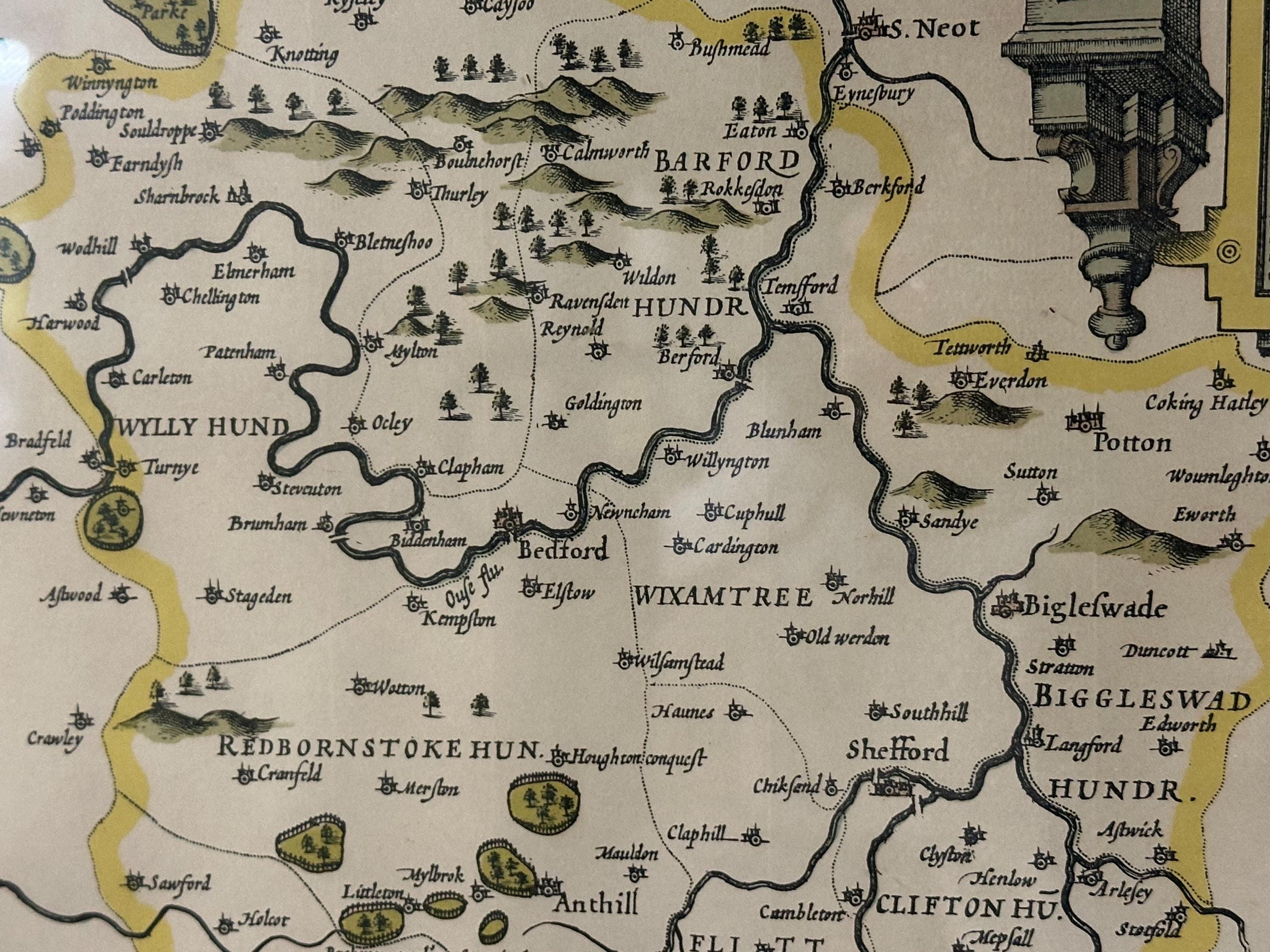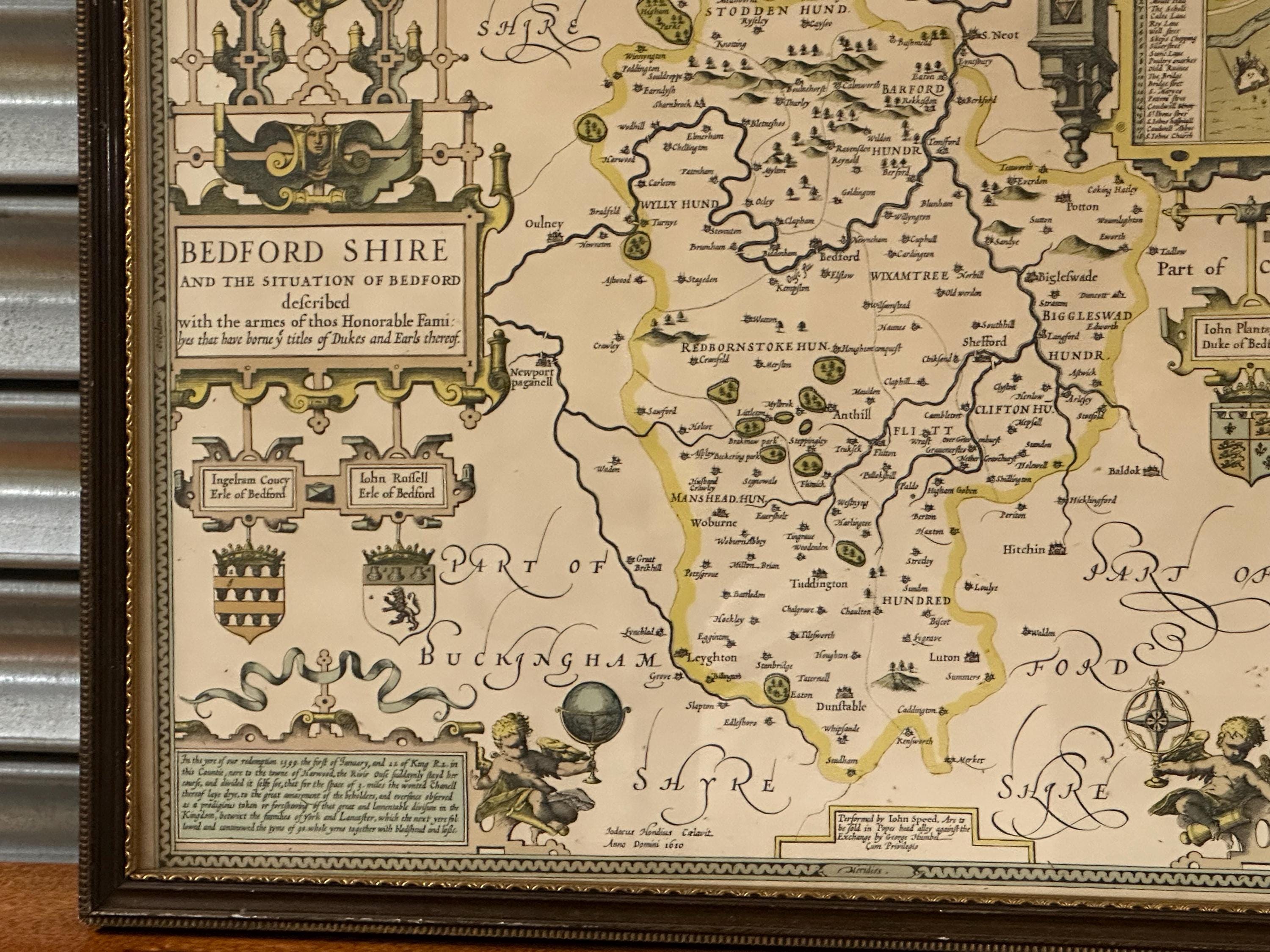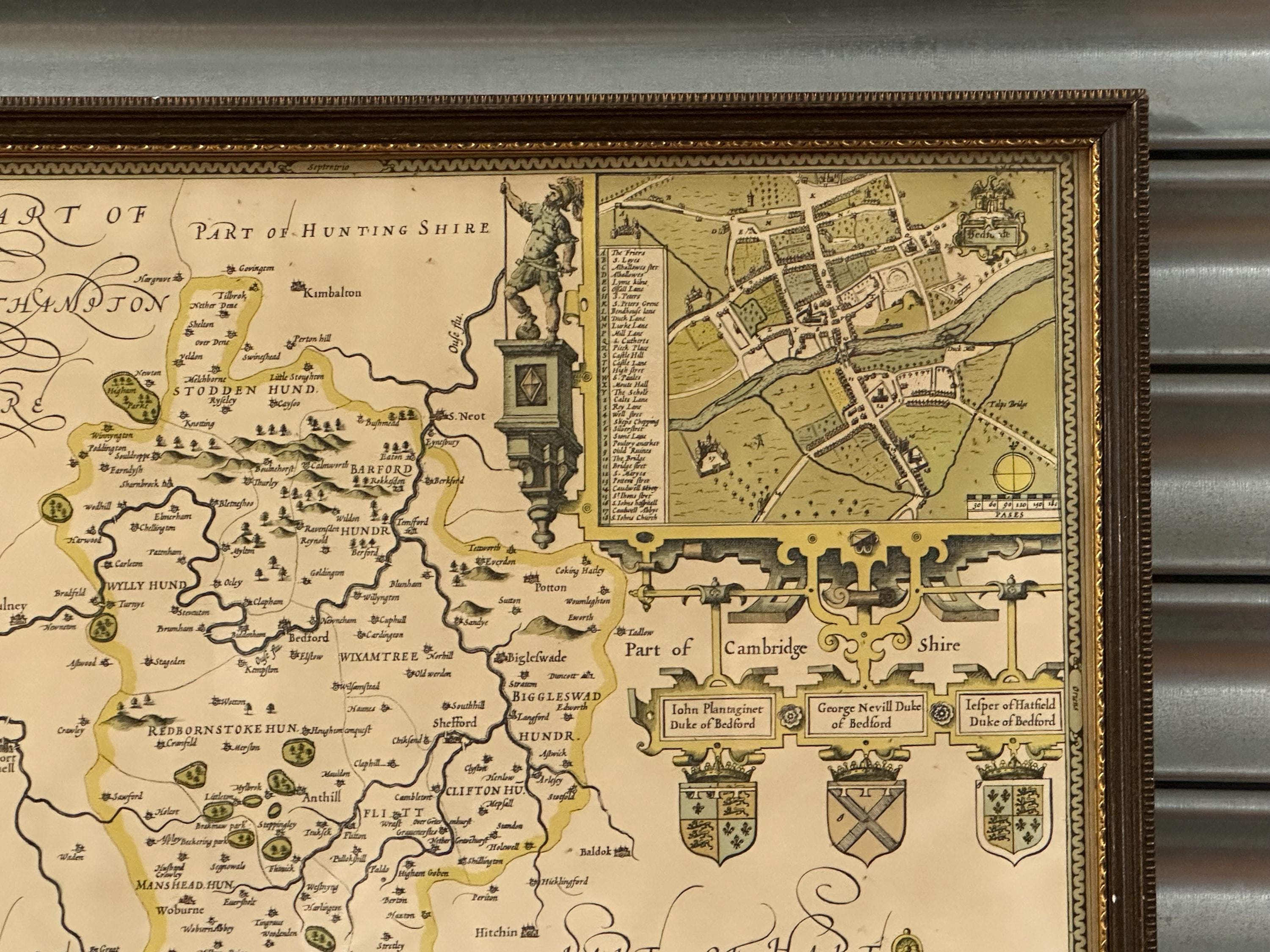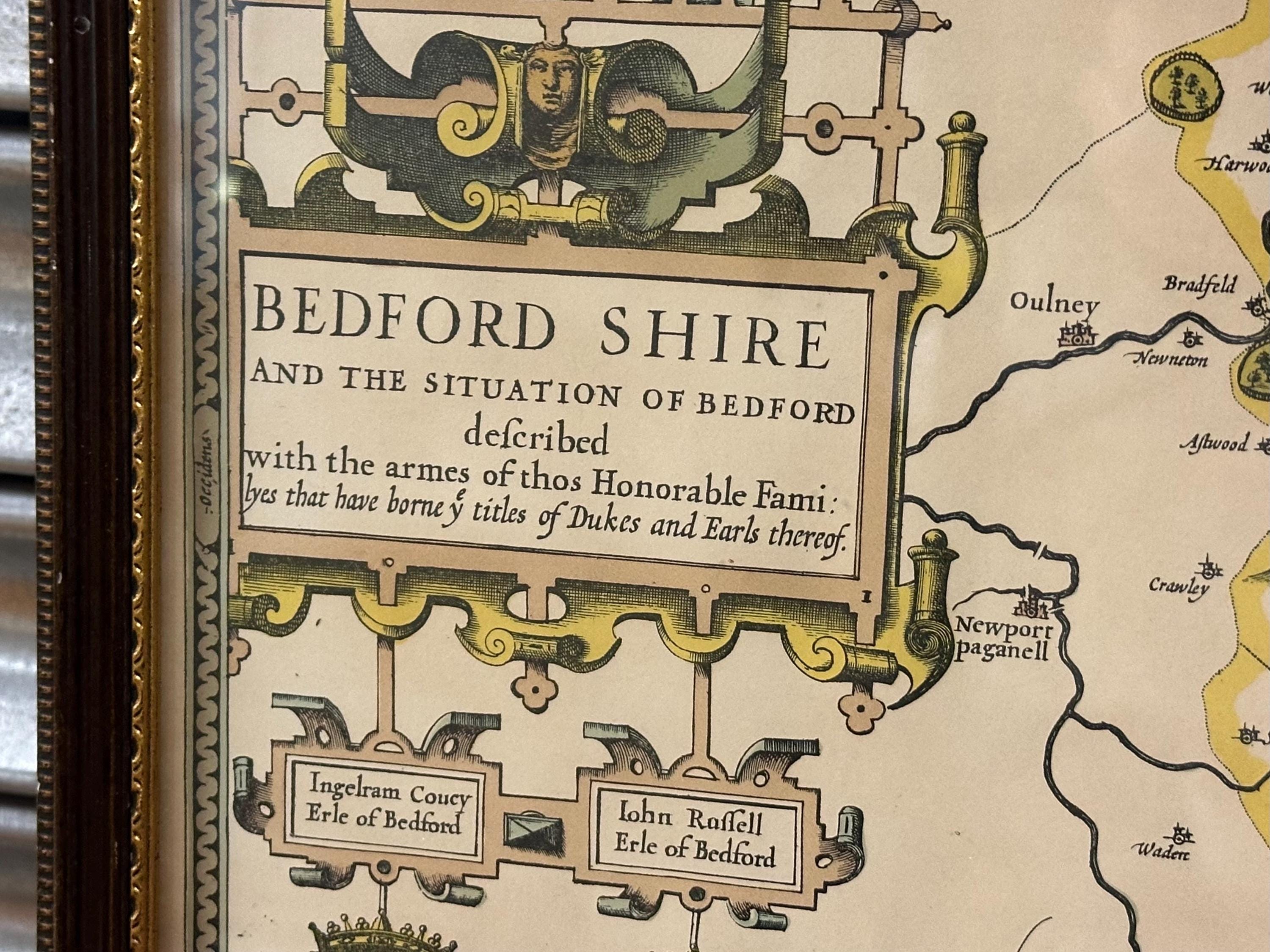 Vintage Framed Hand Coloured Bedfordshire Map, After John Speed, Decorative 17thC Style Repro