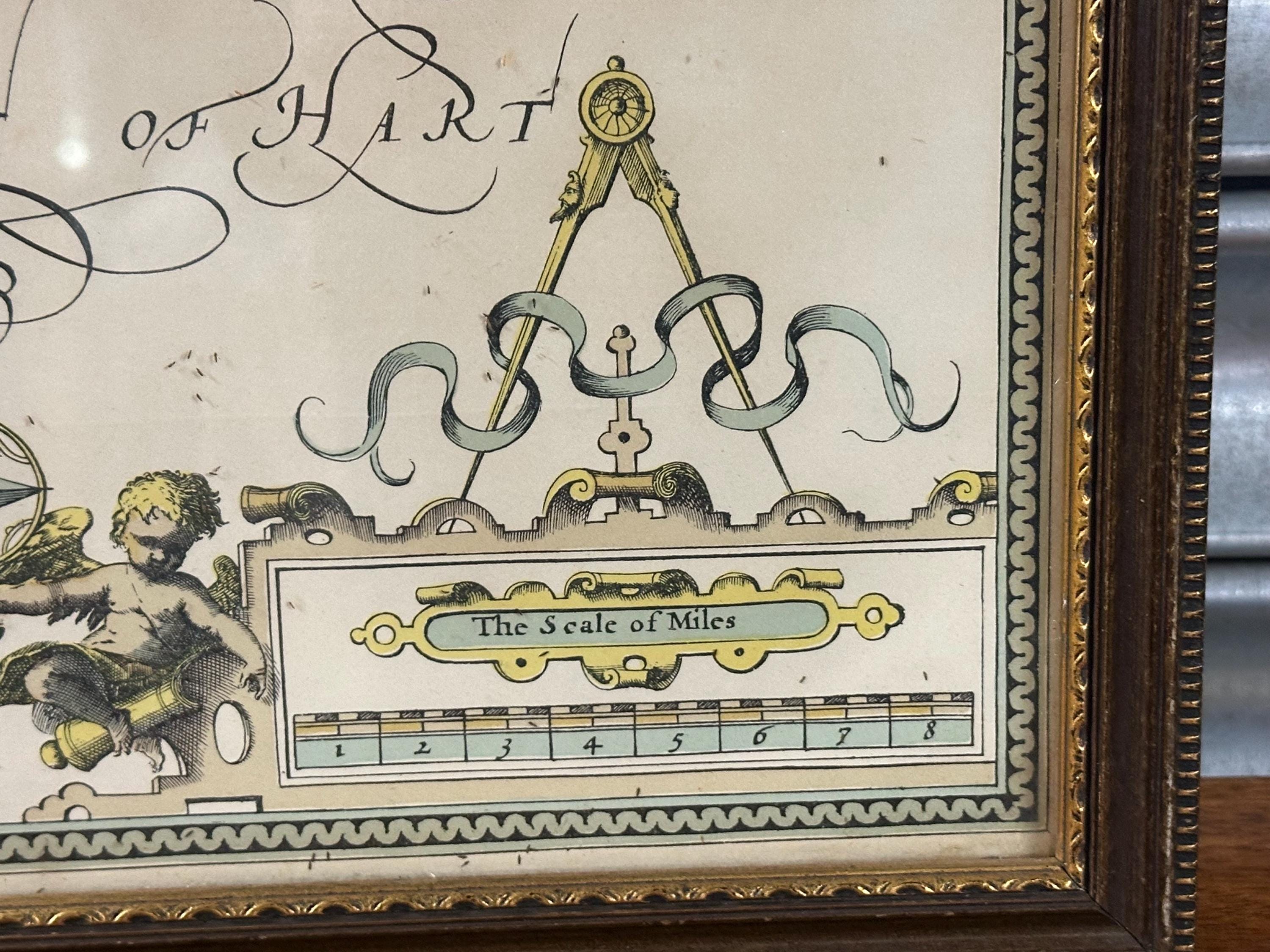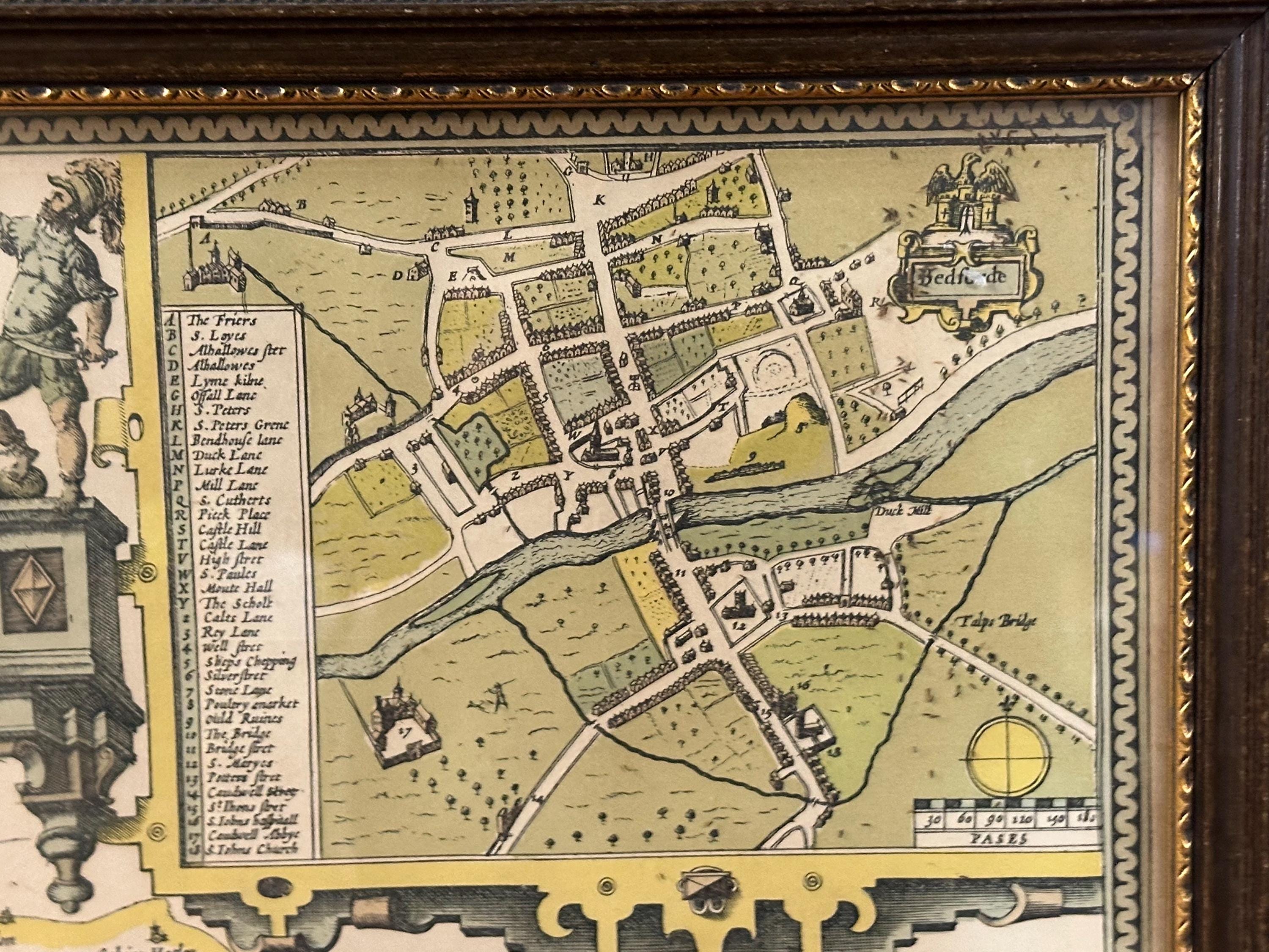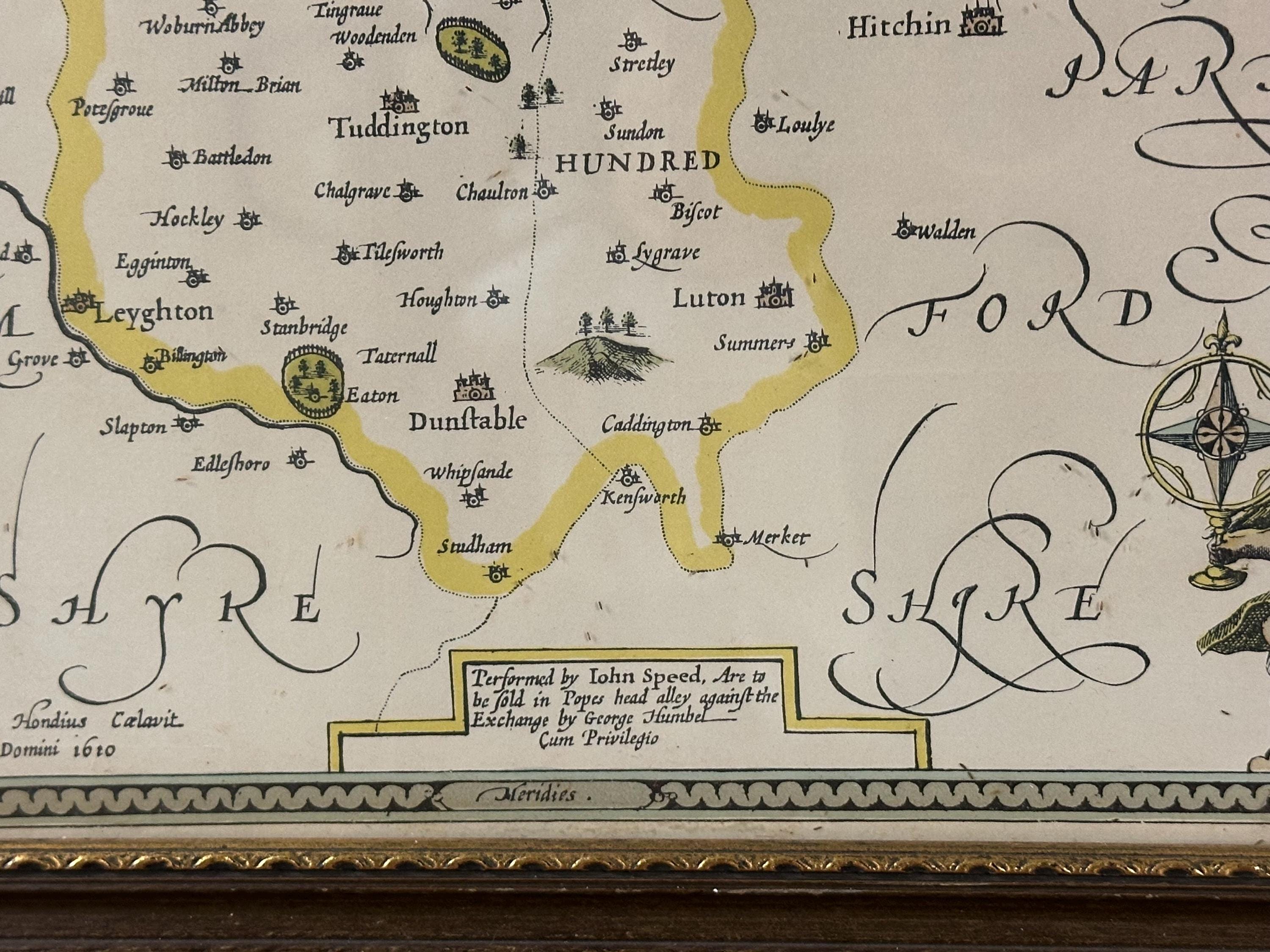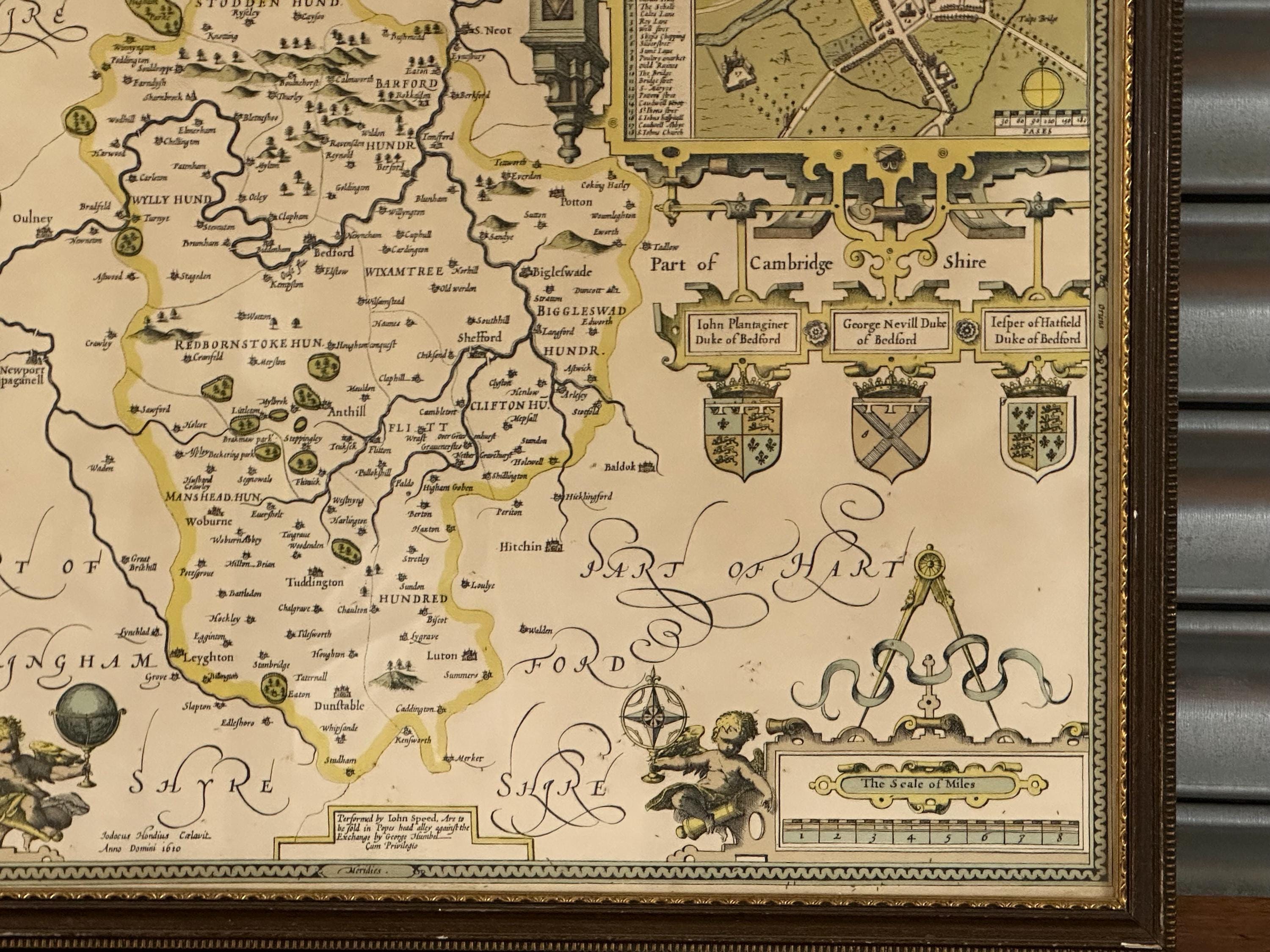Vintage Framed Hand Coloured Bedfordshire Map, After John Speed, Decorative 17thC Style Repro